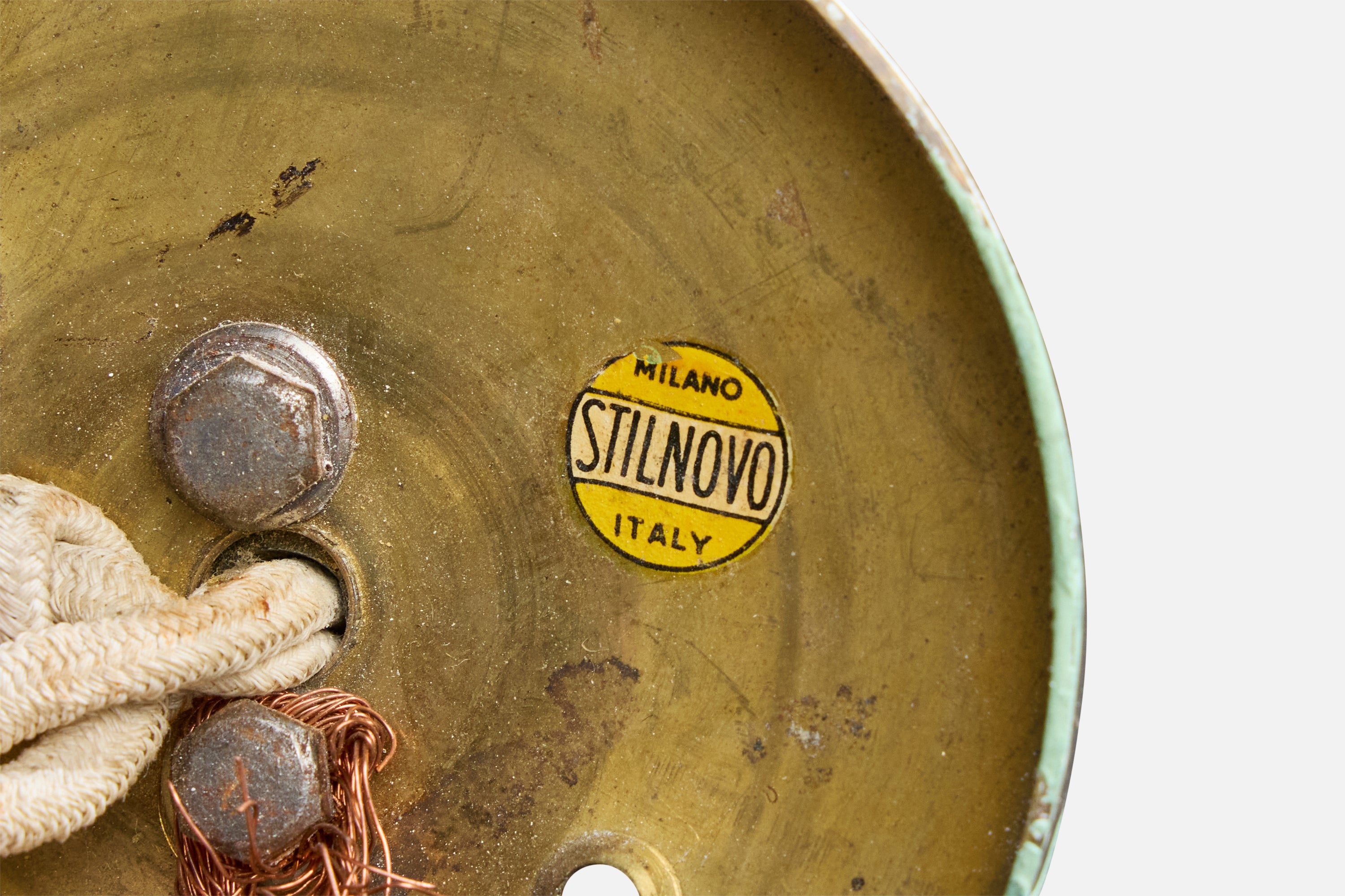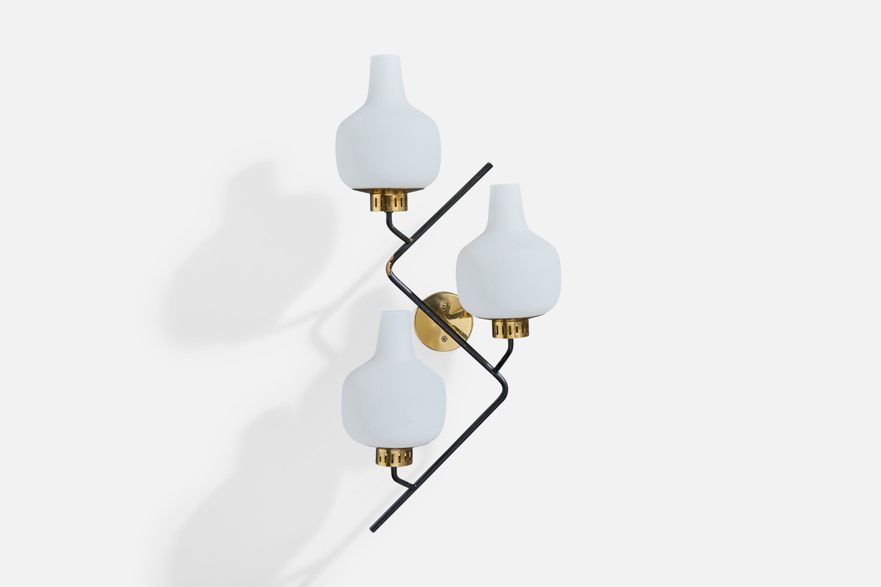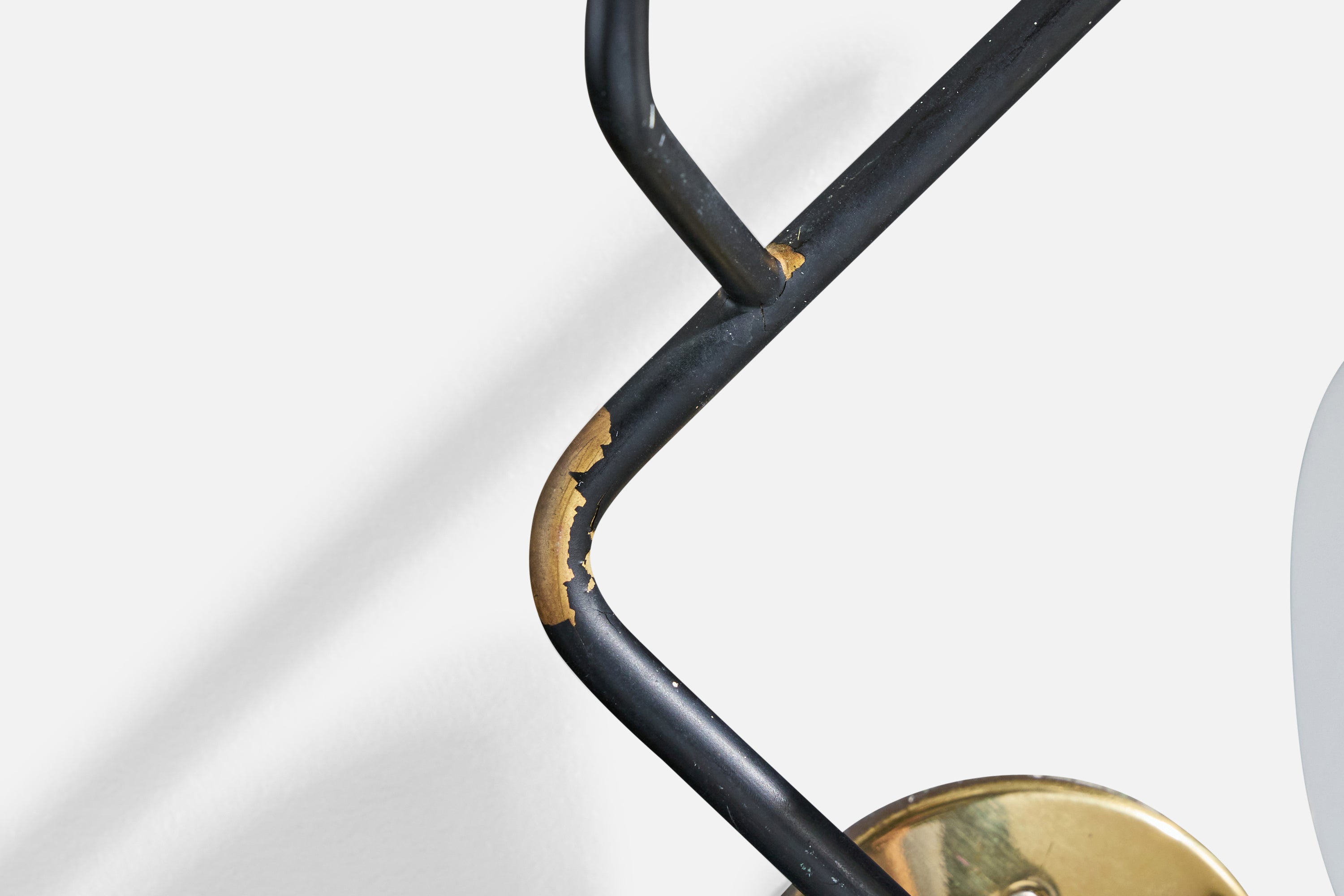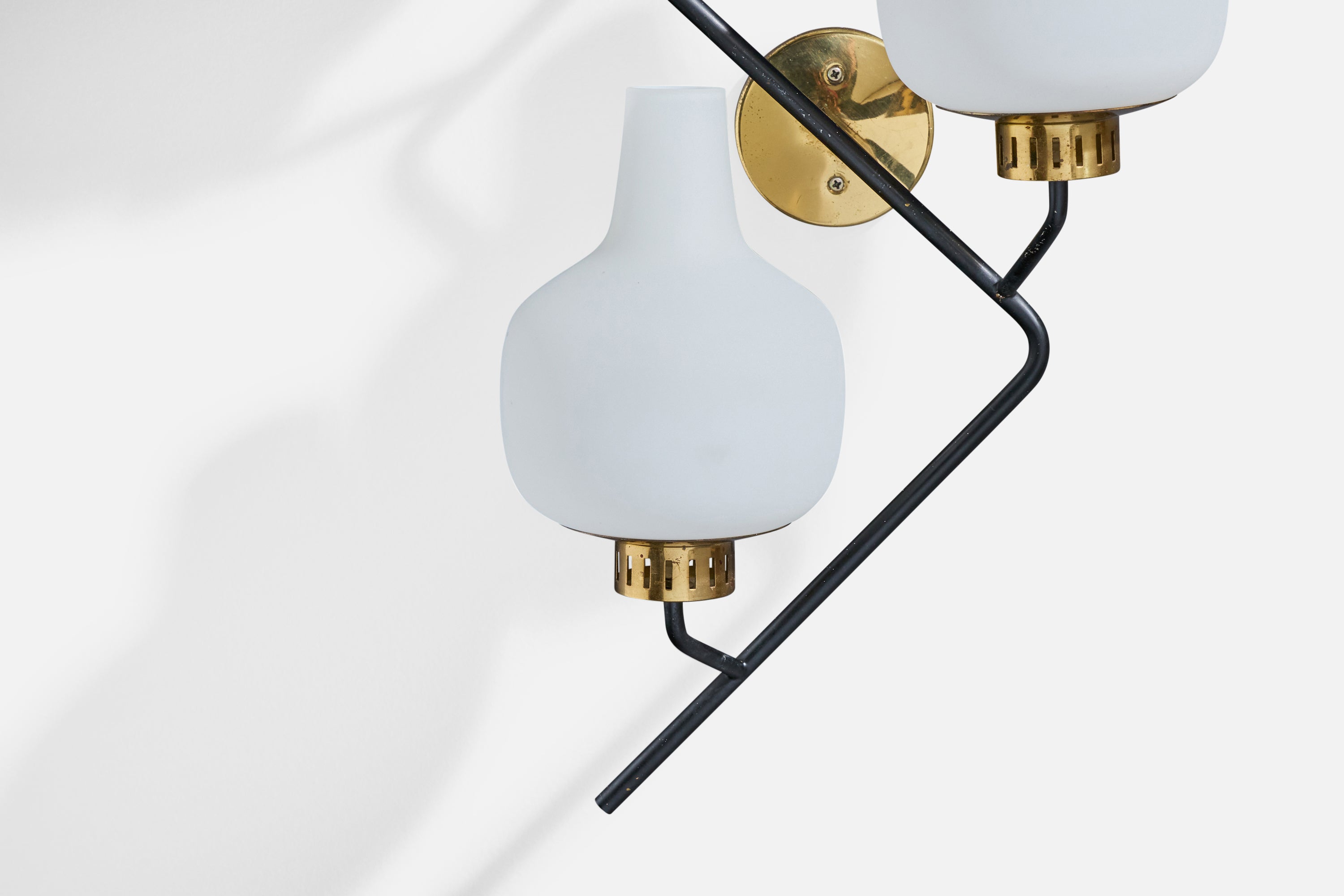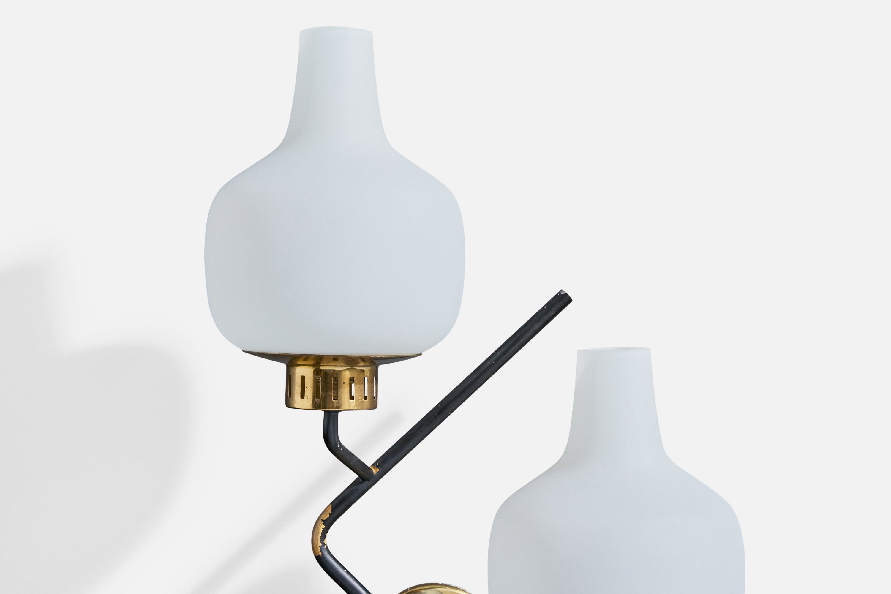 A pair of brass, black-lacquered metal and white opaline glass wall lights designed and produced in Italy, c. 1950s.