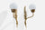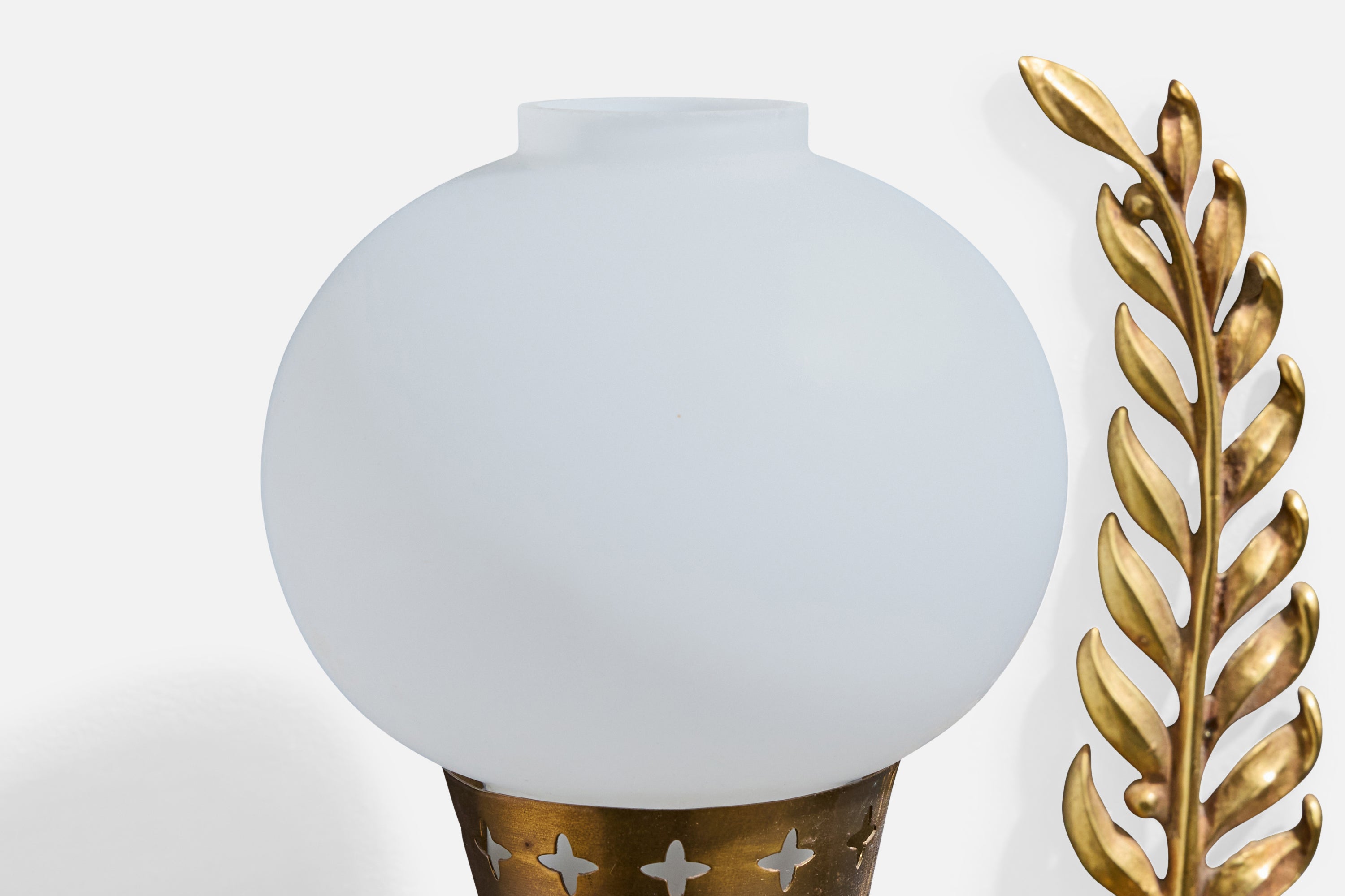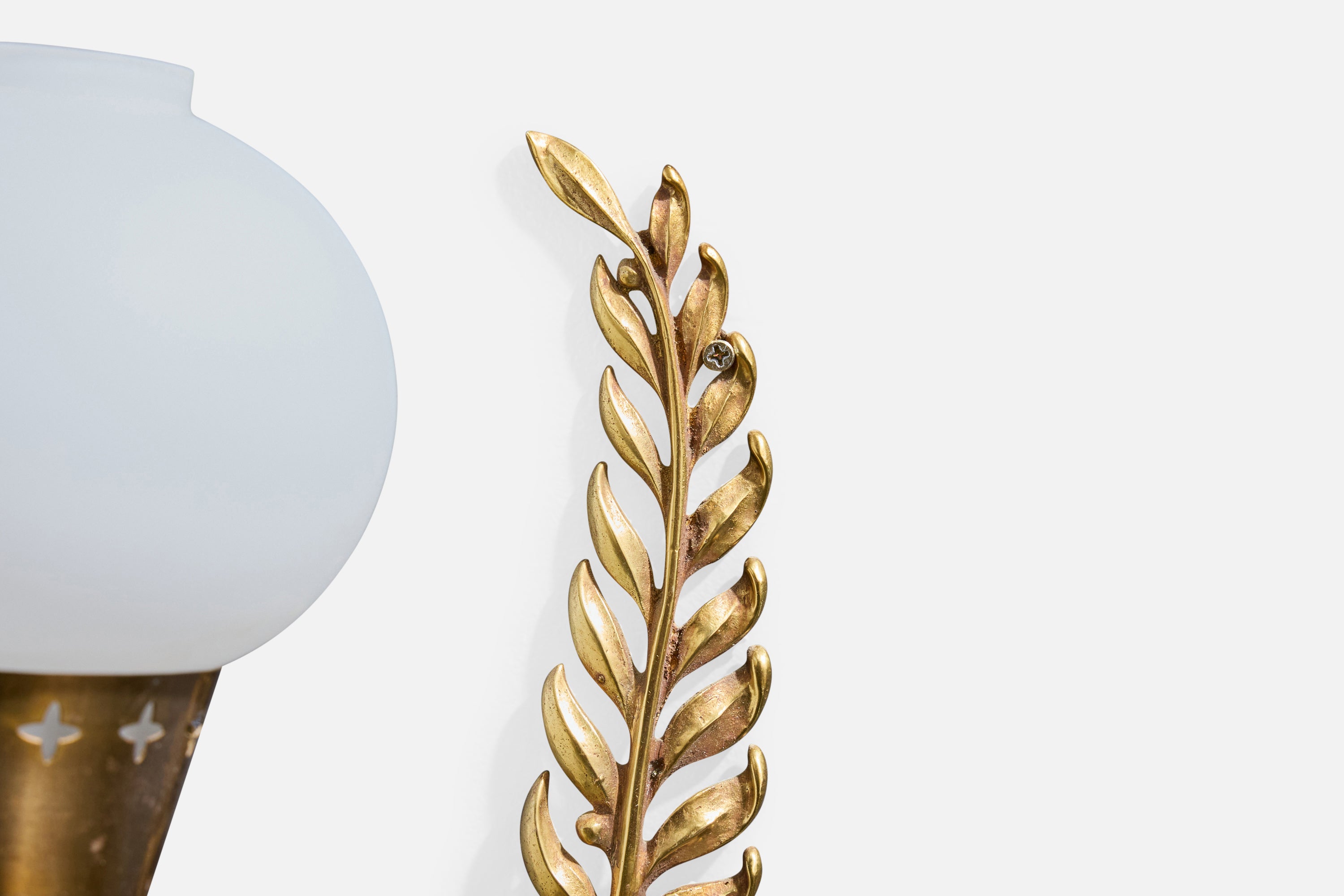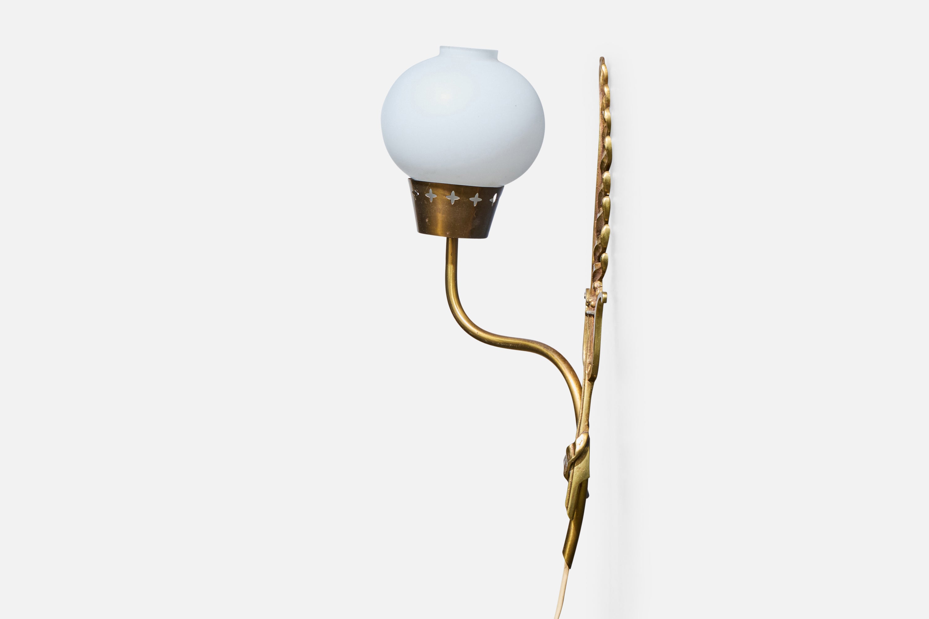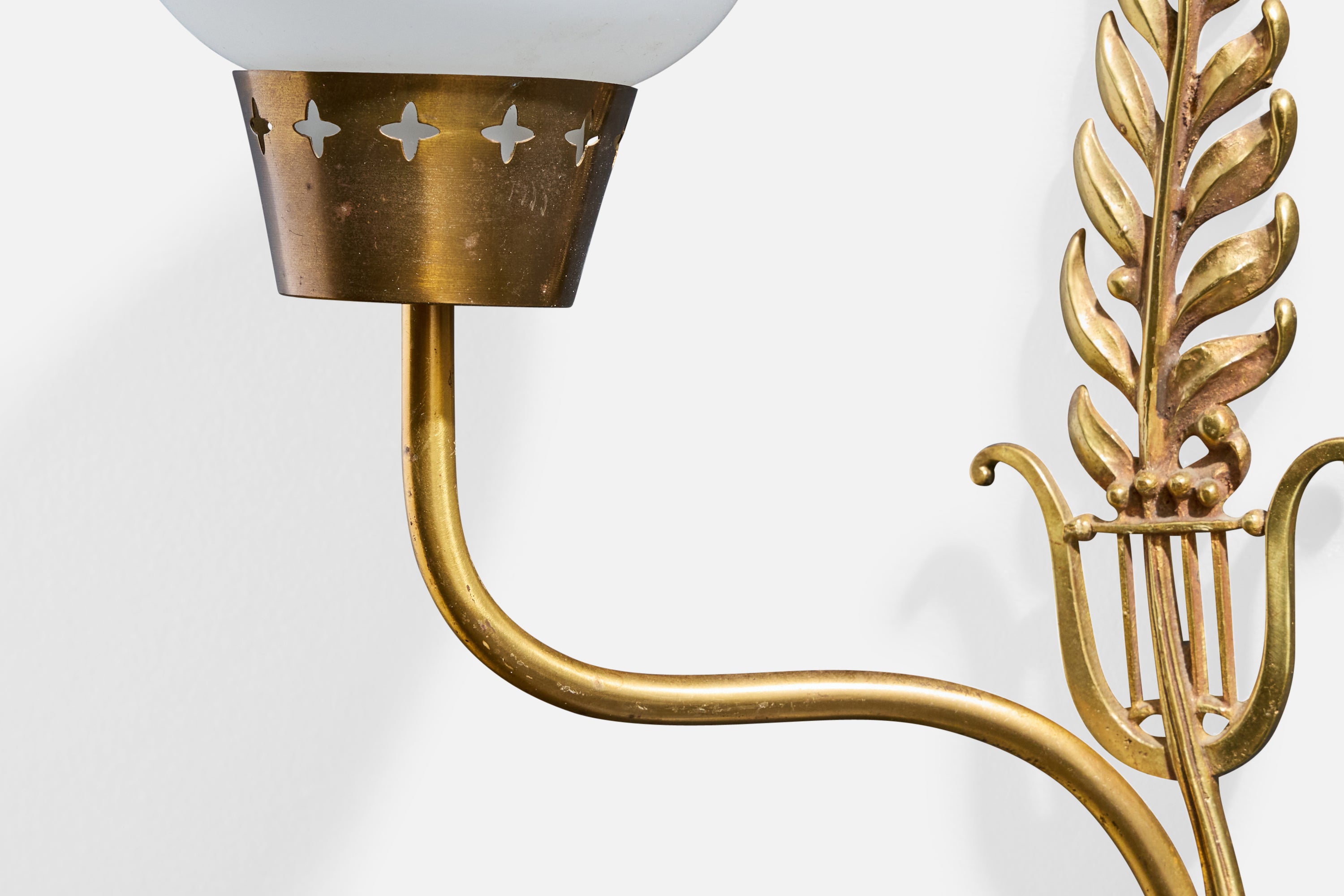 An organic two-armed brass and white opaline glass wall lights designed and produced by Einar Bäckström, Malmö, Sweden, 1940s.