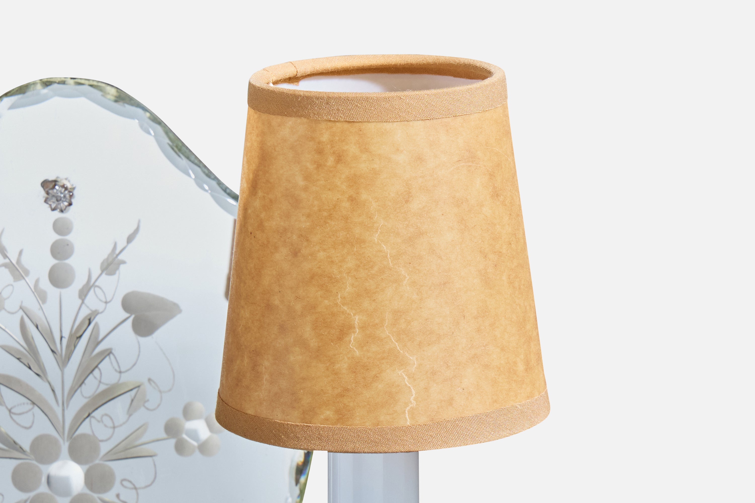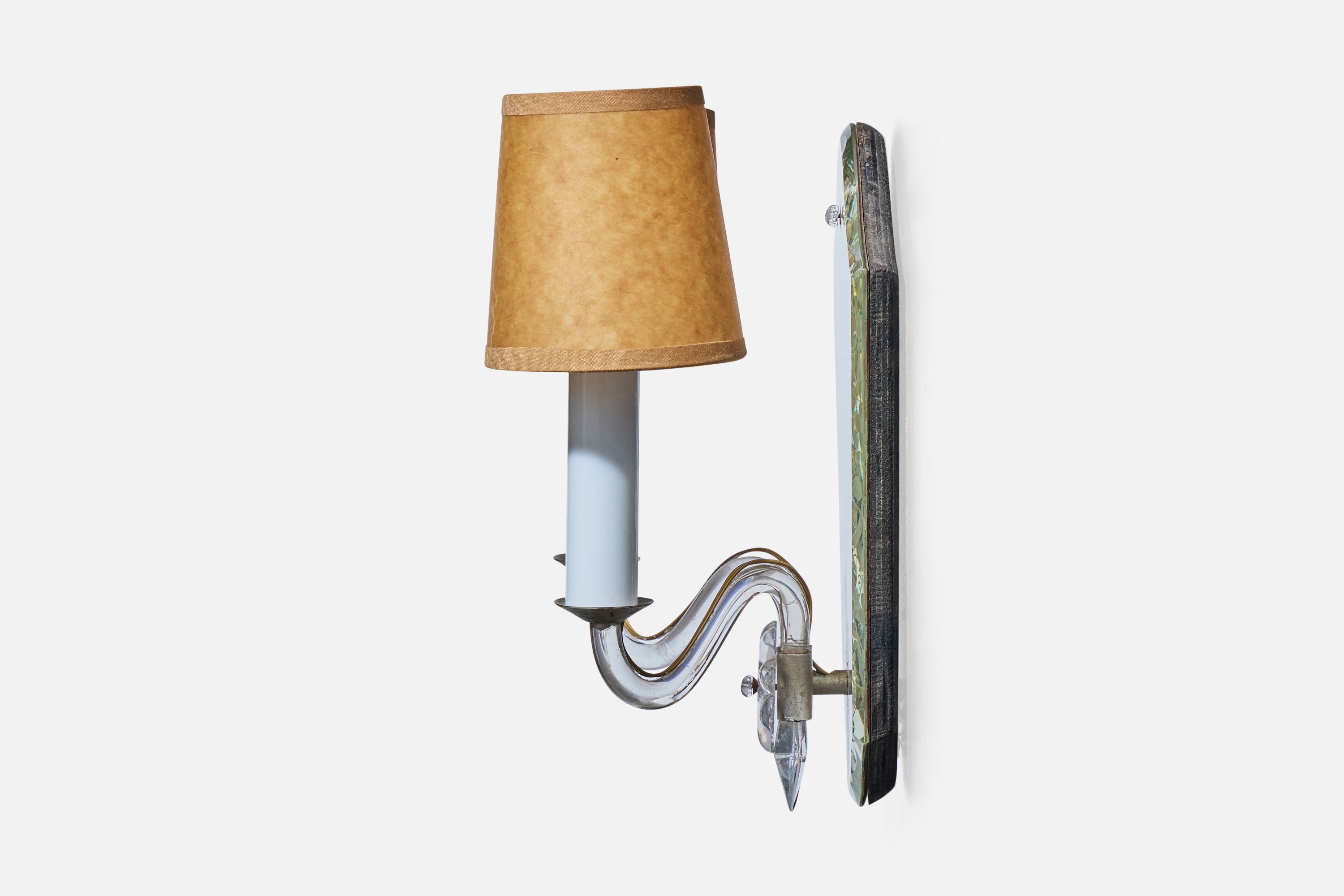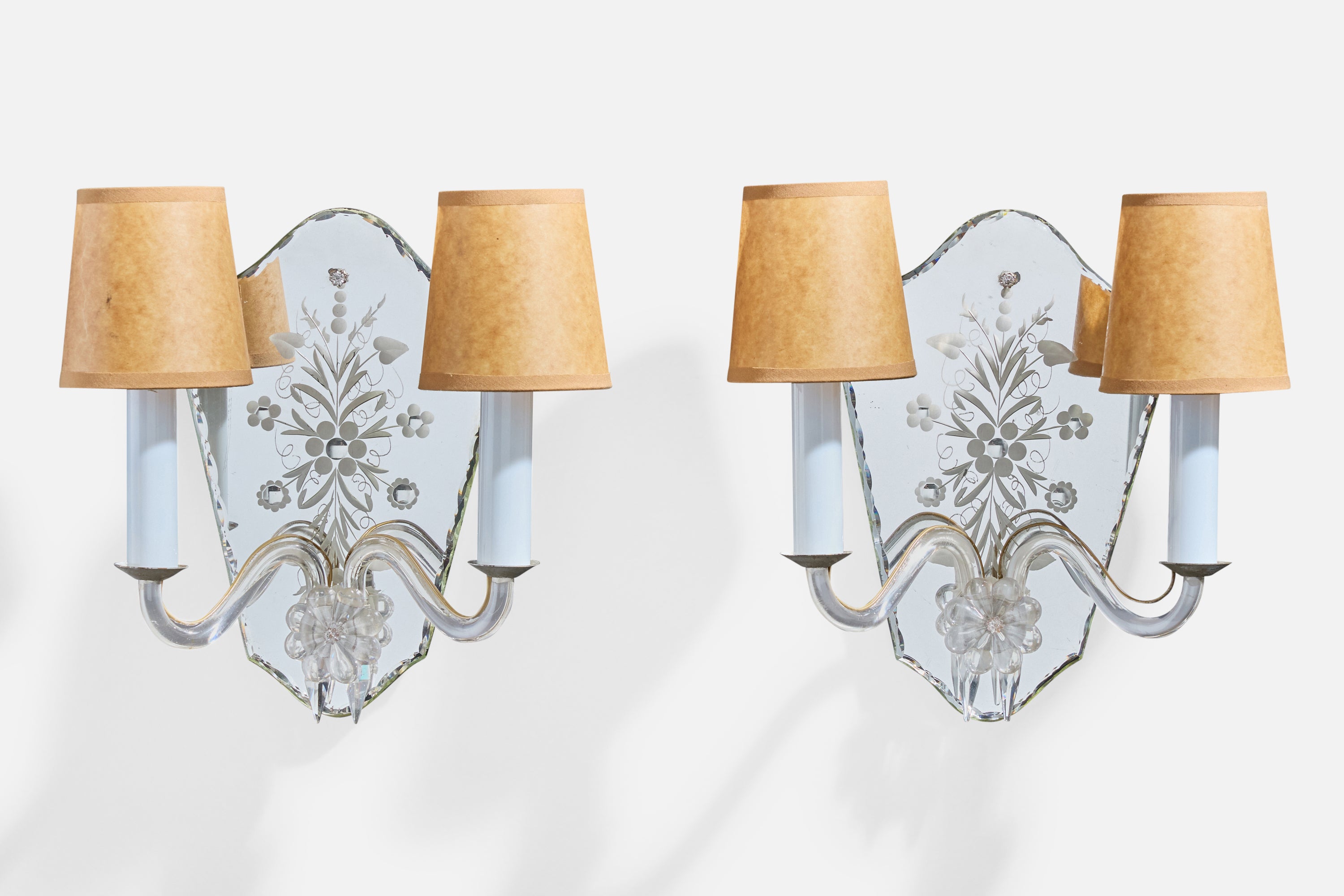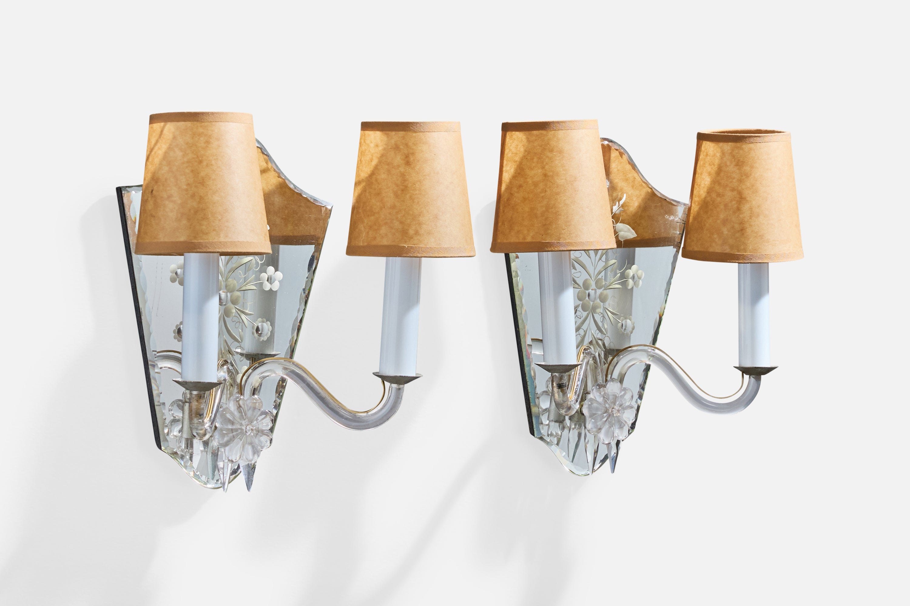 A pair of metal, glass, plastic, etched mirror glass and brown parchment paper wall lights designed and produced in France, c. 1950s.