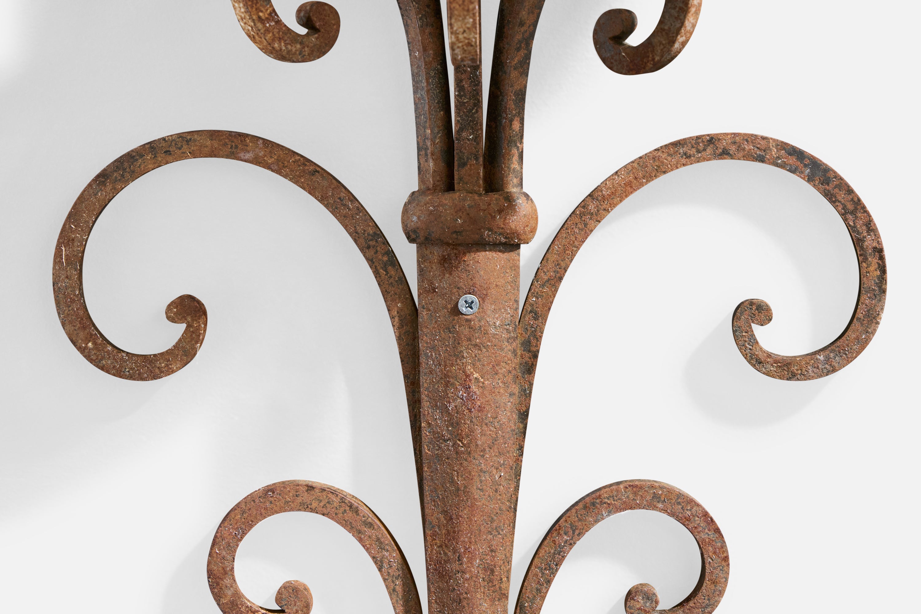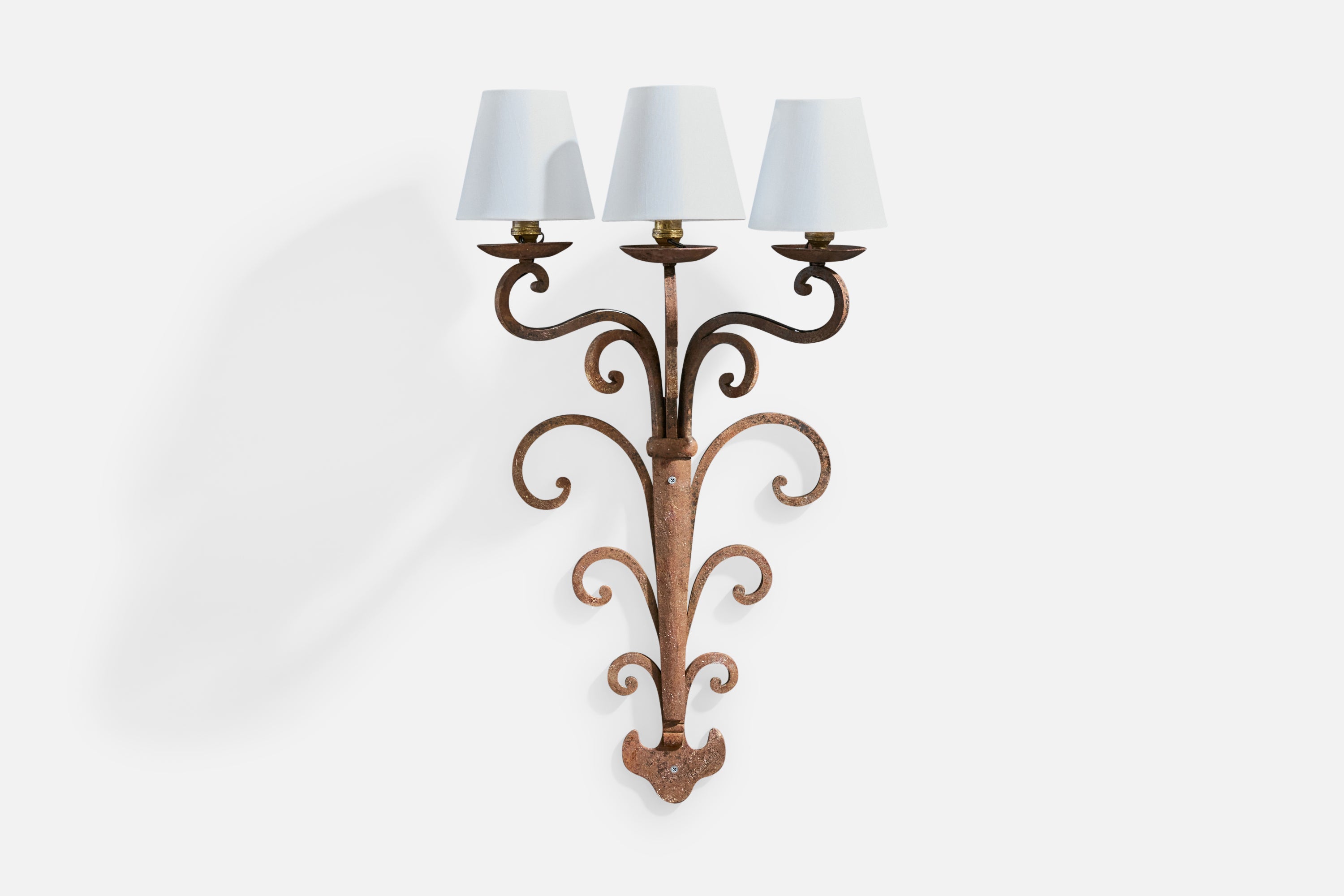 A sizable patinated iron, brass and white fabric wall light designed and produced in France, c. 1940s.