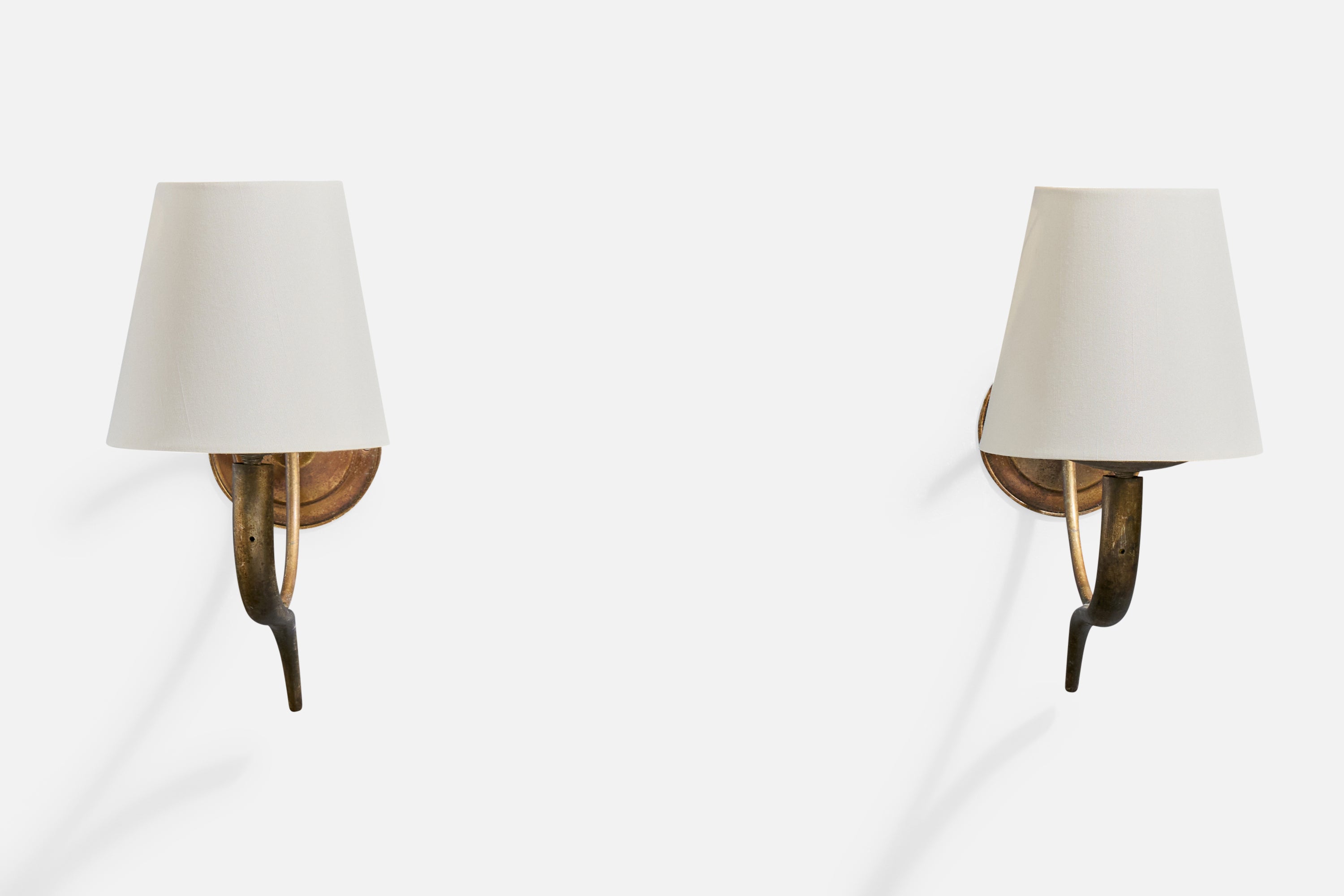 A pair of brass and white fabric wall lights designed and produced in Italy, c. 1930s.