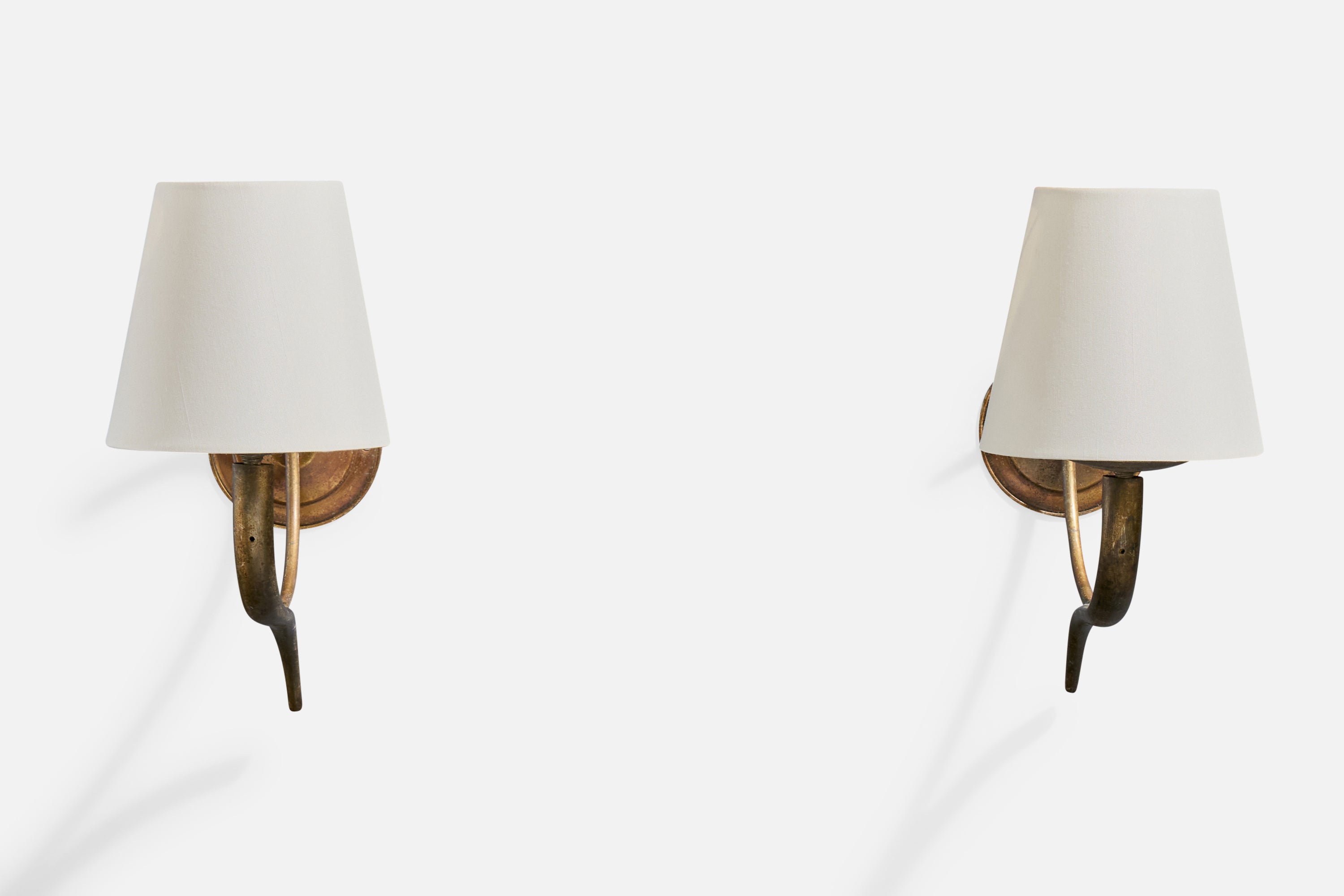 A pair of brass and white fabric wall lights designed and produced in Italy, c. 1930s.