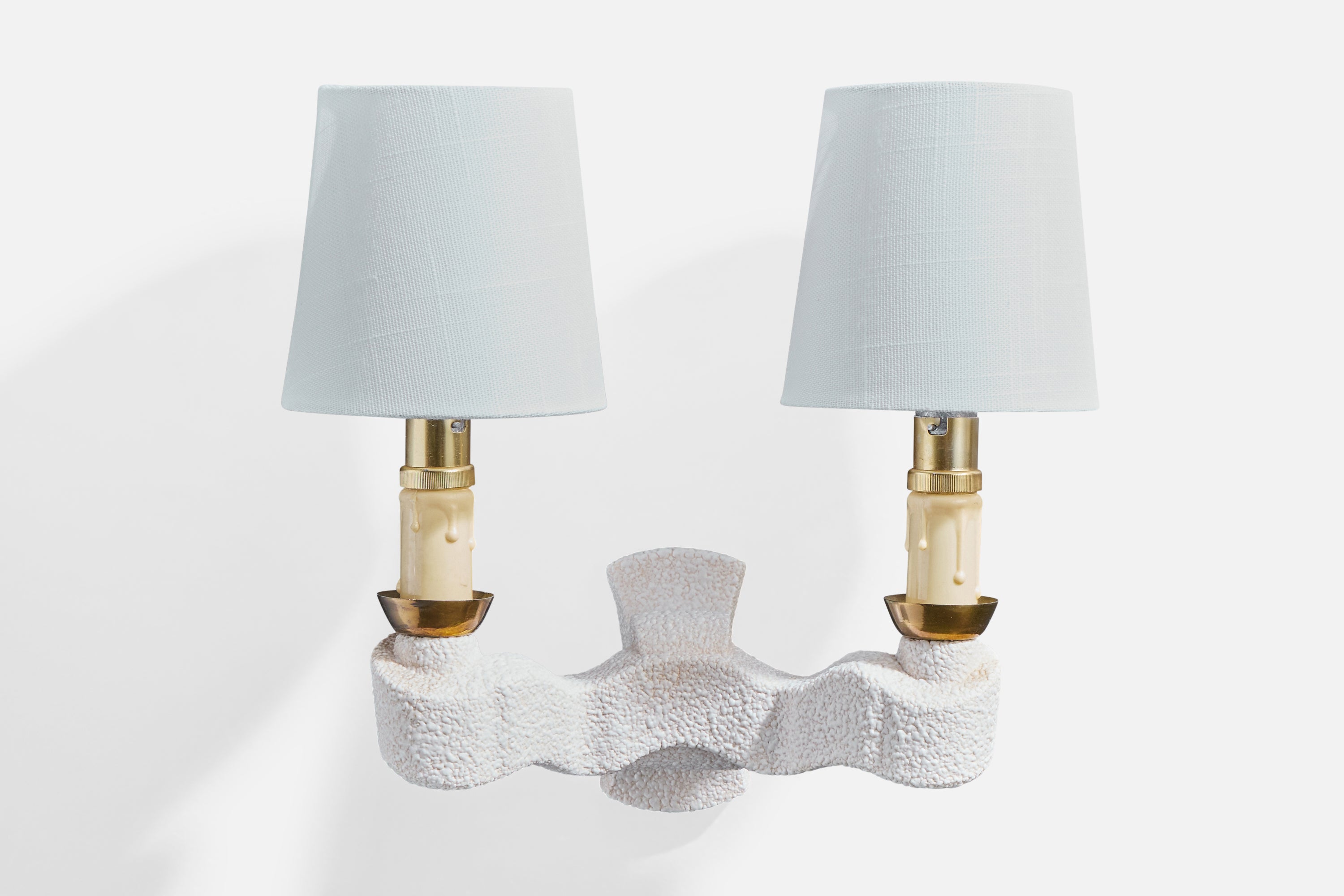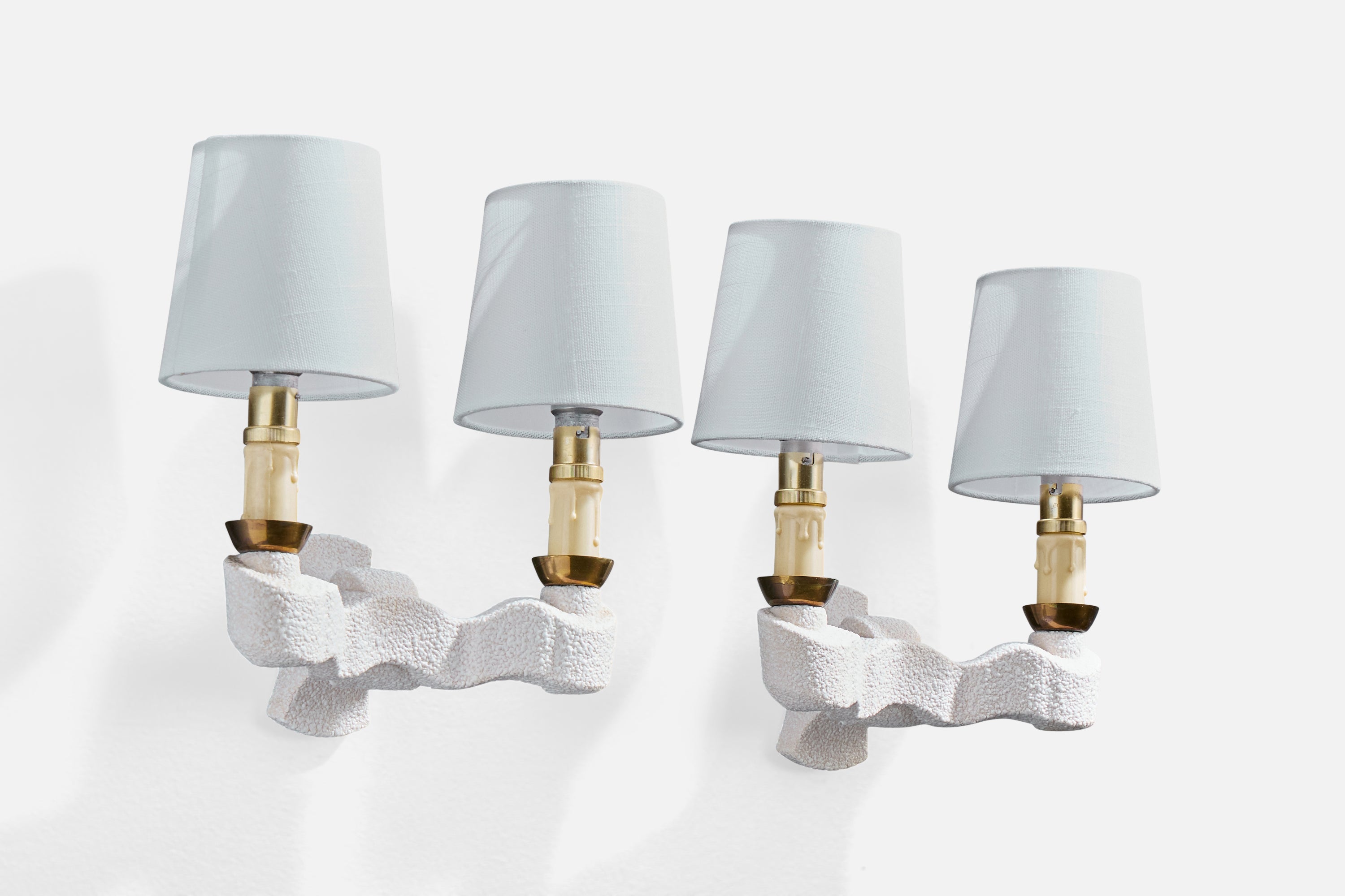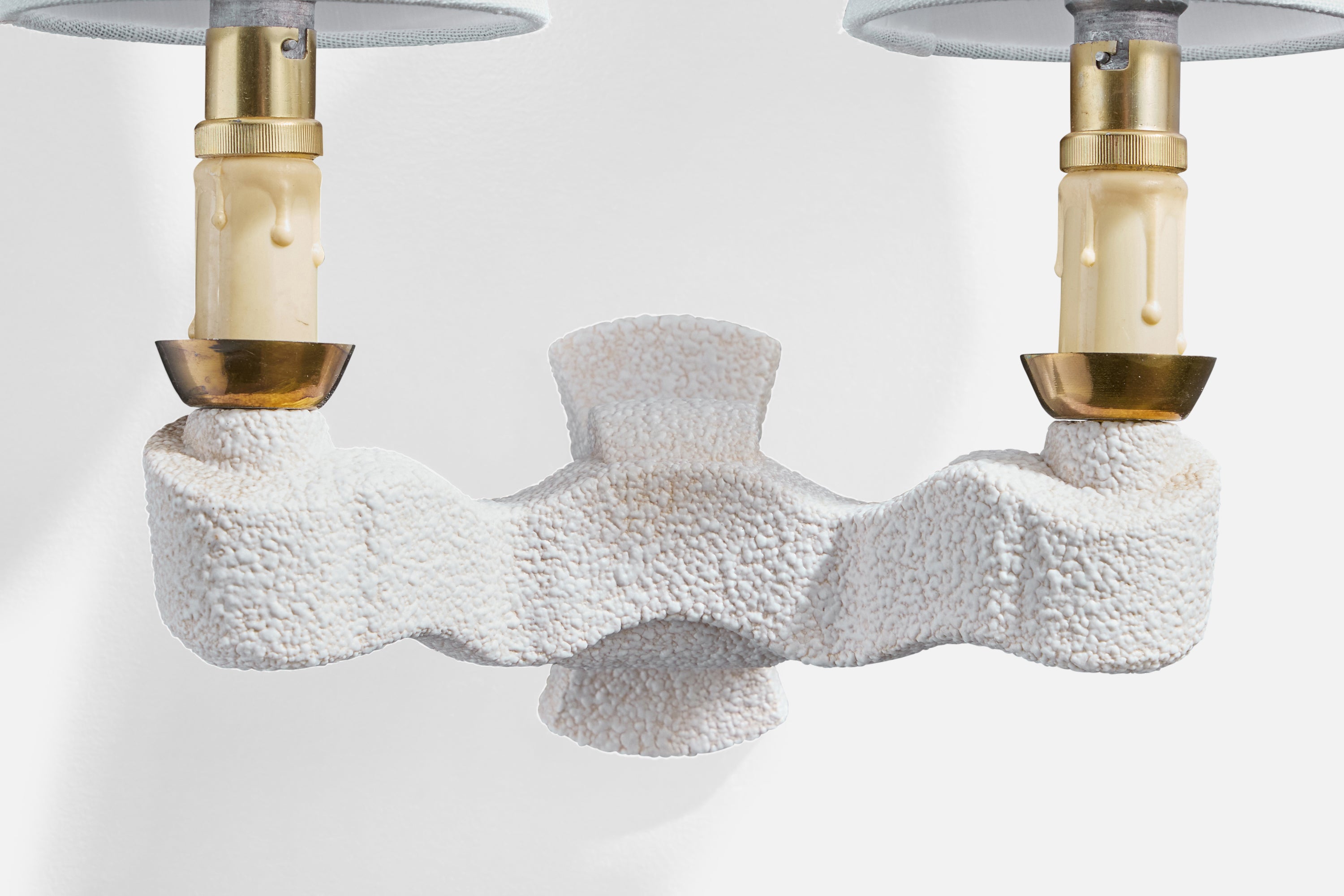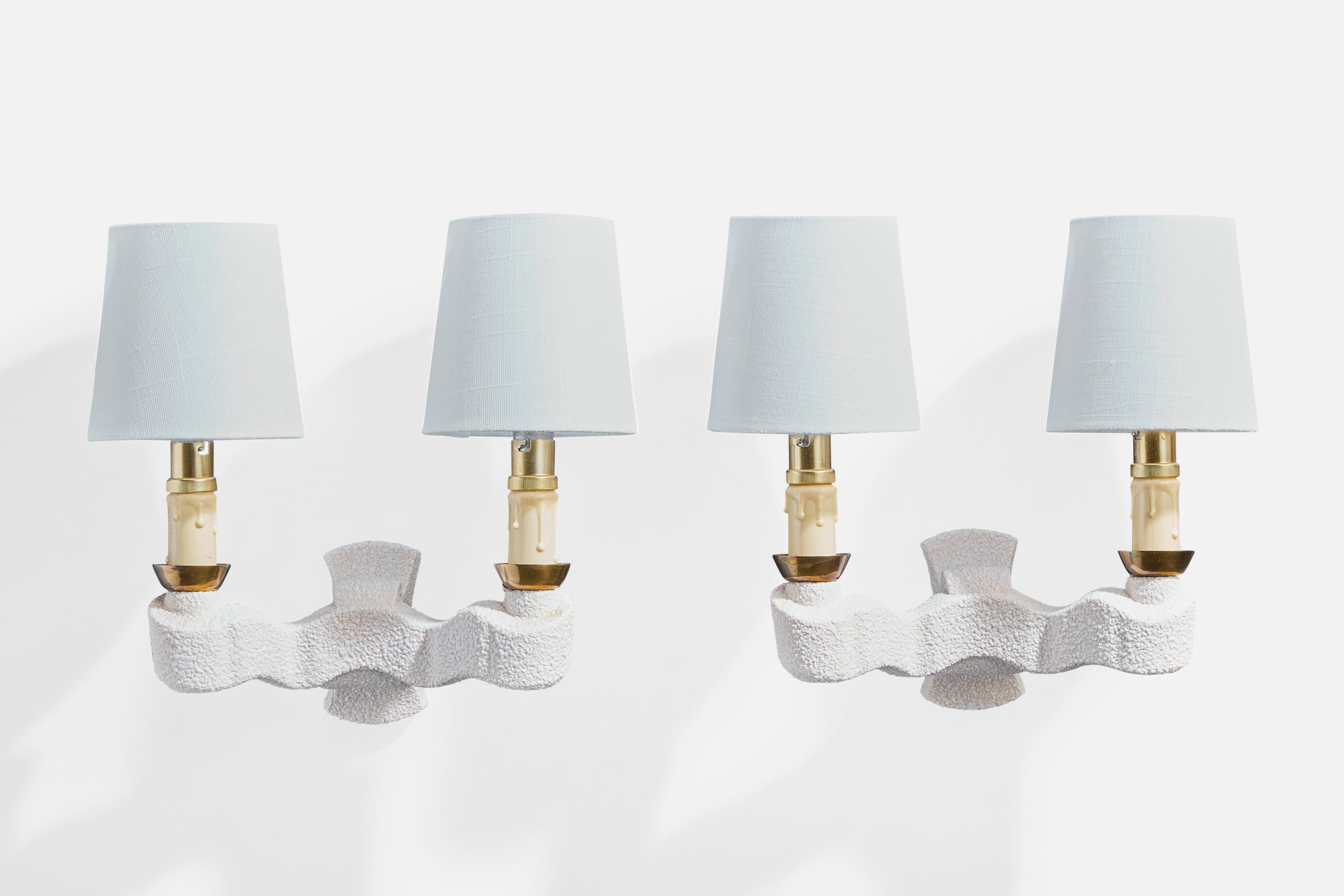 A pair of white ceramic and plaster, brass, plastic and white fabric wall lights designed and produced in France, c. 1970s.