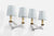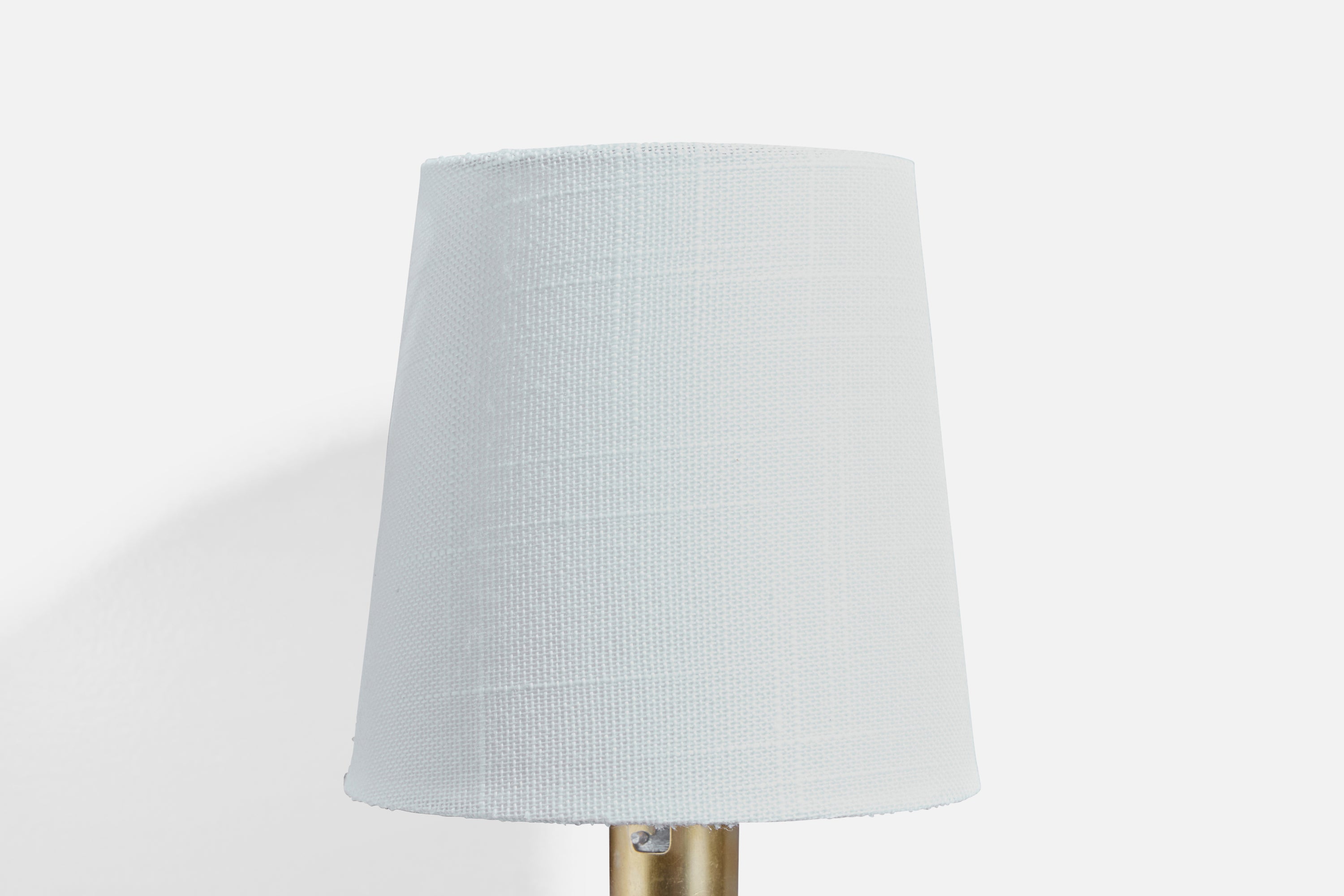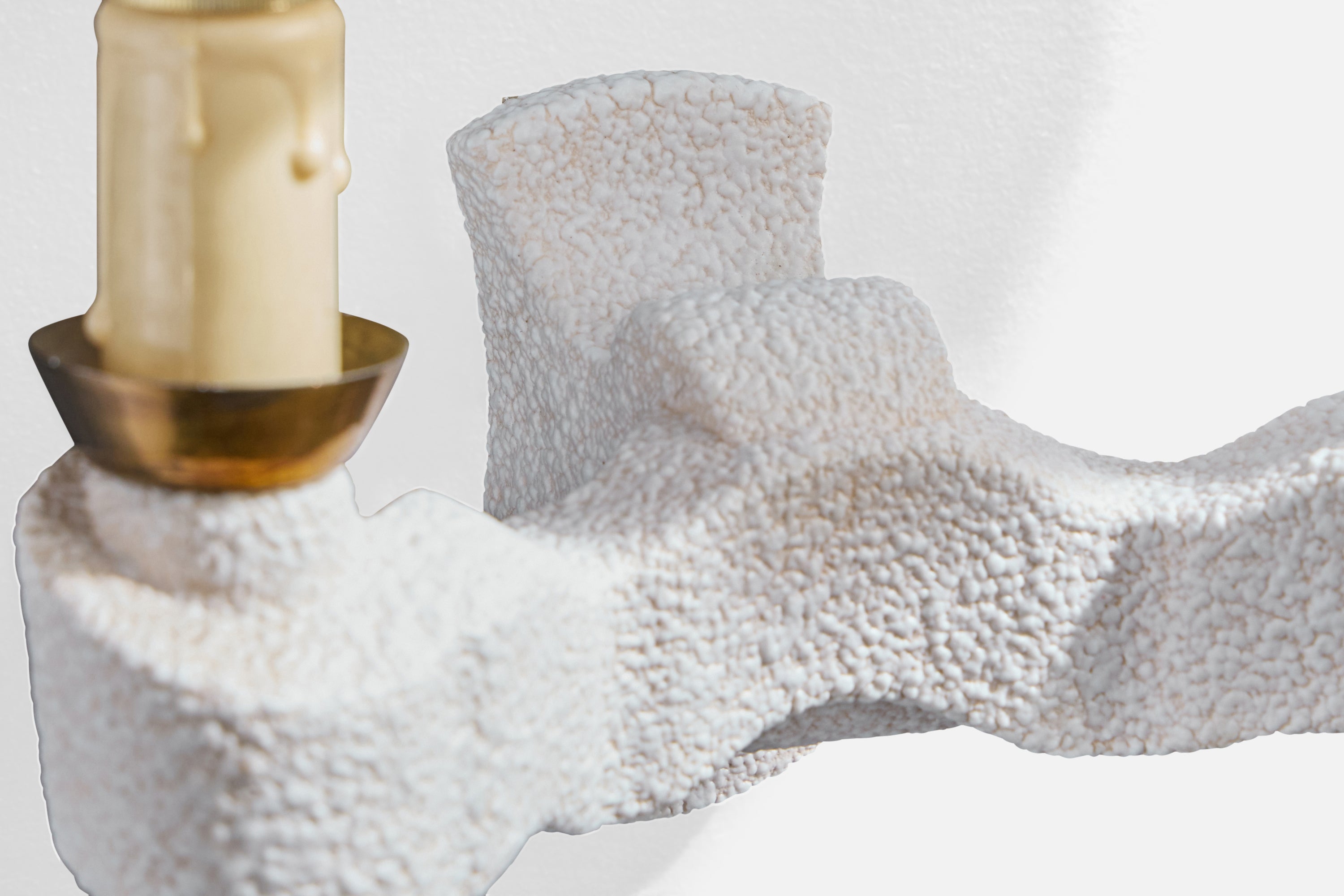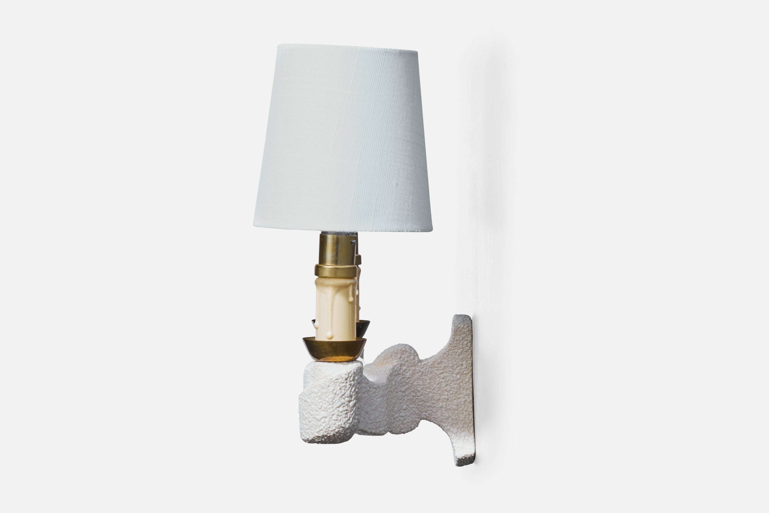 A pair of white ceramic and plaster, brass, plastic and white fabric wall lights designed and produced in France, c. 1970s.