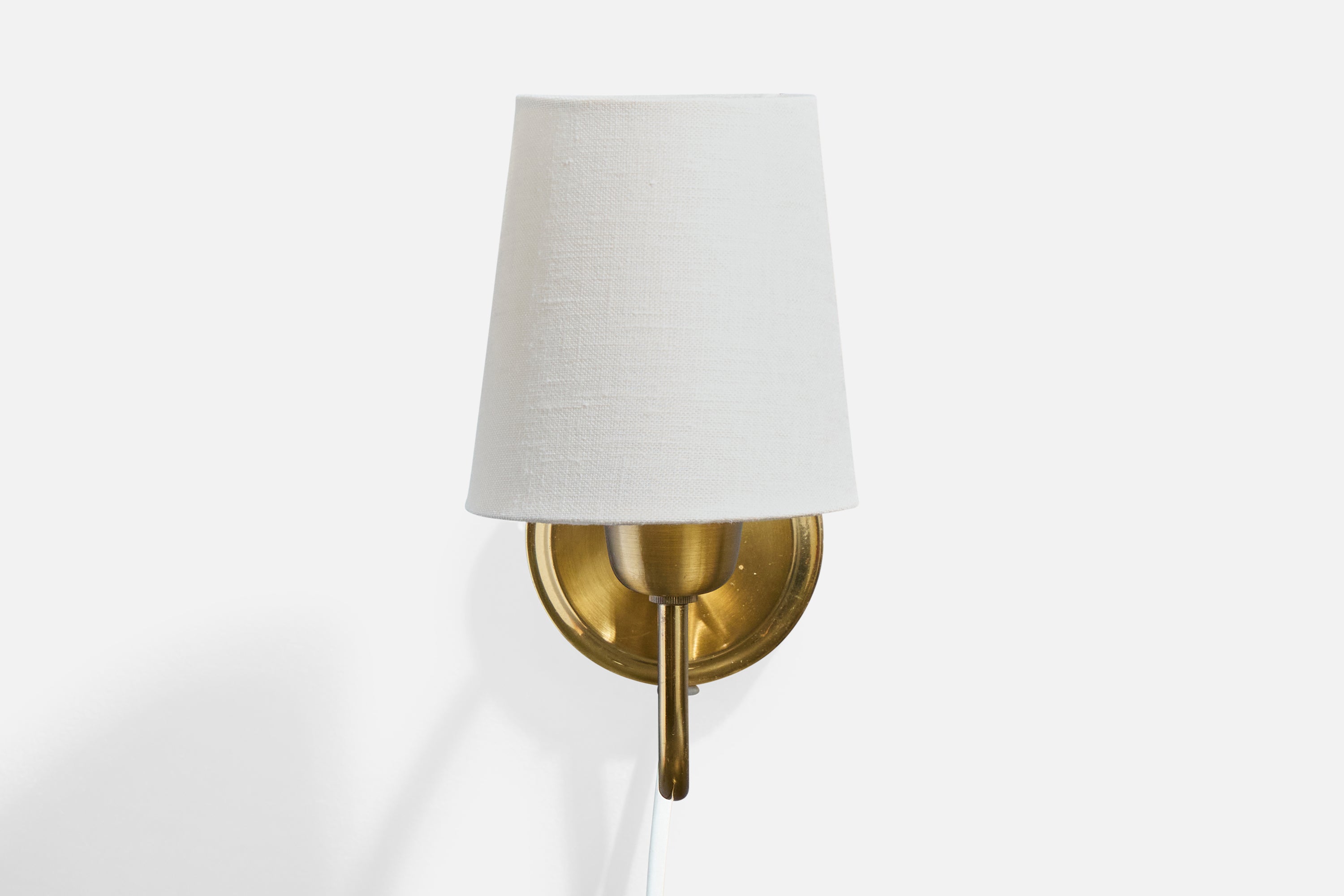 A brass and white fabric wall light designed and produced in Norway, c. 1950s.