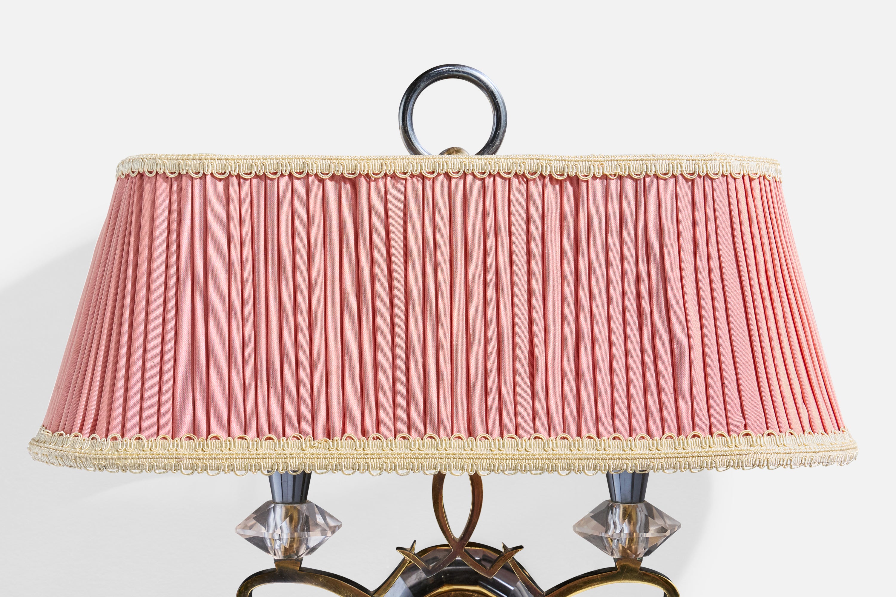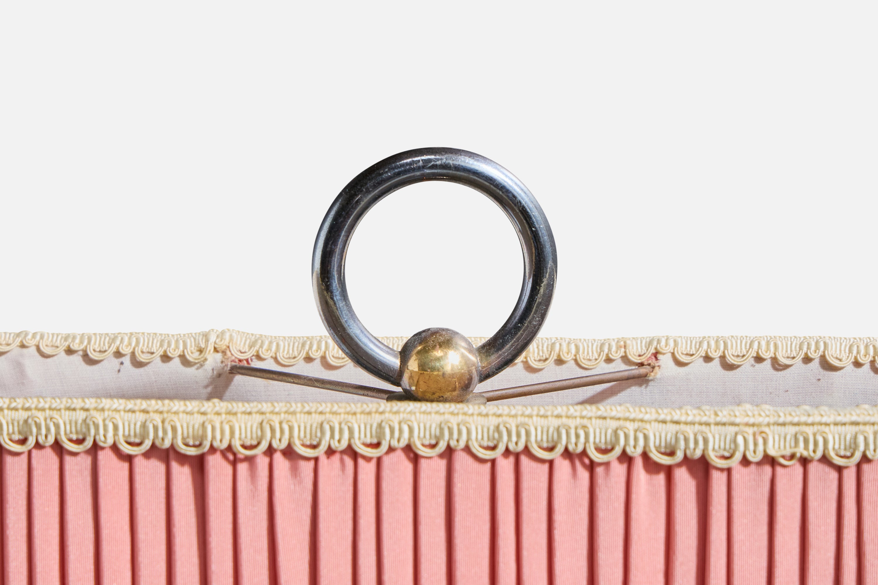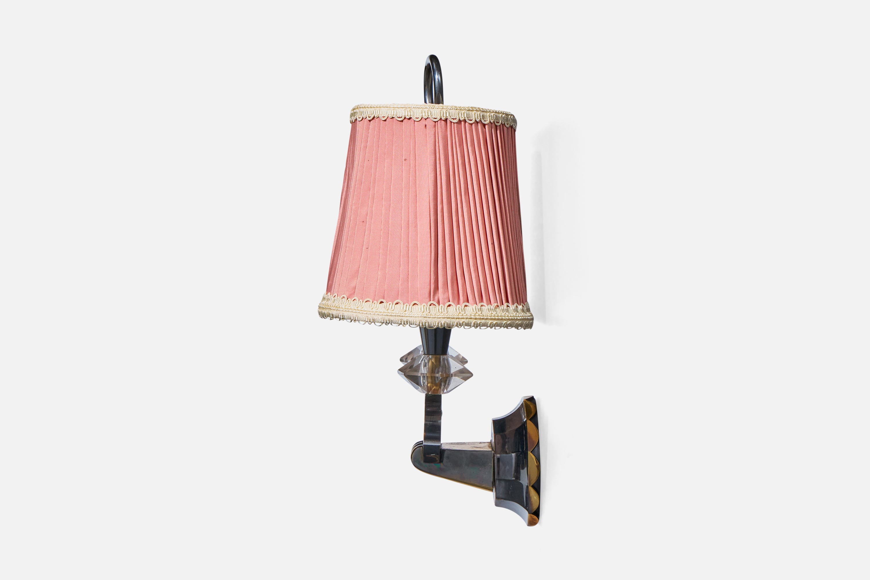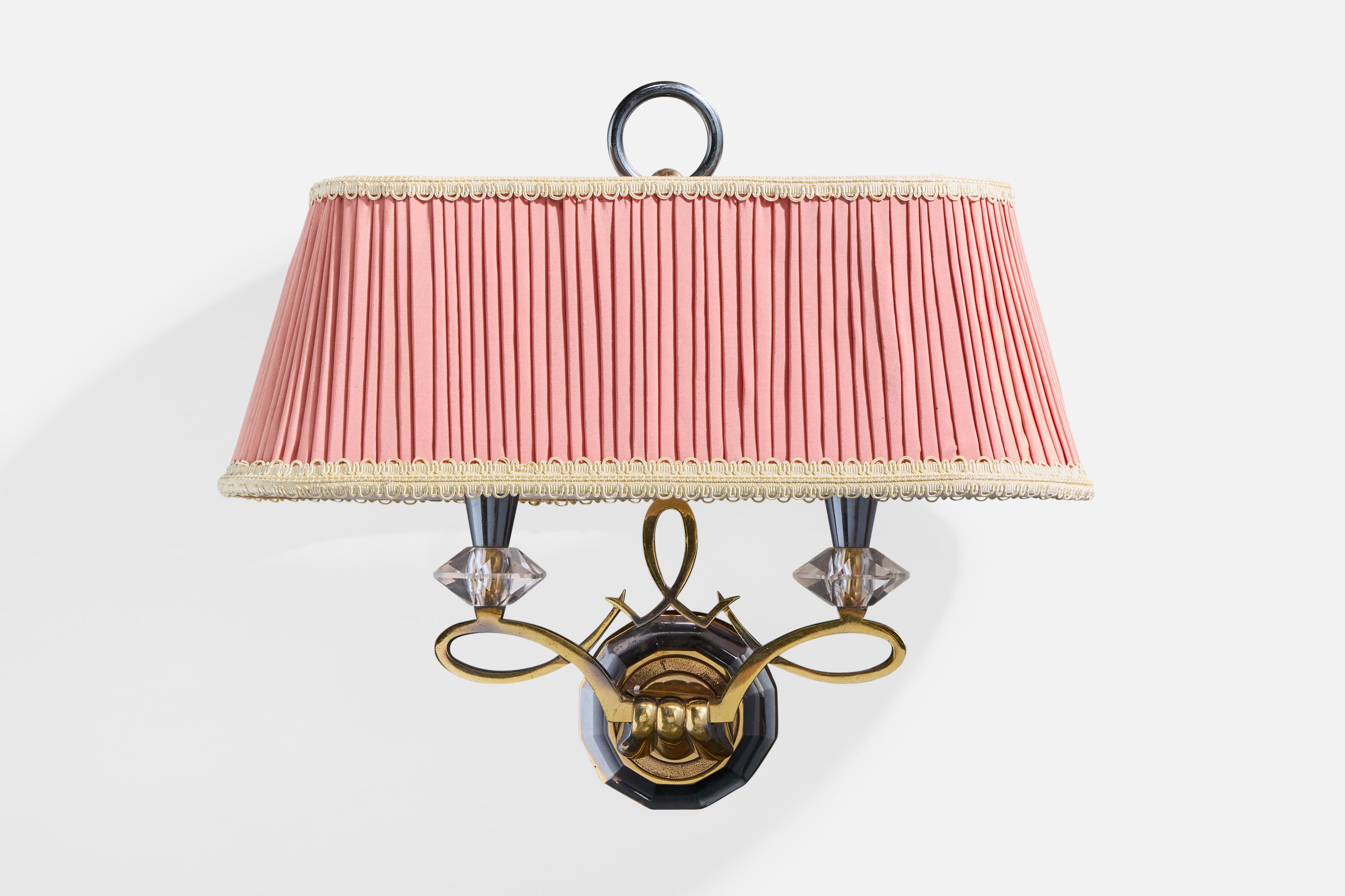 A brass, metal, acrylic and pink fabric wall light designed and produced in France, c. 1950s.