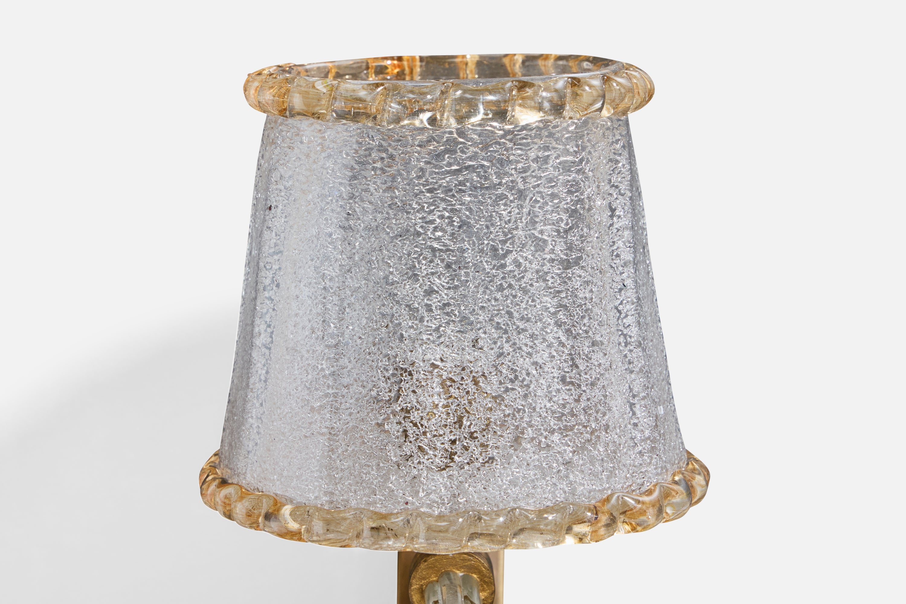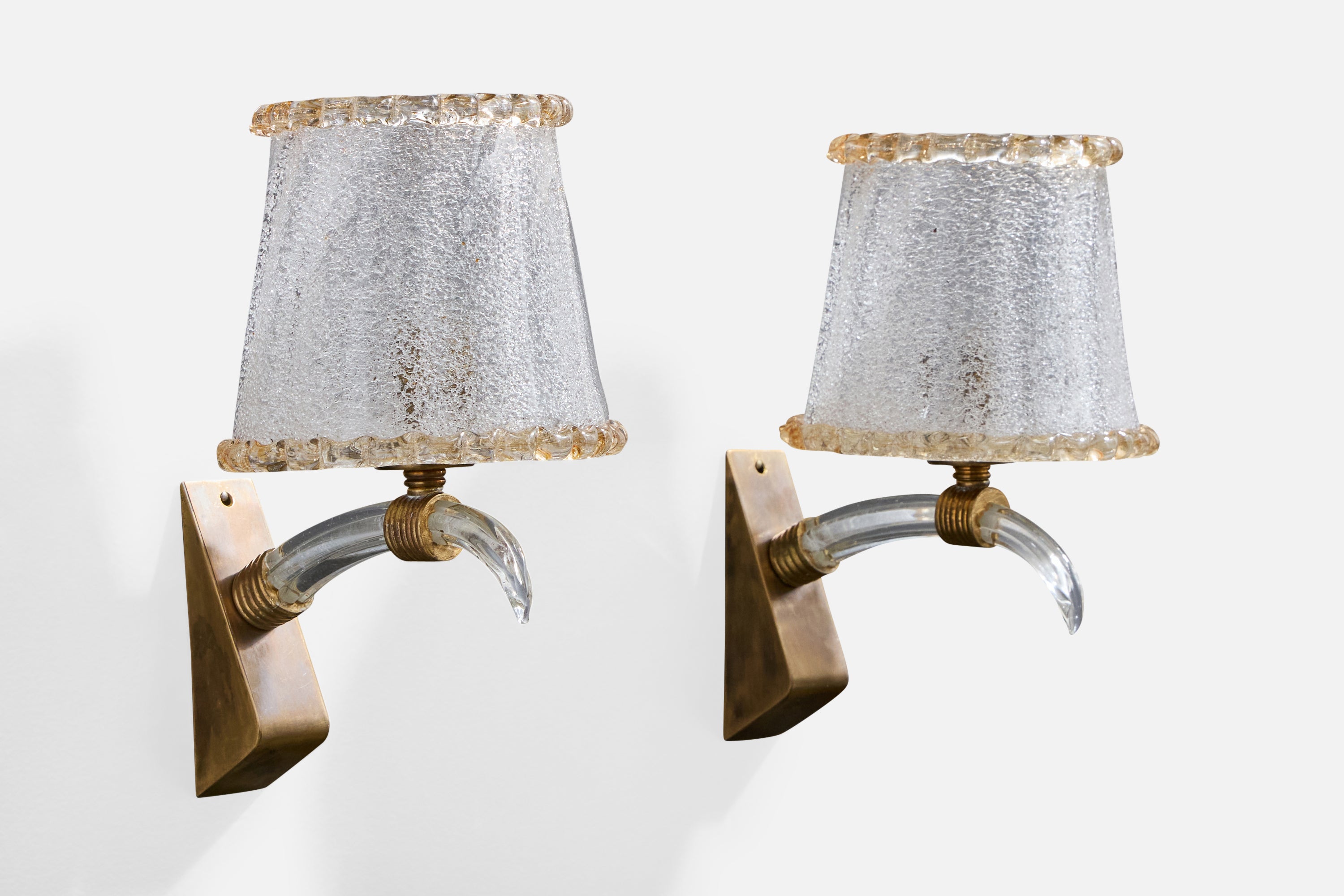A pair of brass and Murano glass wall lights designed and produced in Italy, c. 1940s.