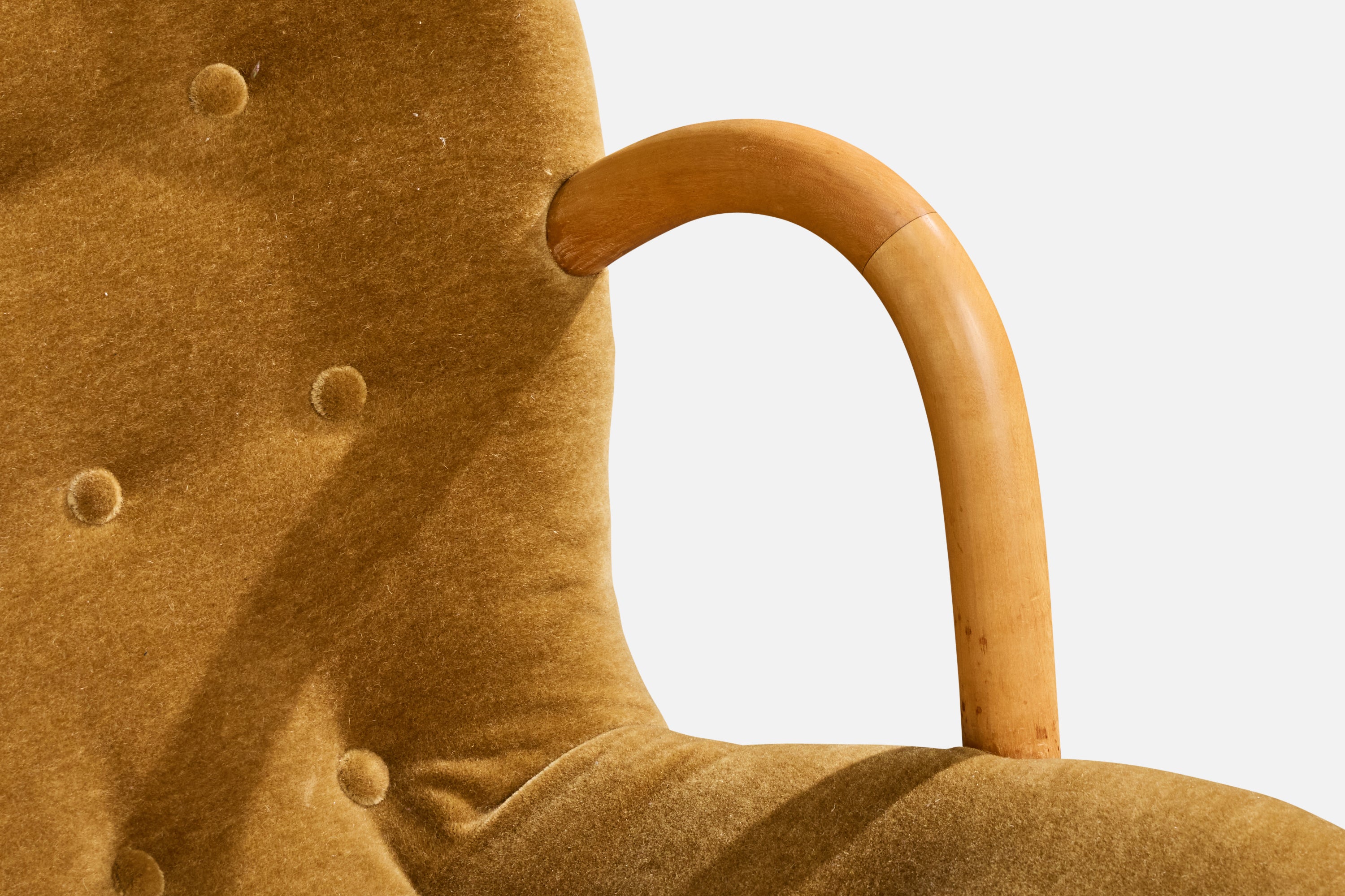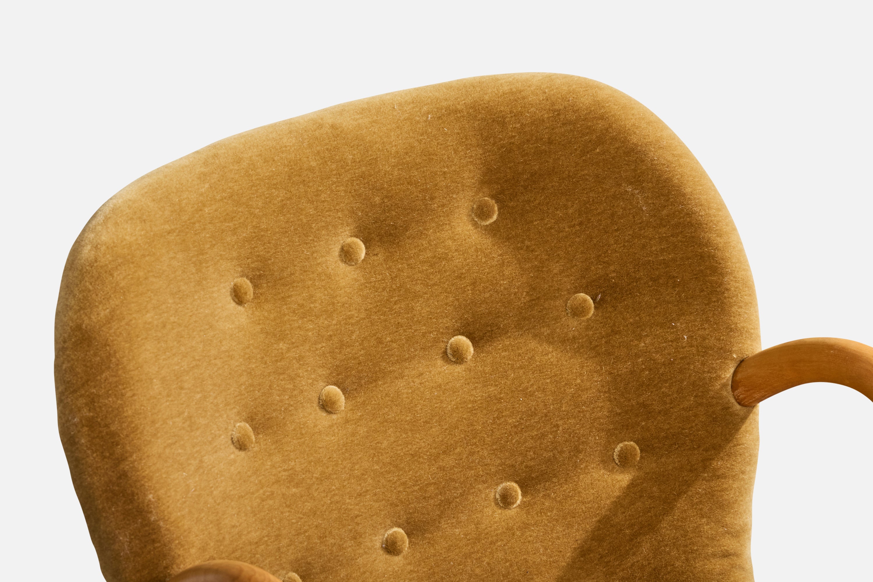 A wood and velvet lounge chair designed by Arnold Madsen and produced in Sweden, c. 1950s.