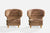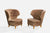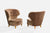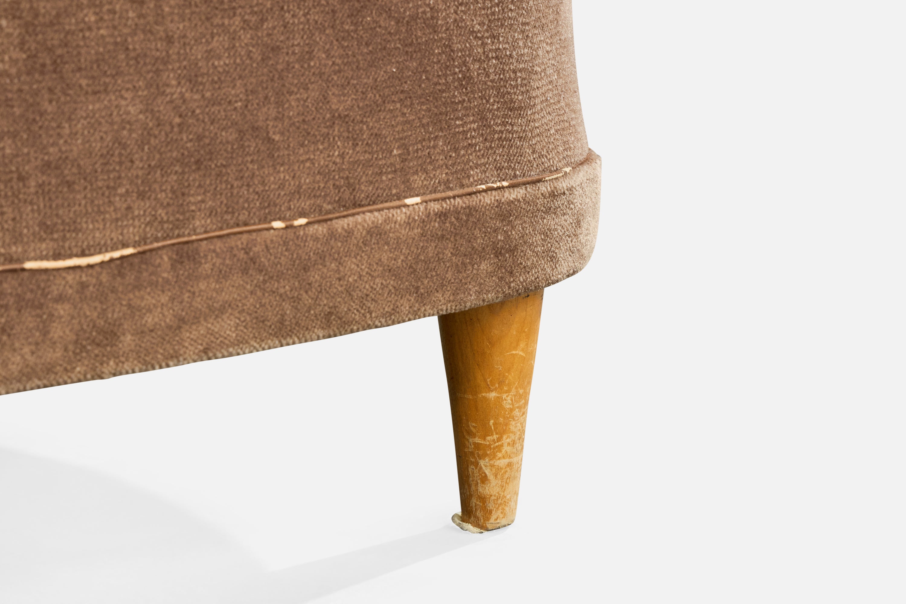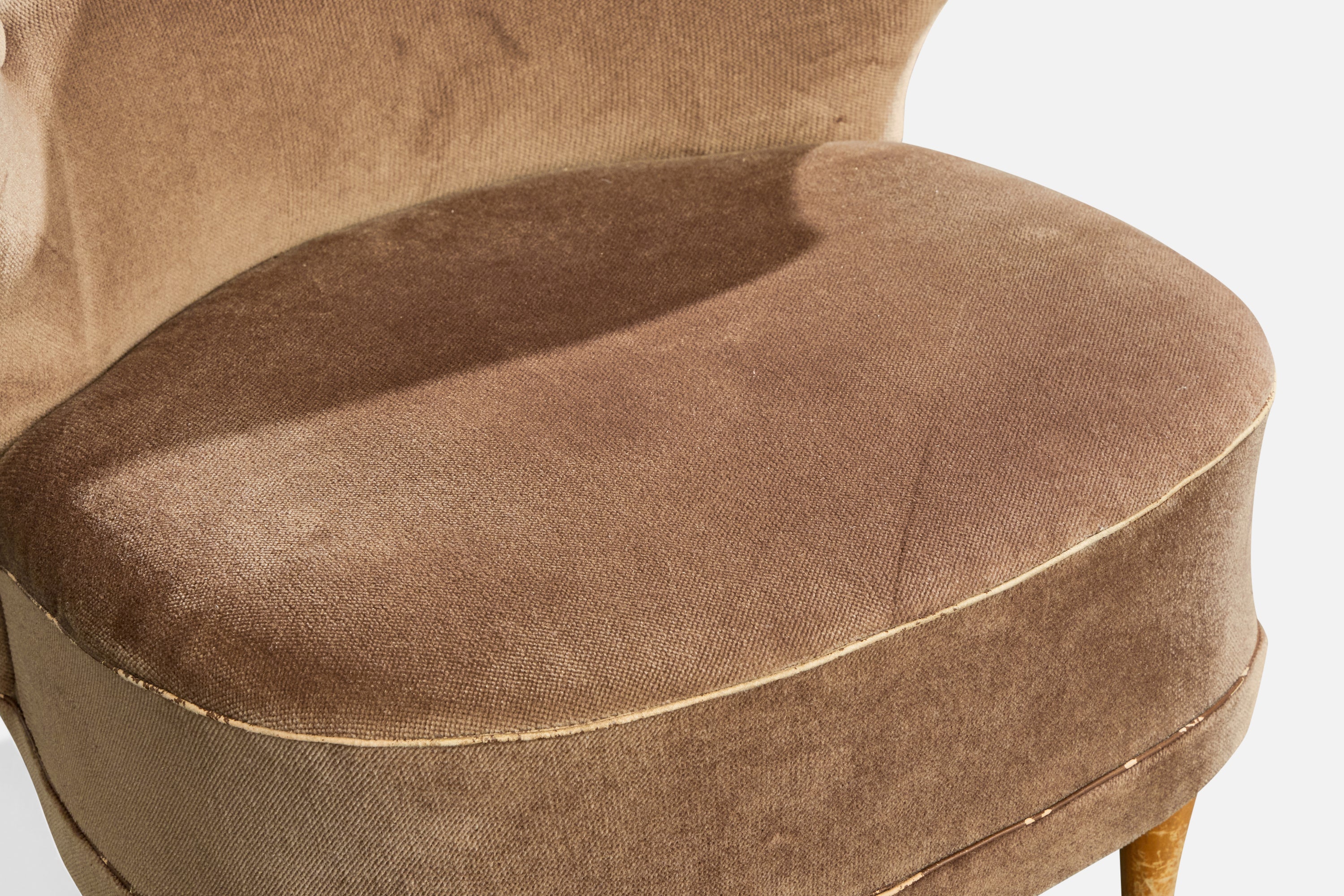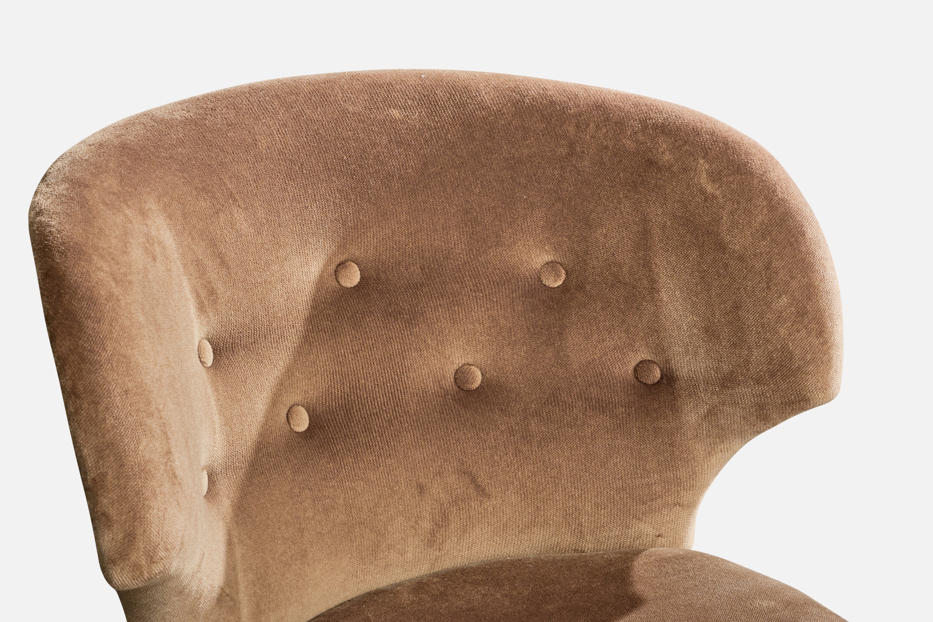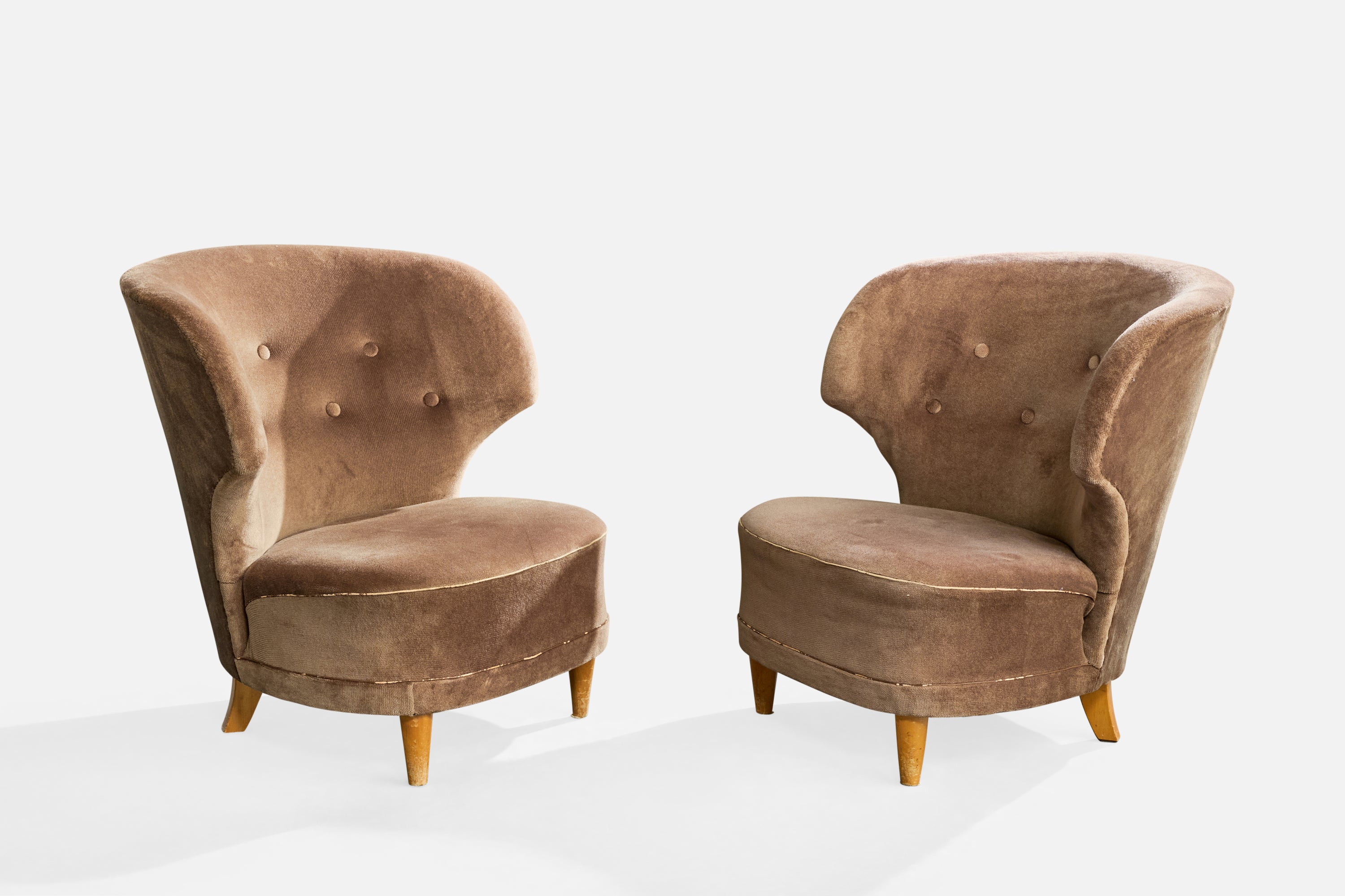 A pair of brown velvet and wood lounge chairs designed and produced in Finland, c. 1950s.