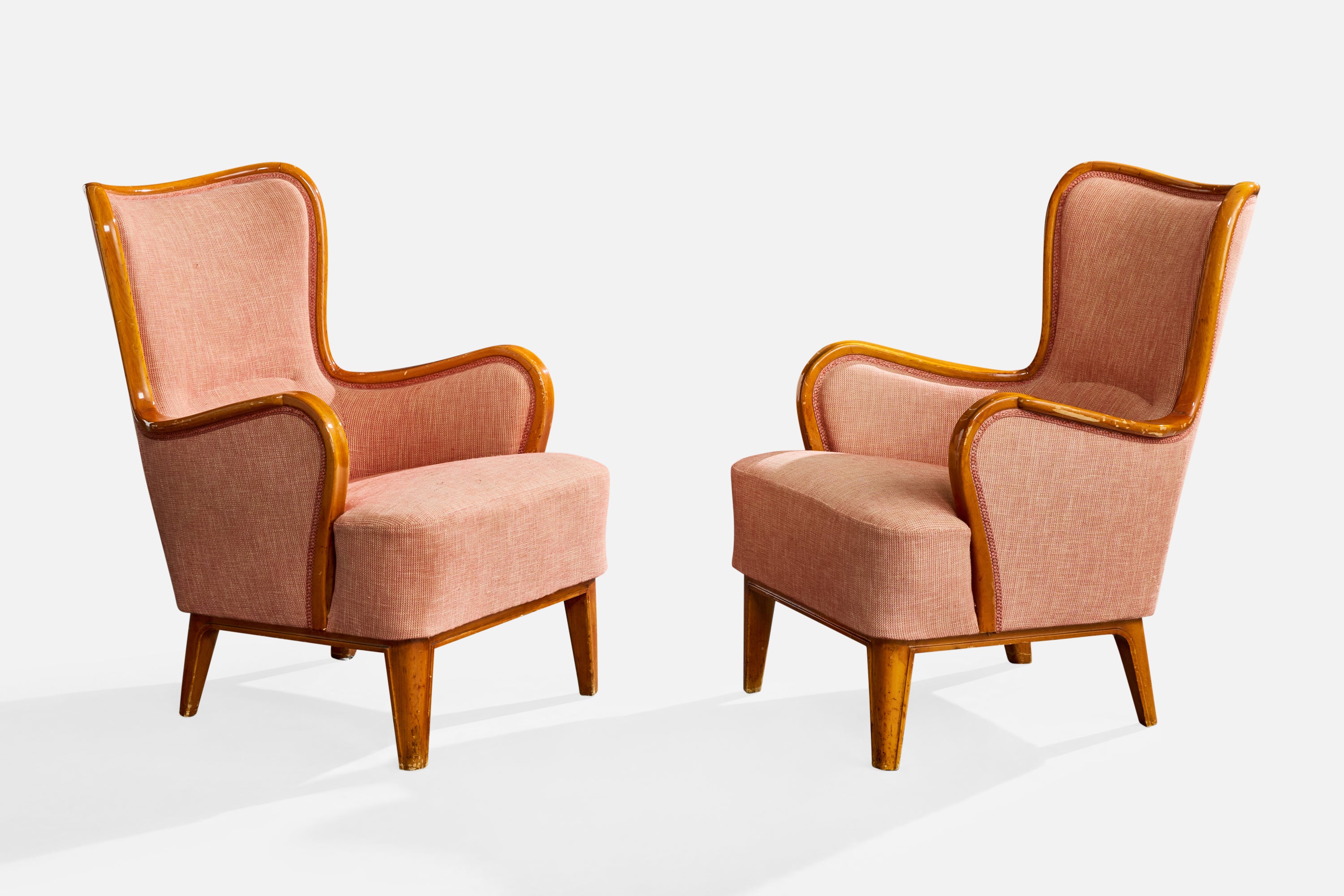 Swedish Designer, Lounge Chairs, Wood, Fabric, Sweden, 1930s
