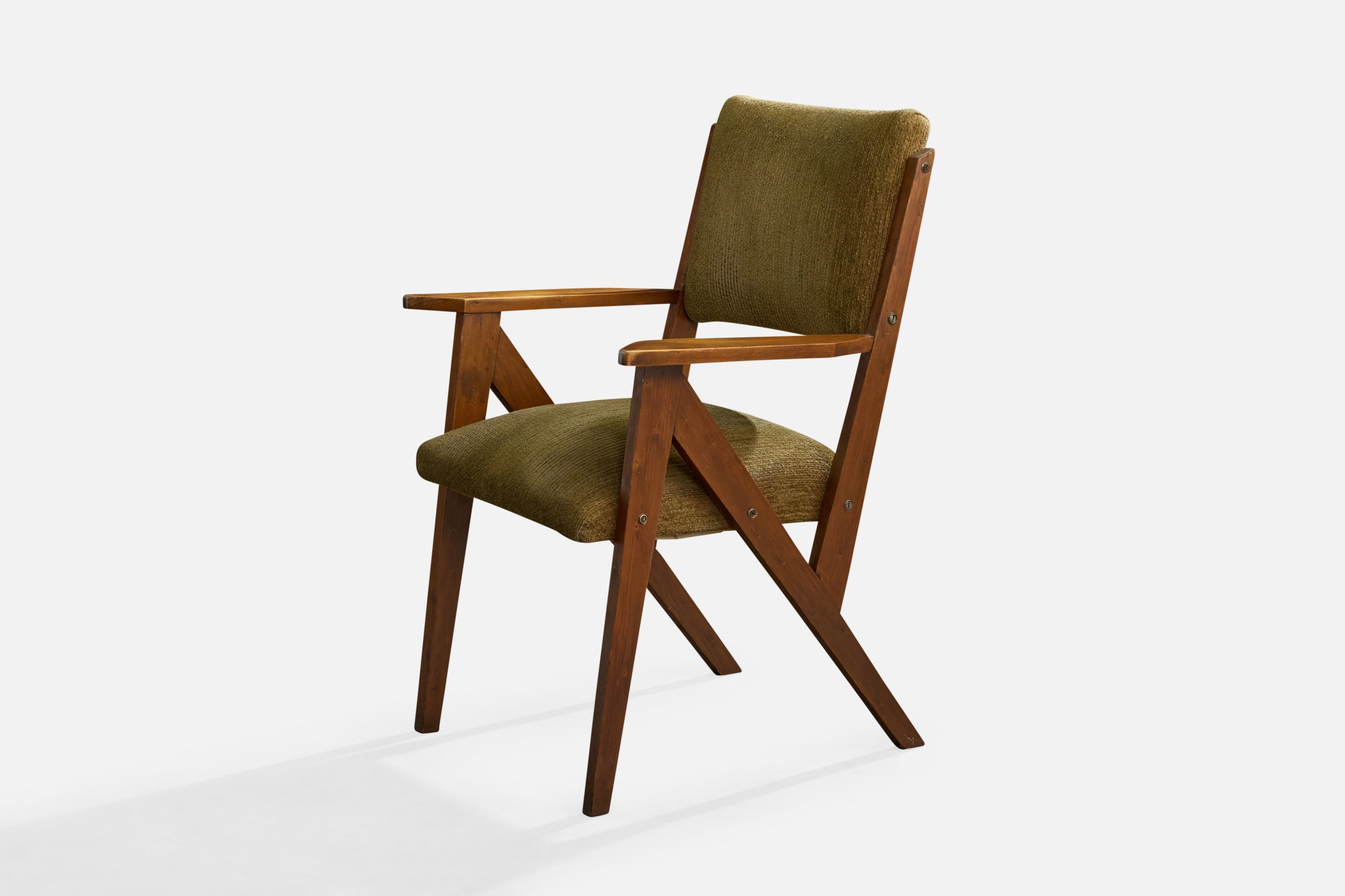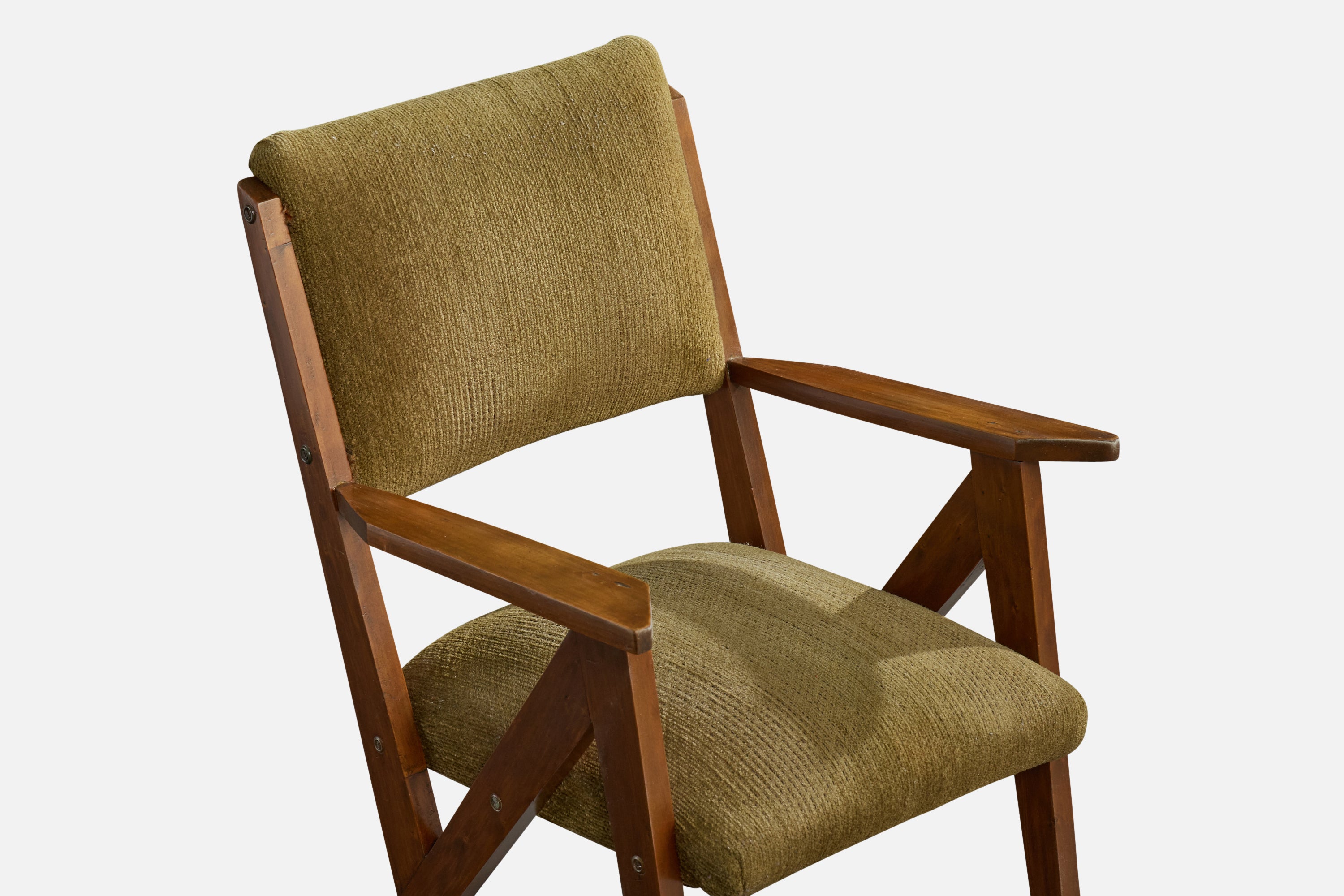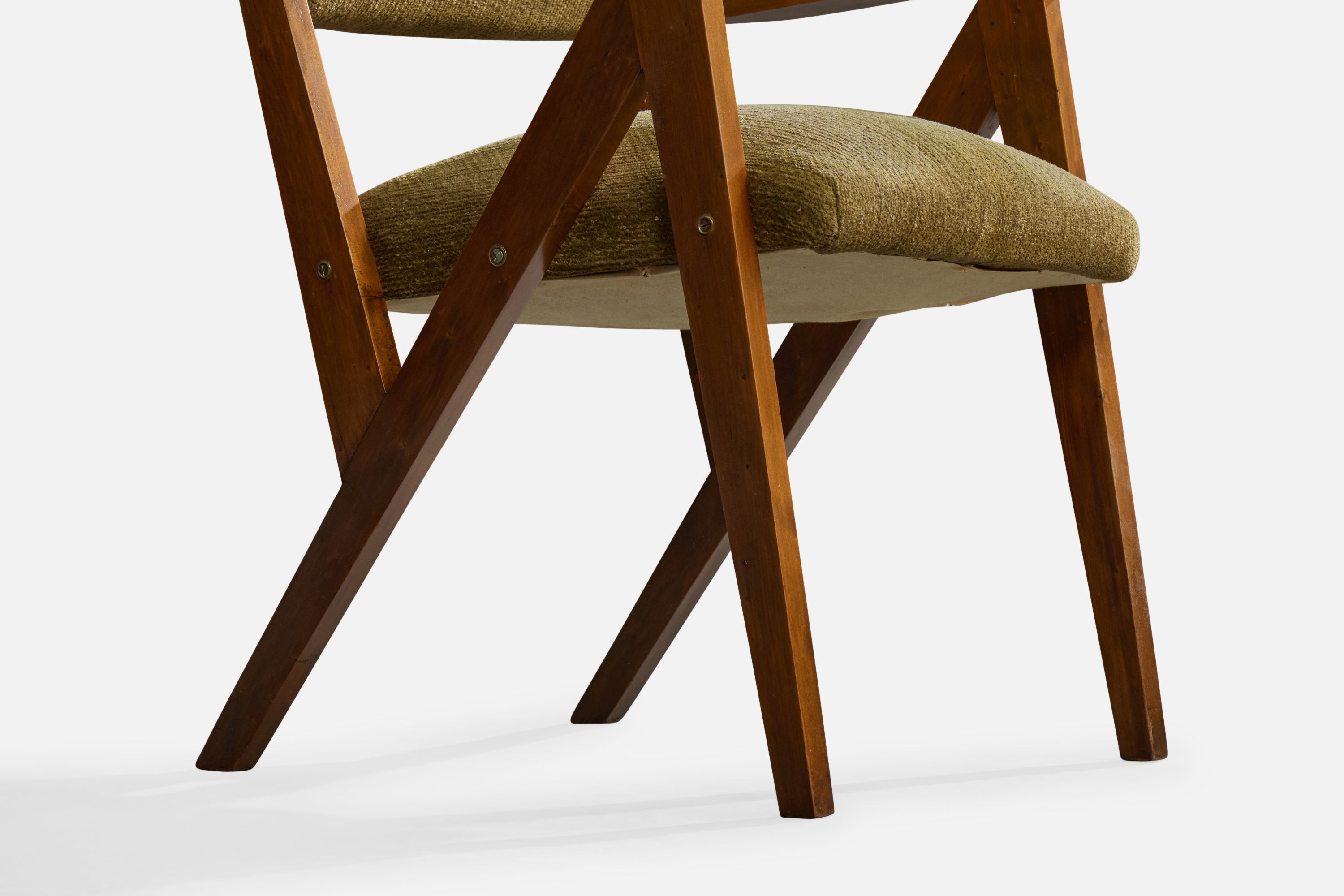 A dark-stained wood, metal and green fabric armchair or side chair designed and produced in Brazil, c. 1950s.