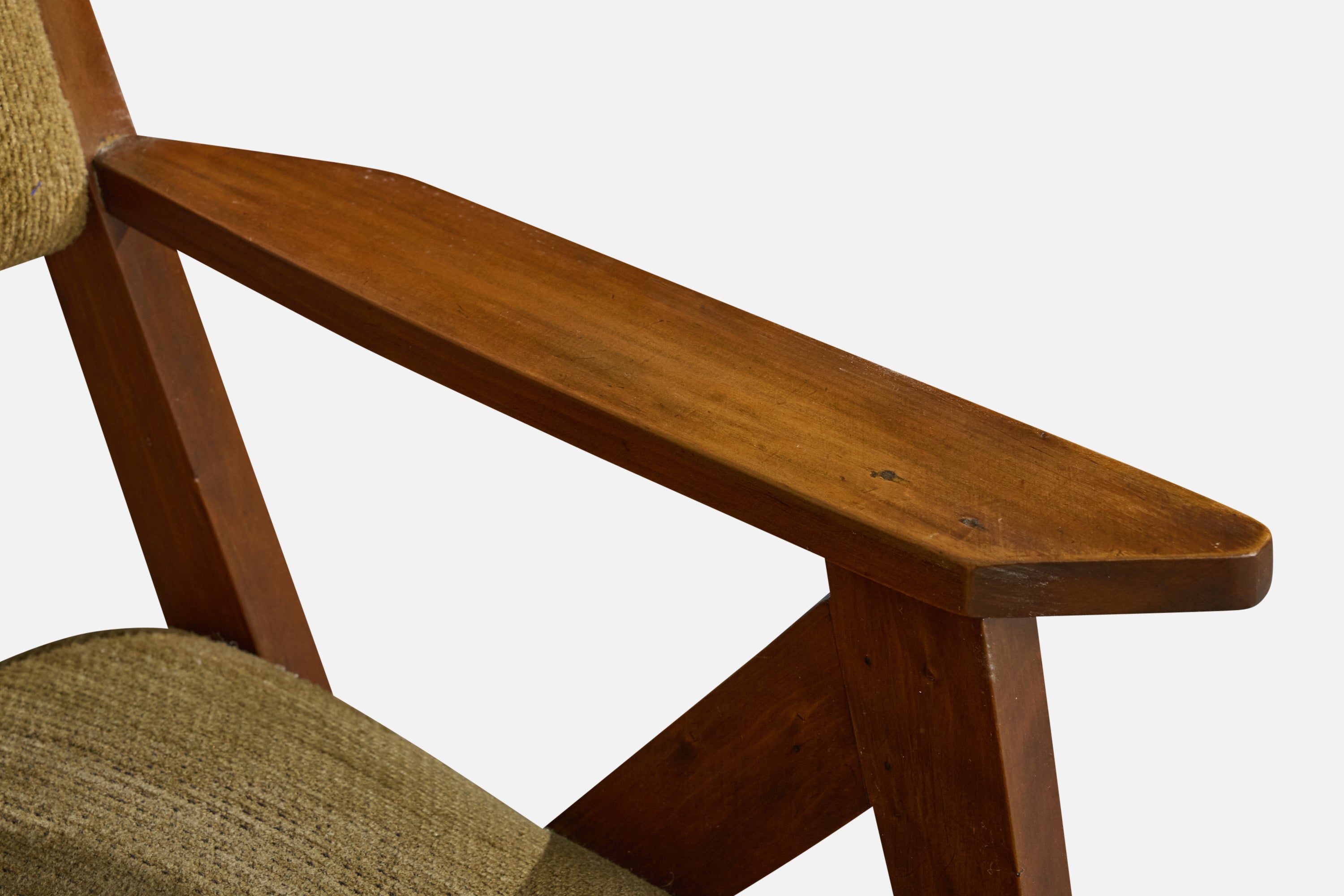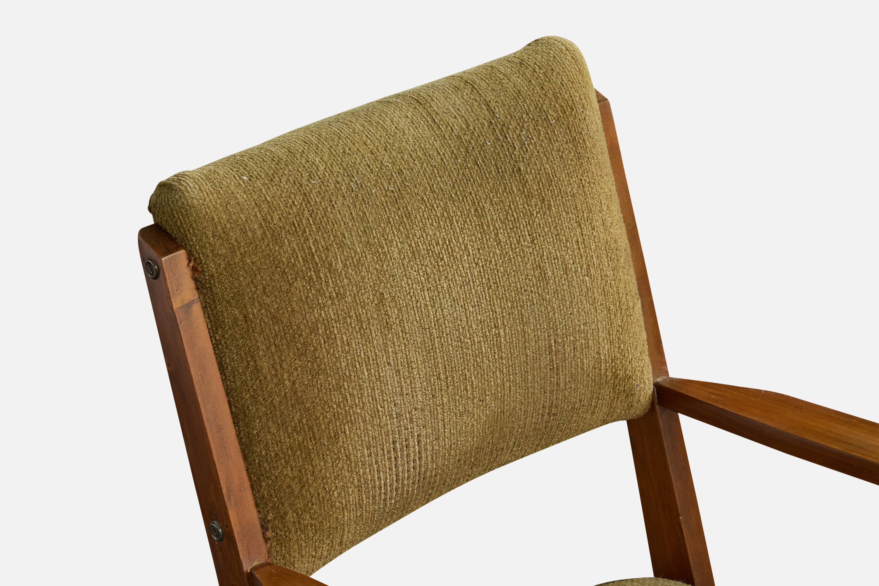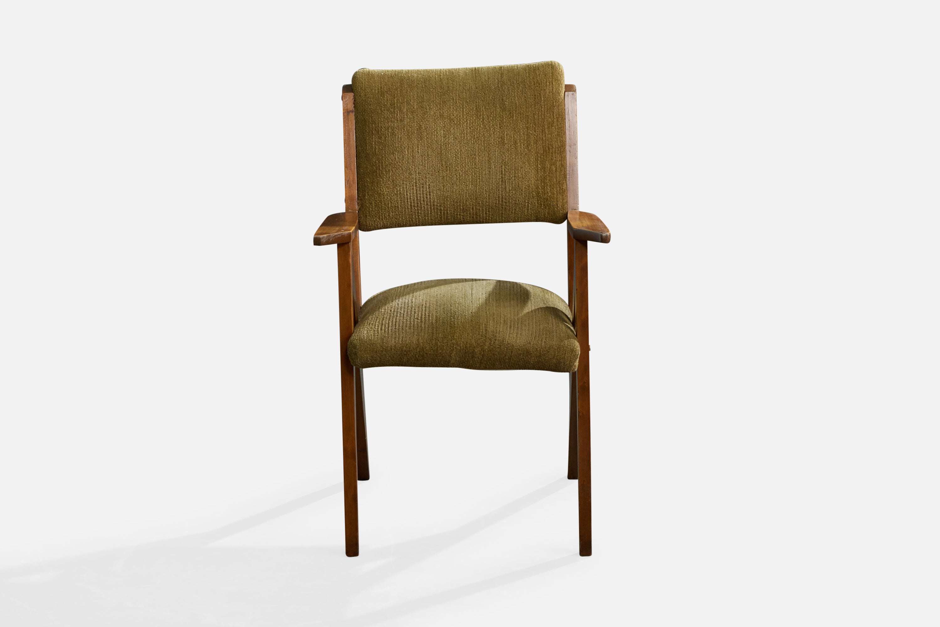 A dark-stained wood, metal and green fabric armchair or side chair designed and produced in Brazil, c. 1950s.