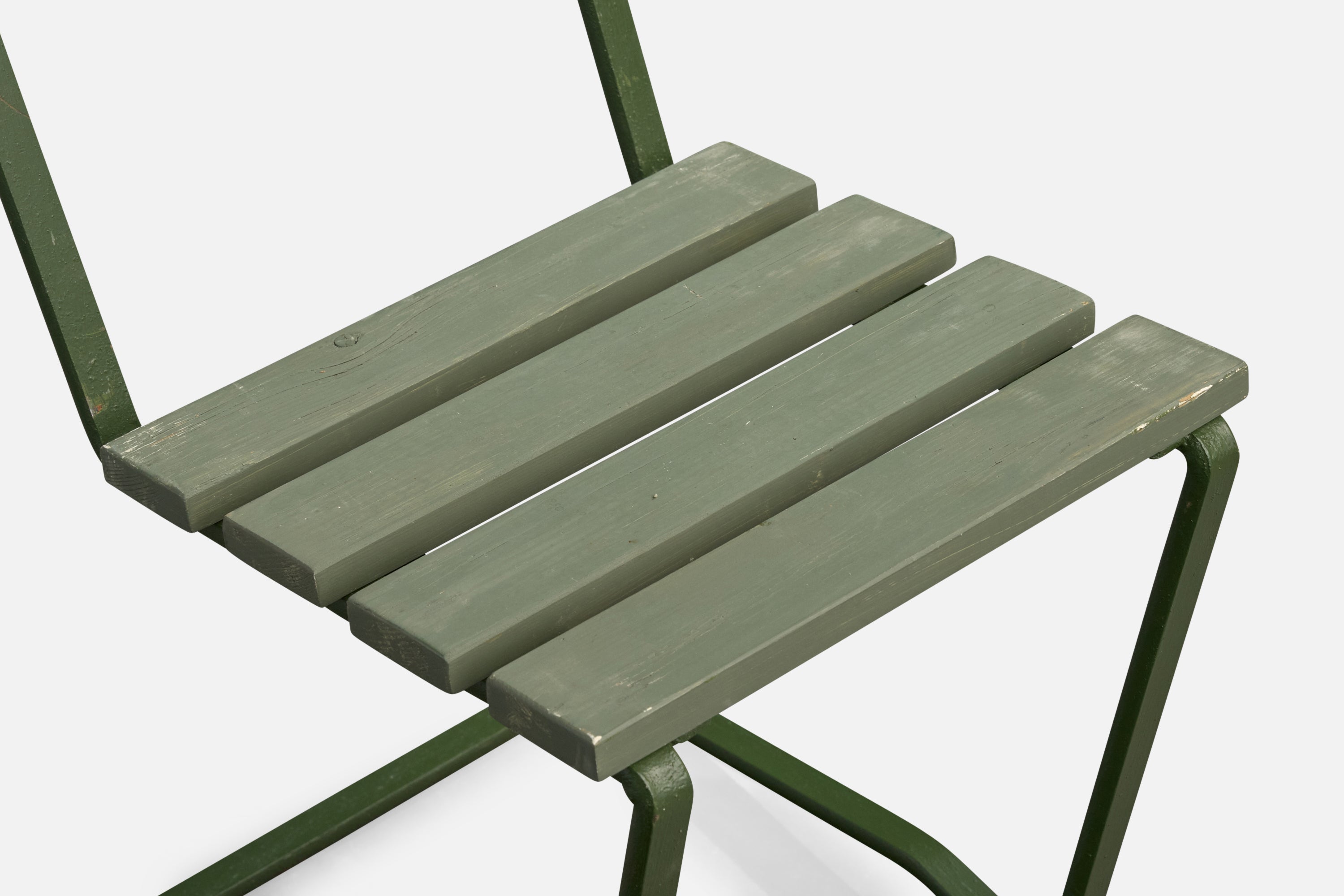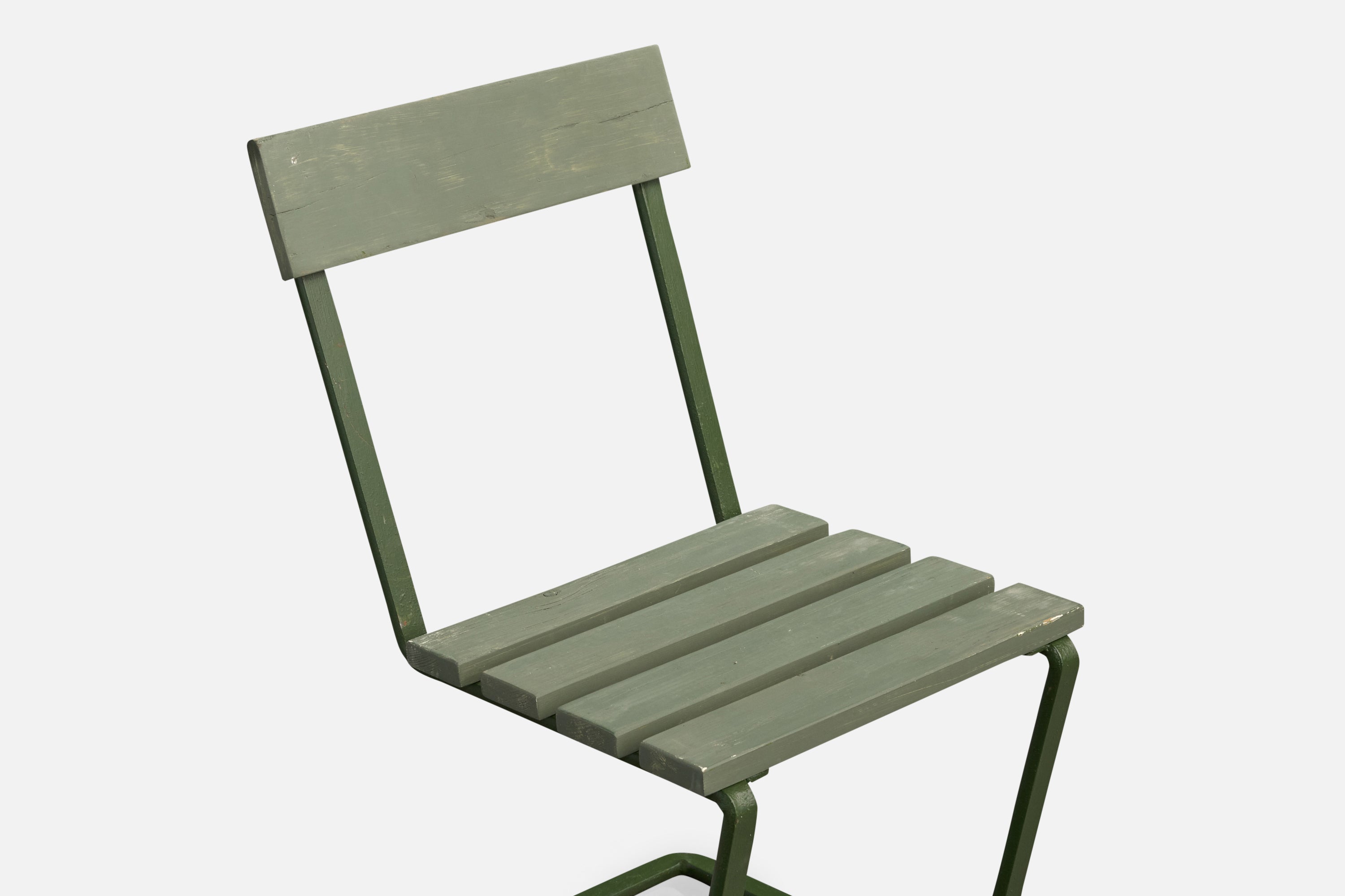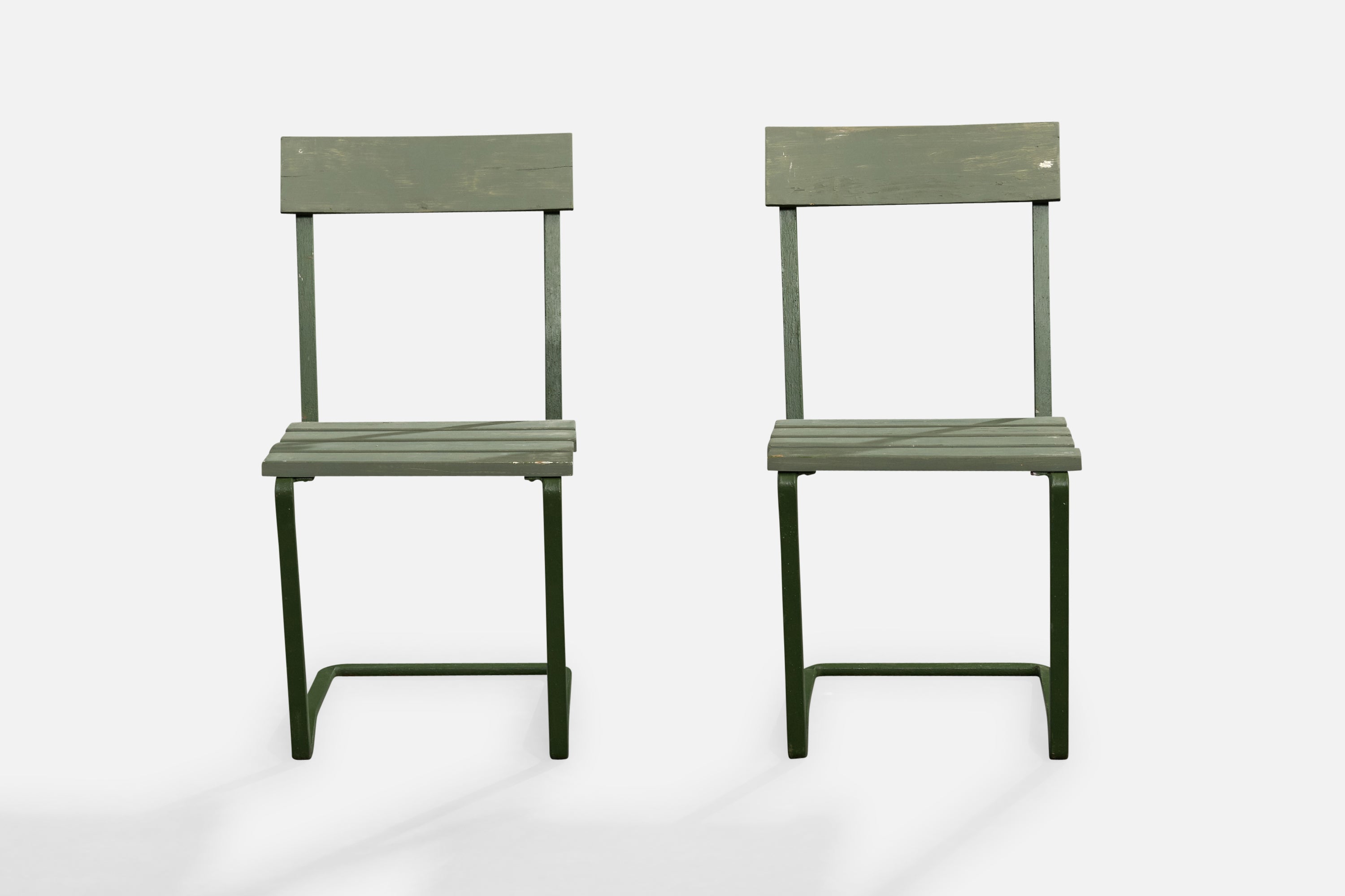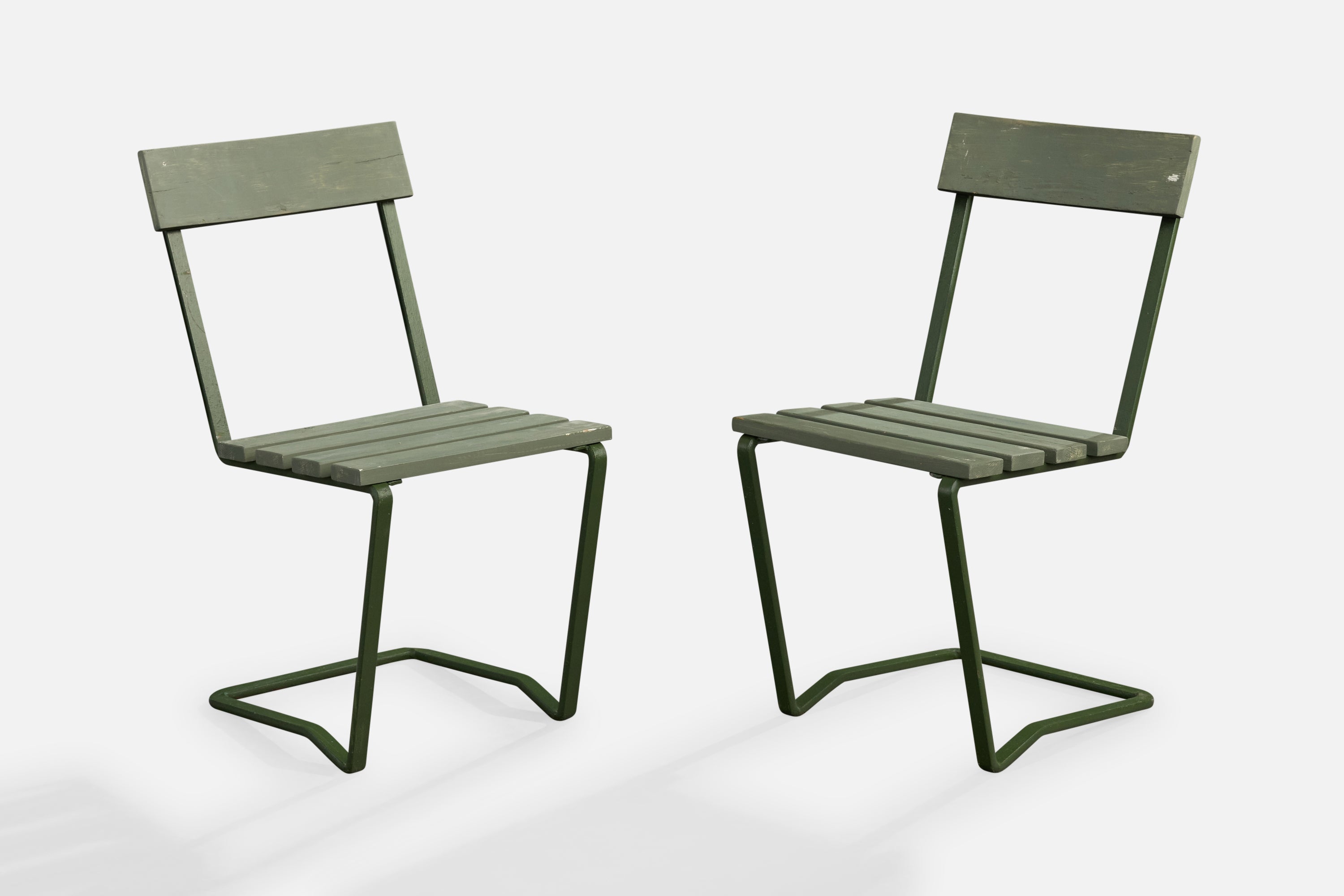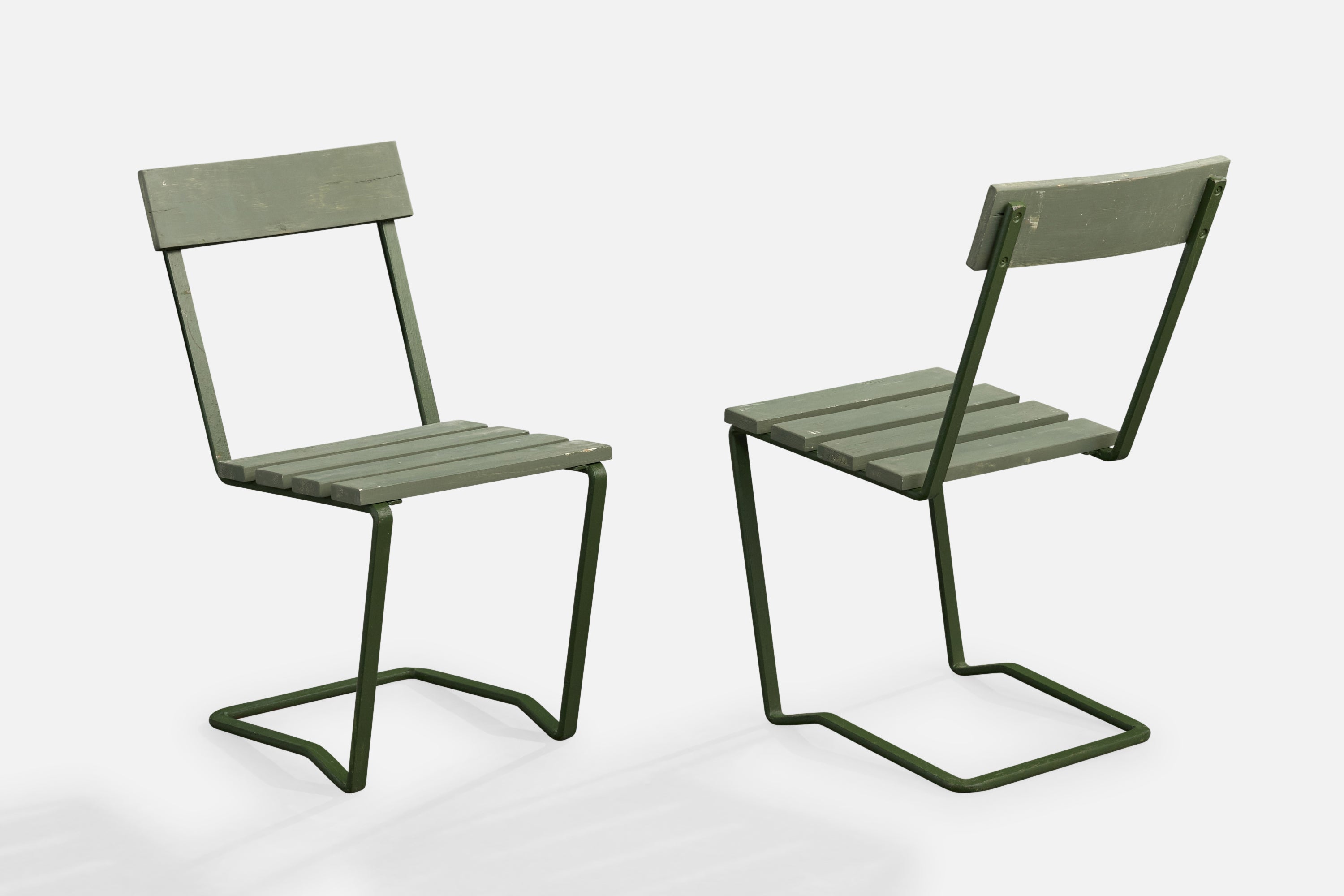 A pair of green-painted cast iron and wood side chairs or garden chairs designed and produced in Sweden, c. 1930s.