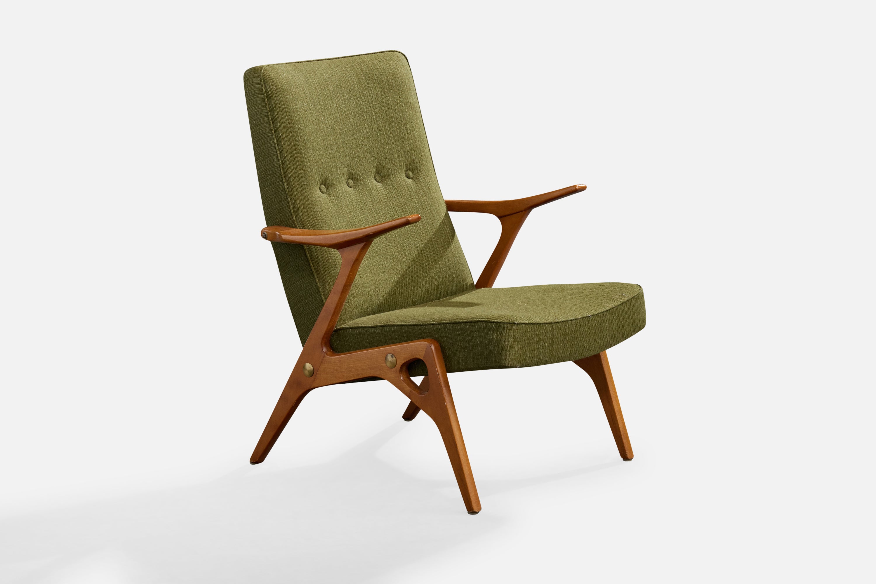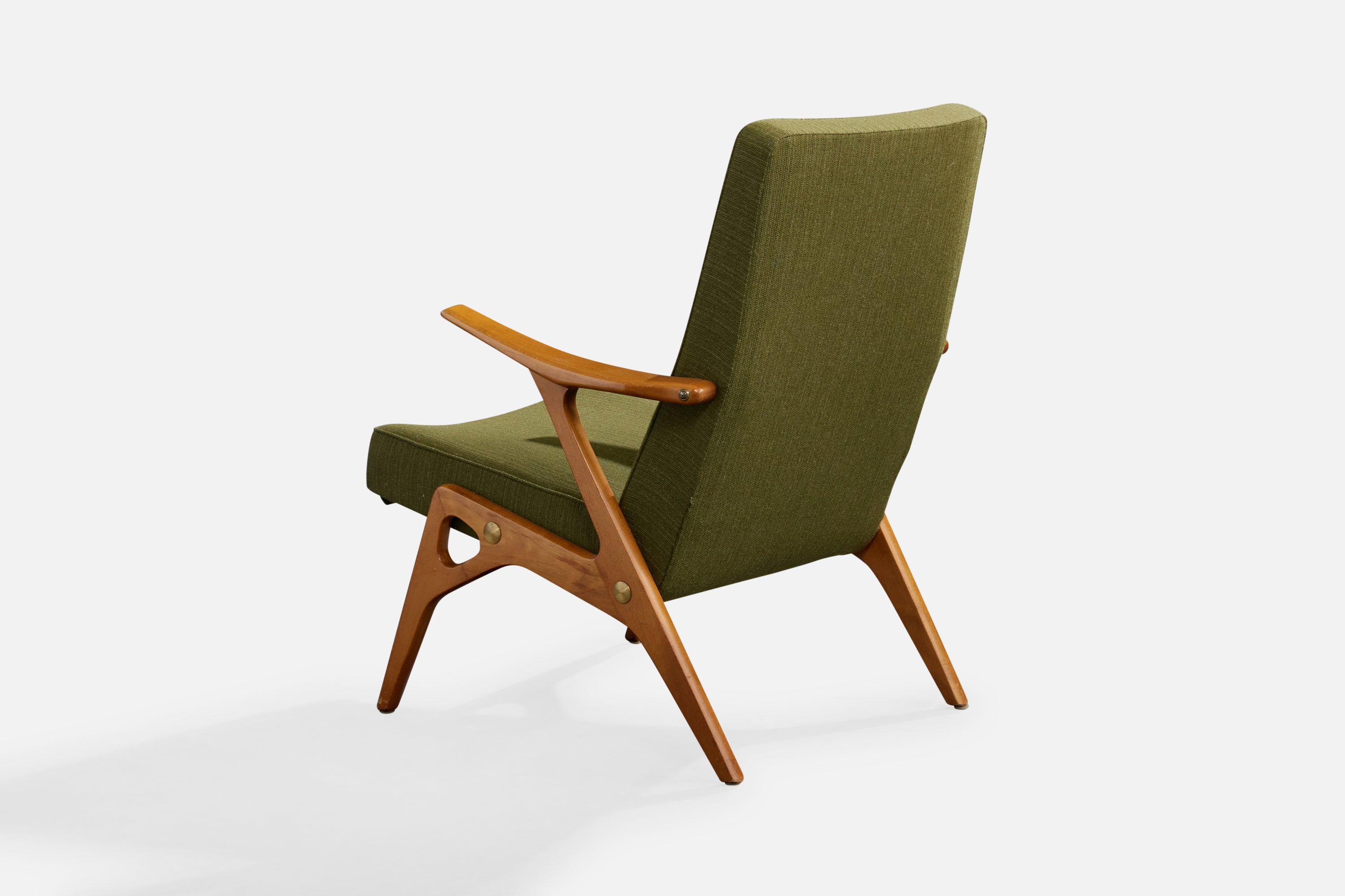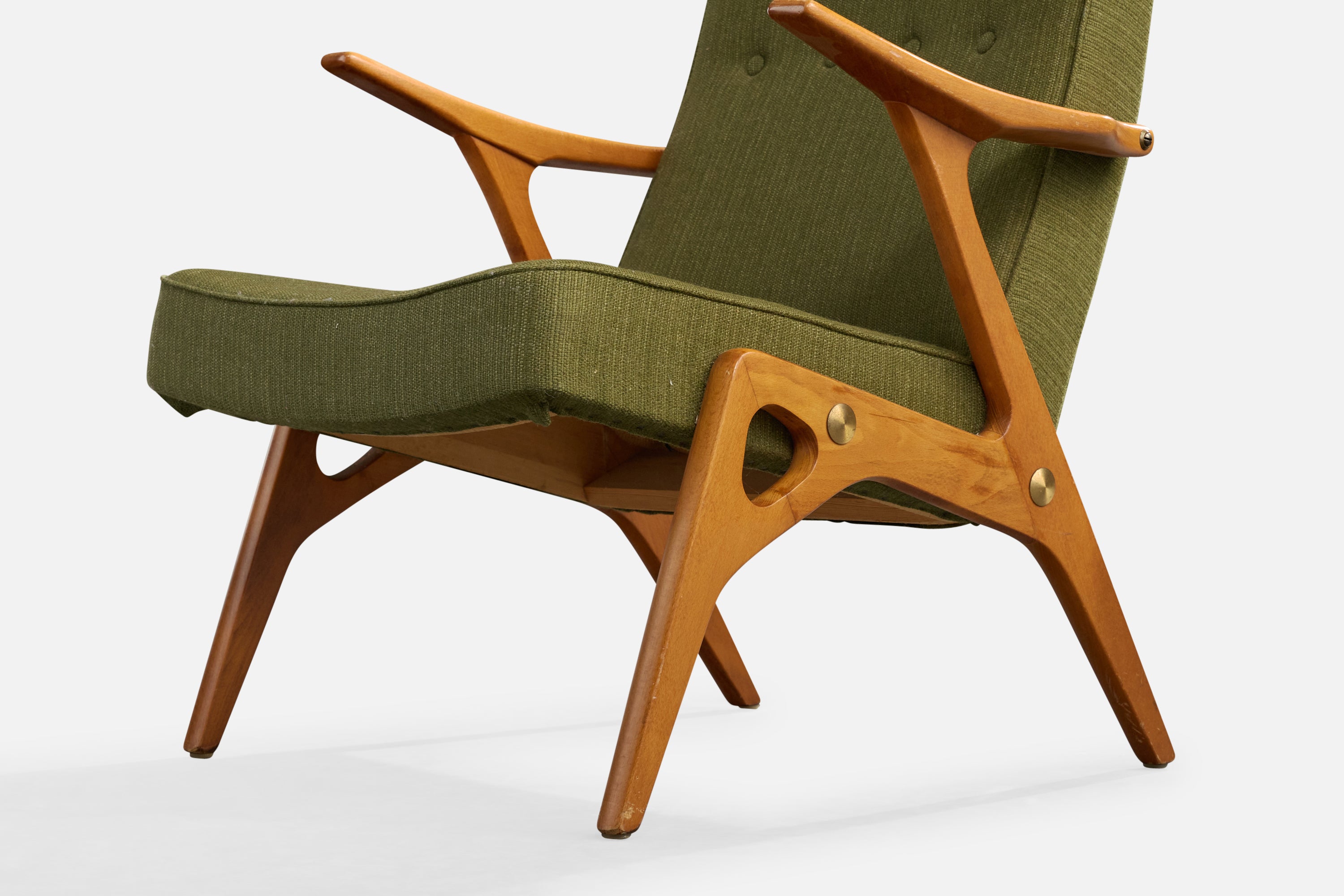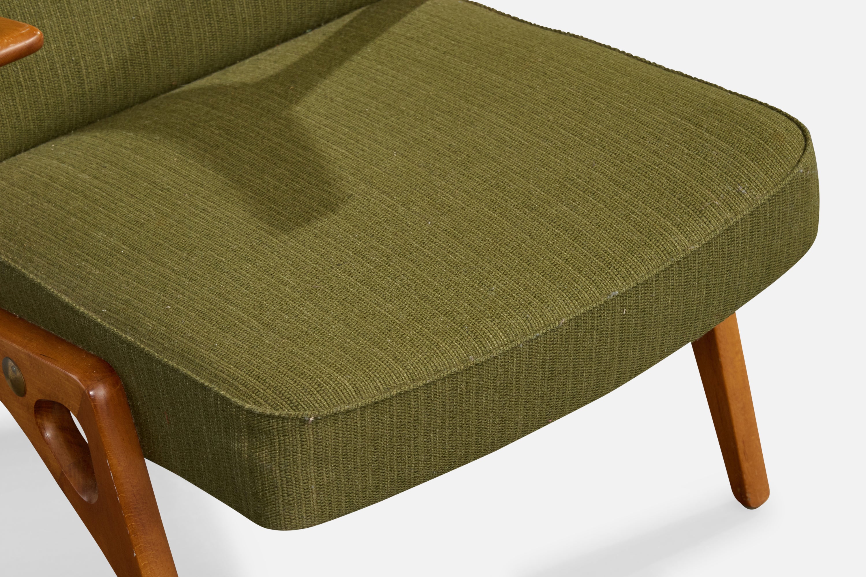 A wood, brass and green fabric lounge chair designed by Inge Andersson and produced by Bröderna Andersson, Sweden, c. 1960s.