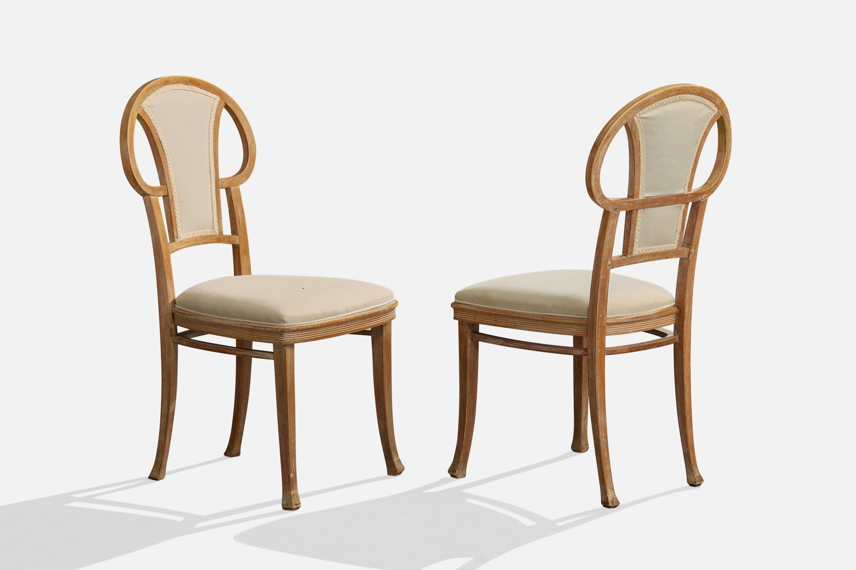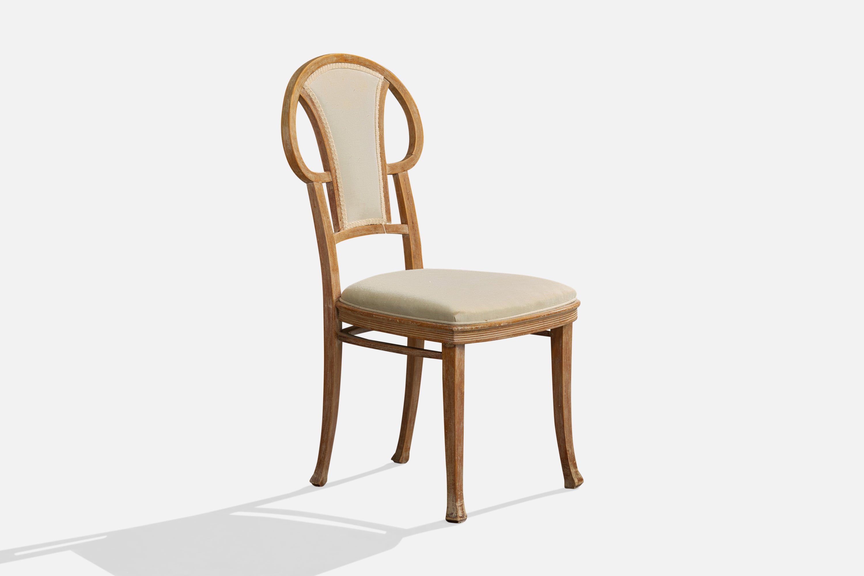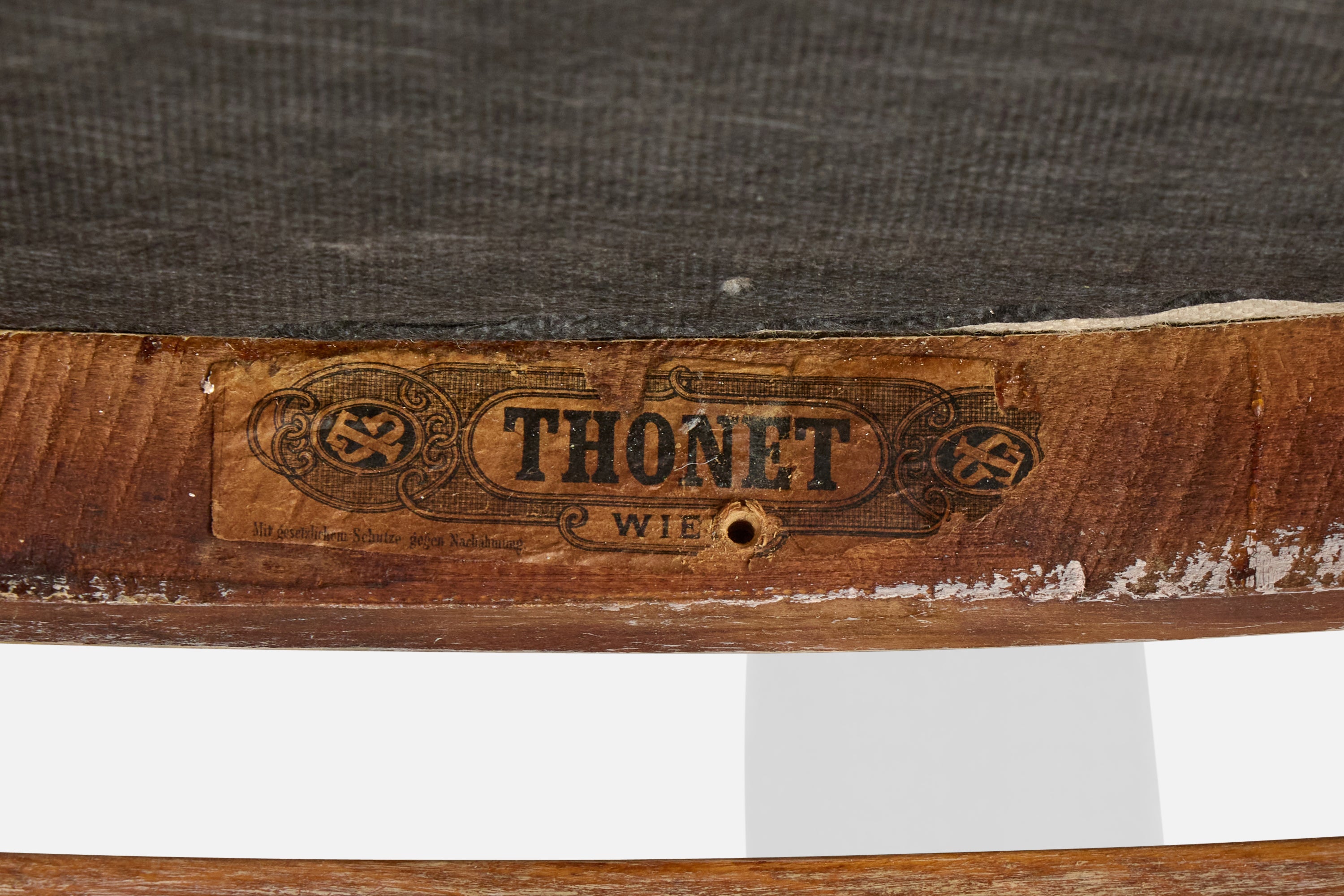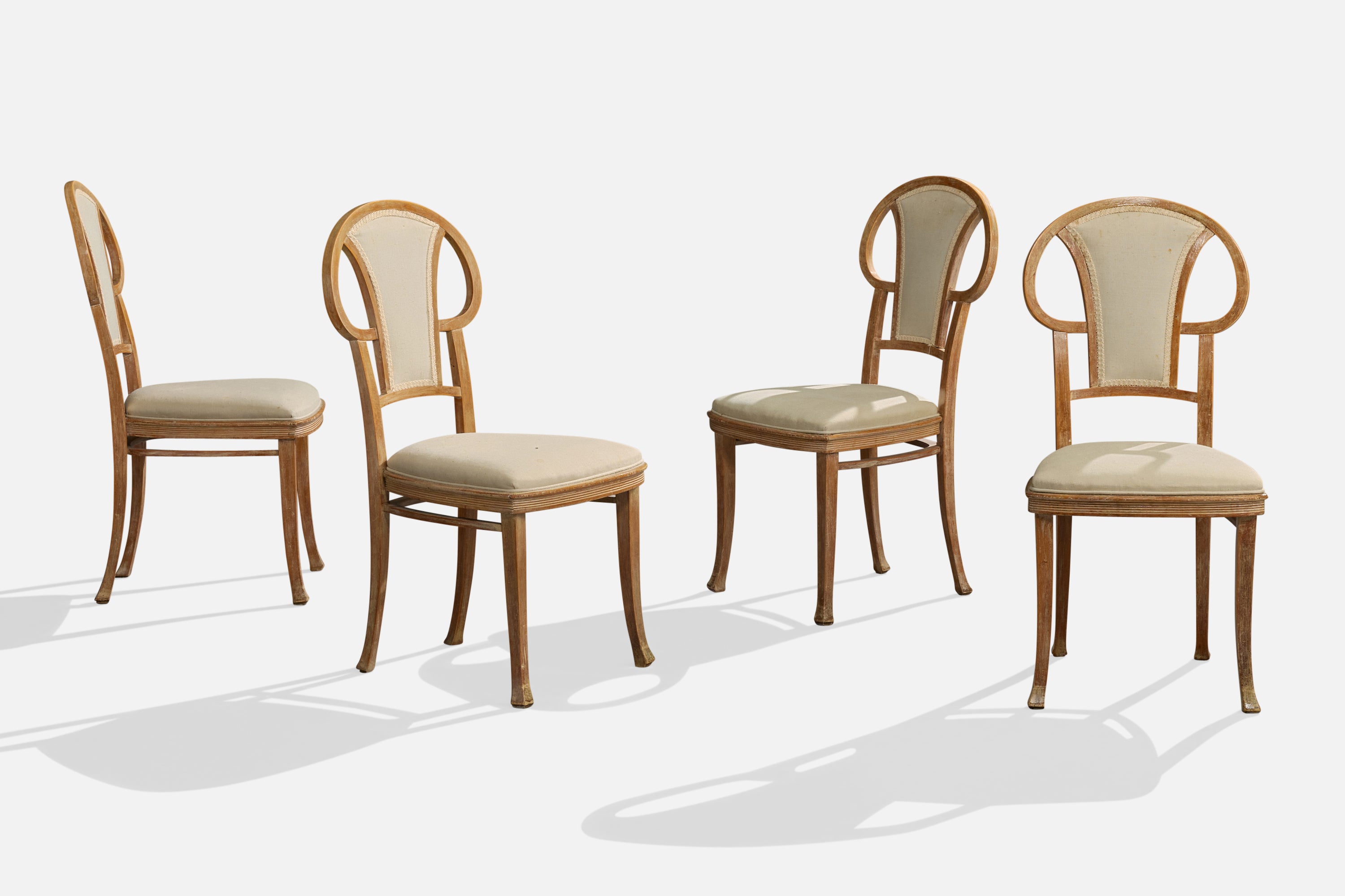 A set of four wood and white fabric dining room chairs produced by Thonet, Vienna, Austria, c. 1900s.