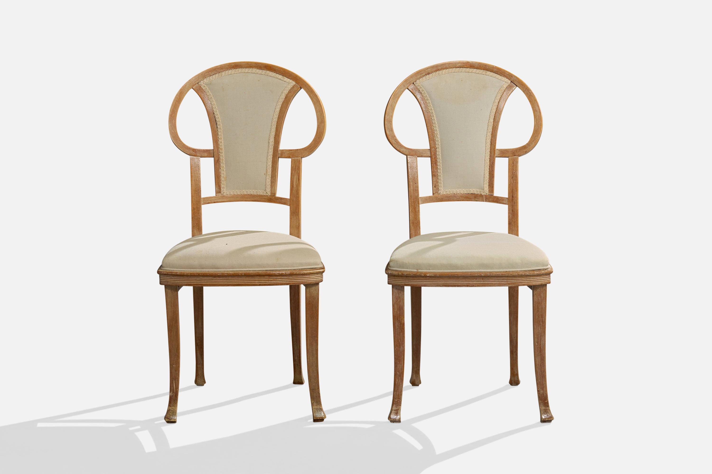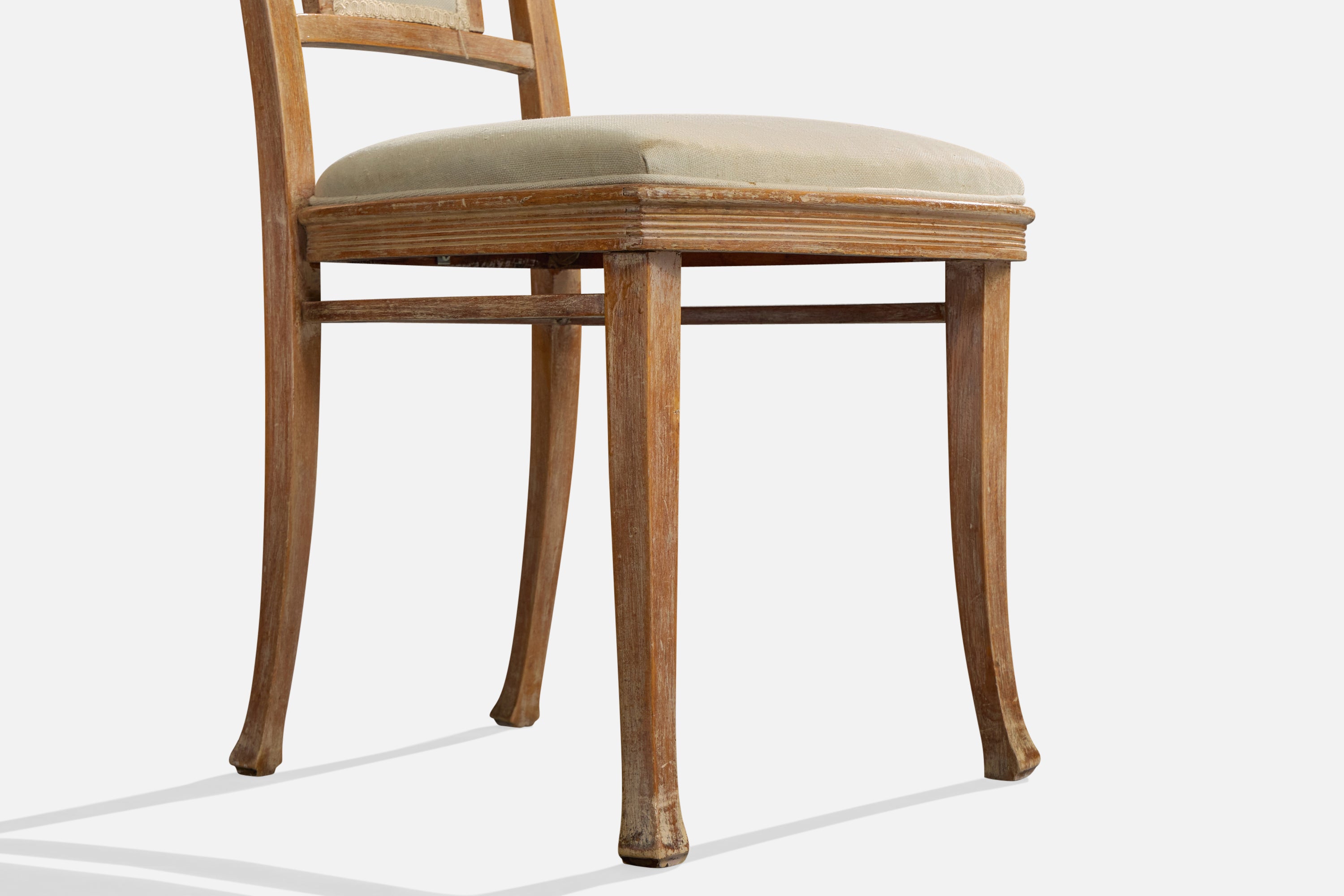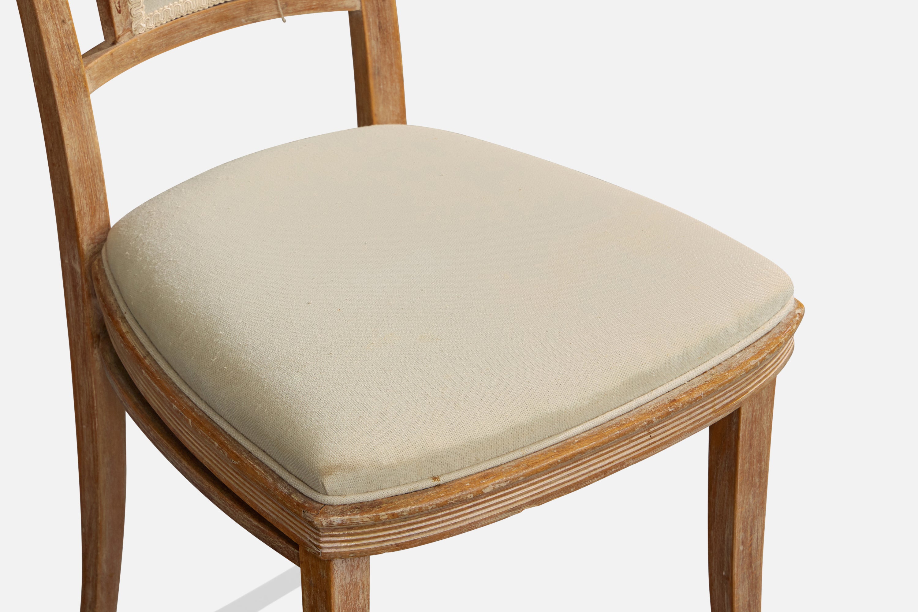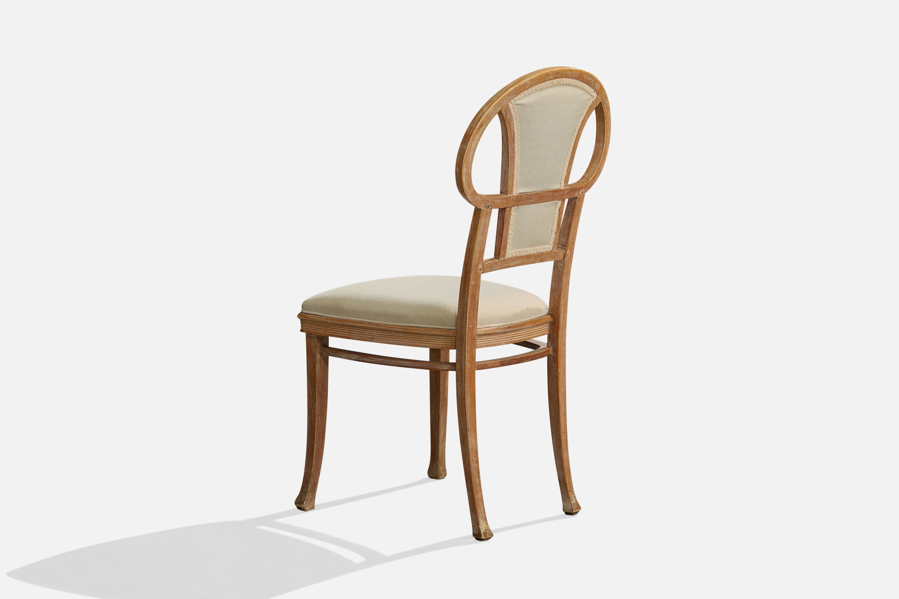 A set of four wood and white fabric dining room chairs produced by Thonet, Vienna, Austria, c. 1900s.