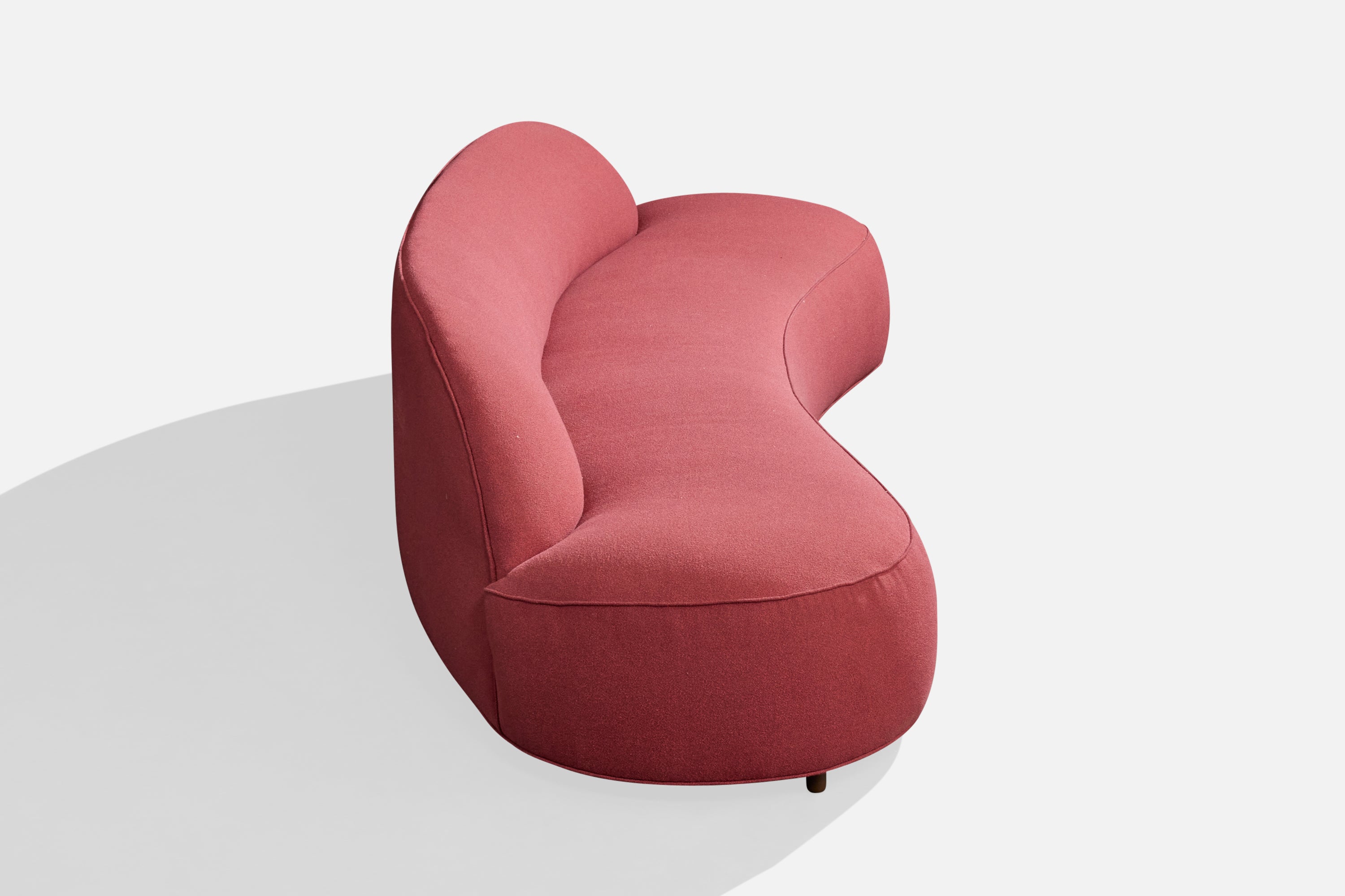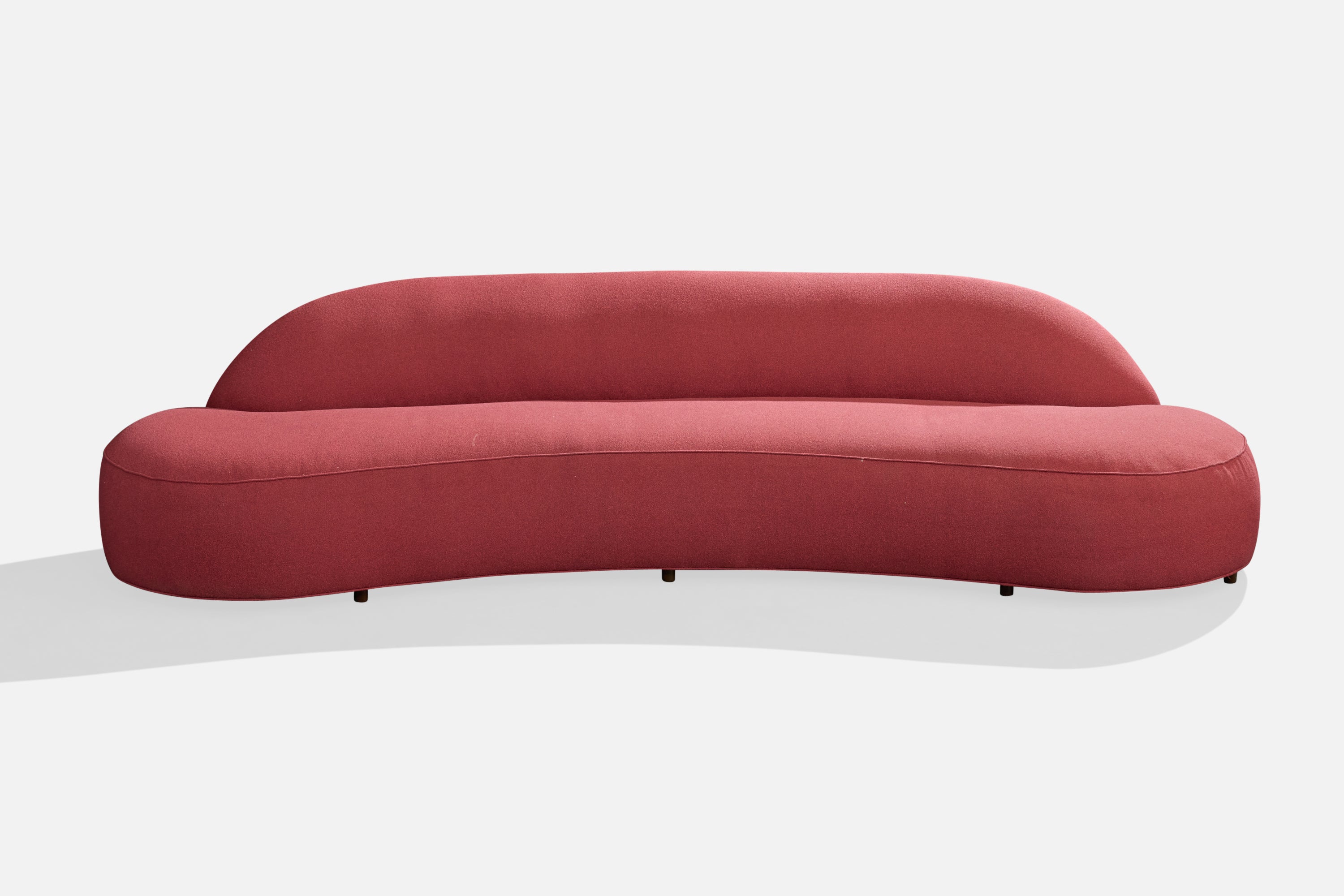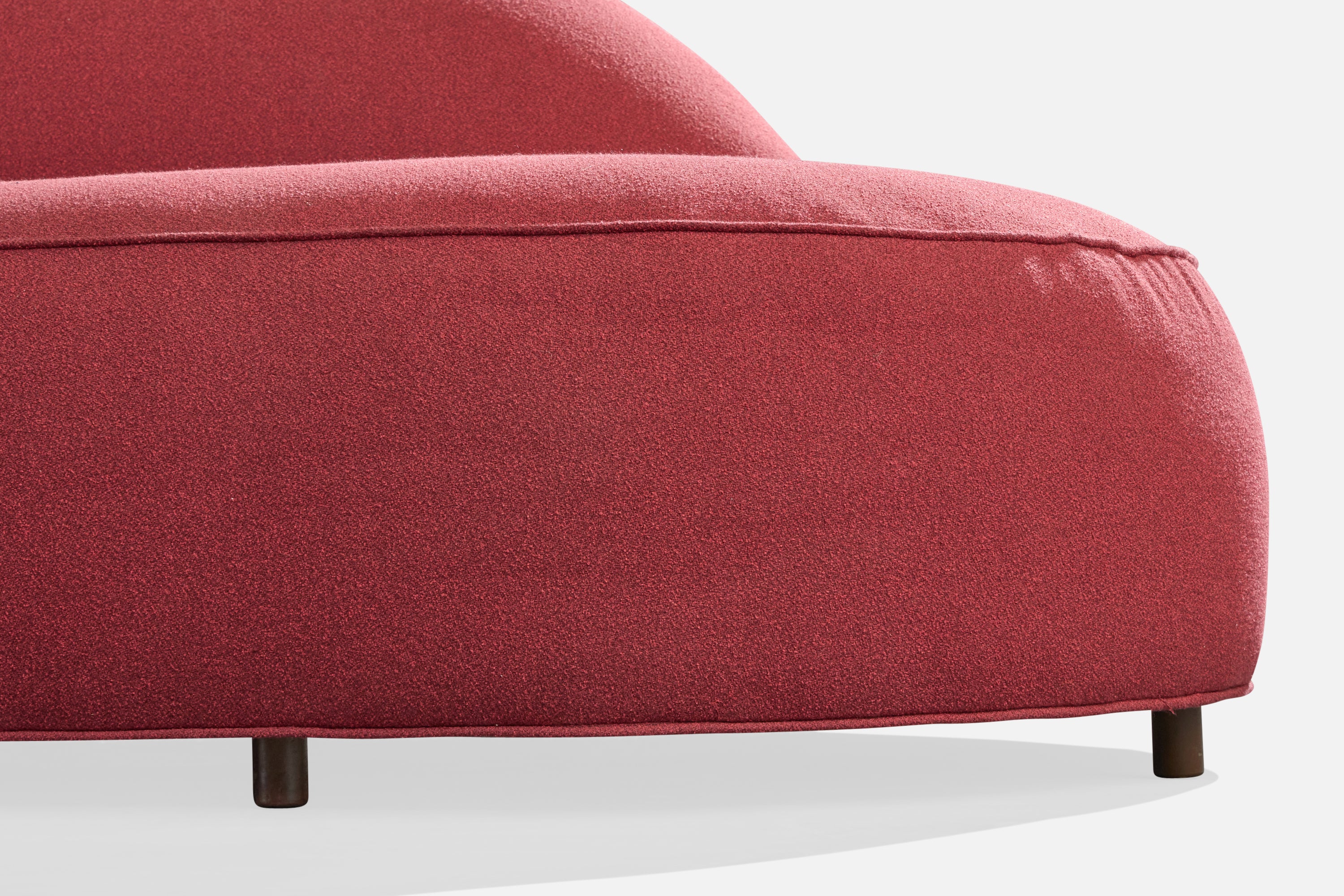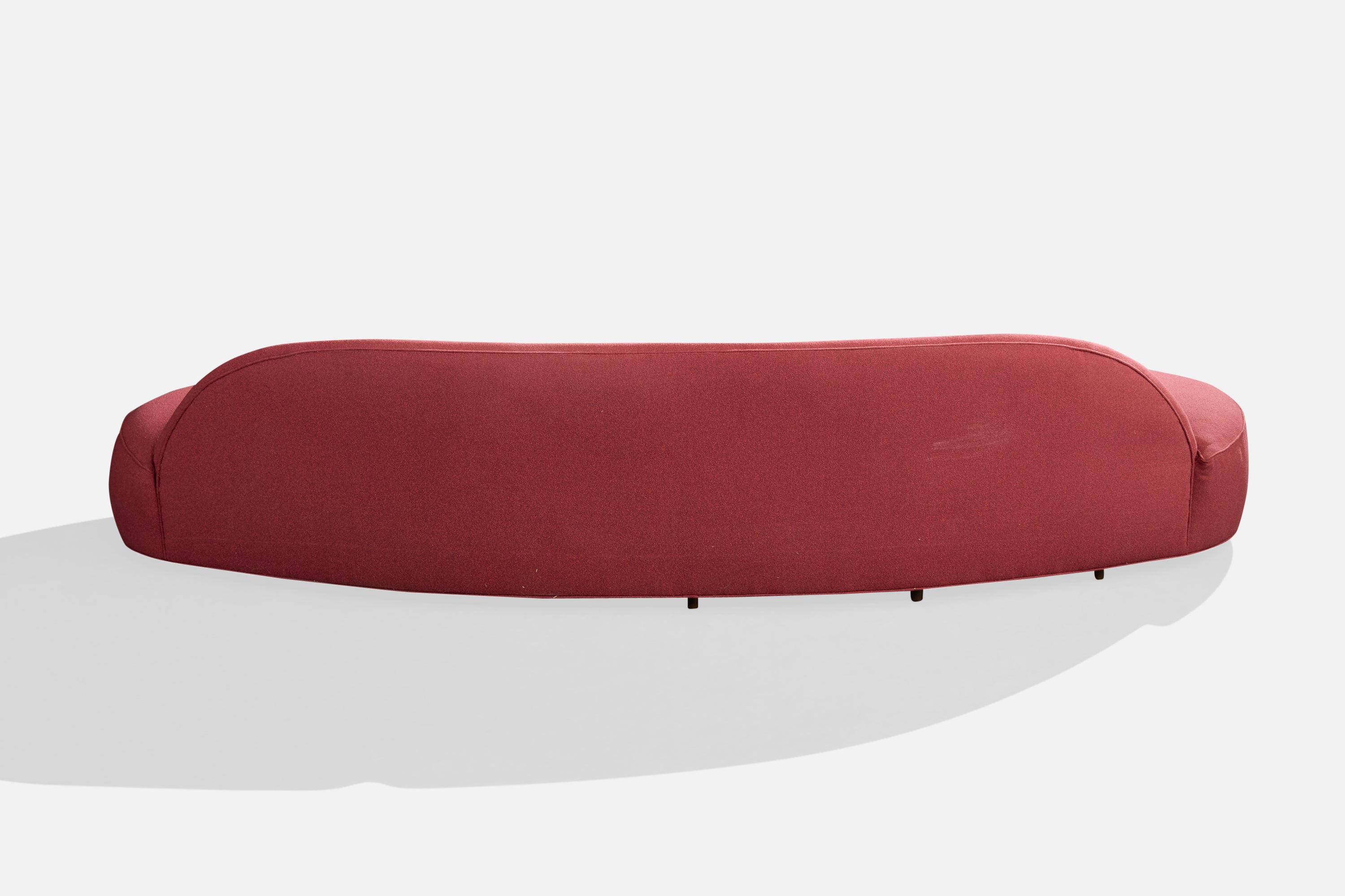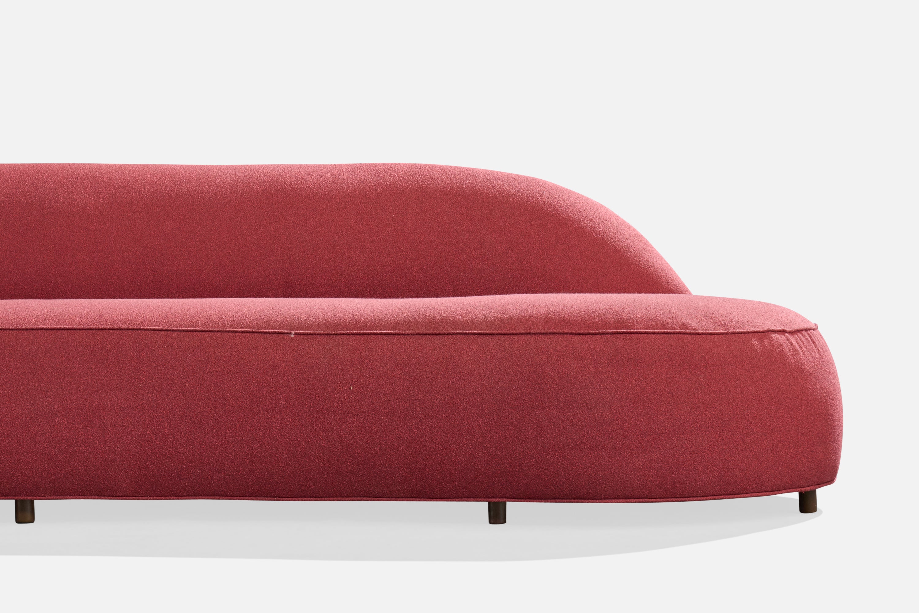 A sizable red fabric and dark-stained wood sofa designed and produced in the US, c. 1970s.