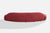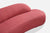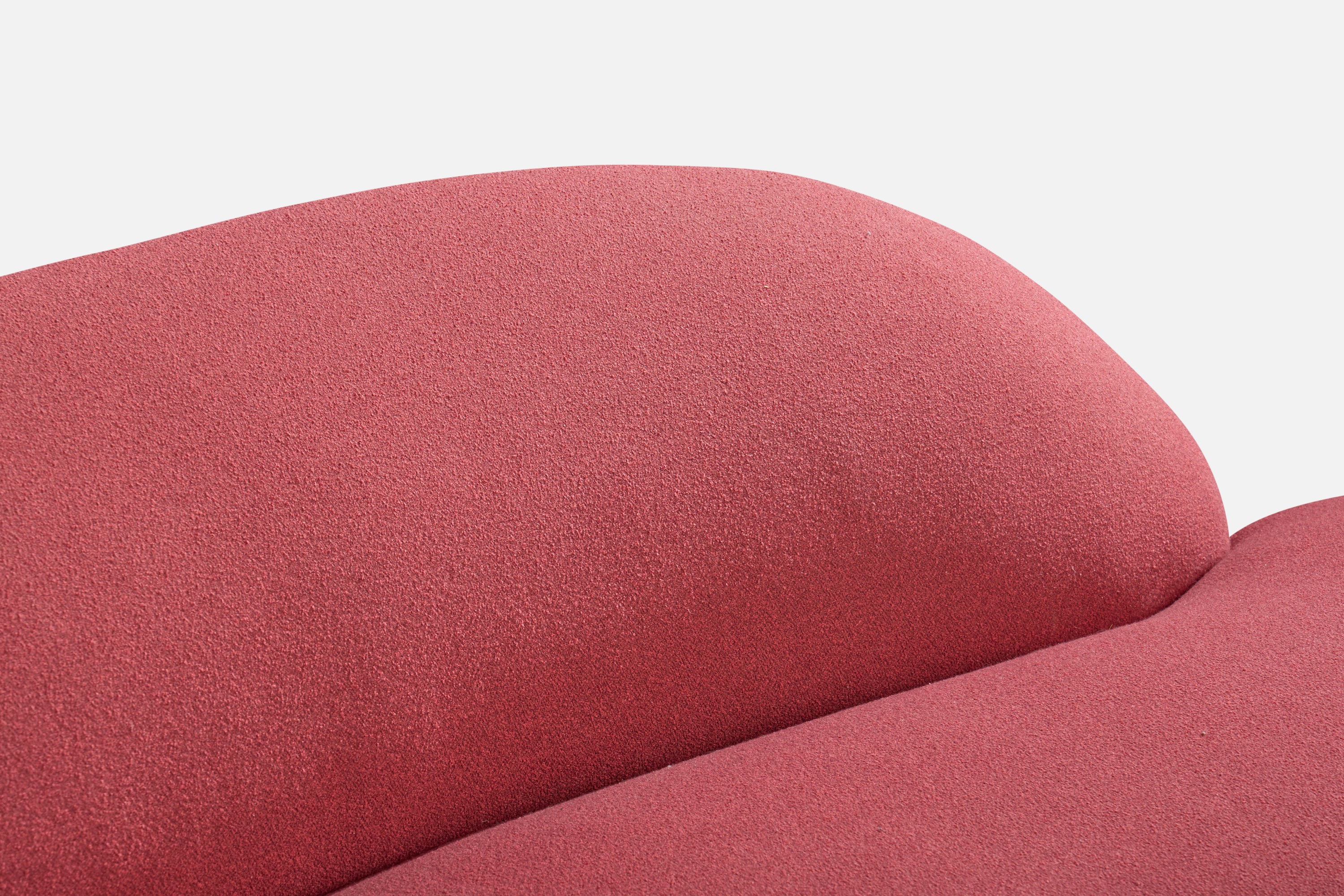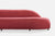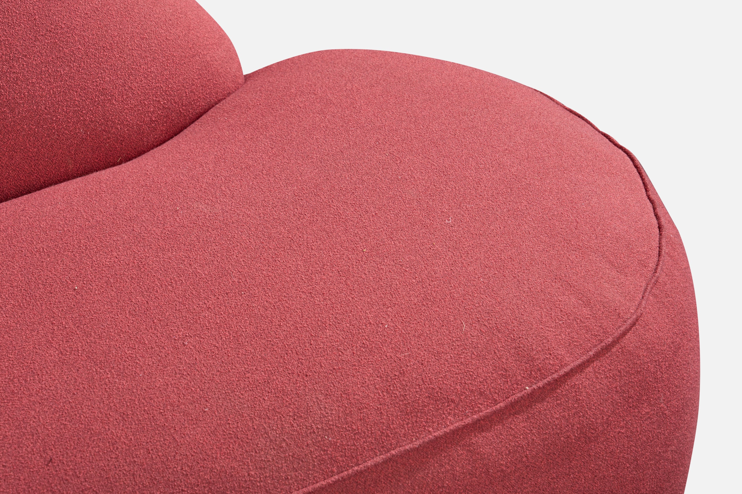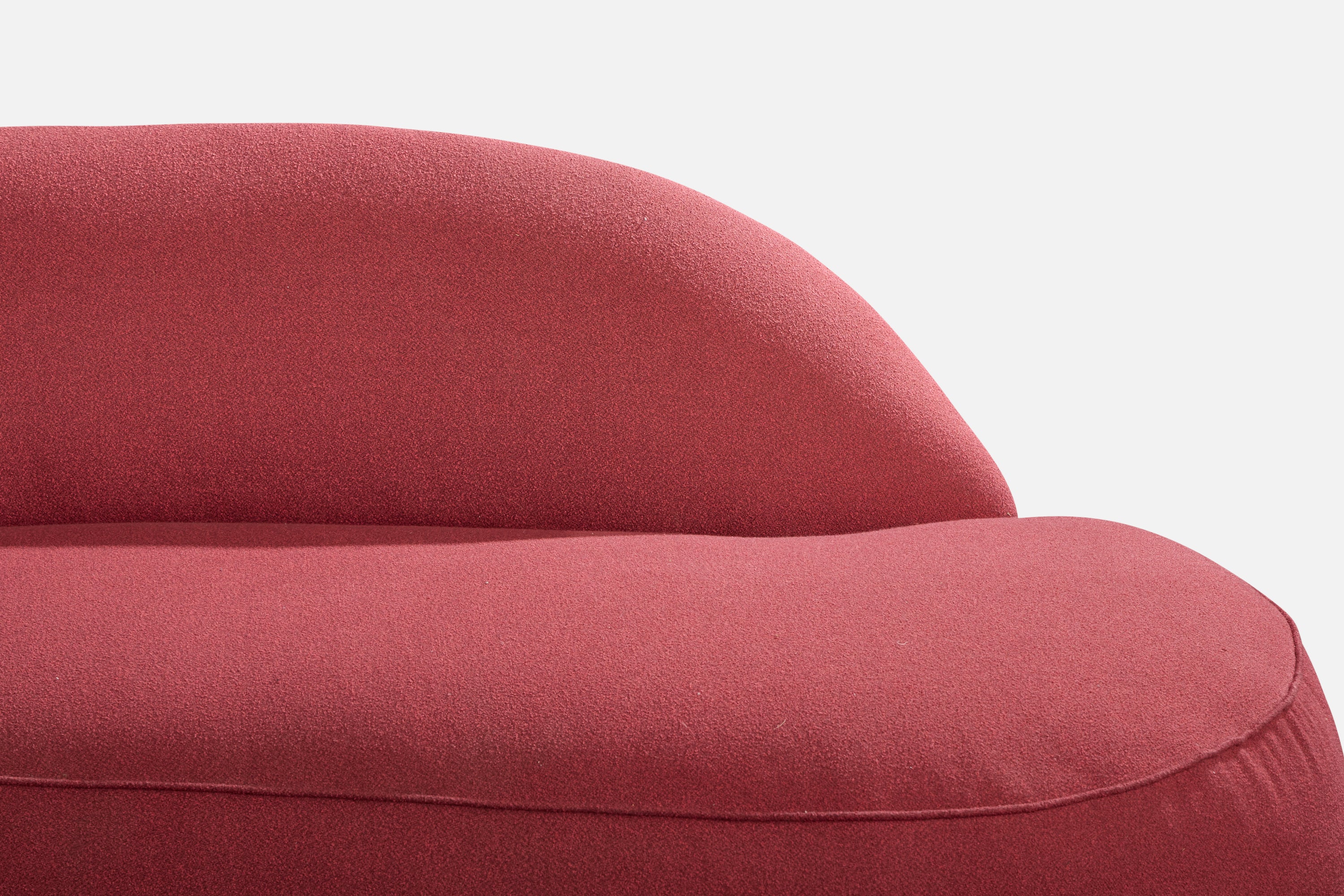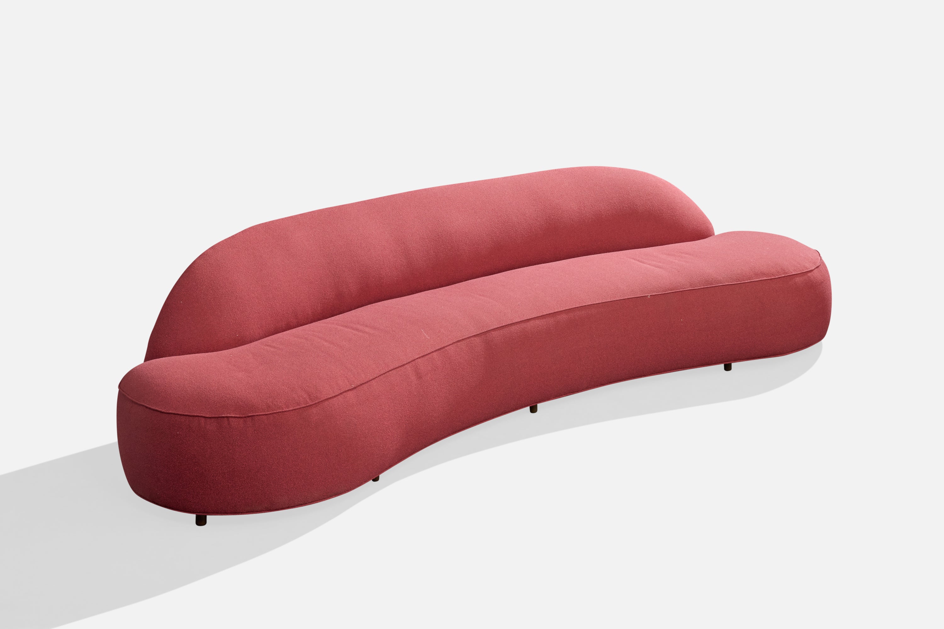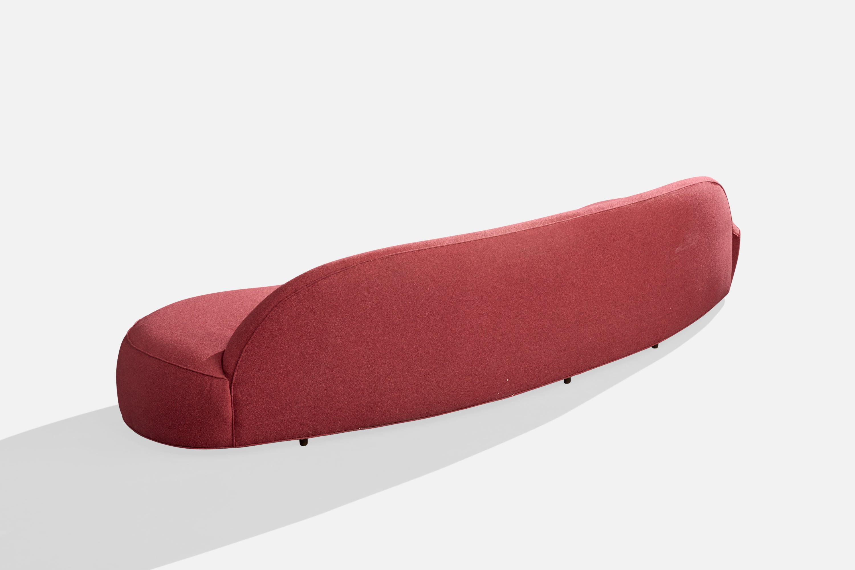 A sizable red fabric and dark-stained wood sofa designed and produced in the US, c. 1970s.