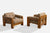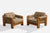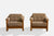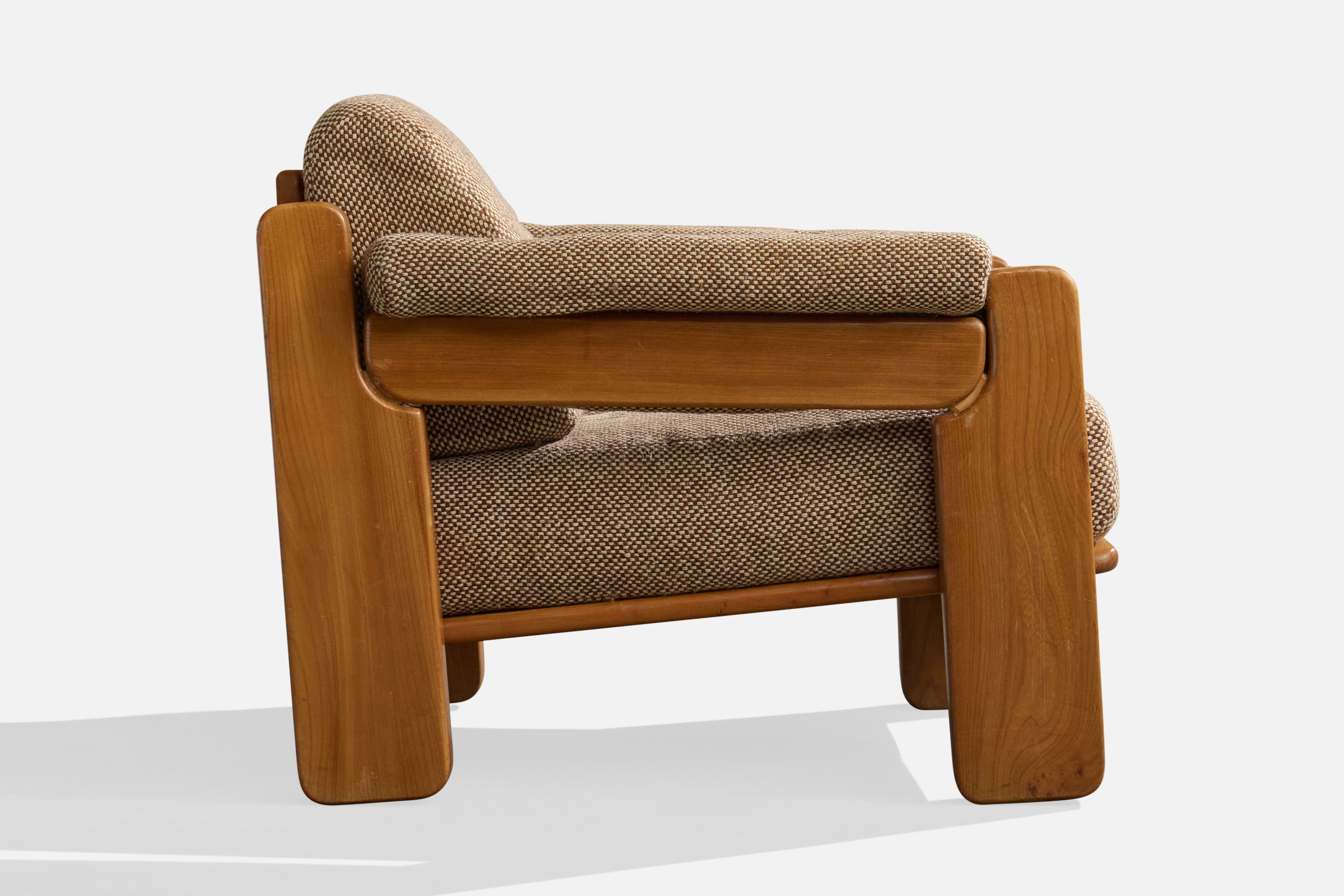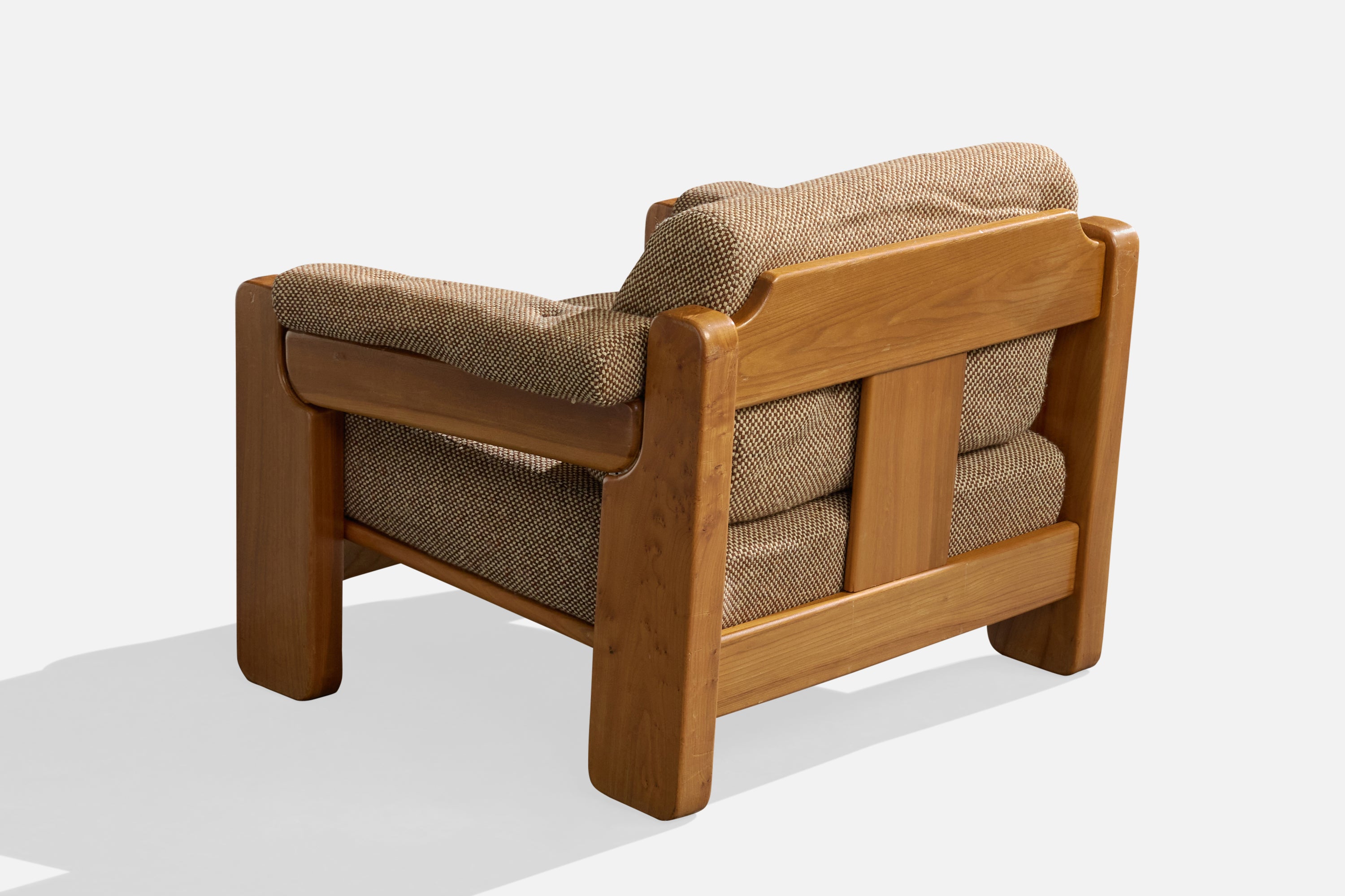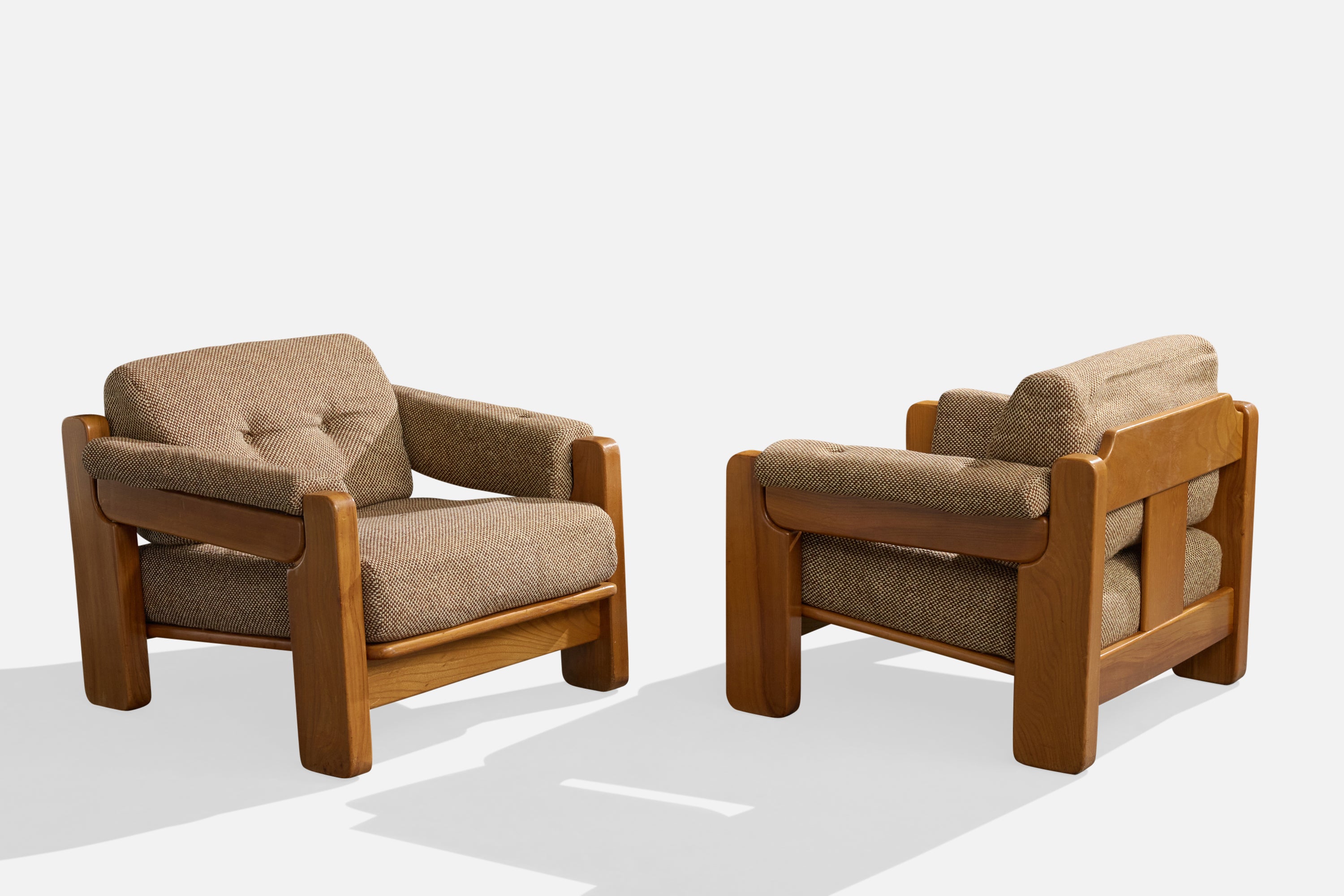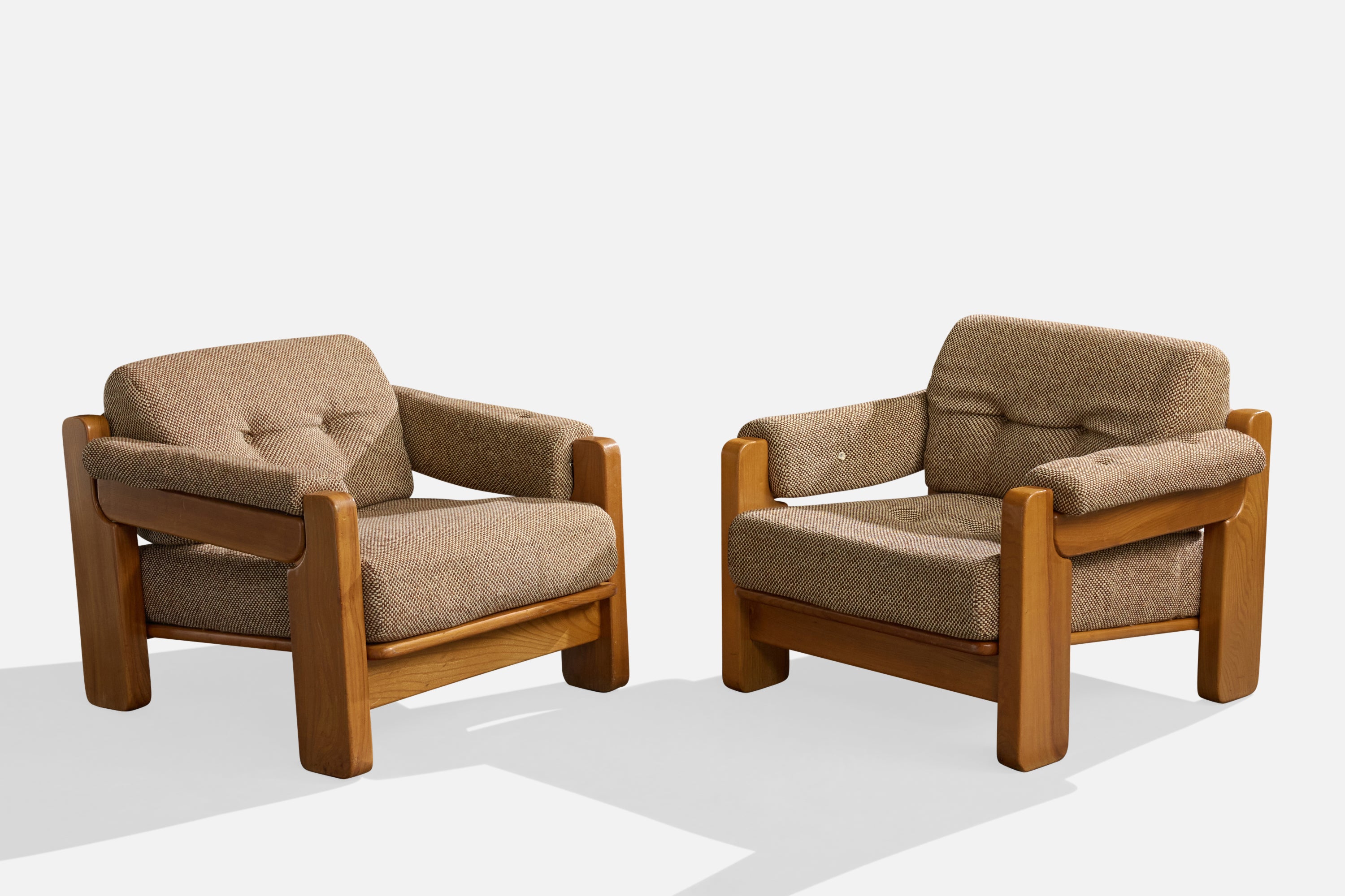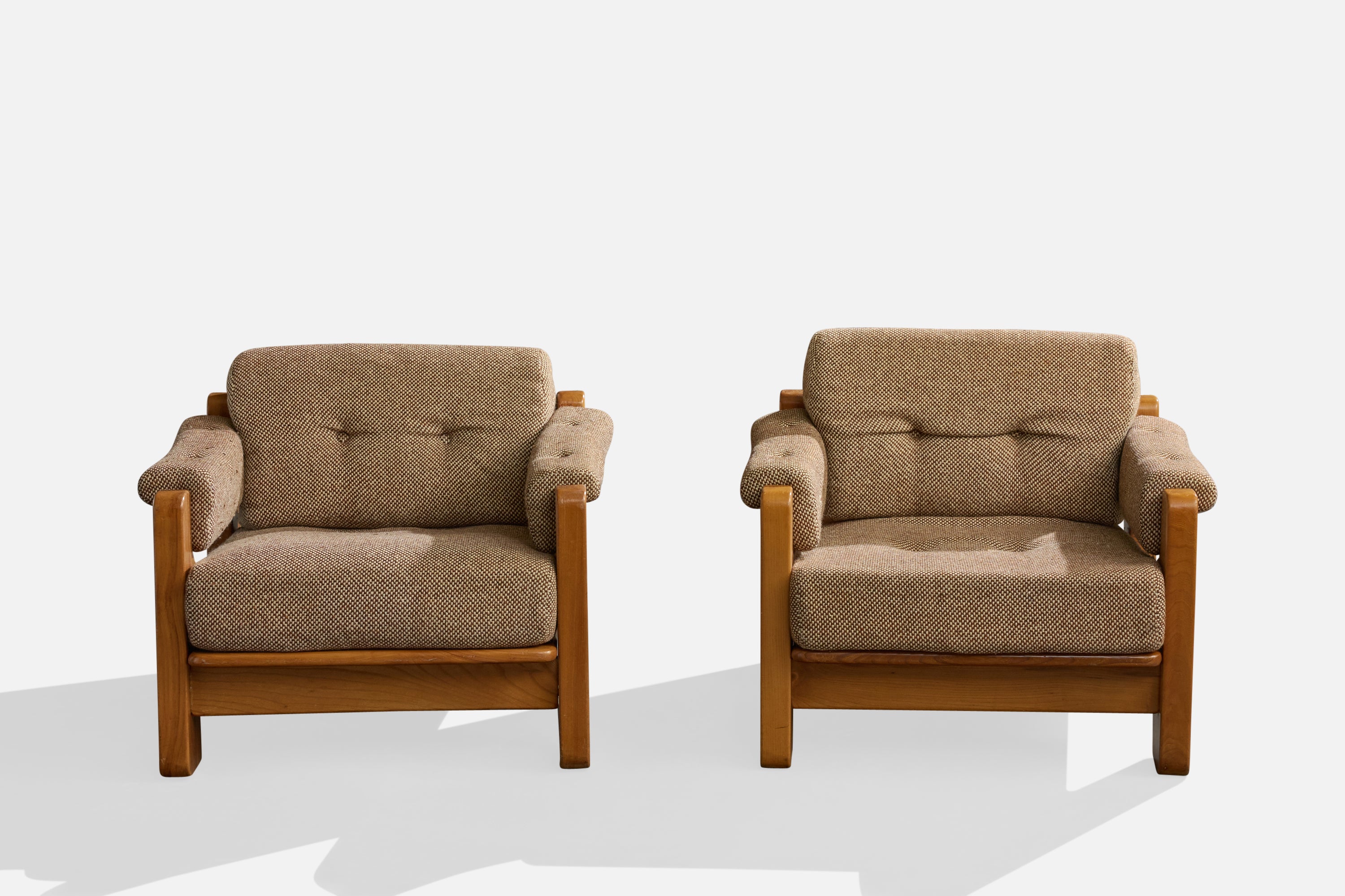 A pair of elm and grey fabric lounge chairs produced by Maison Regain, France, c. 1970s.
