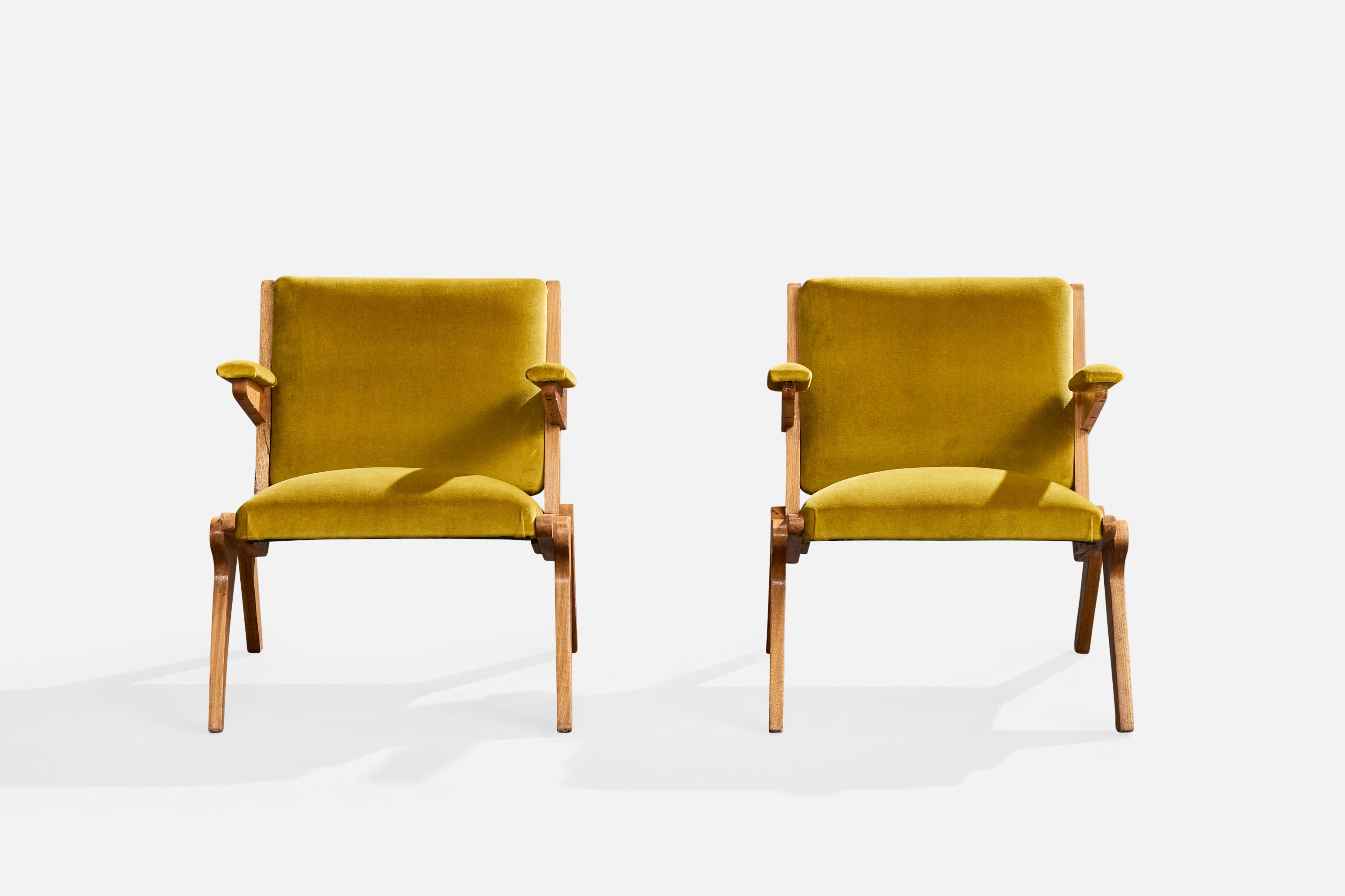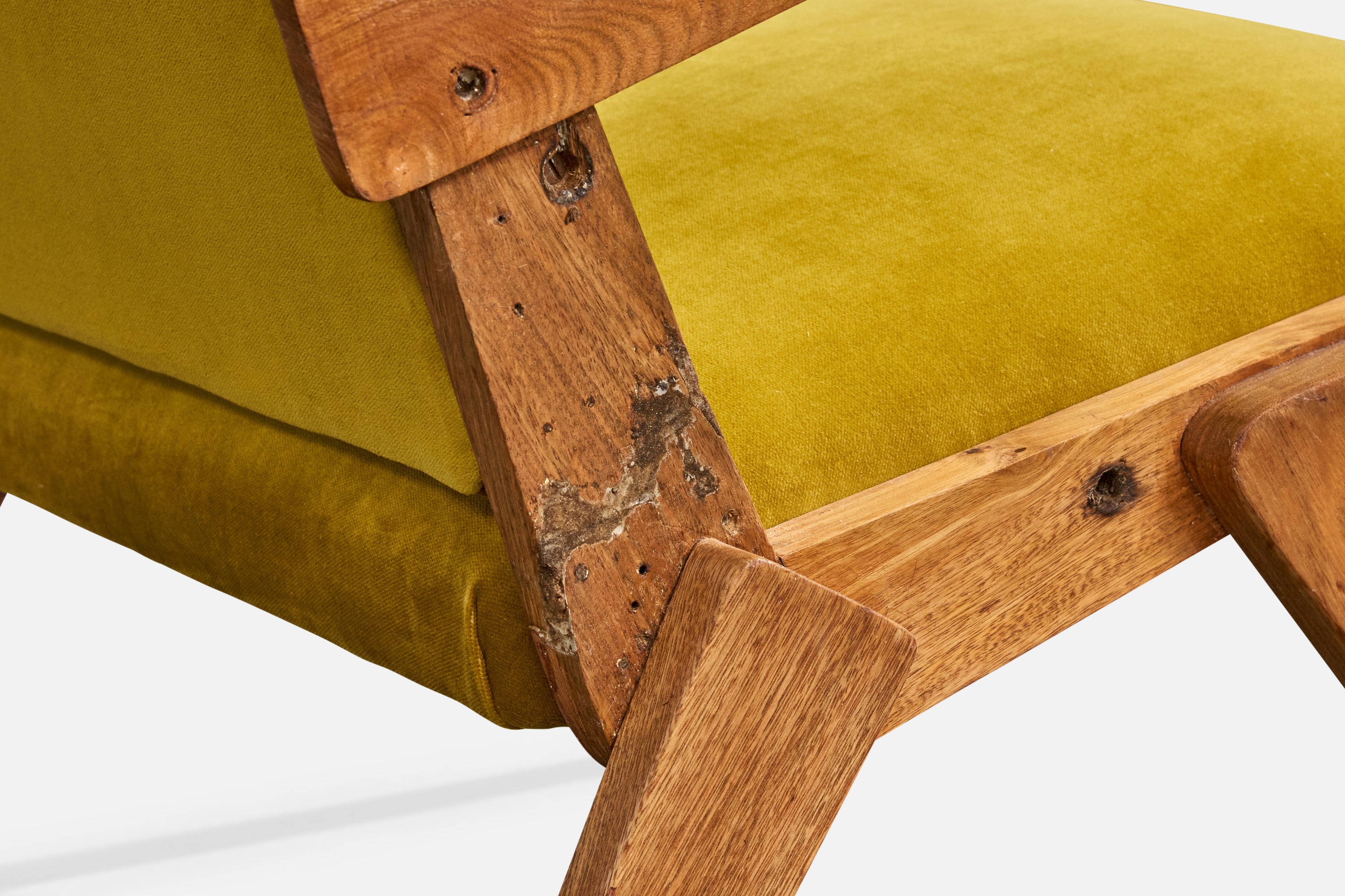 A pair of wood and green velvet lounge chairs designed and produced in Brazil, c. 1950s.