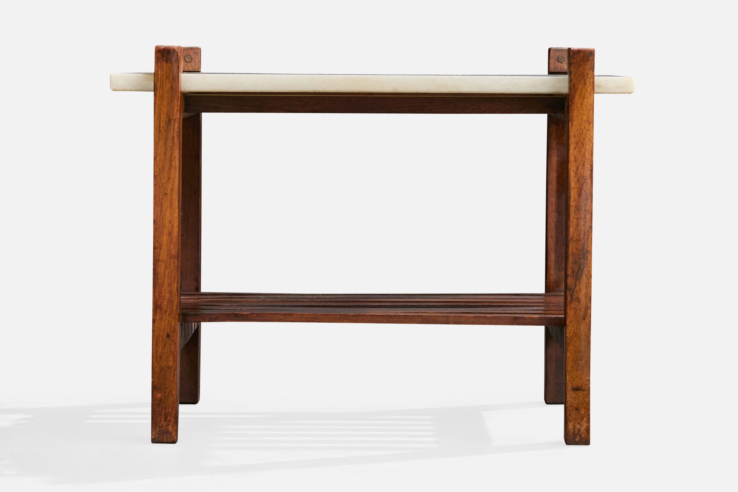 A wood and marble side table designed and produced in Brazil, 1960s.