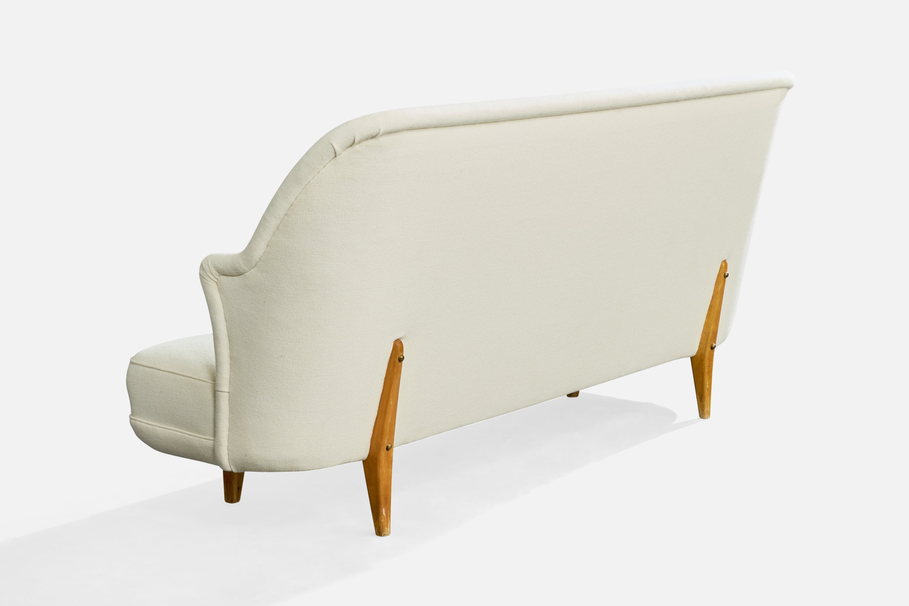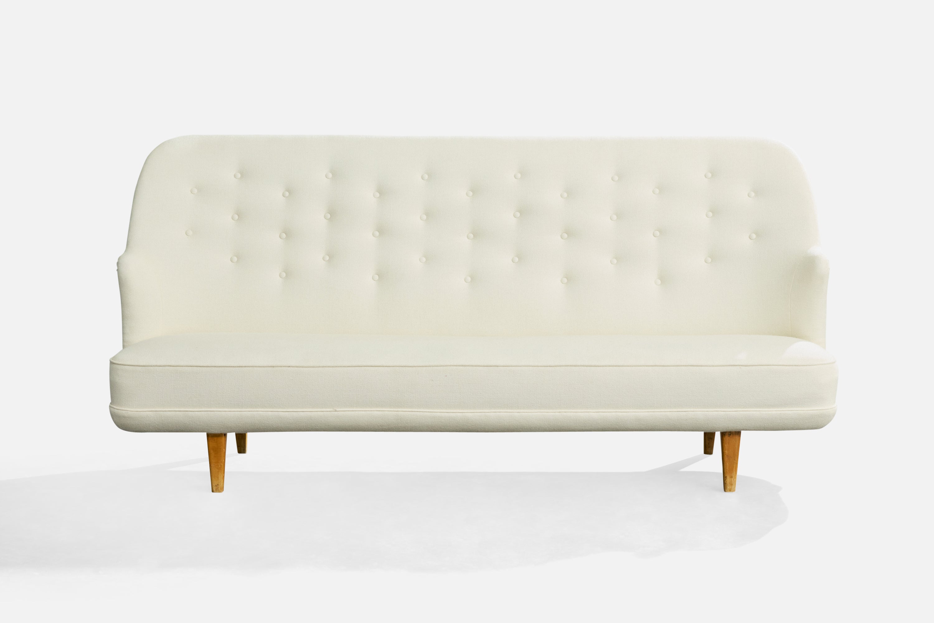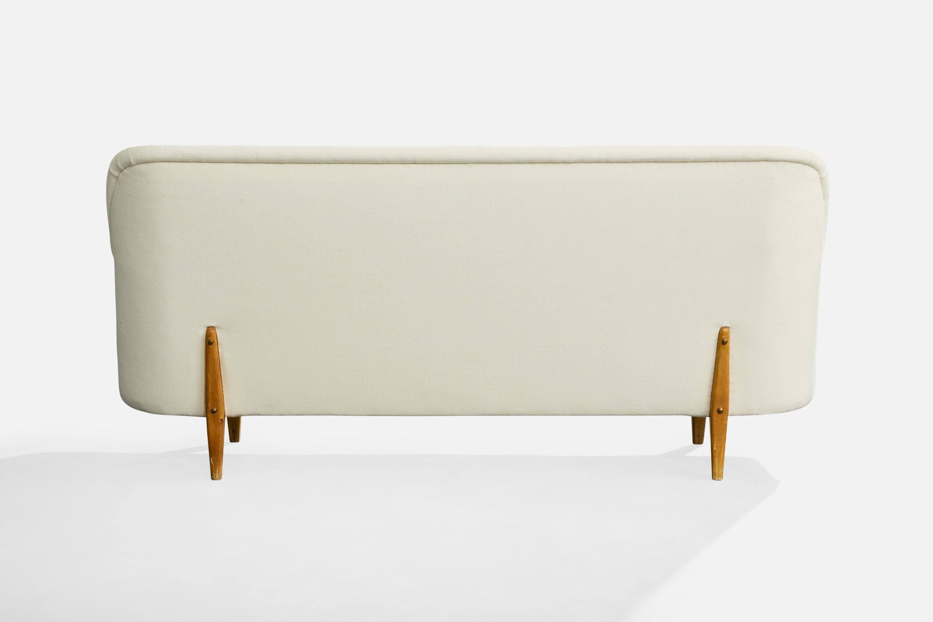 A white fabric and wood sofa designed by Ilmari Tapiovaara and produced by Keravan Puuteollisuus, Finland, c. 1949.