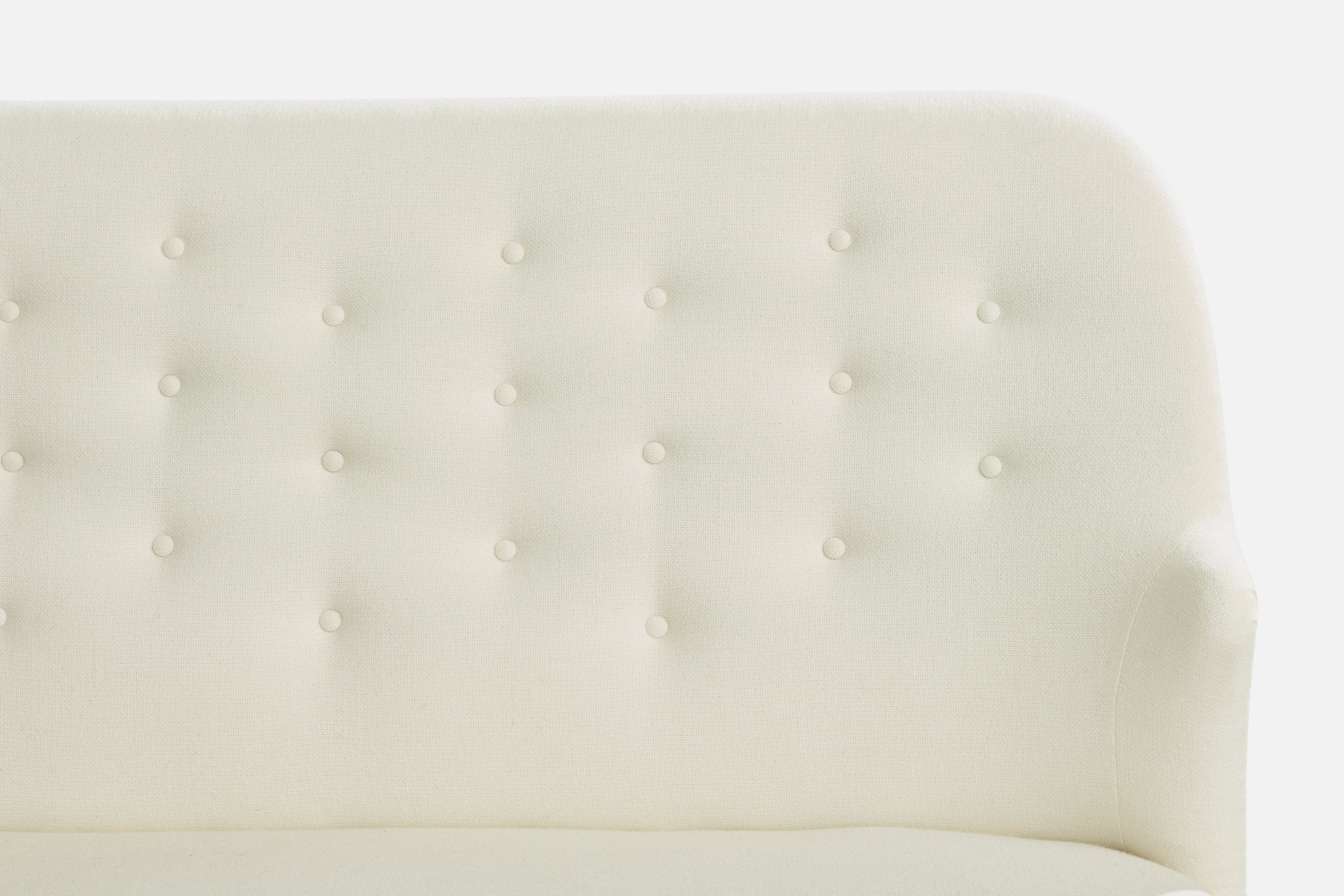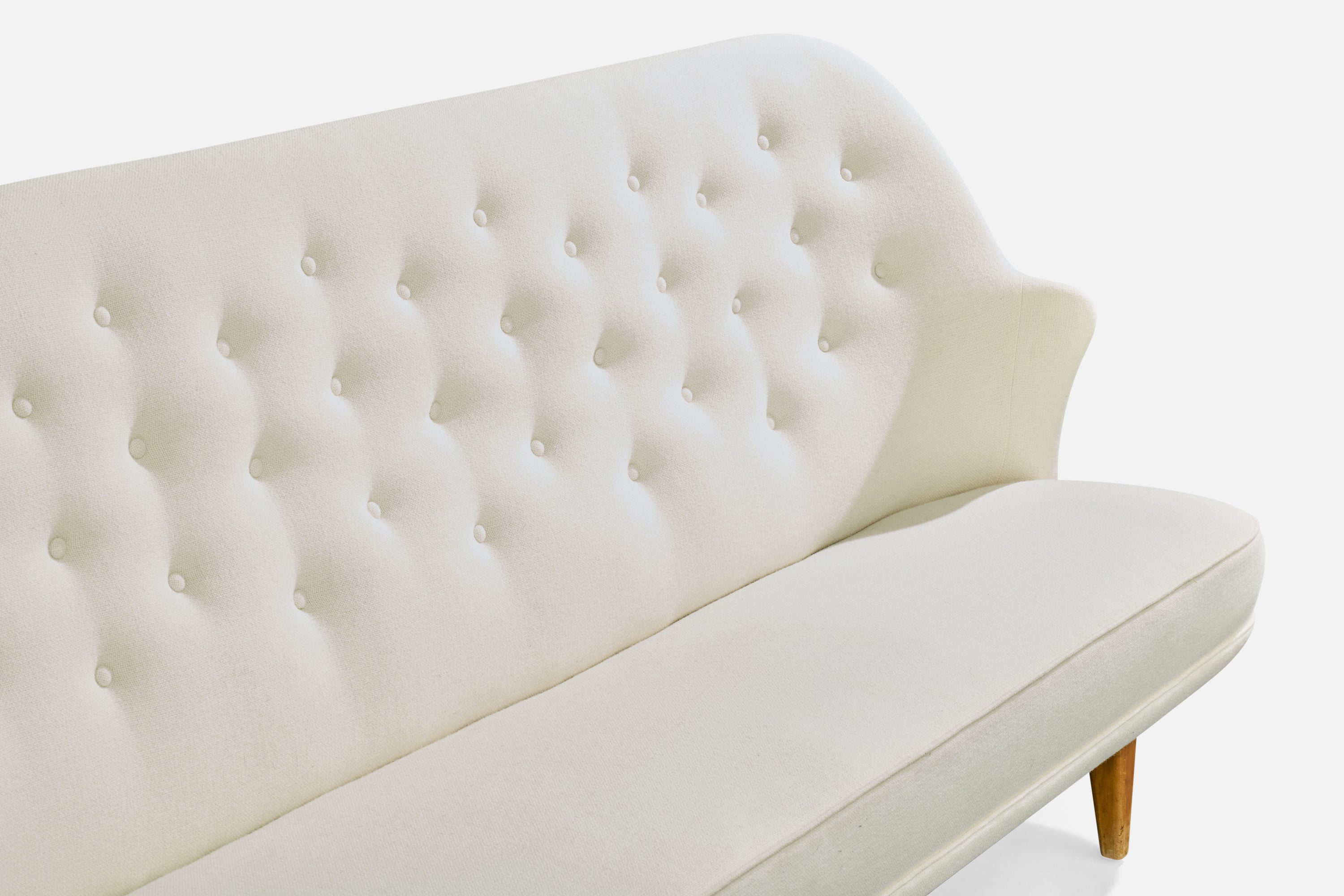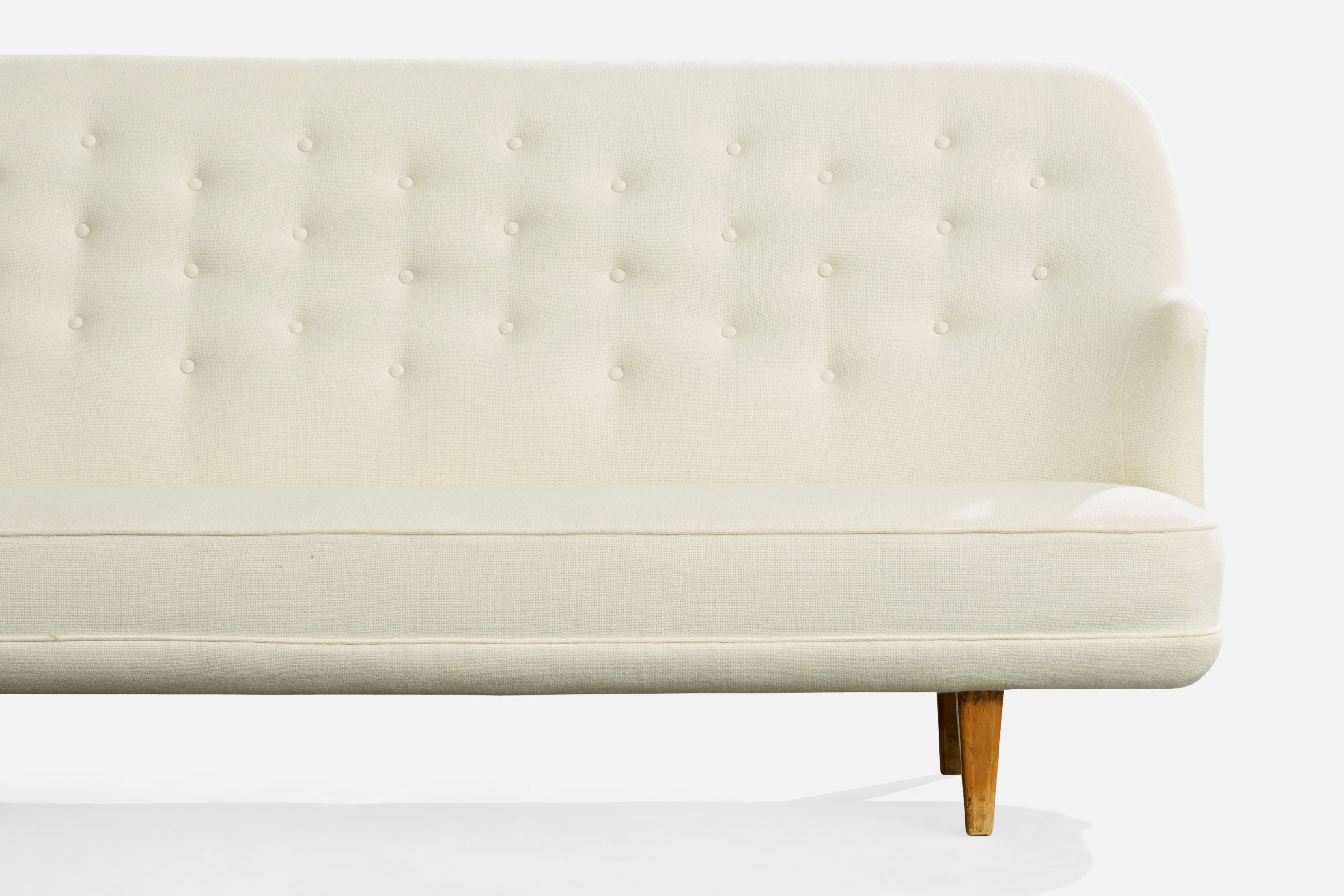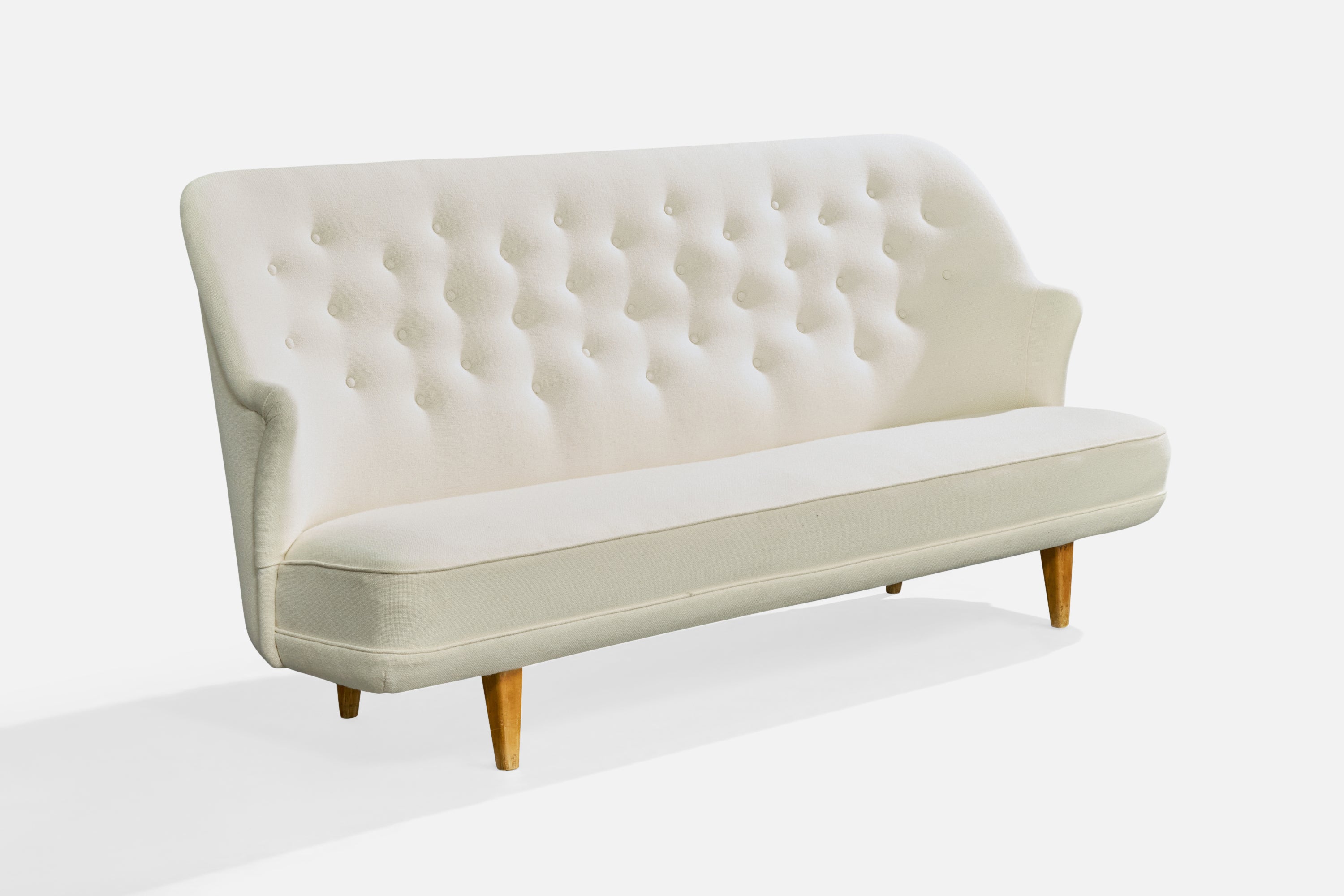 A white fabric and wood sofa designed by Ilmari Tapiovaara and produced by Keravan Puuteollisuus, Finland, c. 1949.