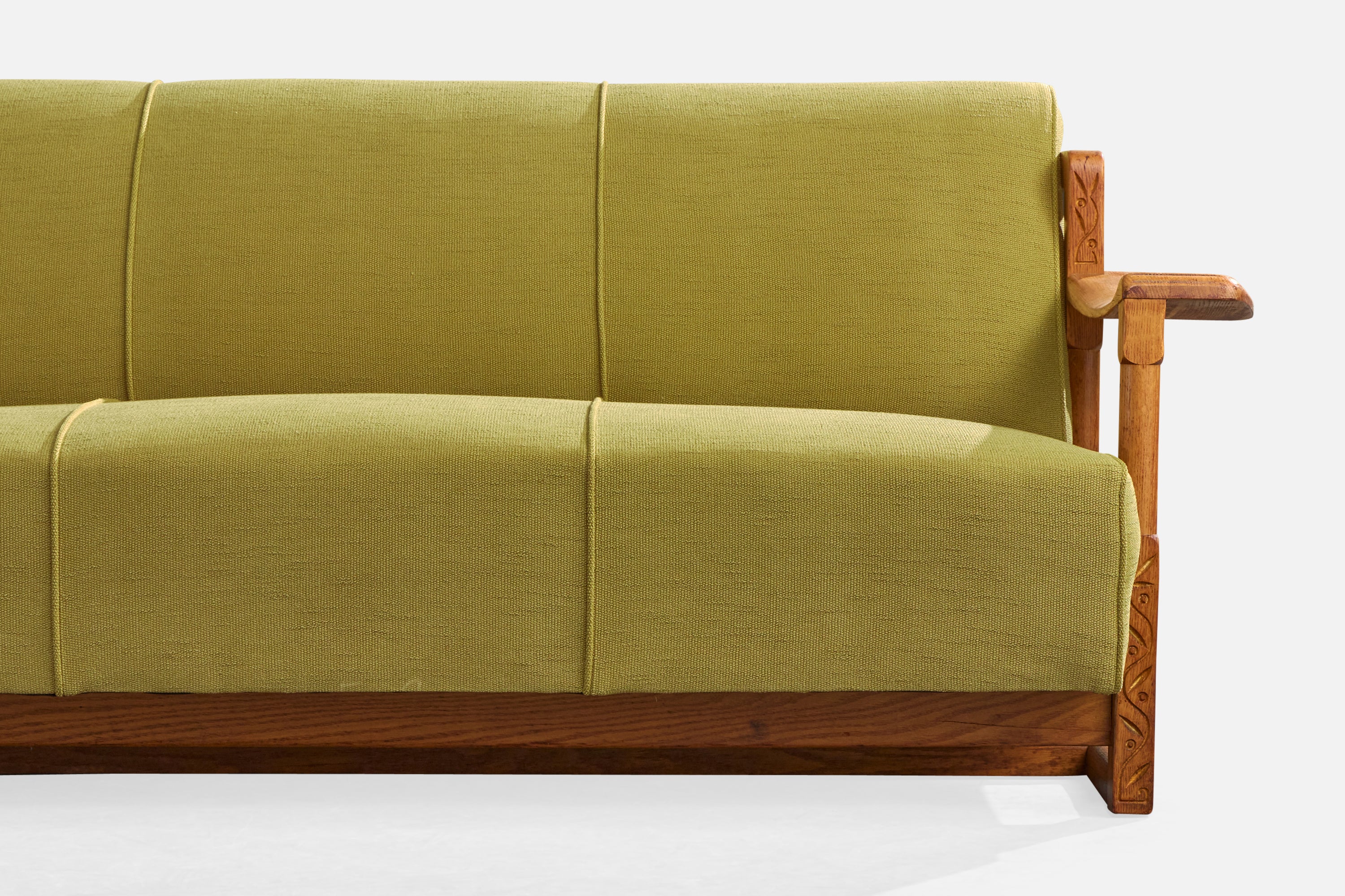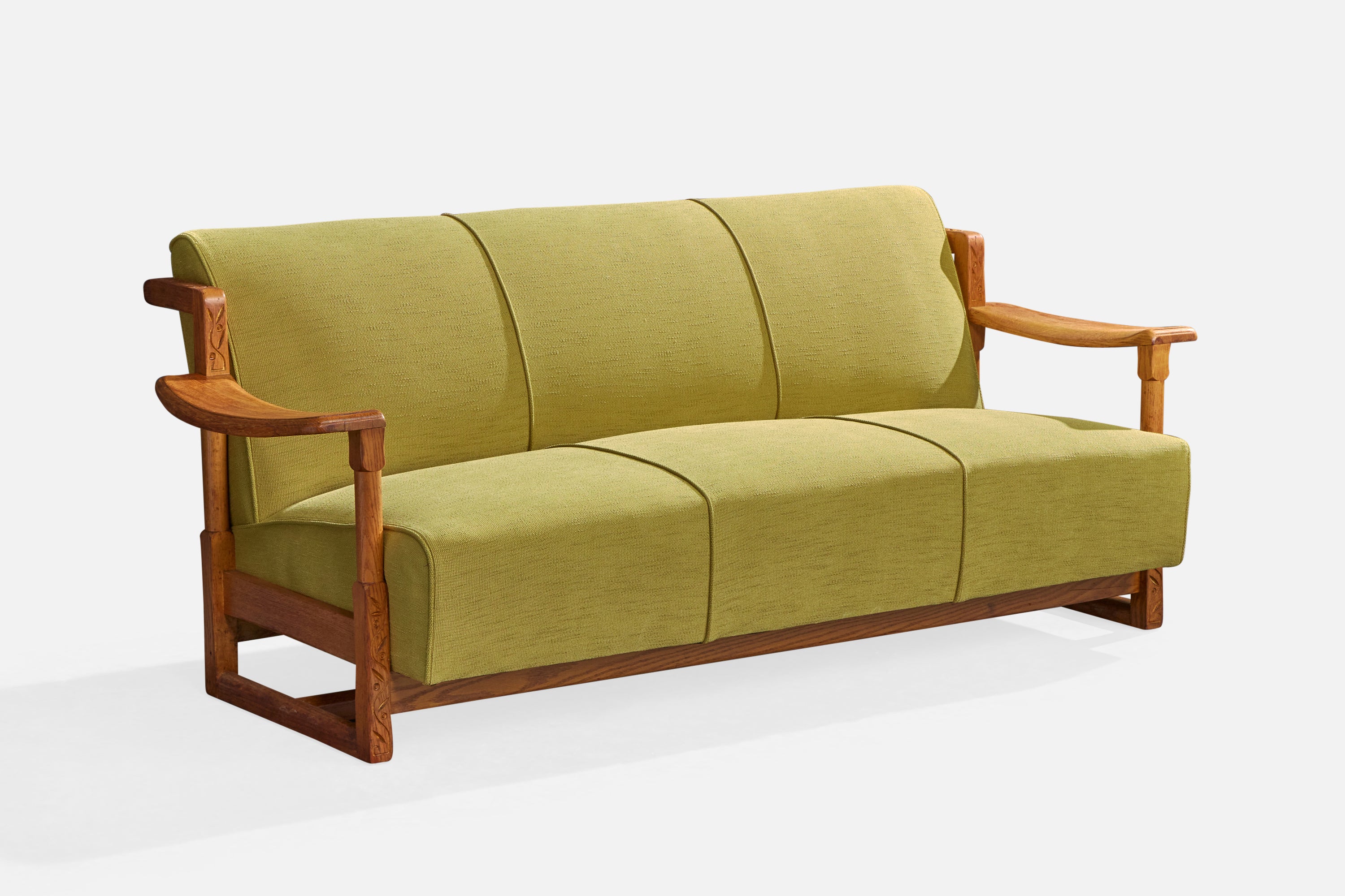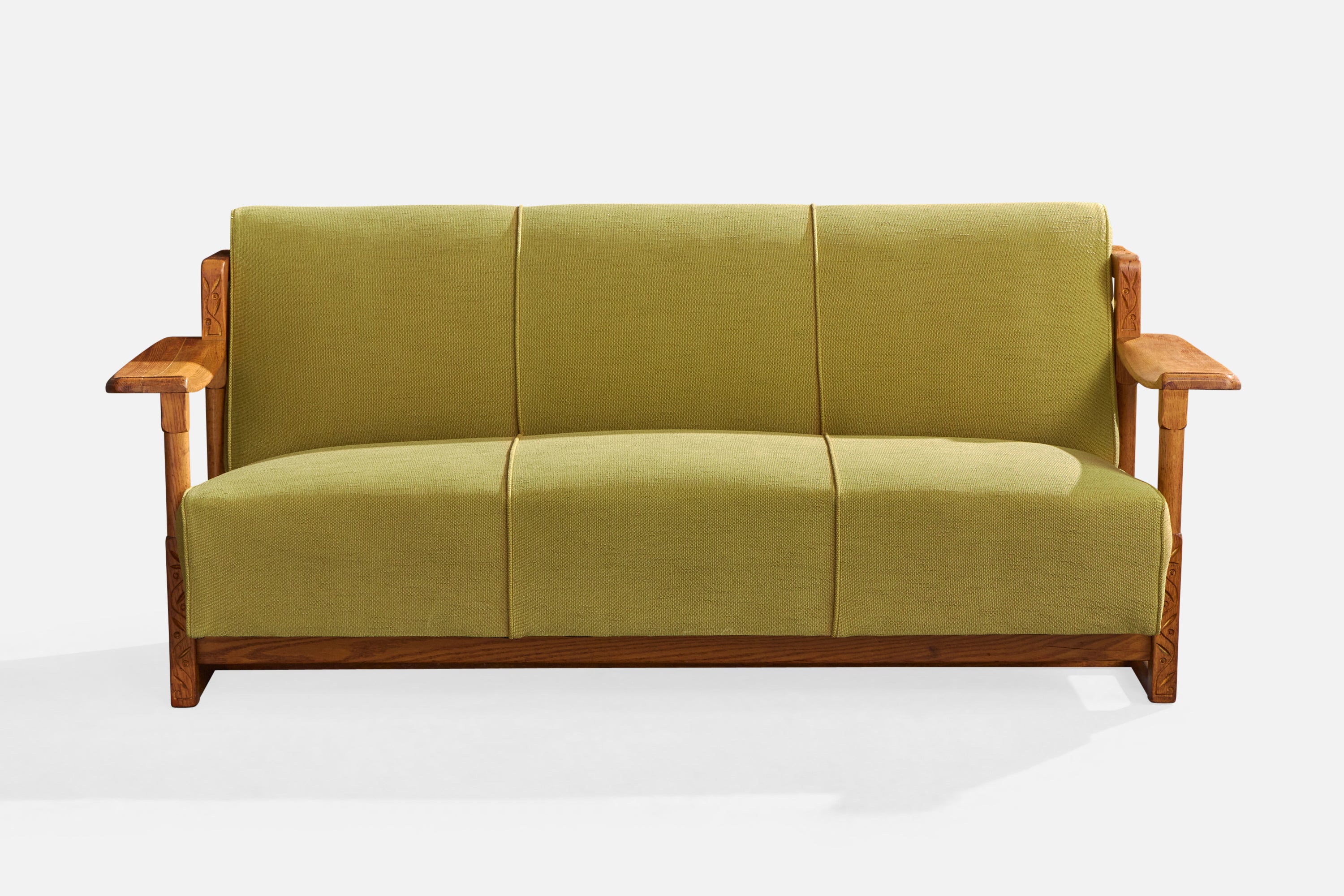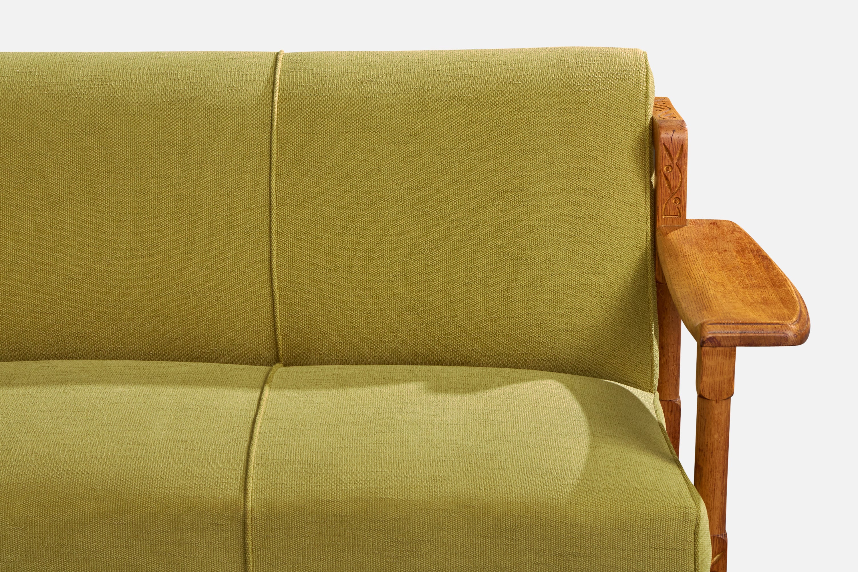 A carved oak and green fabric sofa designed and produced in the US, c. 1950s.