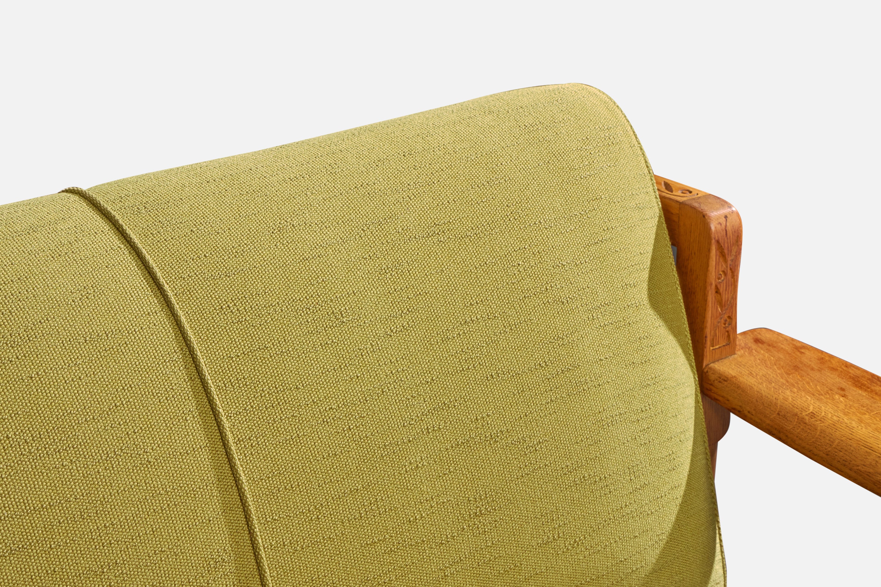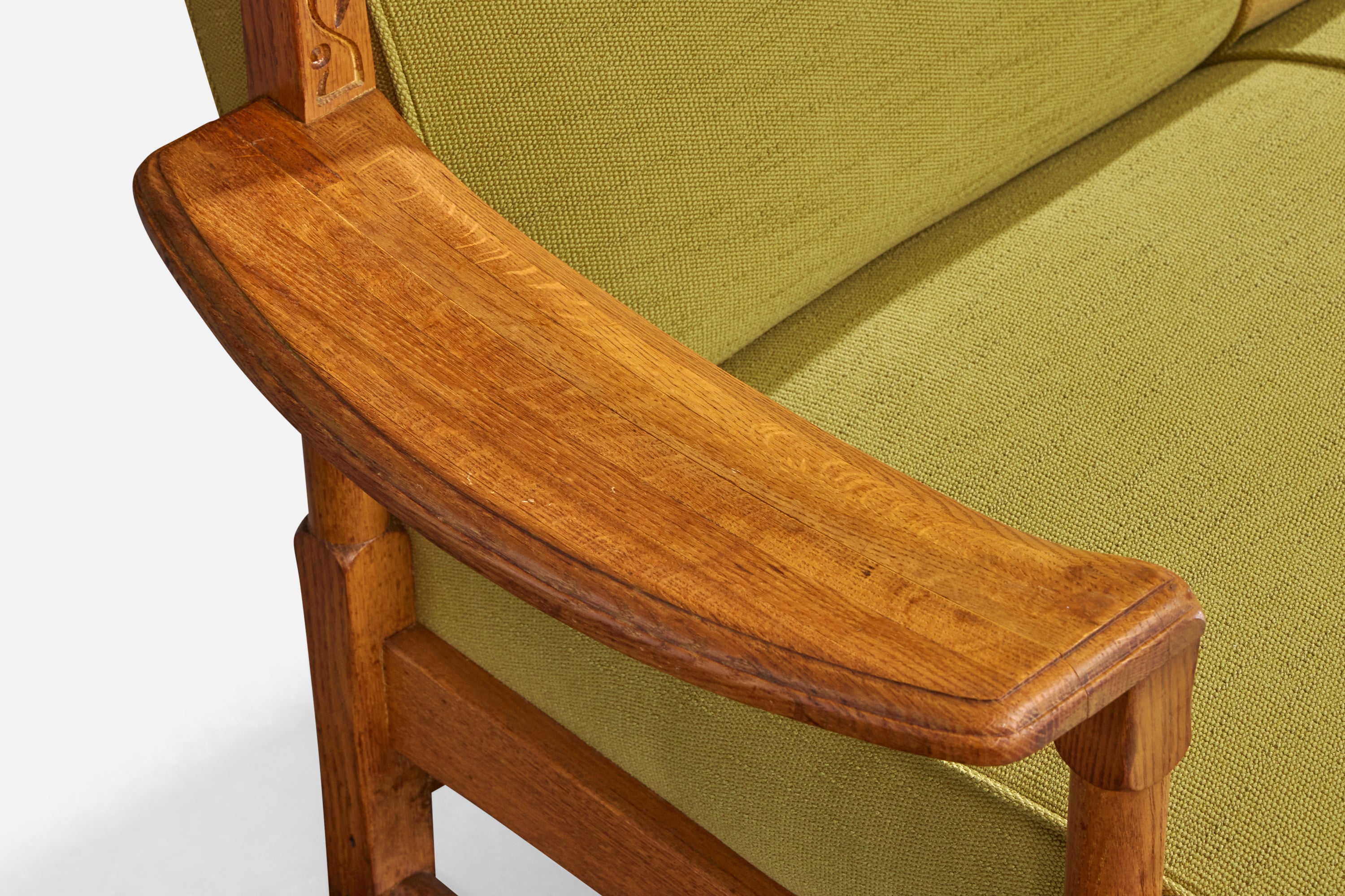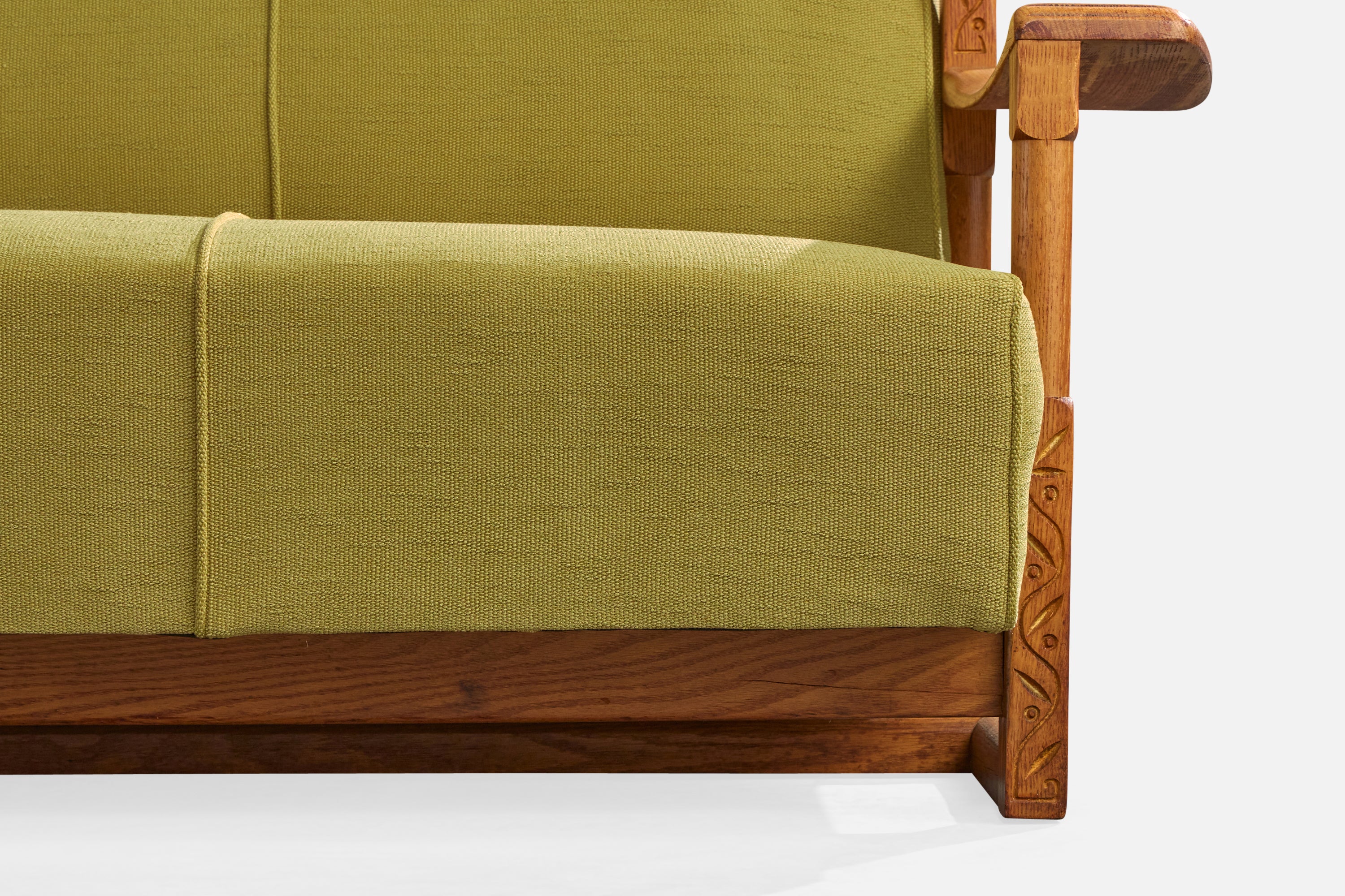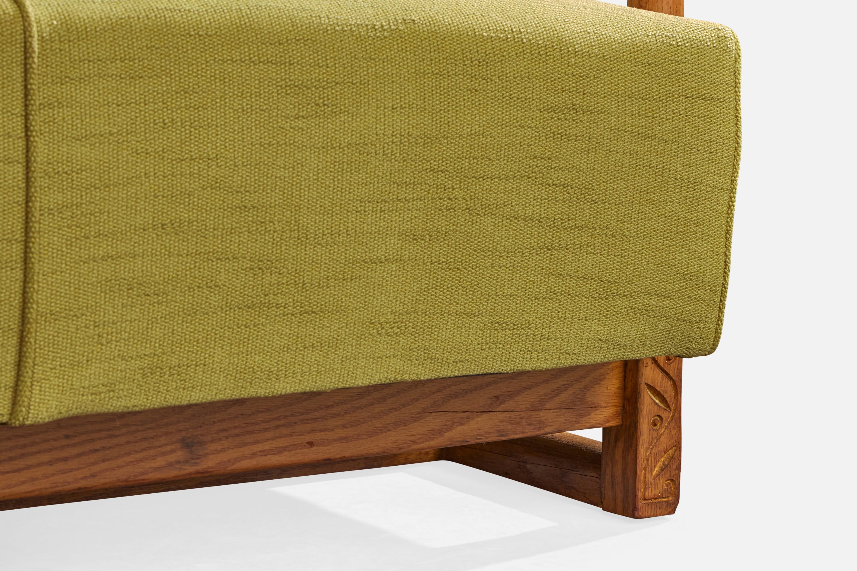 A carved oak and green fabric sofa designed and produced in the US, c. 1950s.