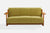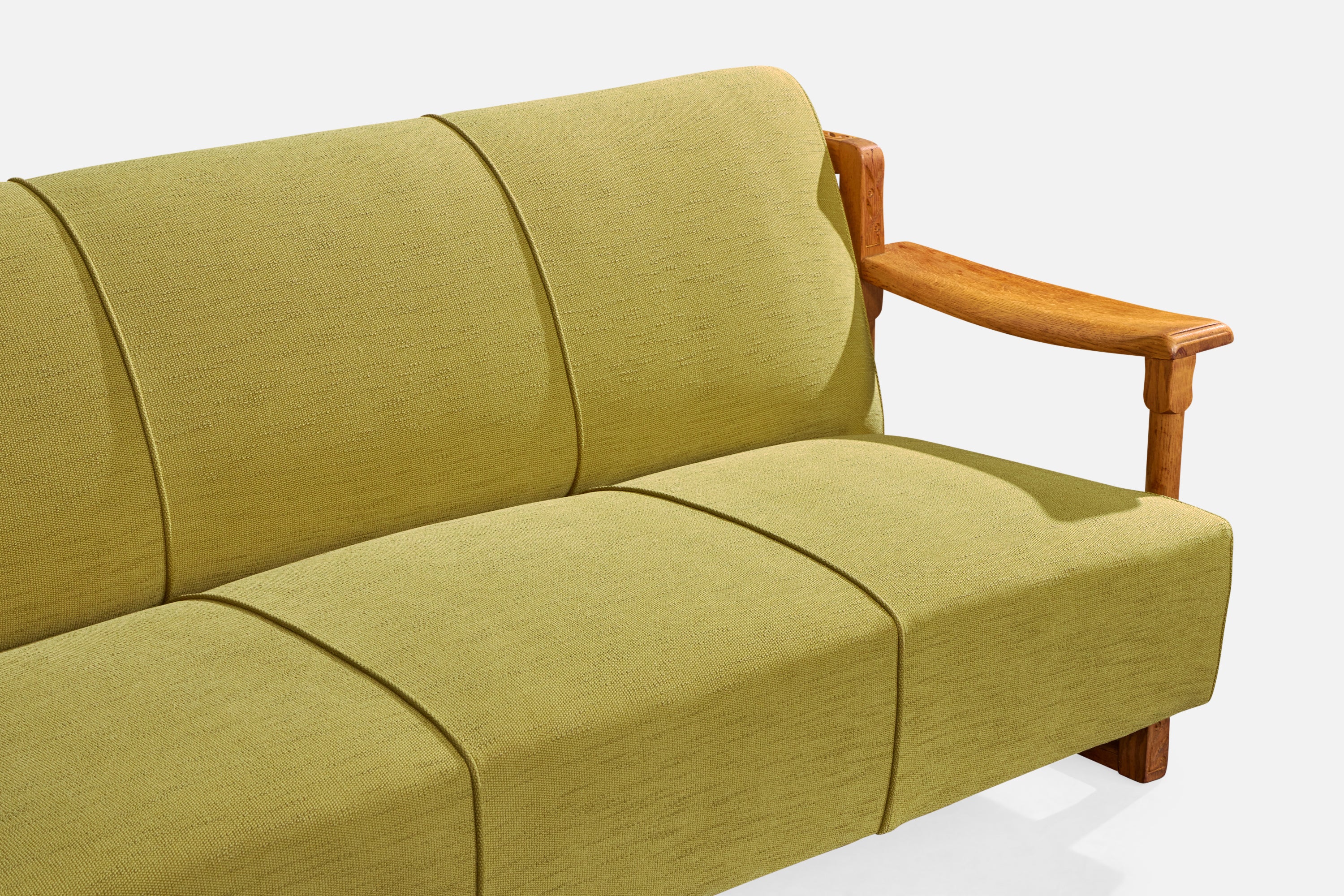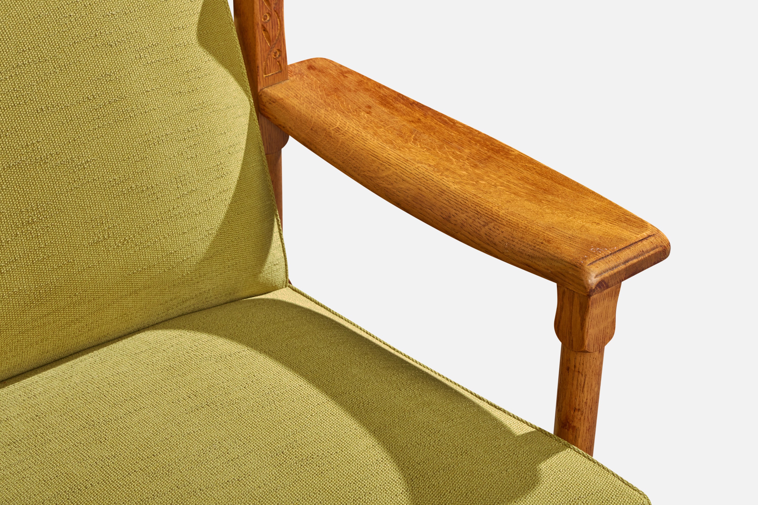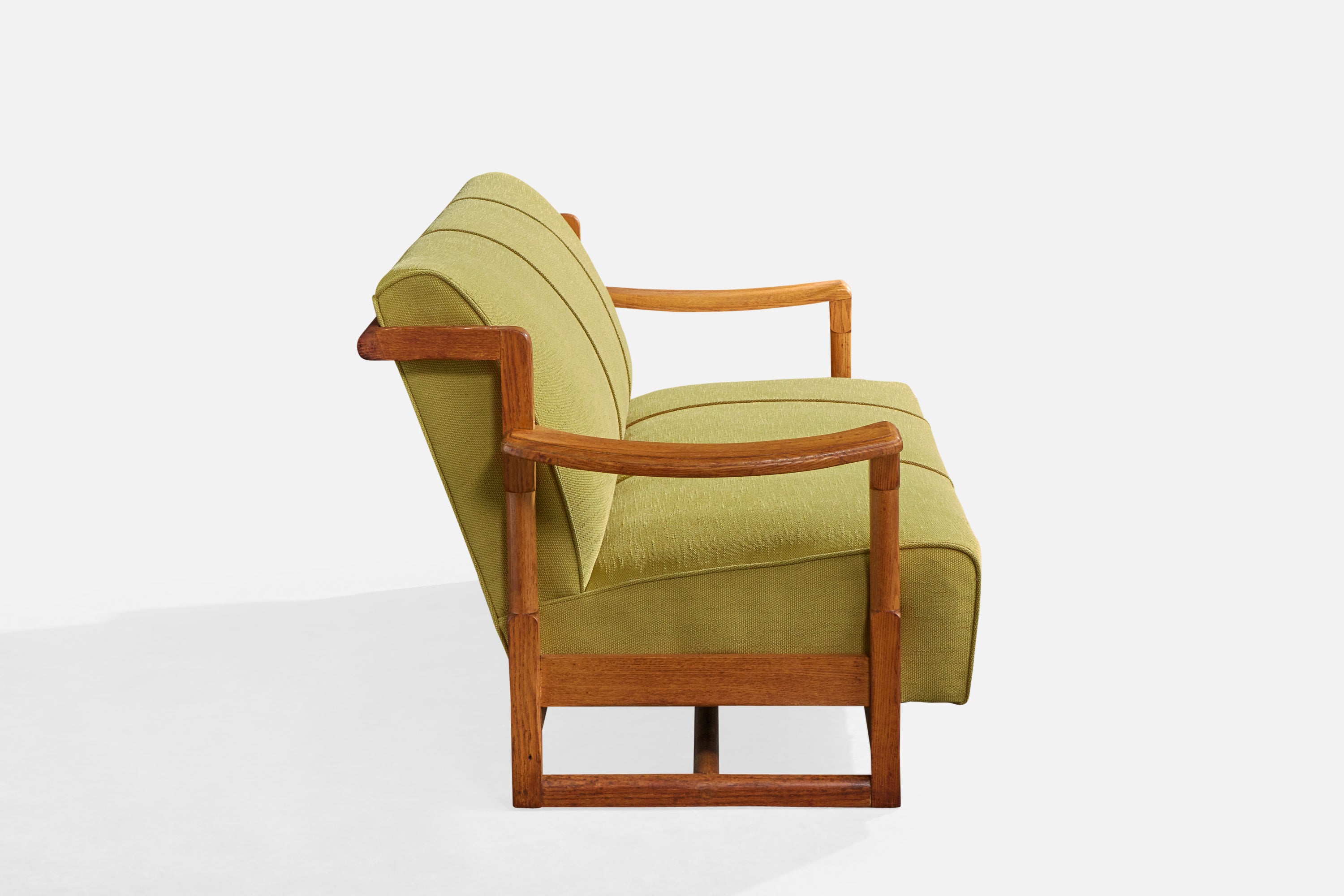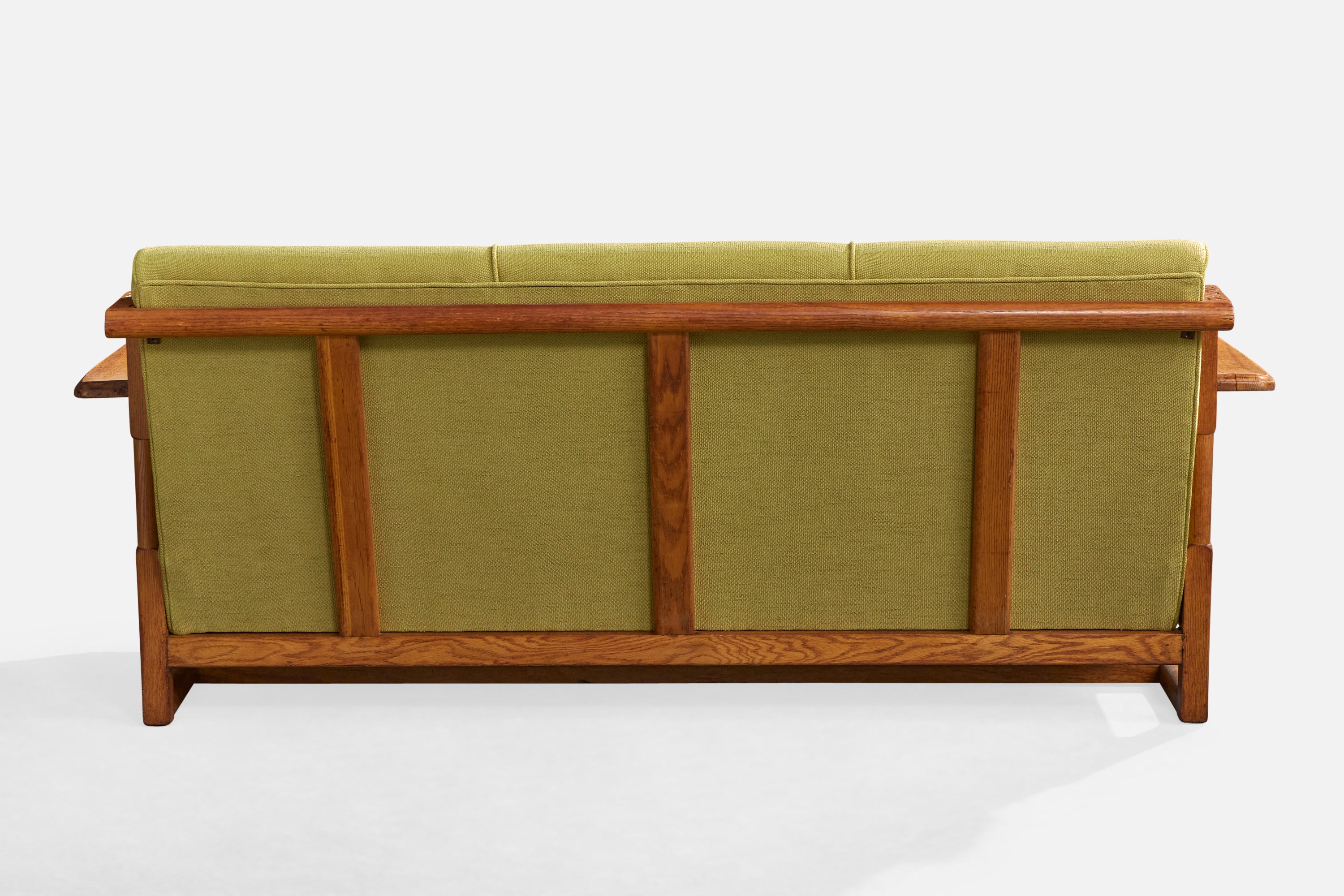 A carved oak and green fabric sofa designed and produced in the US, c. 1950s.