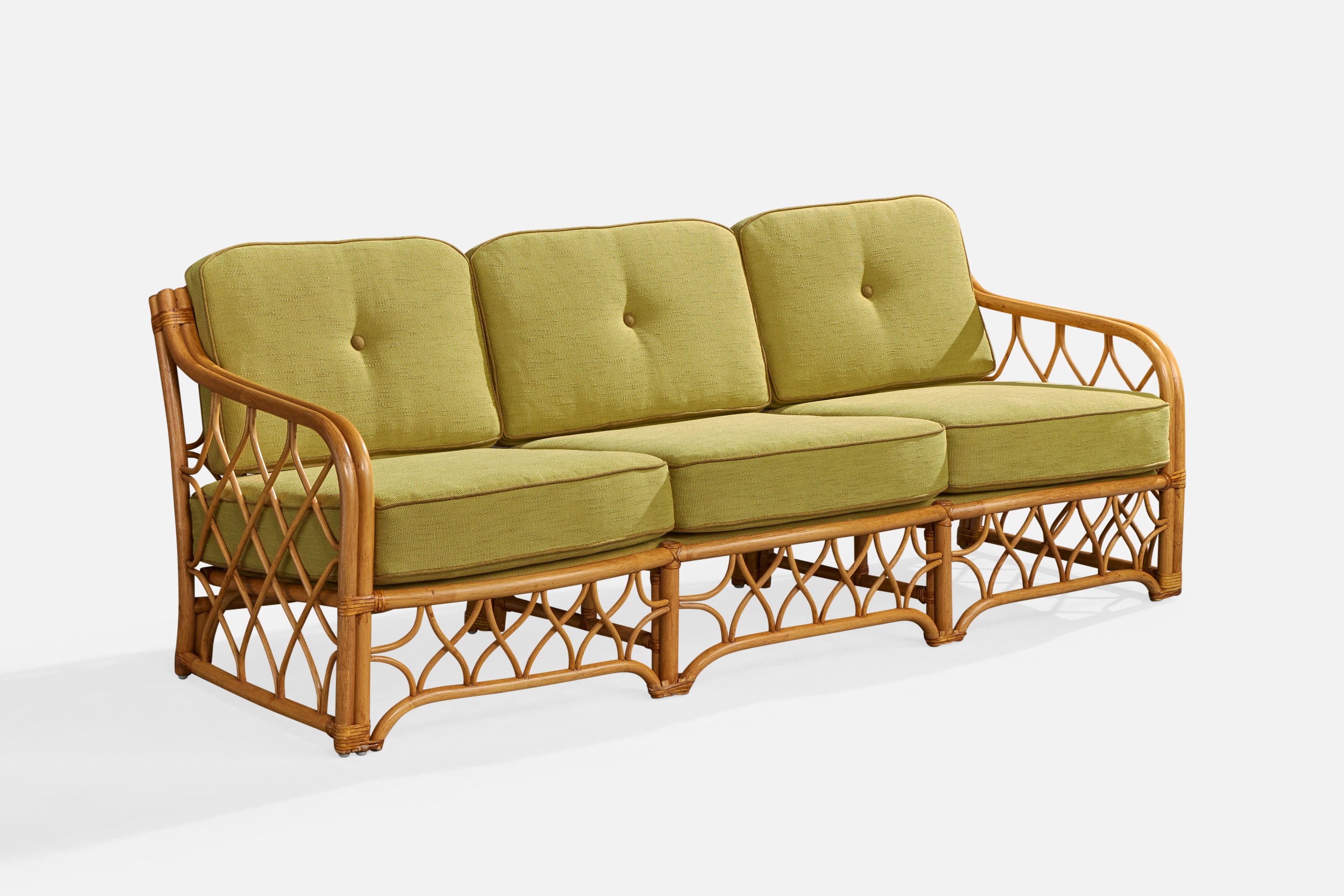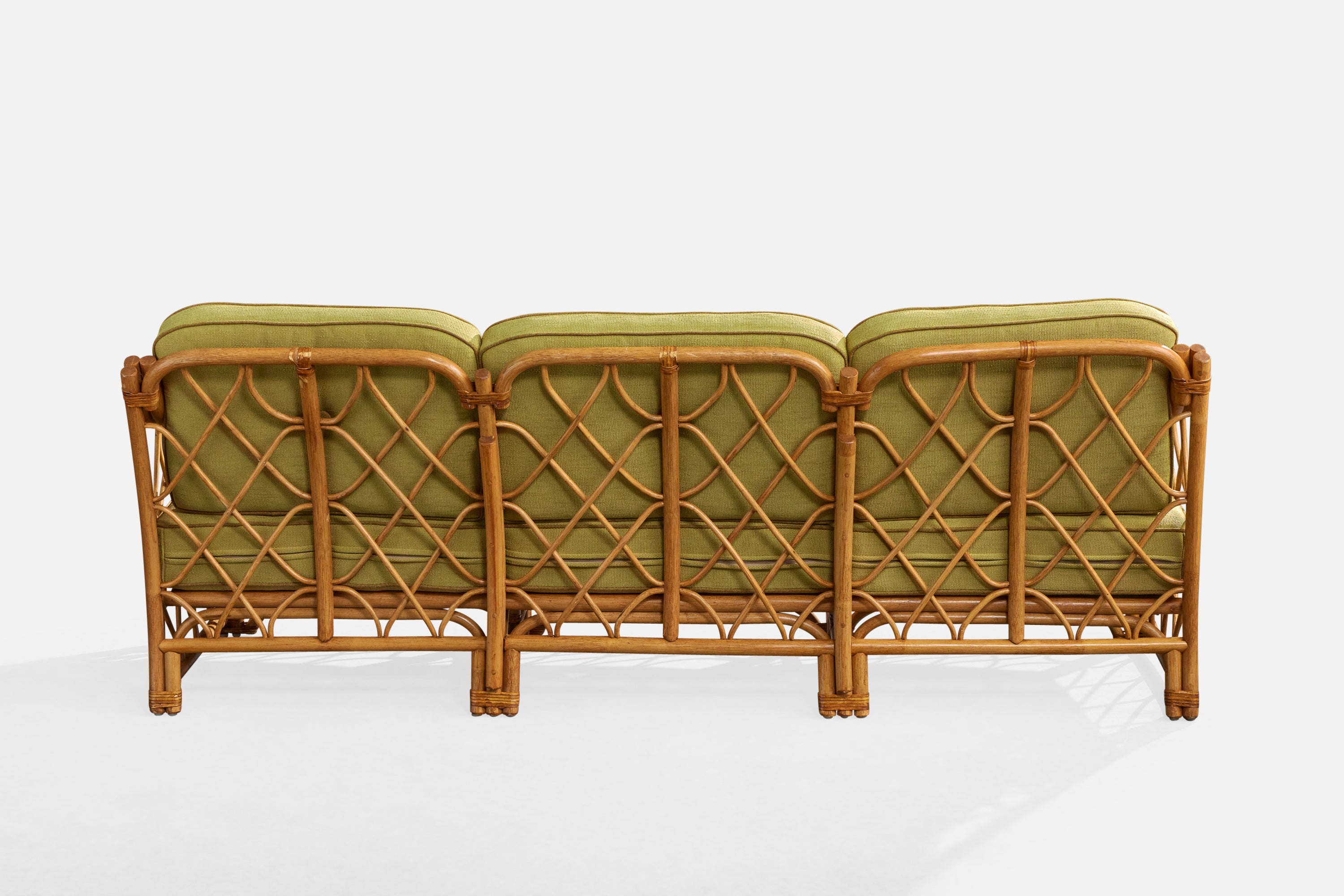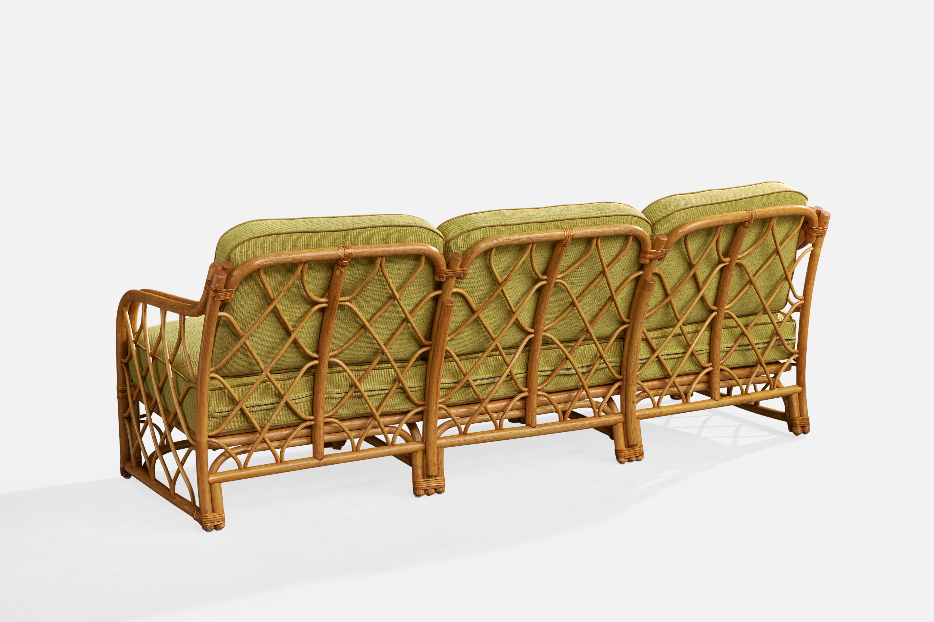 A bamboo, rattan and green fabric sofa, designed and produced in the US, c. 1950s.