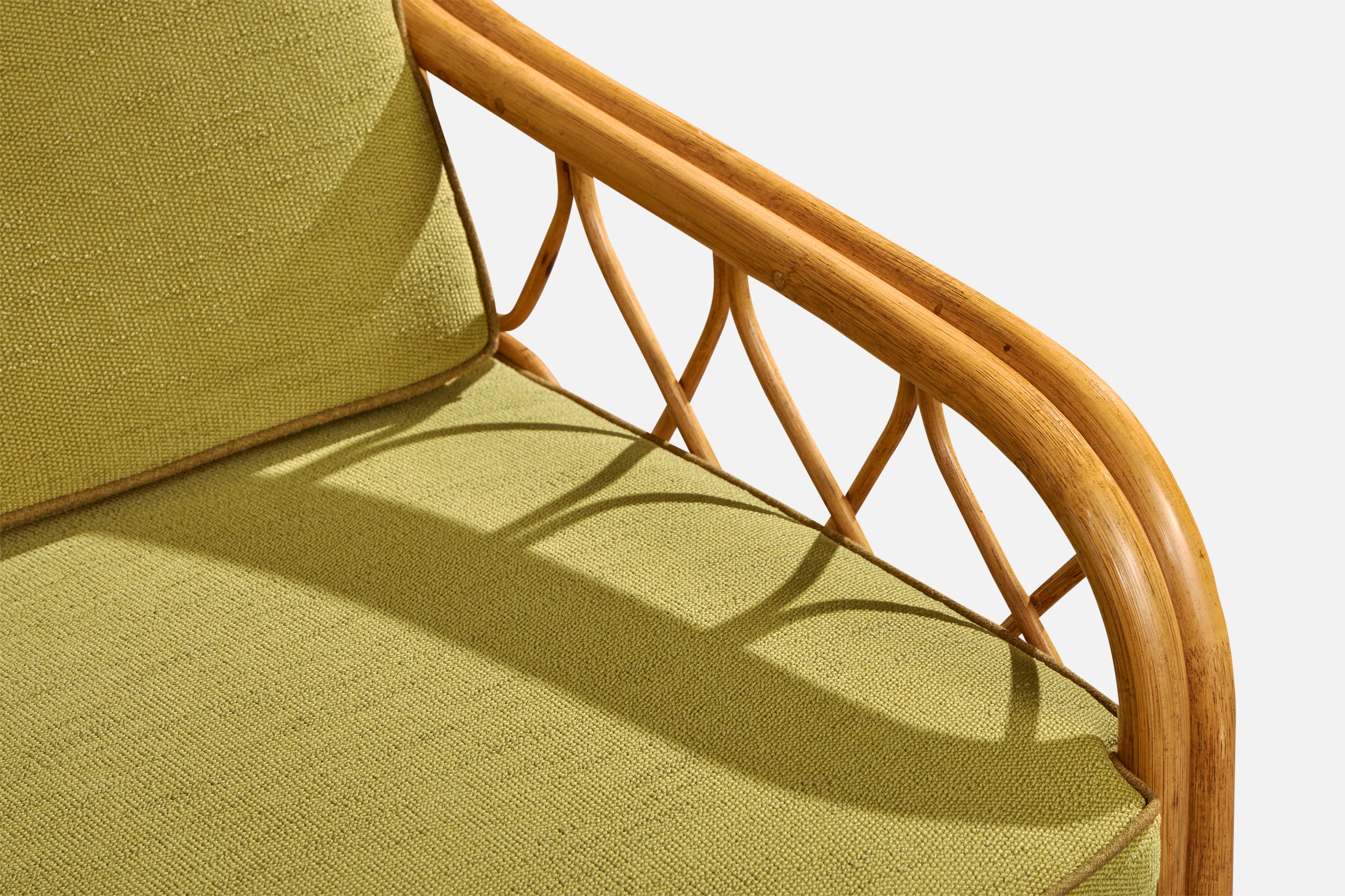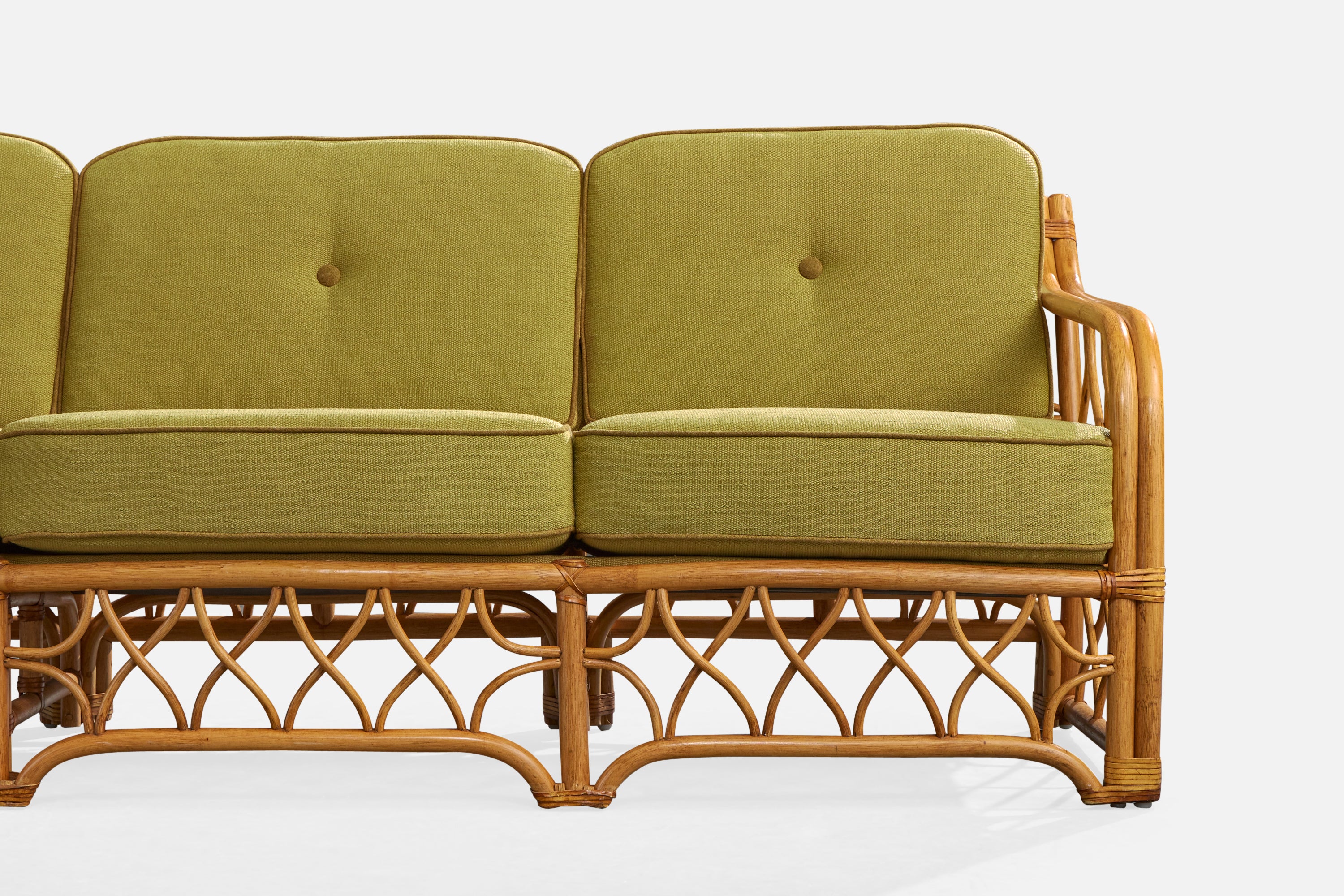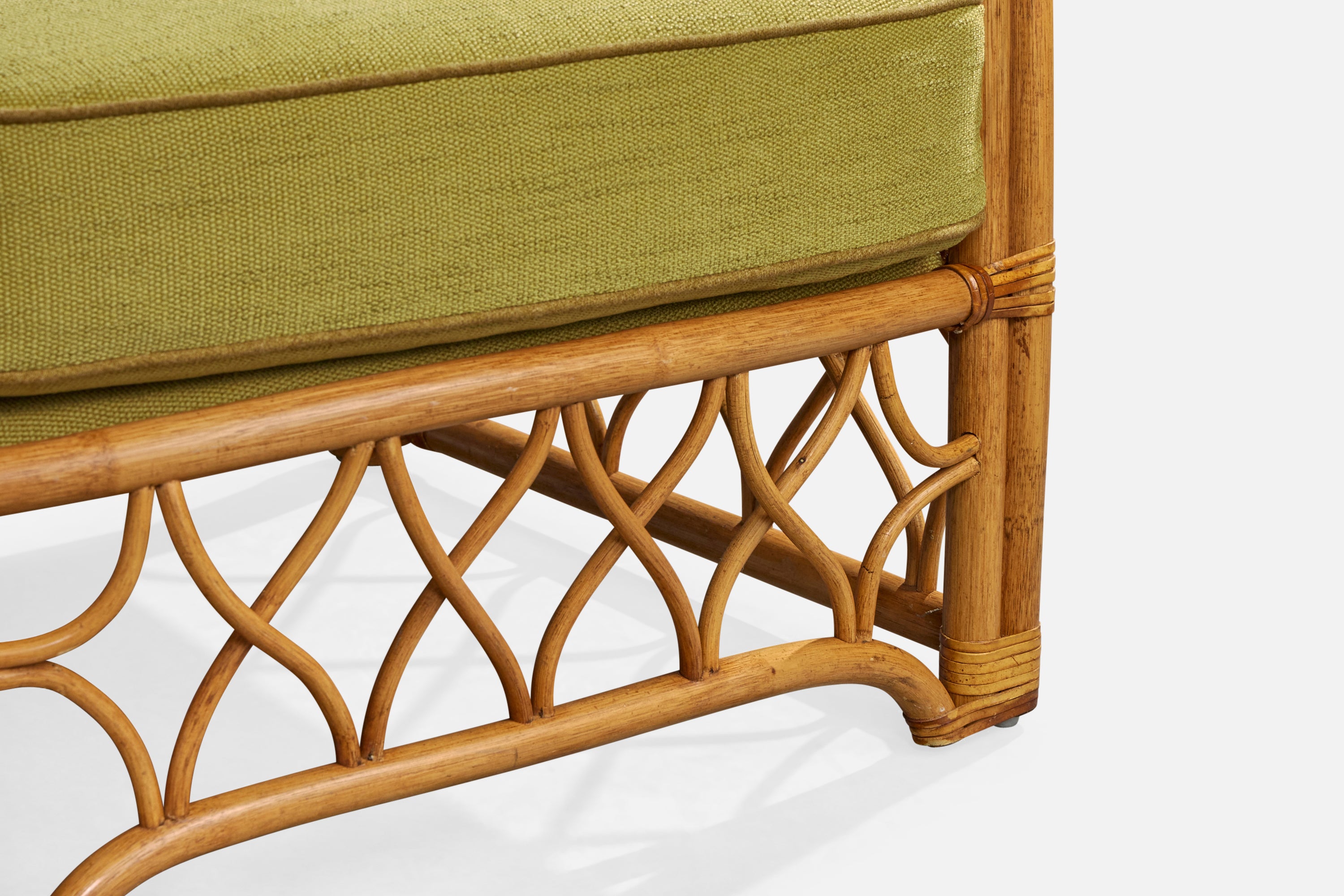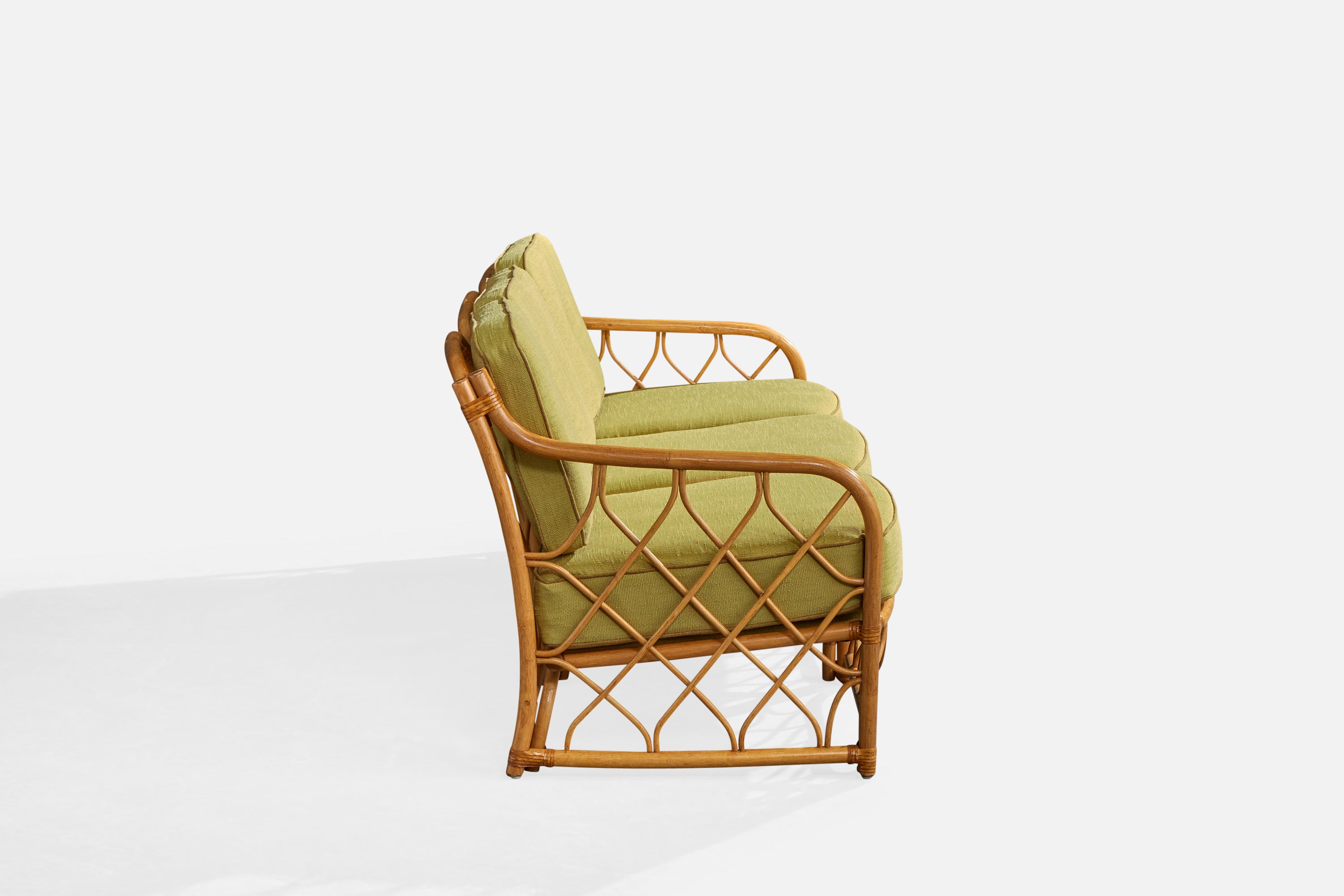 A bamboo, rattan and green fabric sofa, designed and produced in the US, c. 1950s.