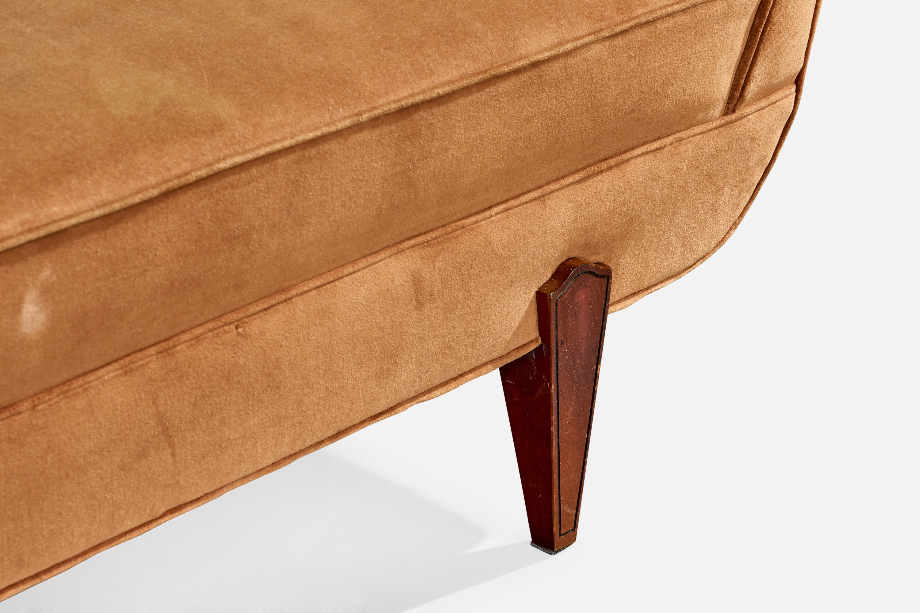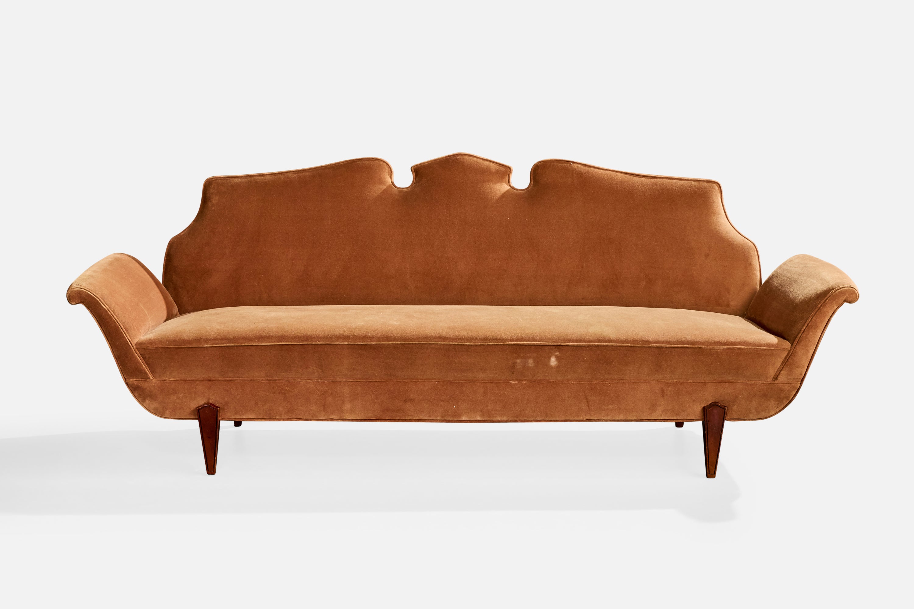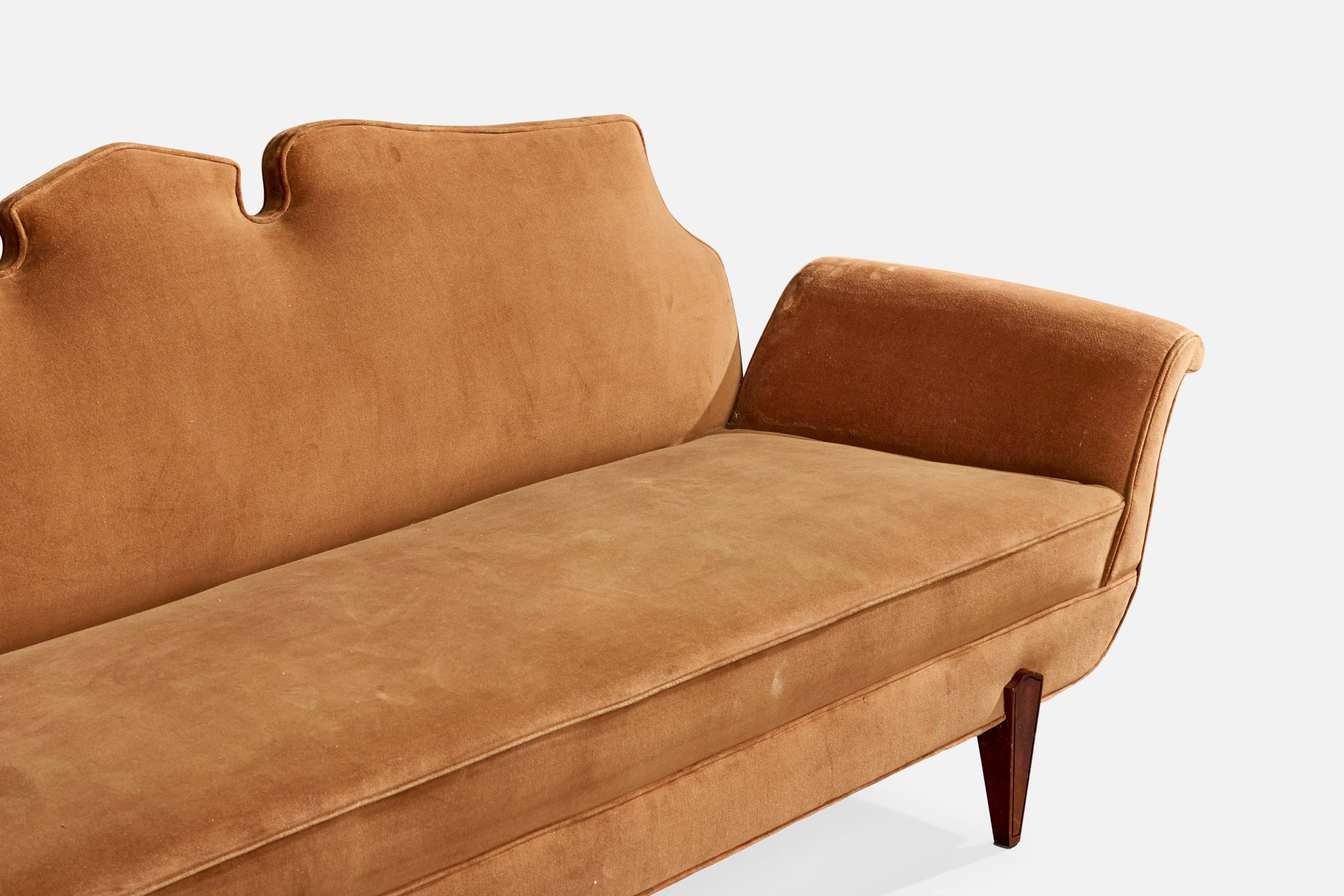 A brown velvet and dark-stained wood sofa designed and produced by Salvatore Dinucci, Brazil, c. 1950s.