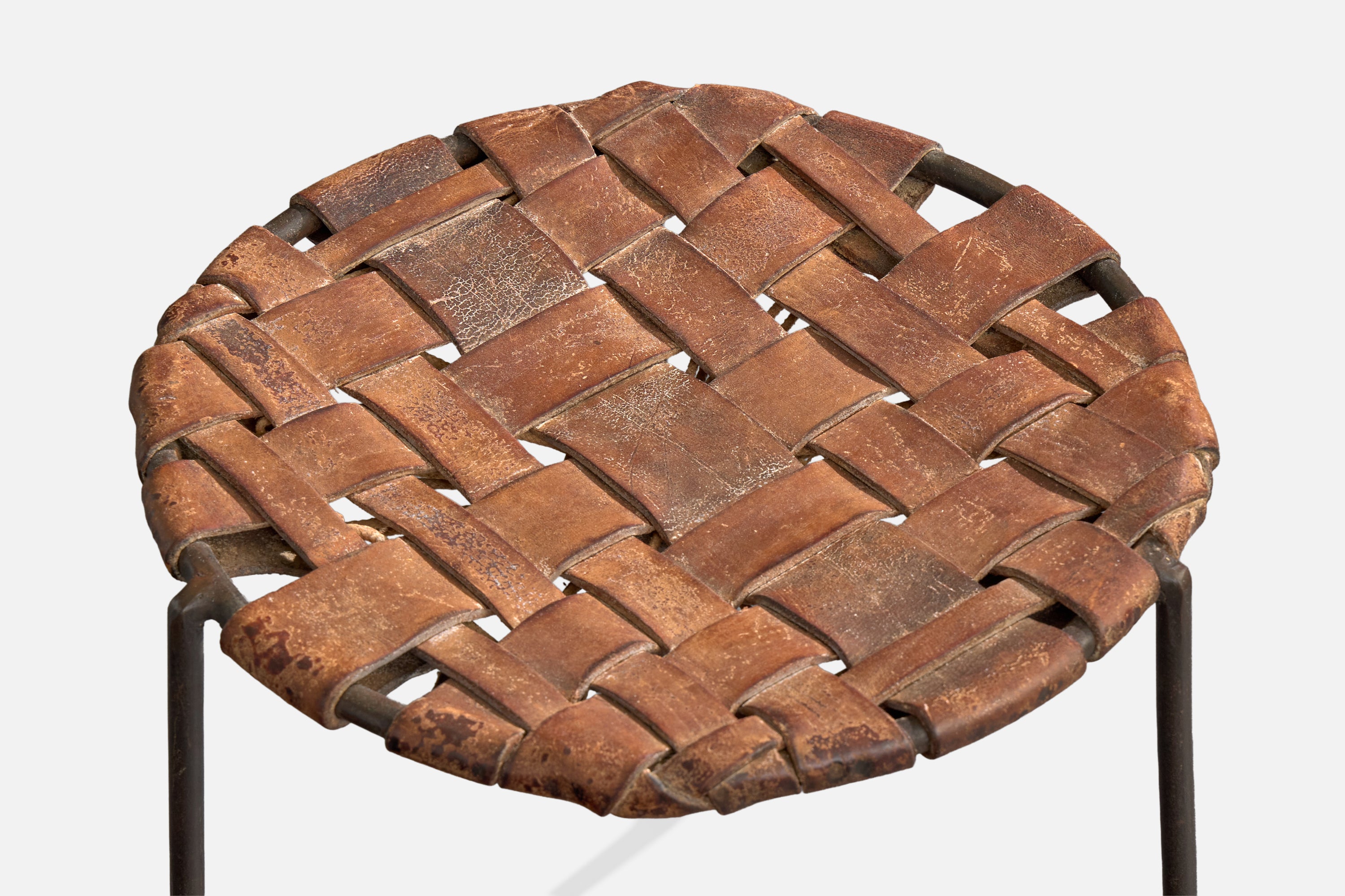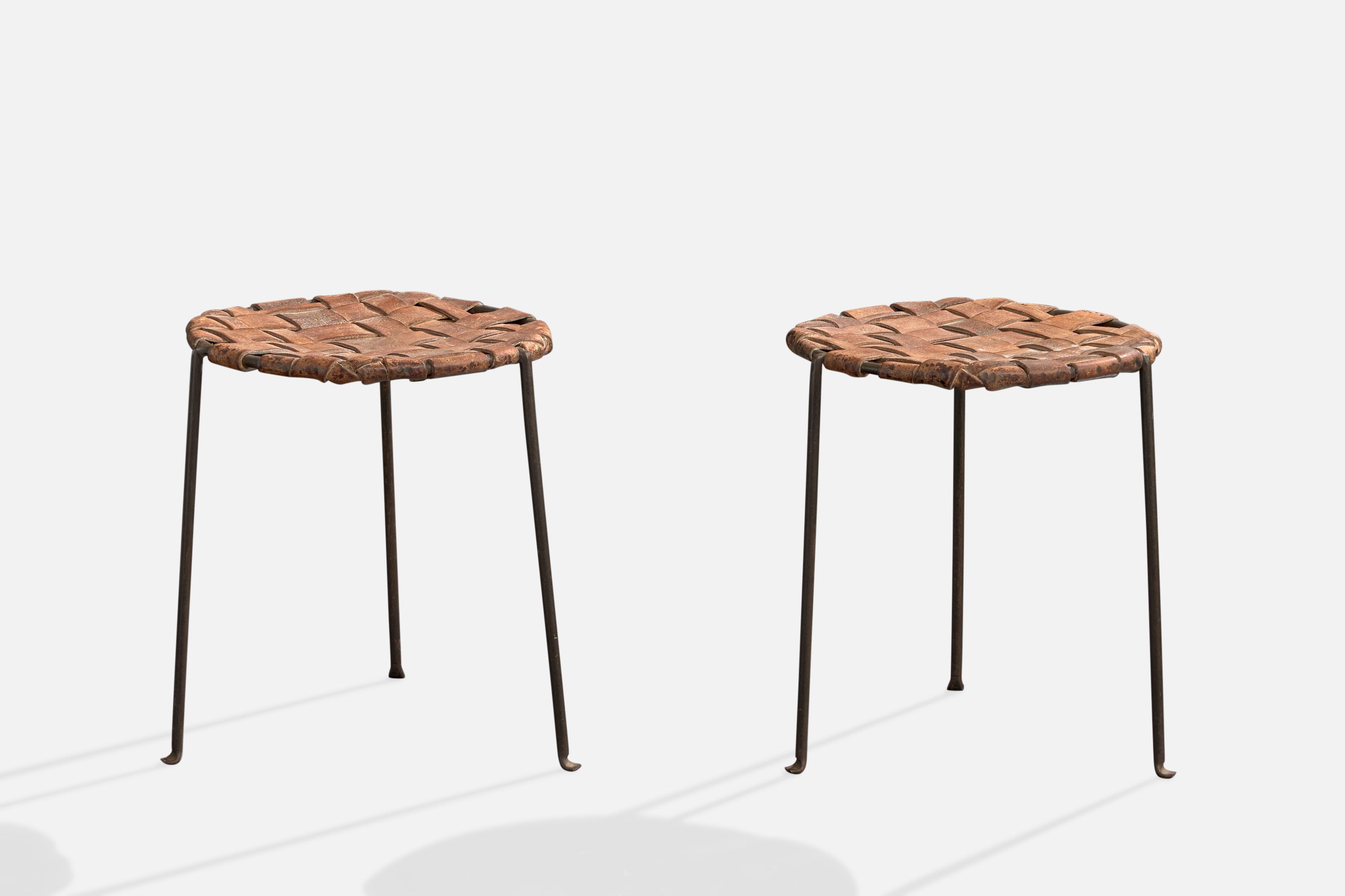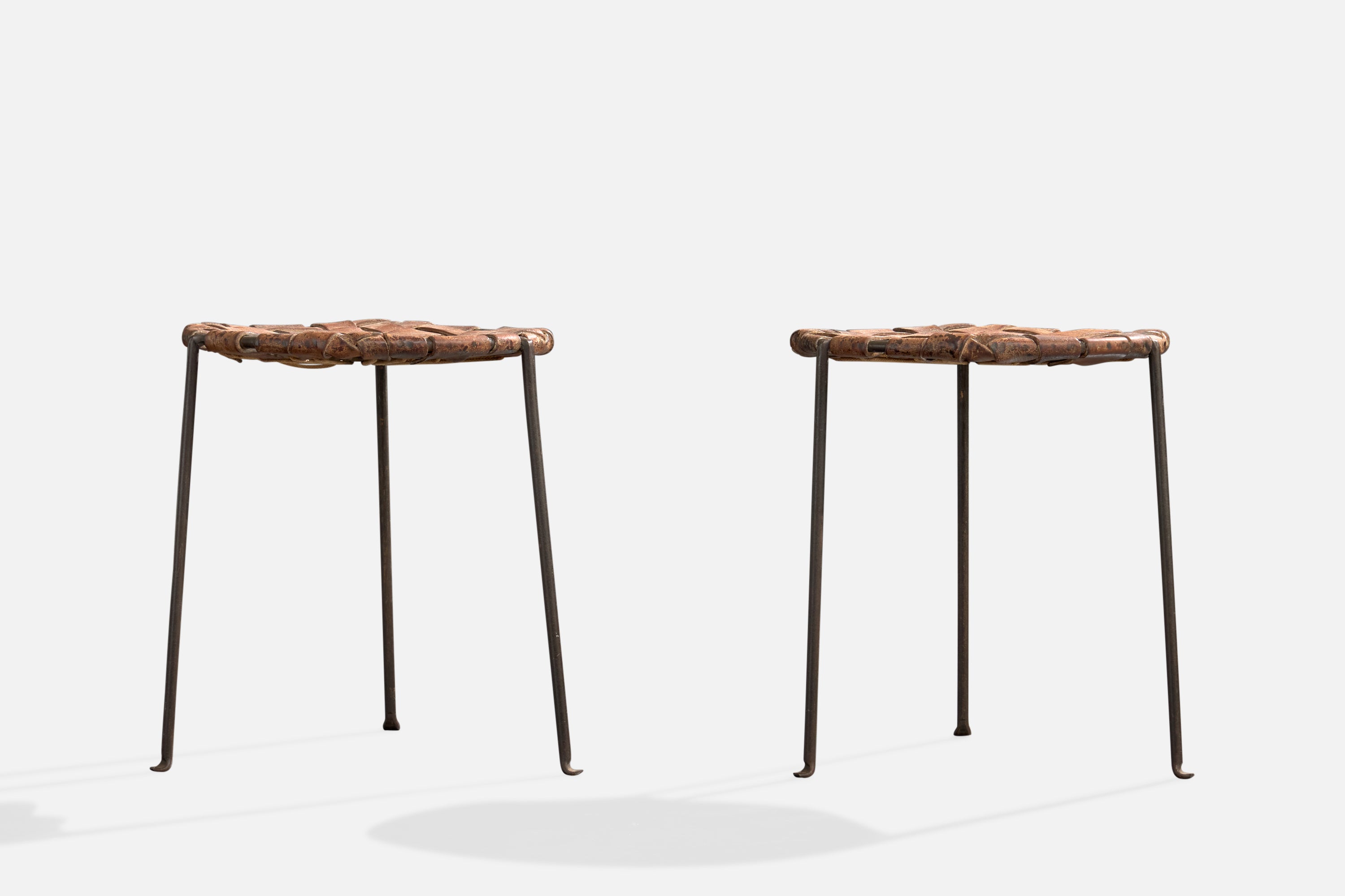 A pair of brown leather and black-enameled steel stools designed and produced by Lila Swift and Donald Monell, USA, c. 1950s.