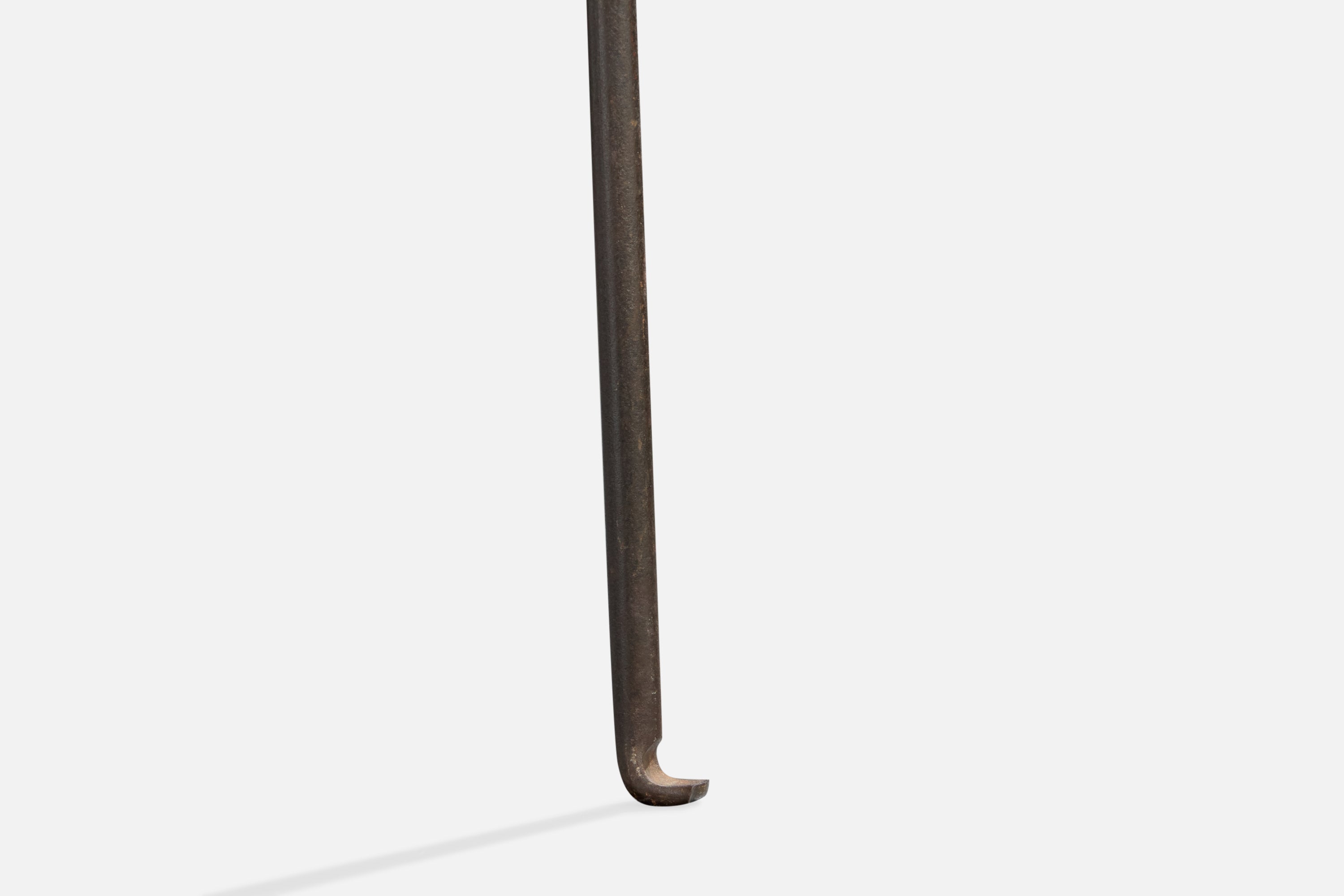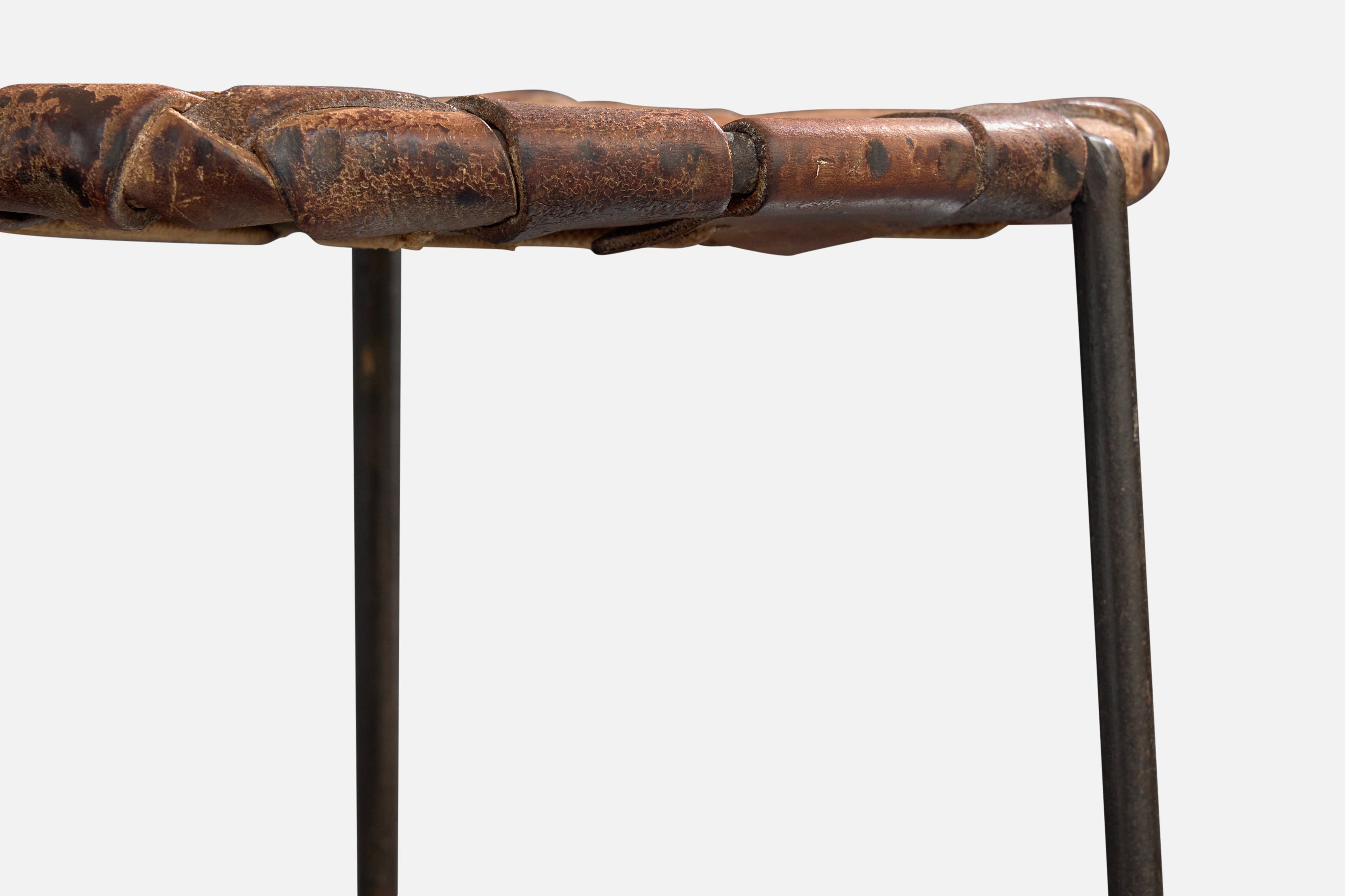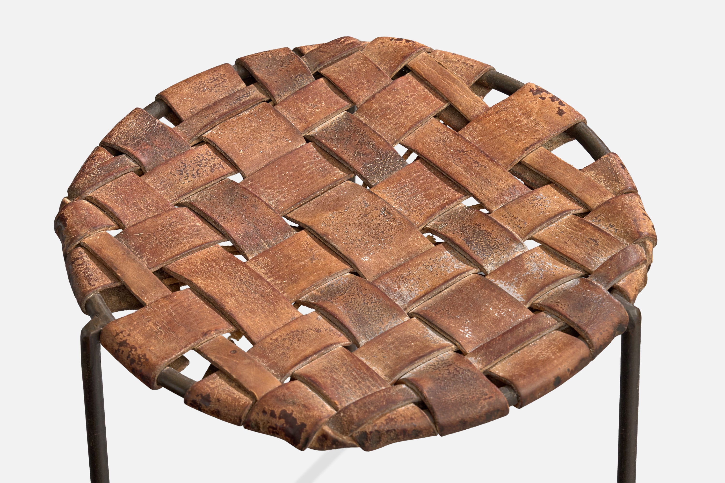 A pair of brown leather and black-enameled steel stools designed and produced by Lila Swift and Donald Monell, USA, c. 1950s.