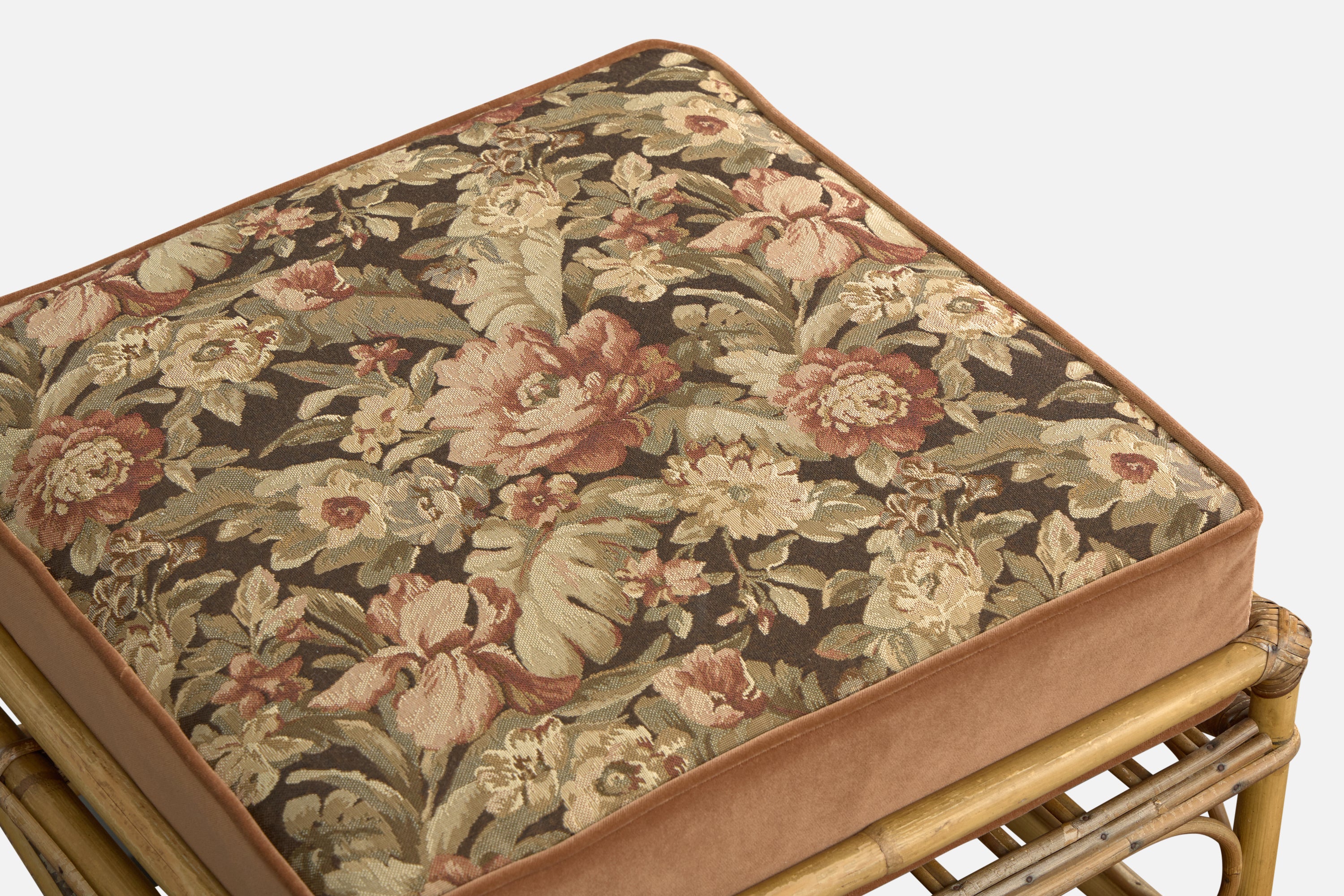 A bamboo, rattan, brown velvet and floral-printed fabric stool designed and produced in the US, c. 1950s.