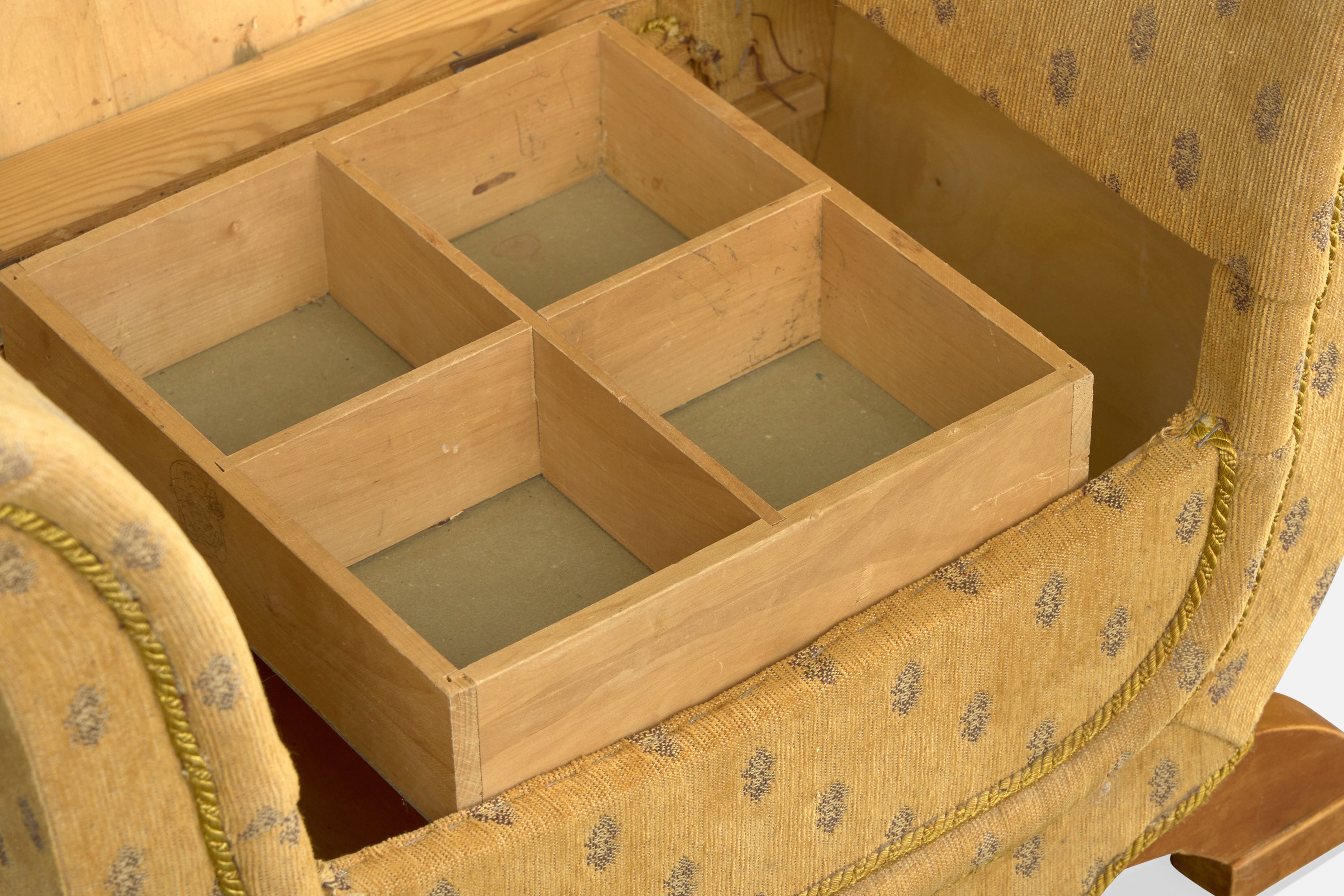 A yellow fabric and wood sewing stool with storage designed and produced in Sweden, c. 1930s.