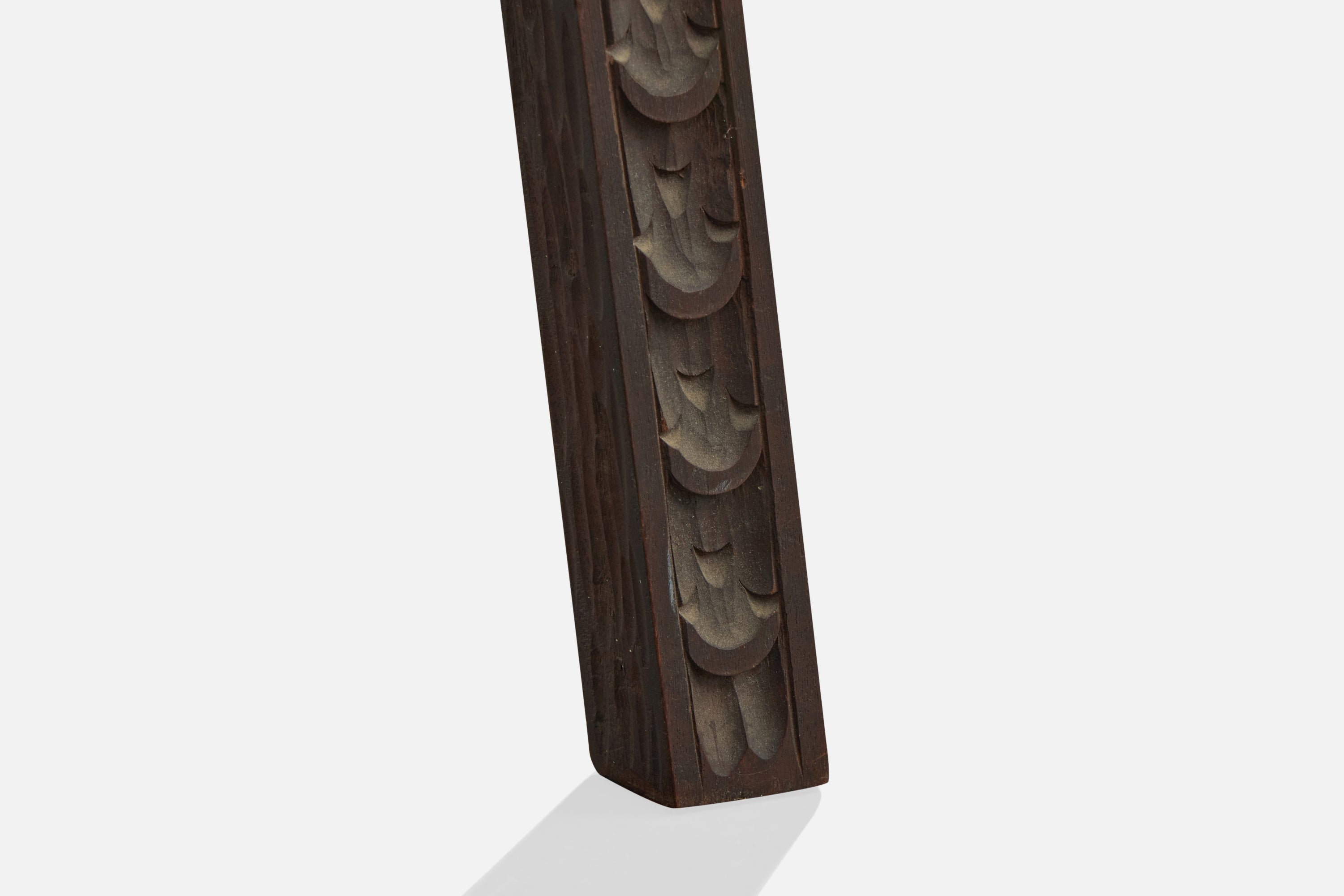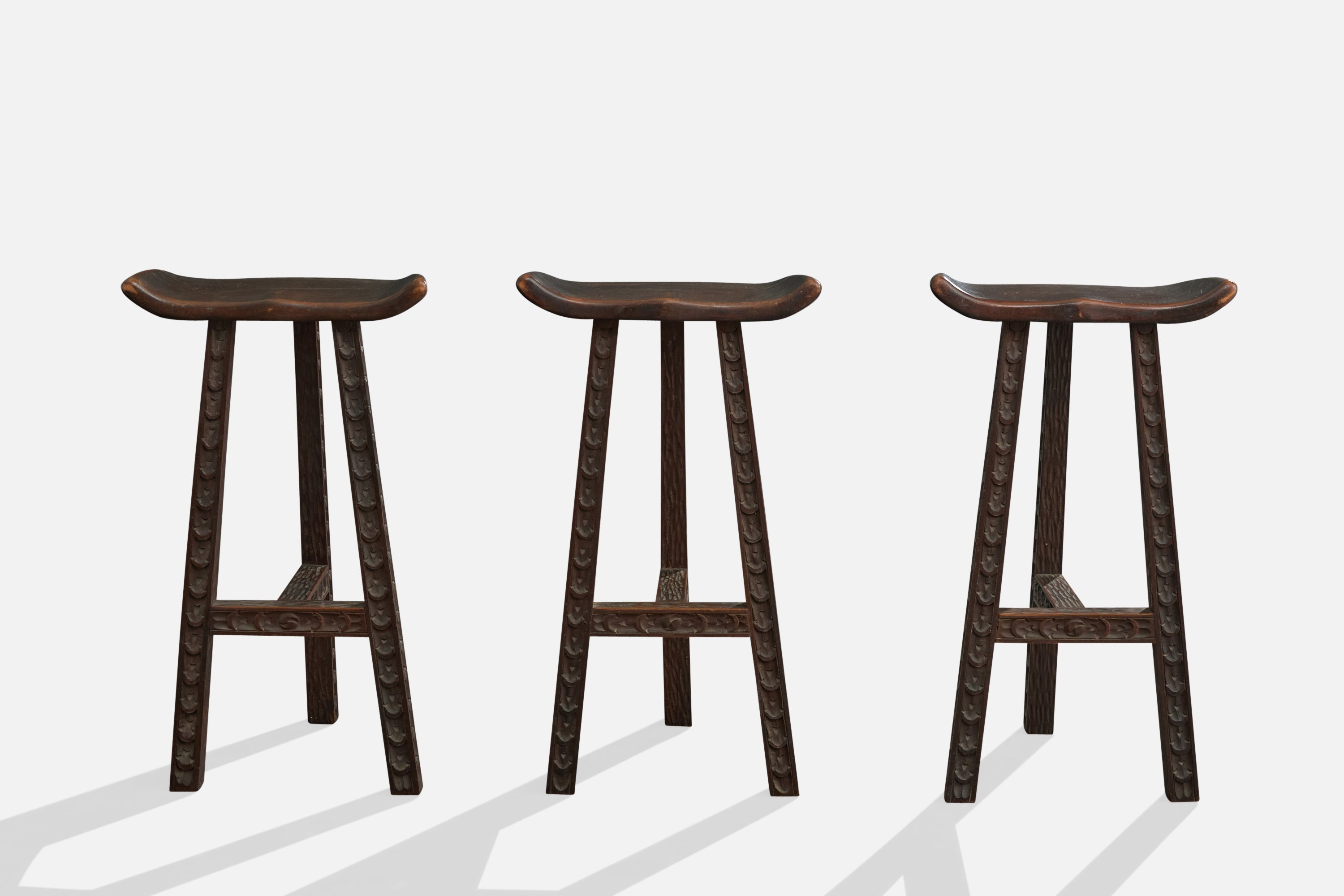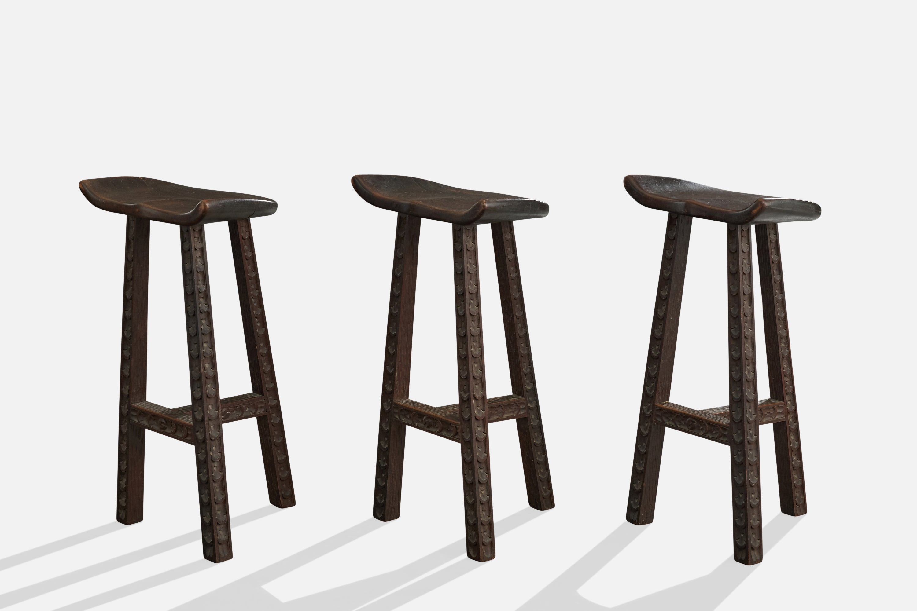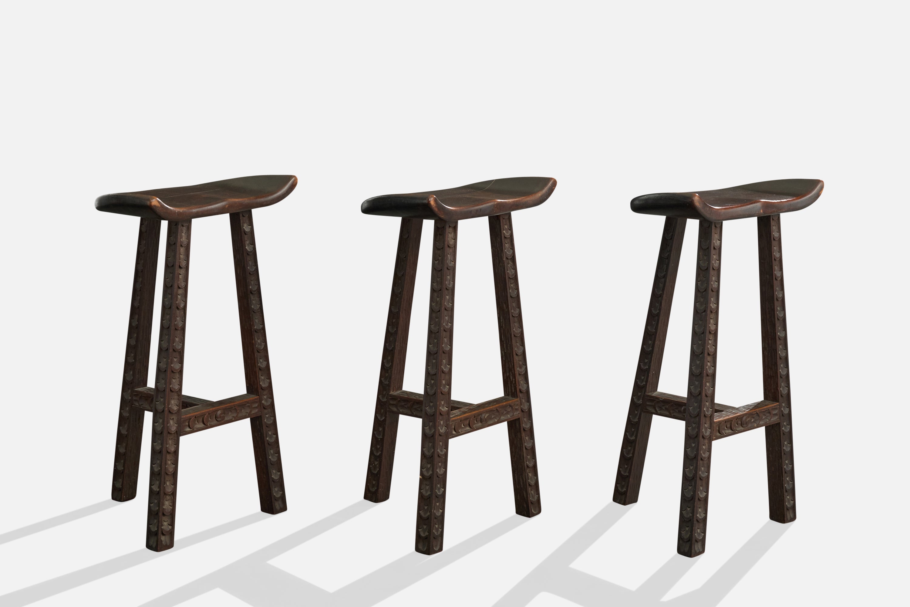 A set of three dark-stained and hand-carved wood counter stools or bar stools designed and produced in Argentina, c. 1970s.