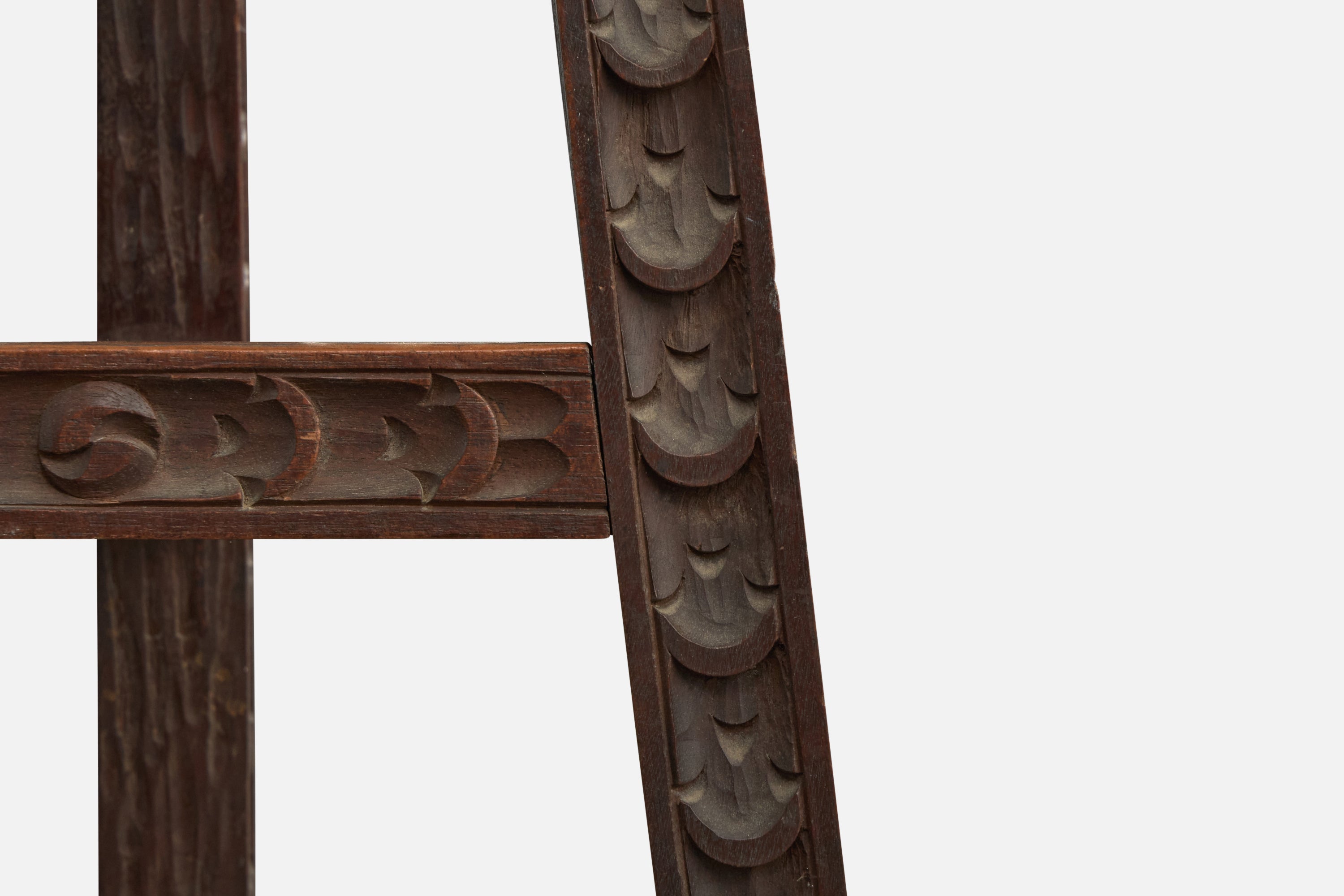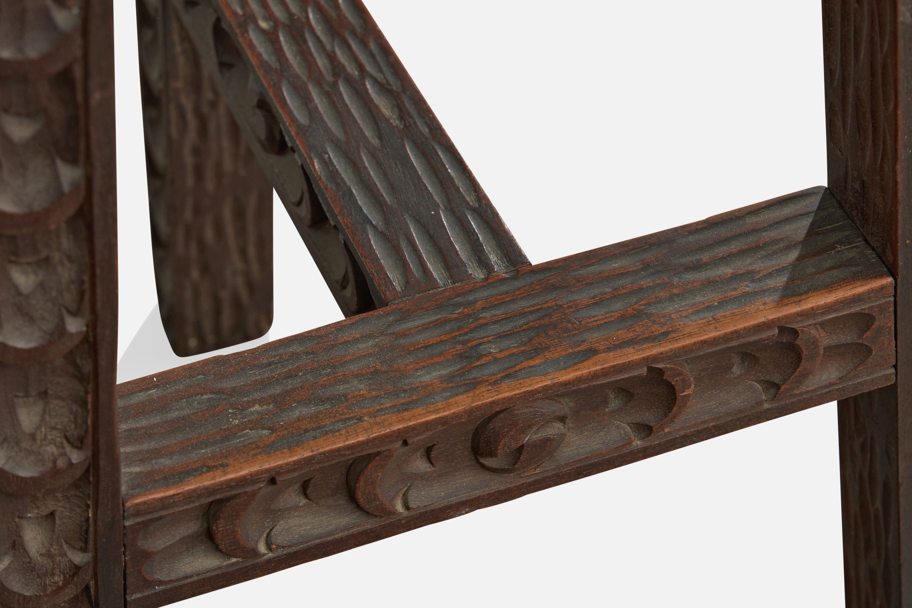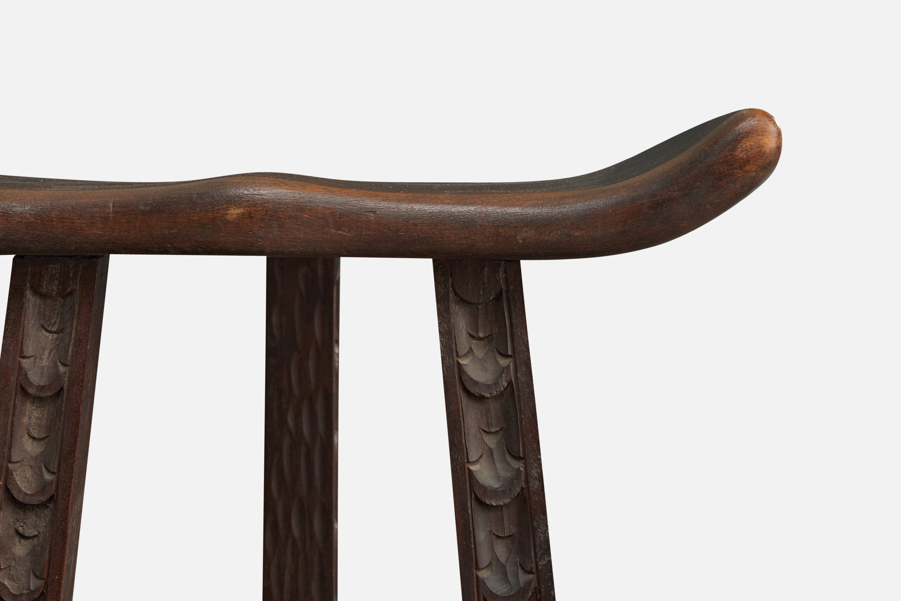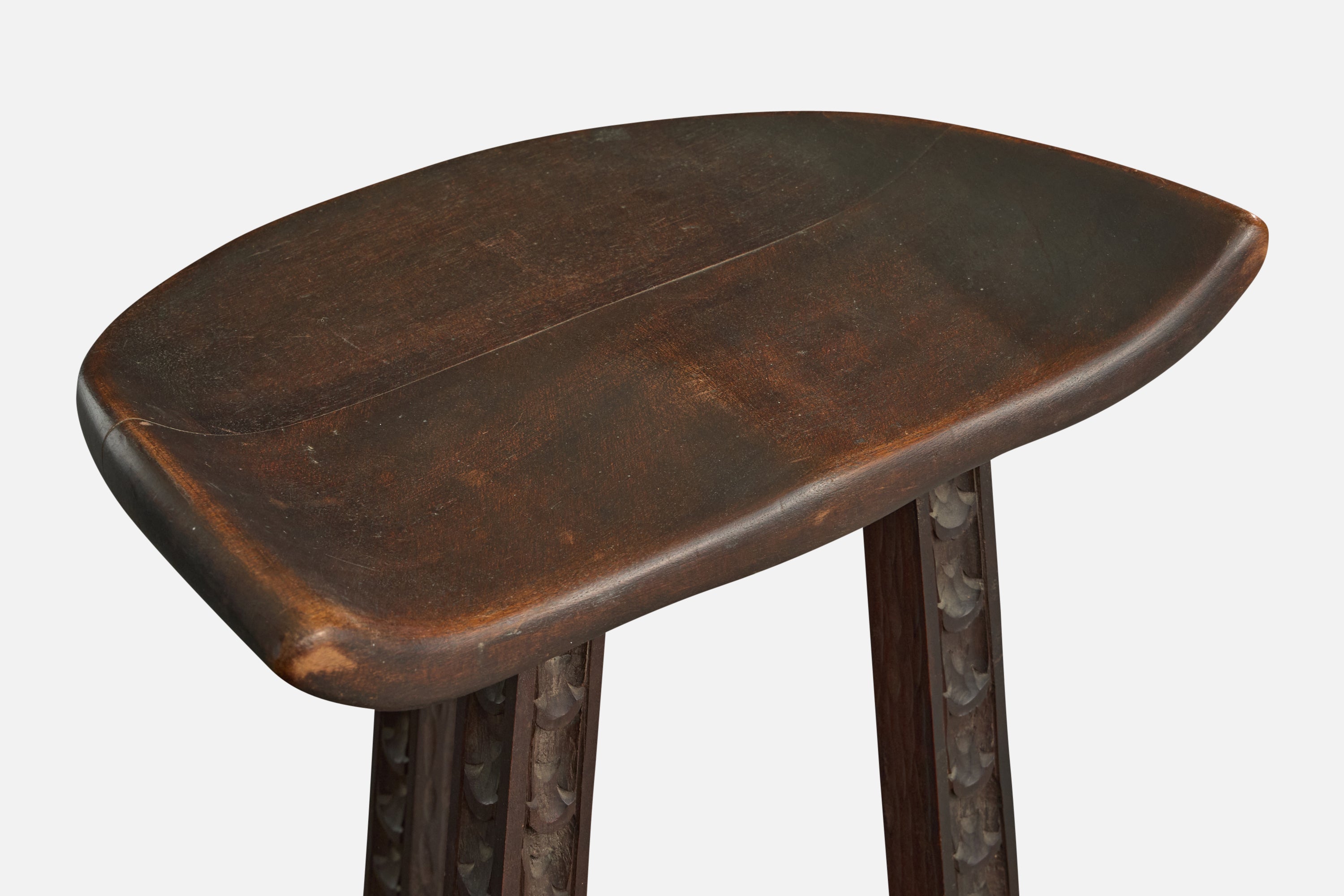 A set of three dark-stained and hand-carved wood counter stools or bar stools designed and produced in Argentina, c. 1970s.