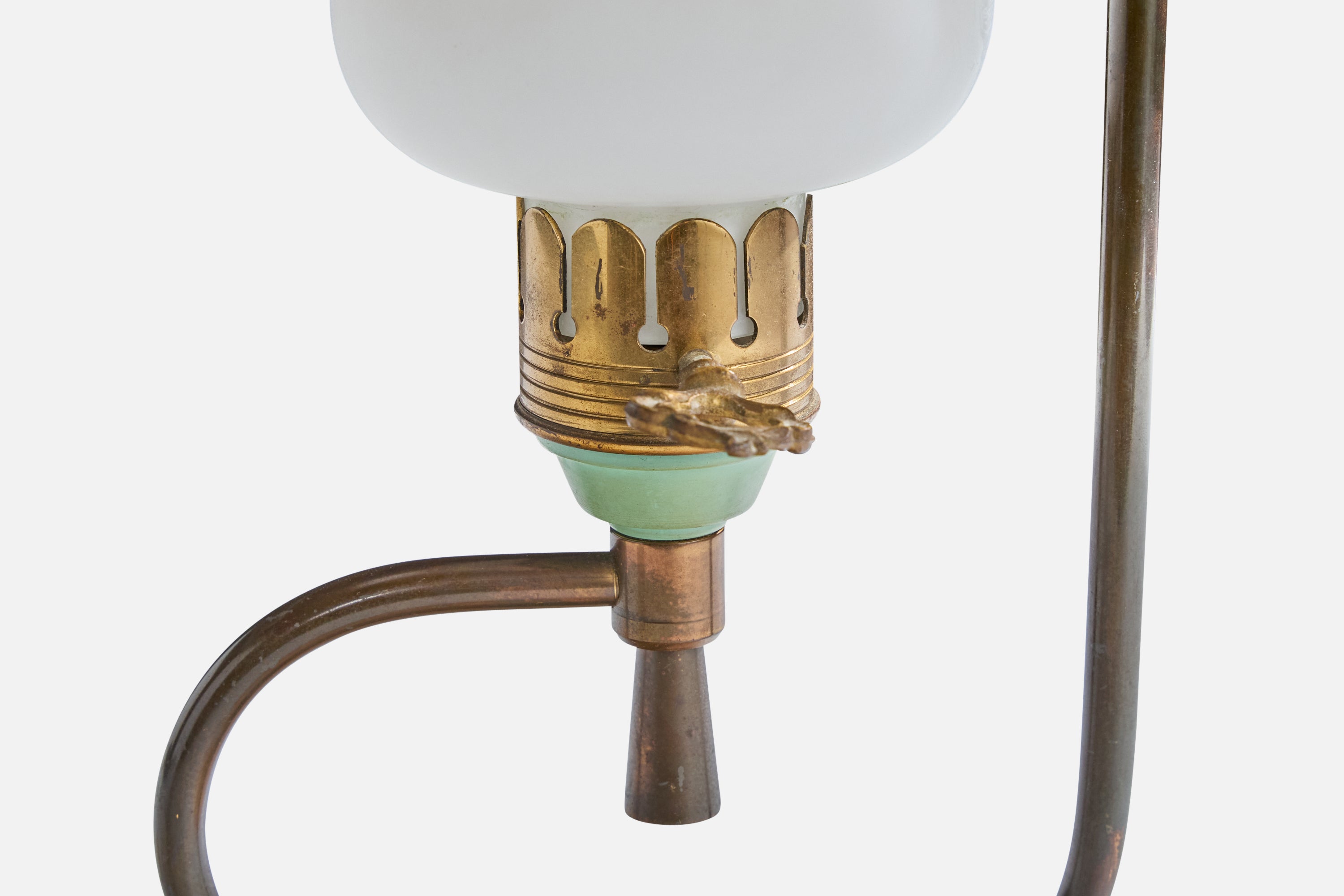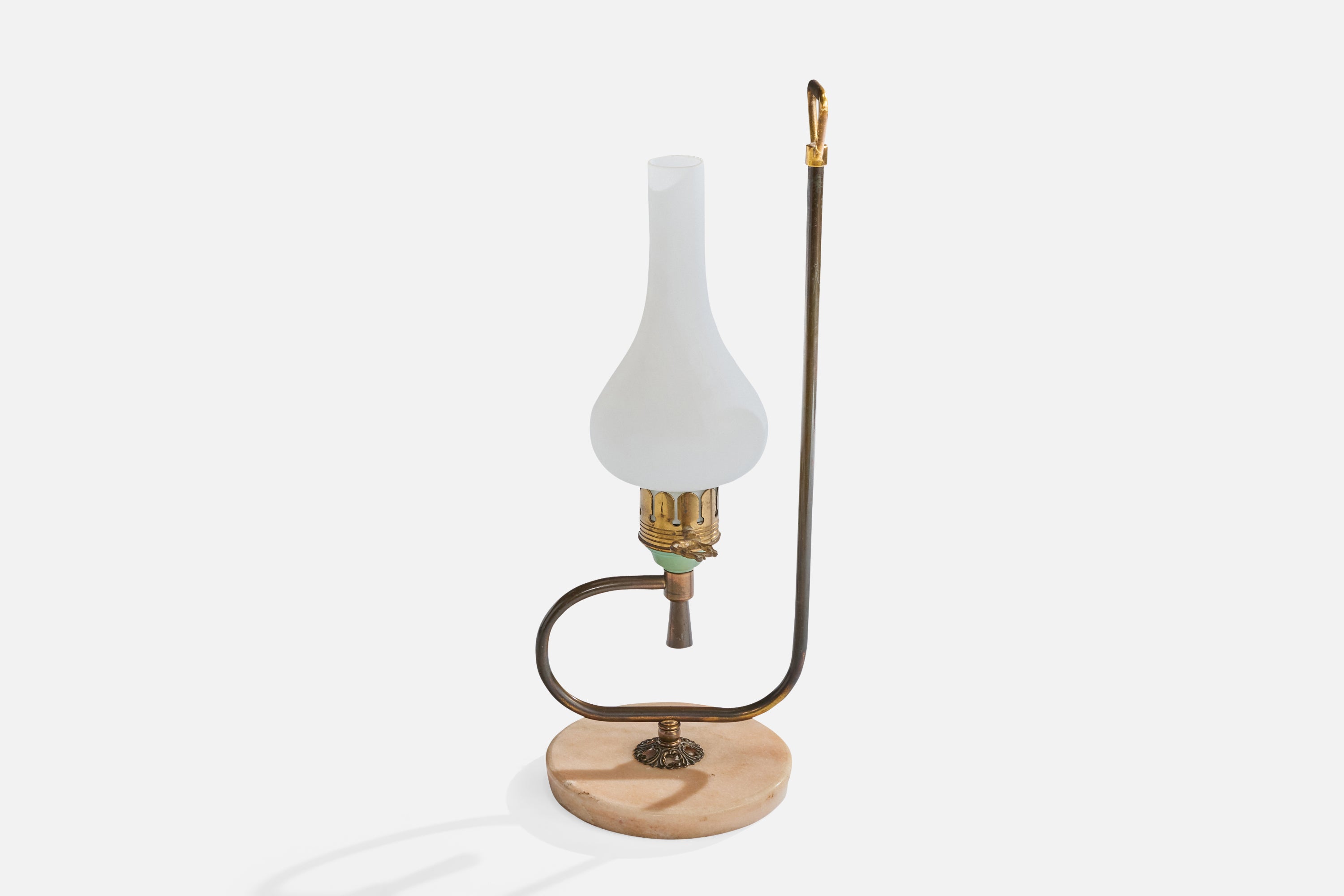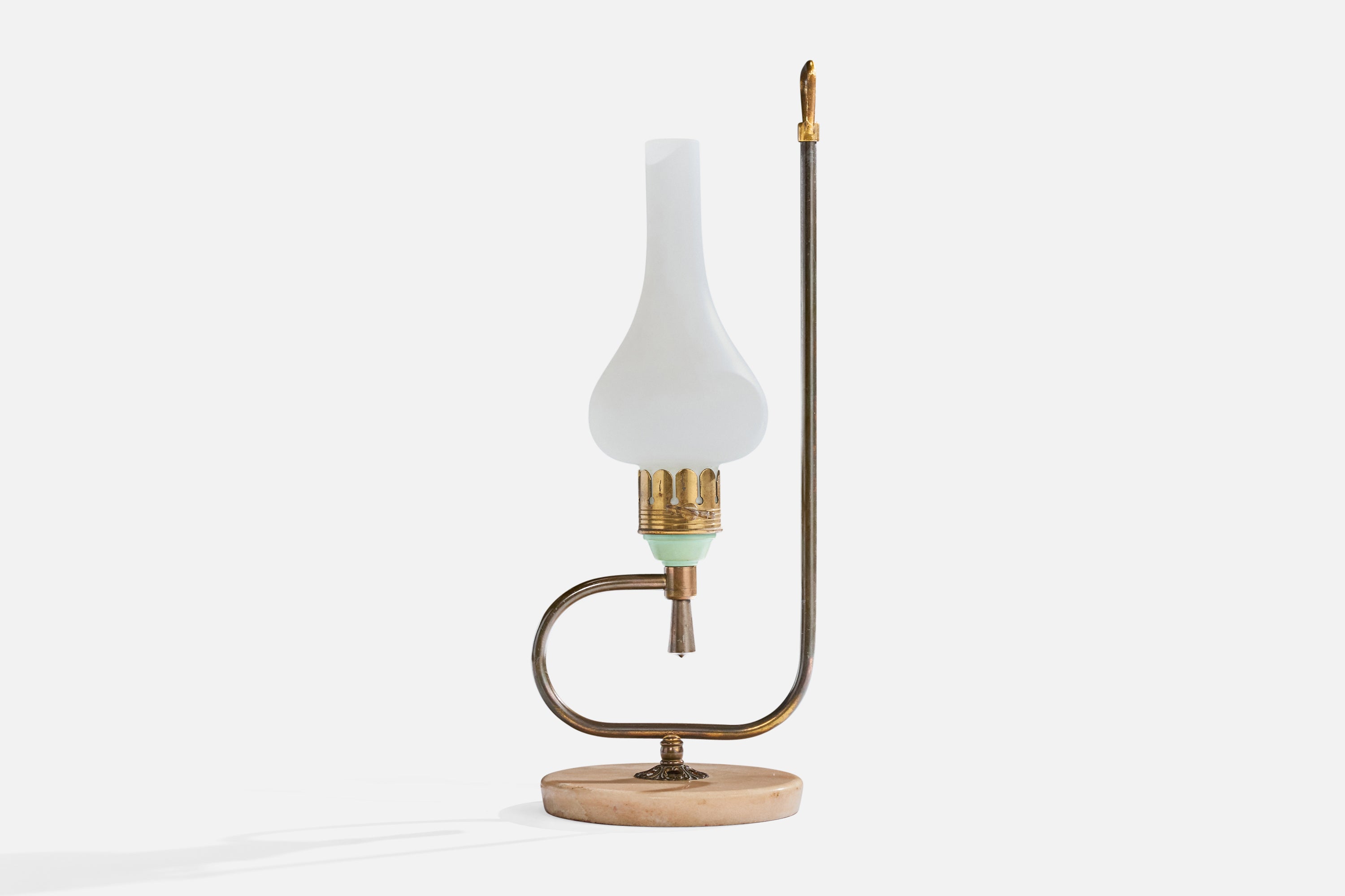 A brass, marble and white opaline glass table lamp designed and produced in Italy, c. 1950s.