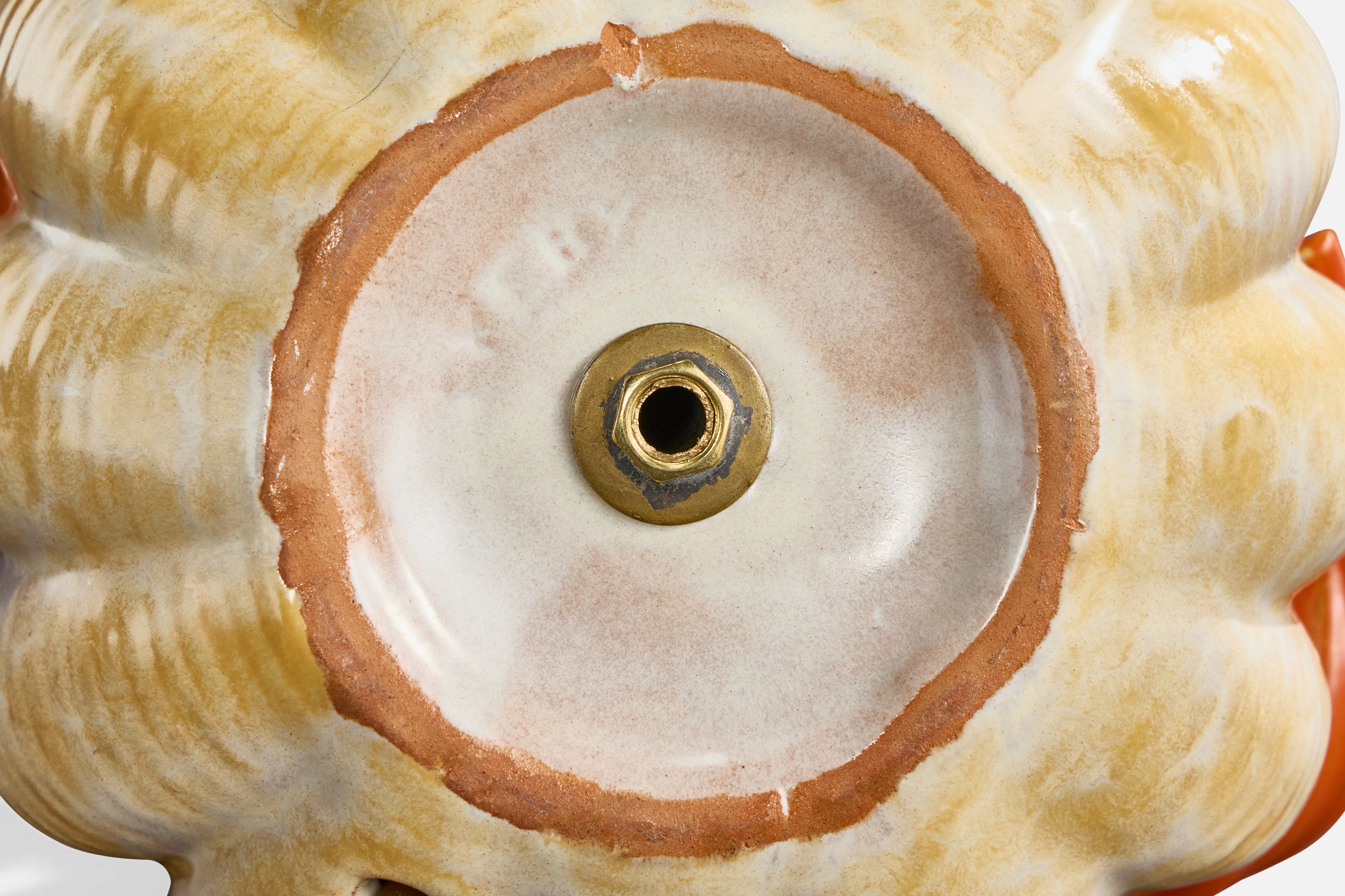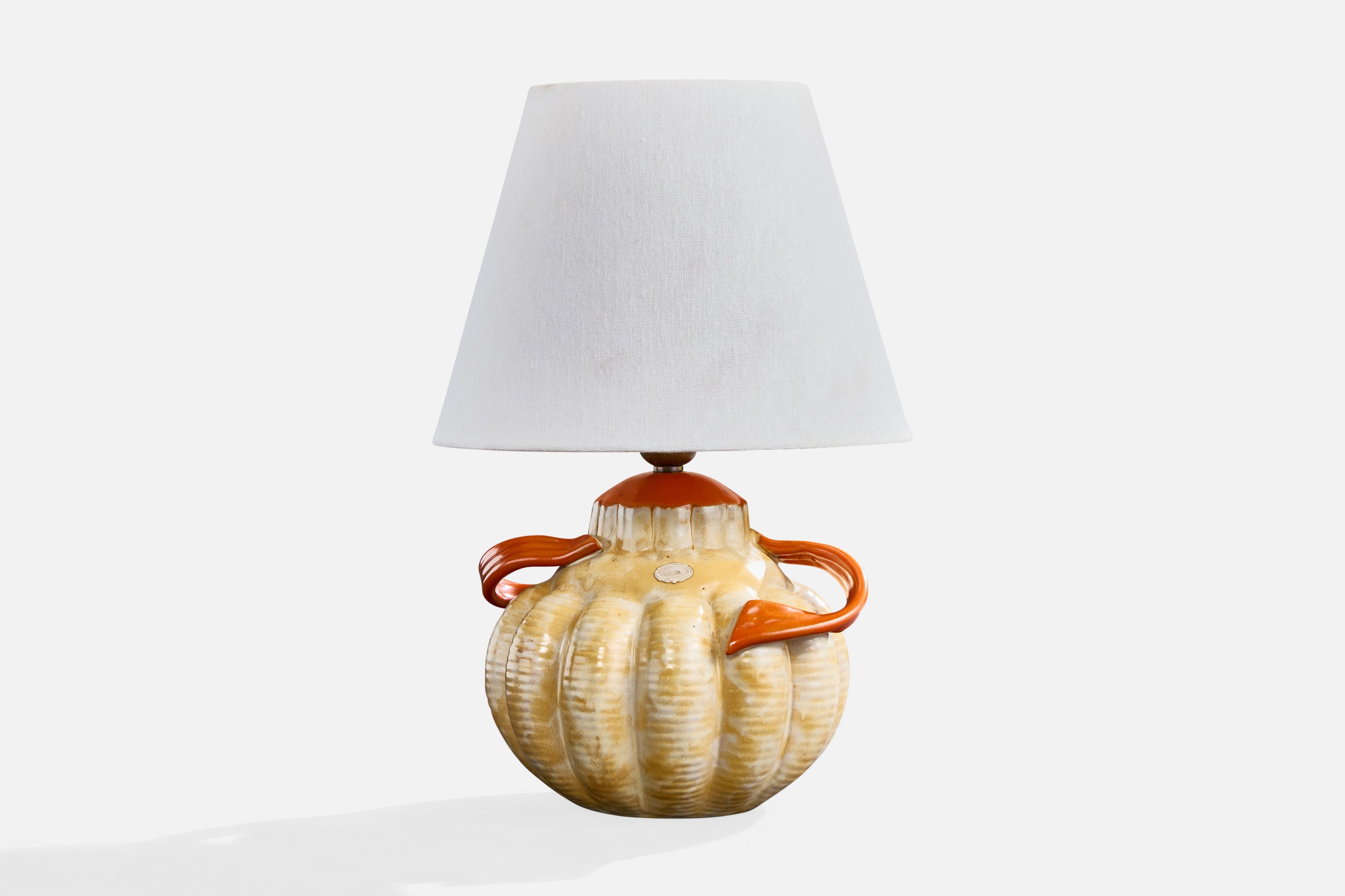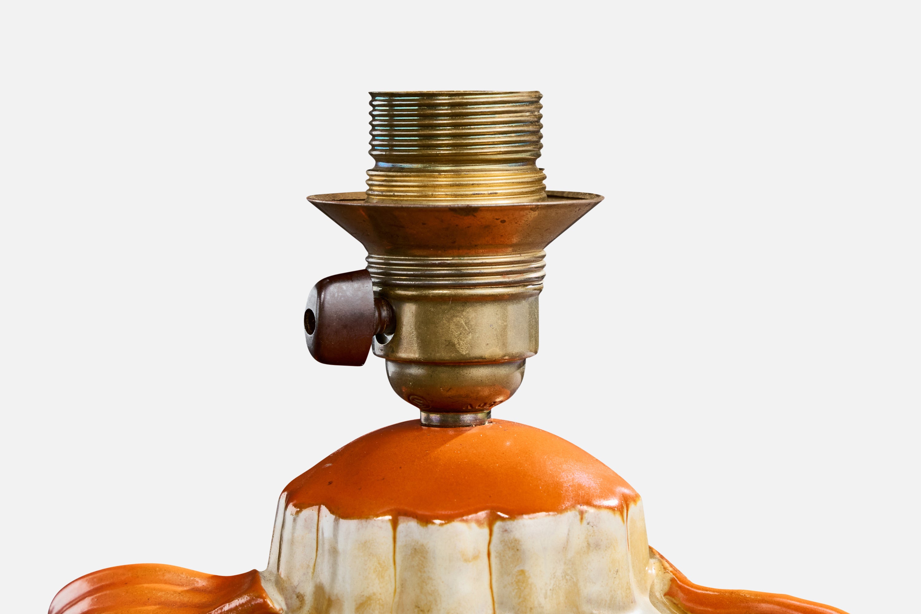 A beige orange glazed ceramic and brass table lamp designed and produced in Sweden, c. 1930s.
