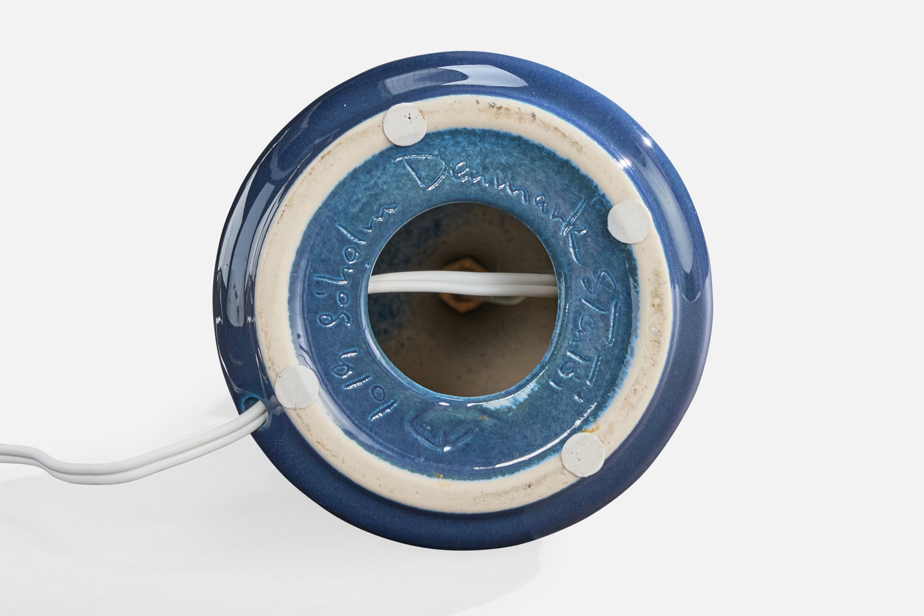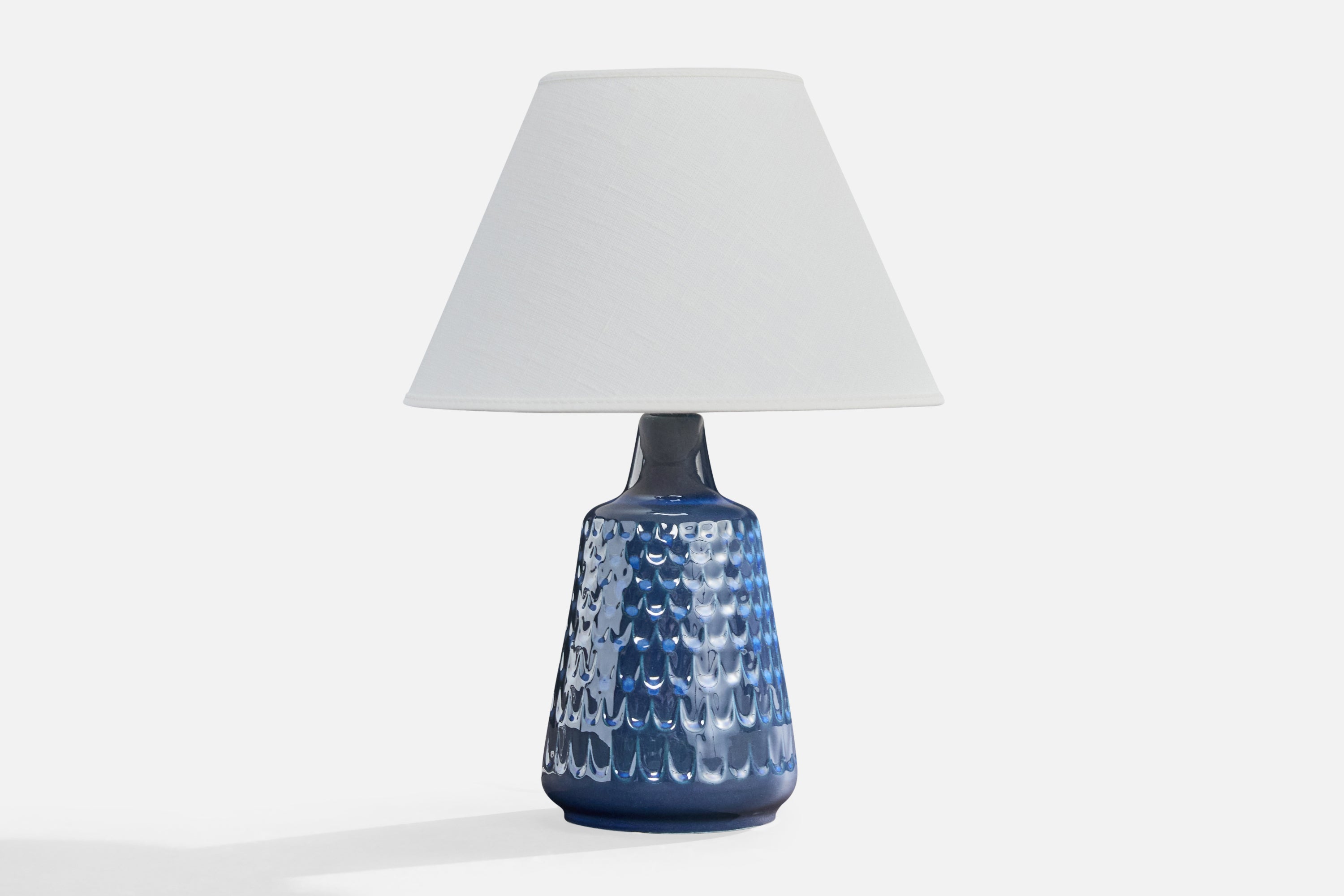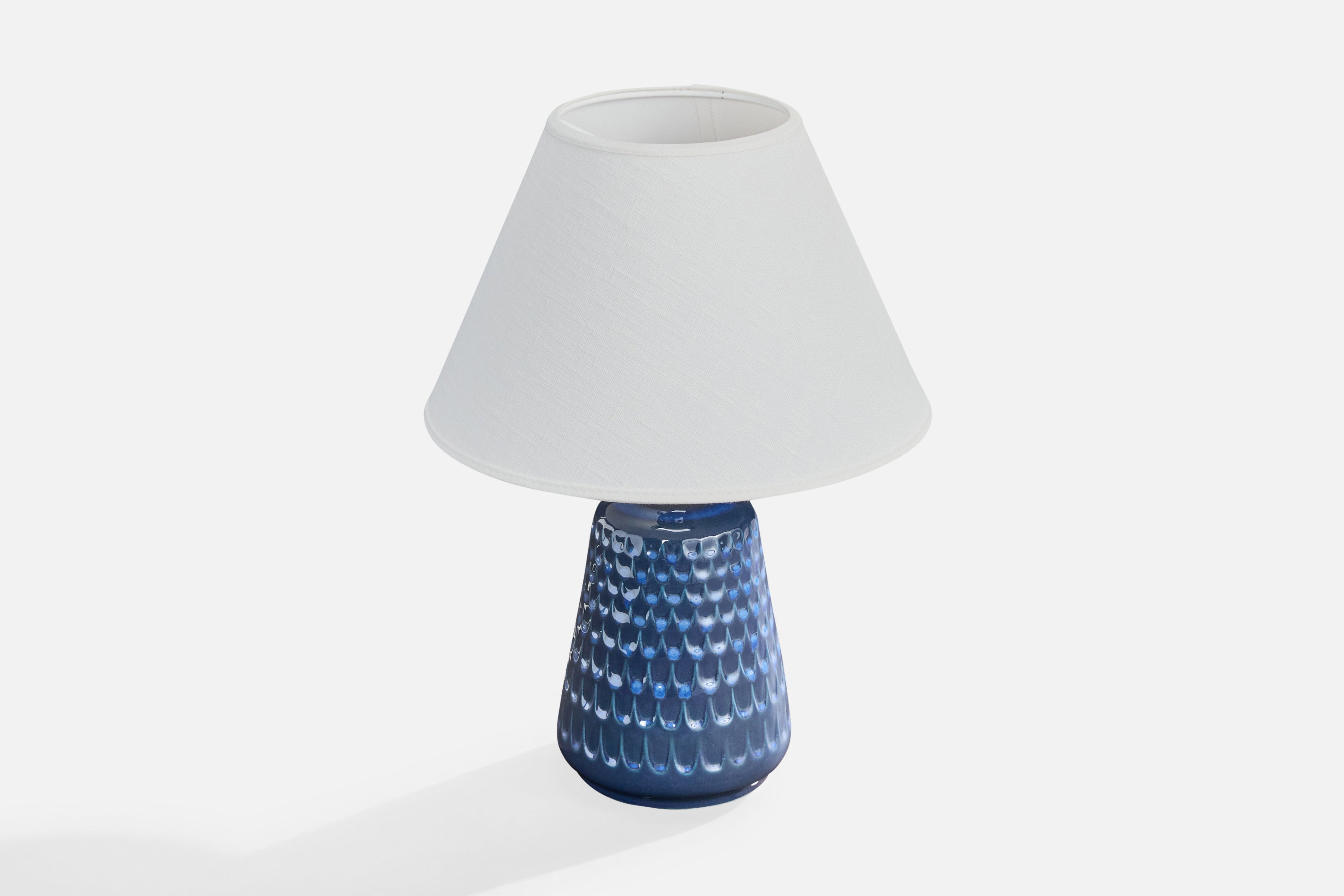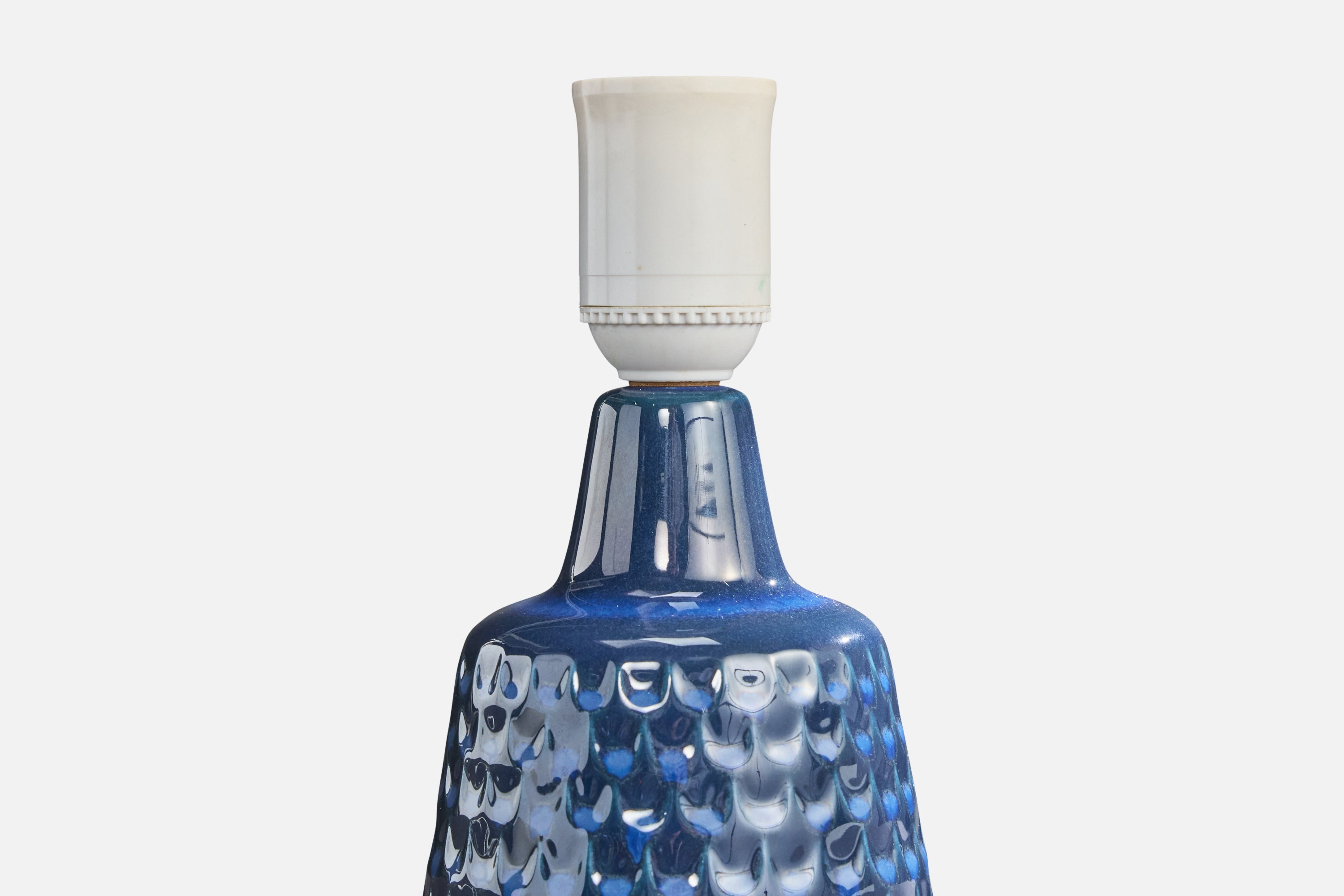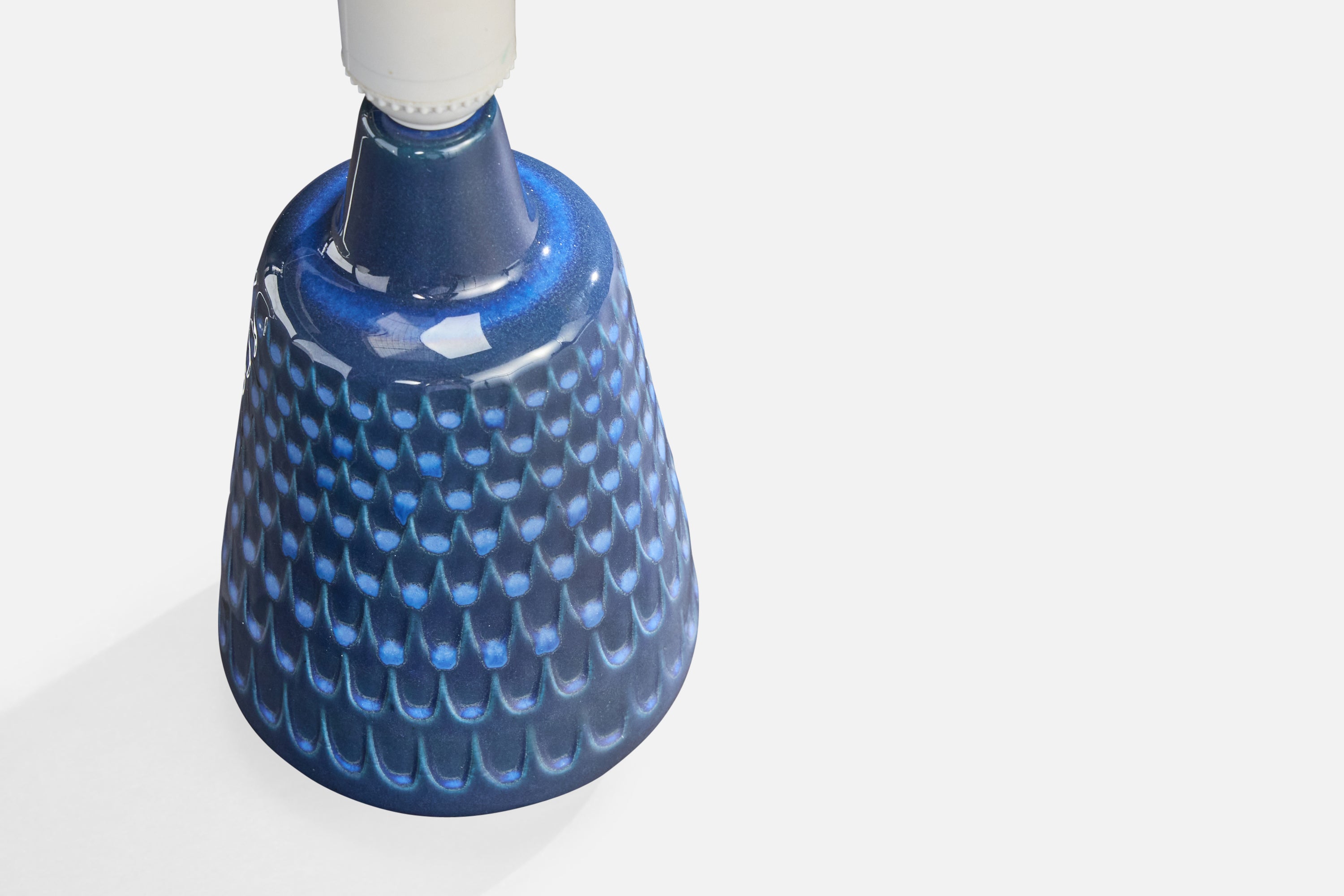 A blue-glazed incised stoneware table lamp produced by Søholm Stentøj, Denmark, c. 1960s.