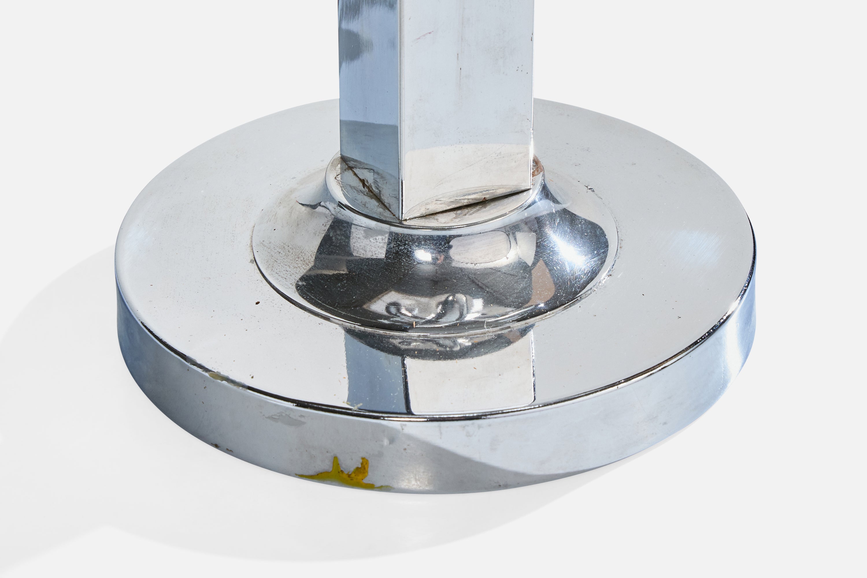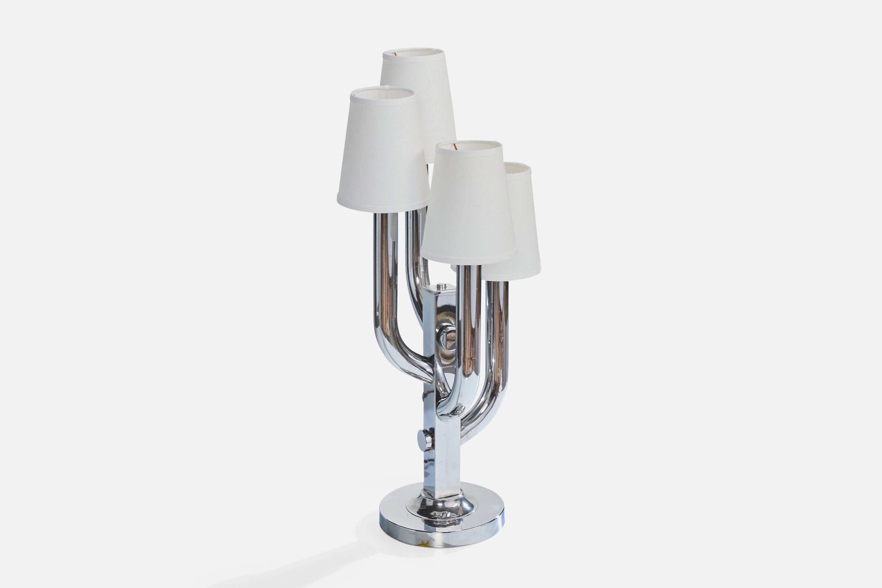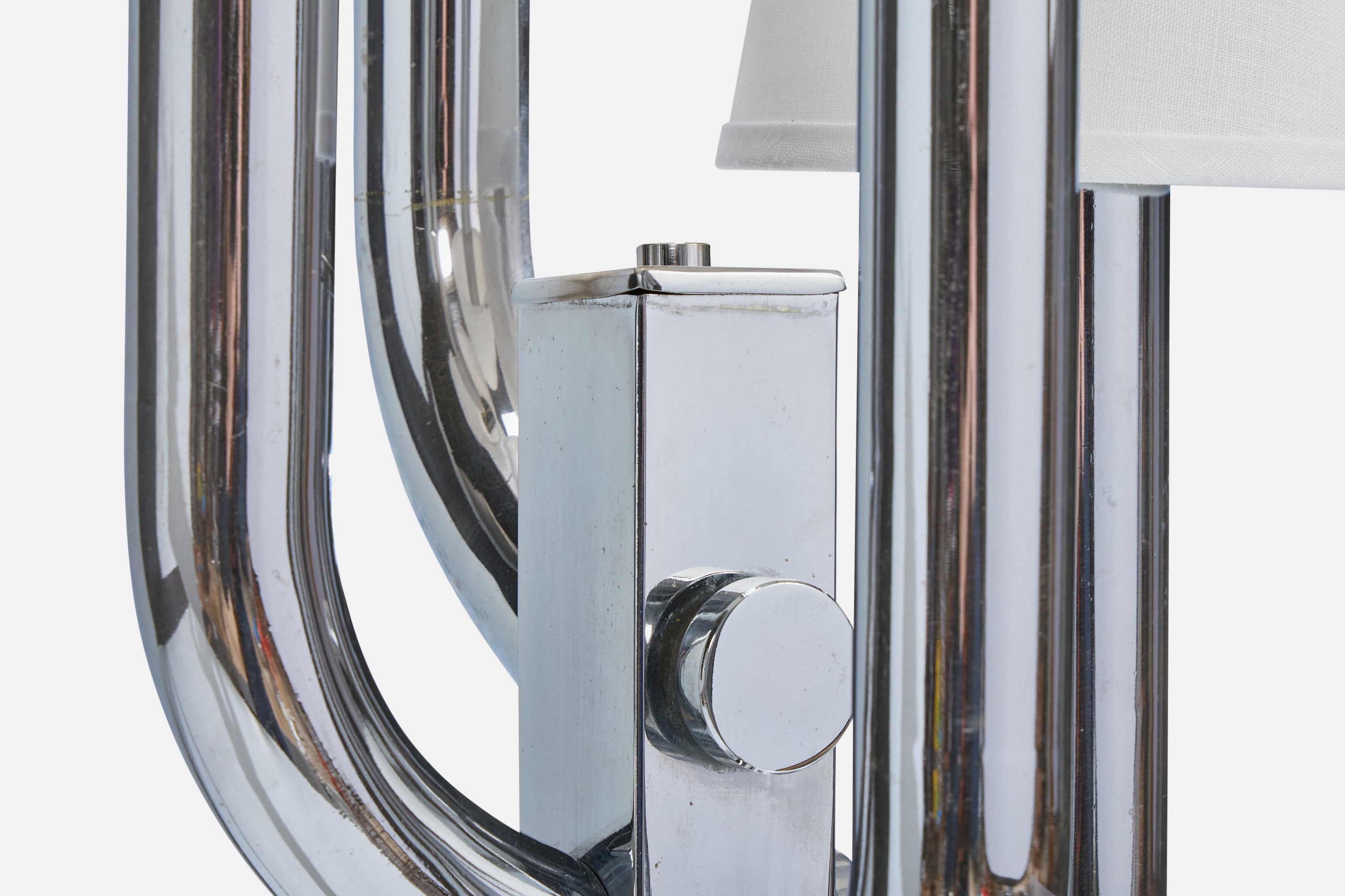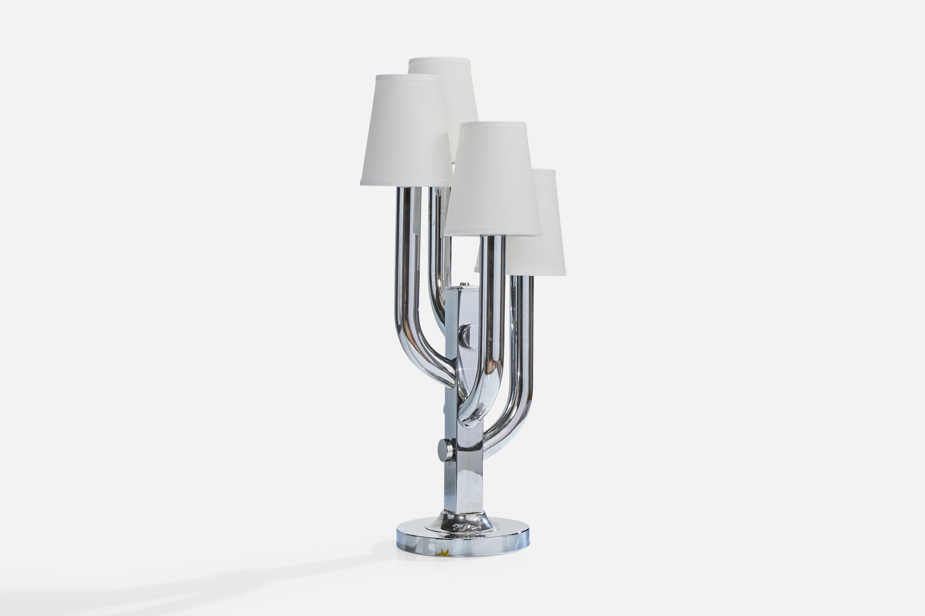 A chrome-plated metal and white fabric table lamp likely designed and produced in France, c. 1970s.