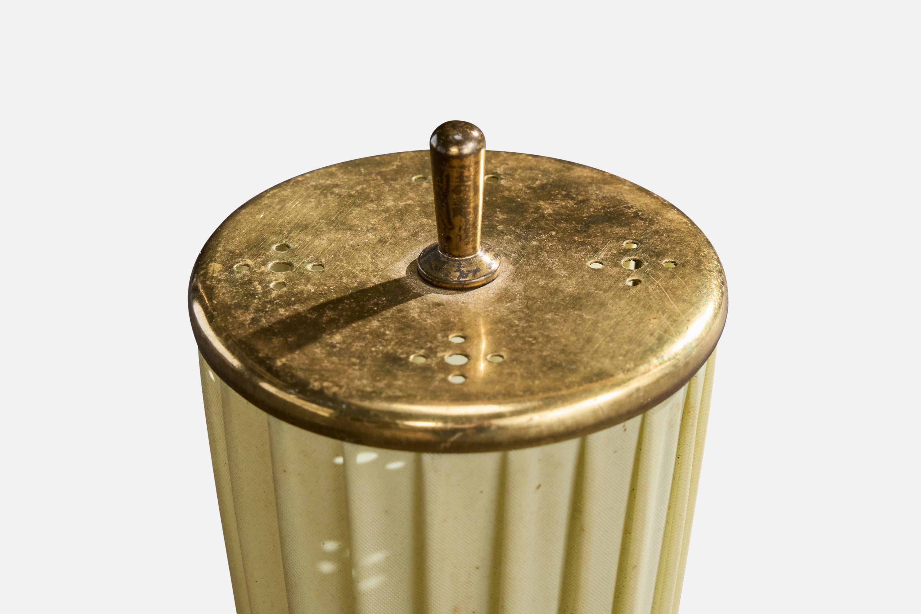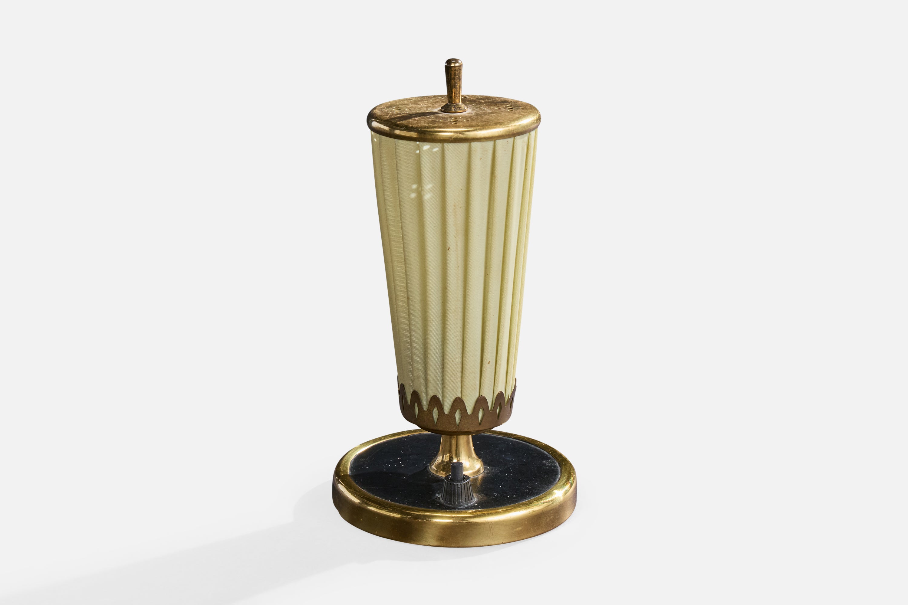 A brass, black-lacquered metal and beige fabric table lamp designed and produced in Austria, c. 1950s.