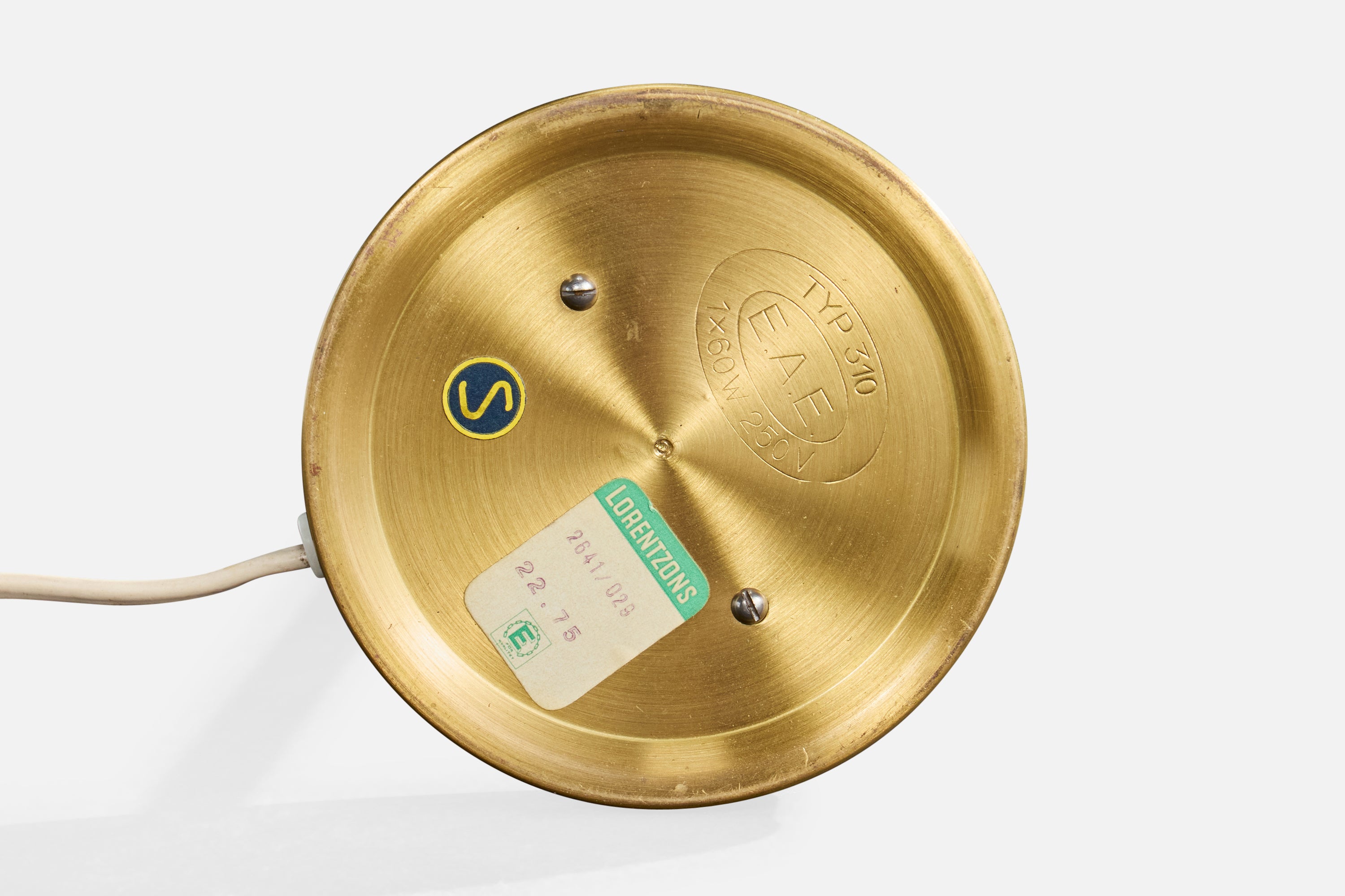 A brass and green fabric table lamp produced by E.A.E, Sweden, c. 1950s.