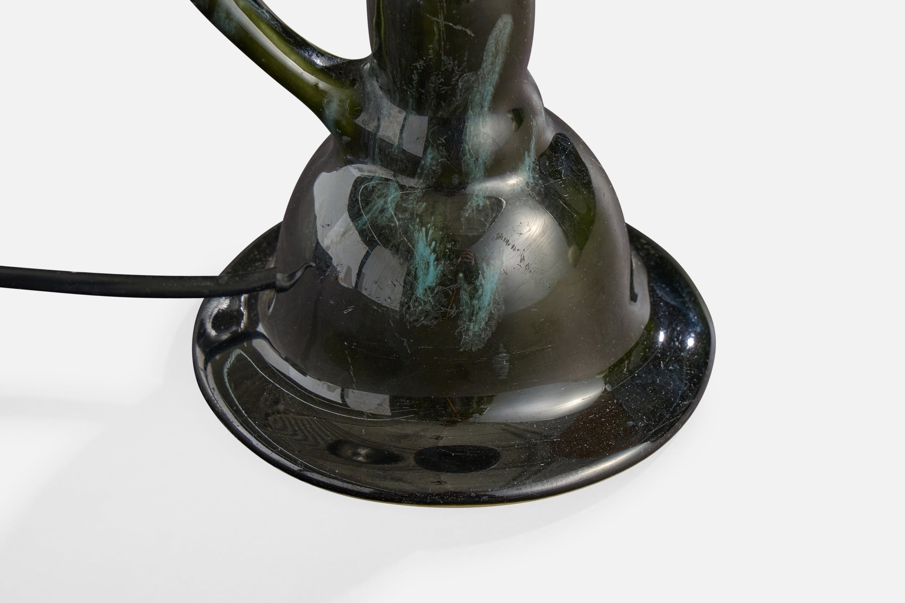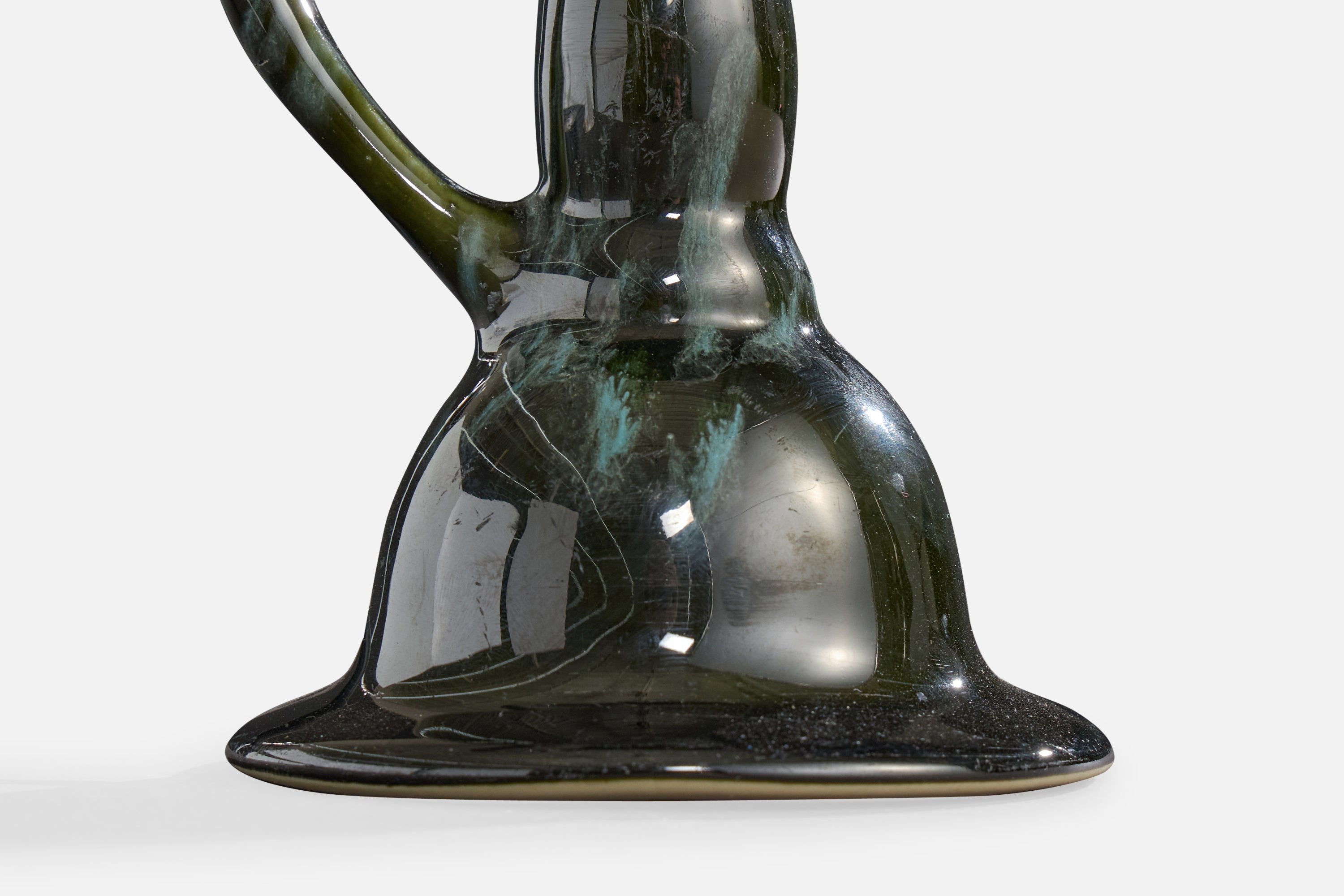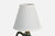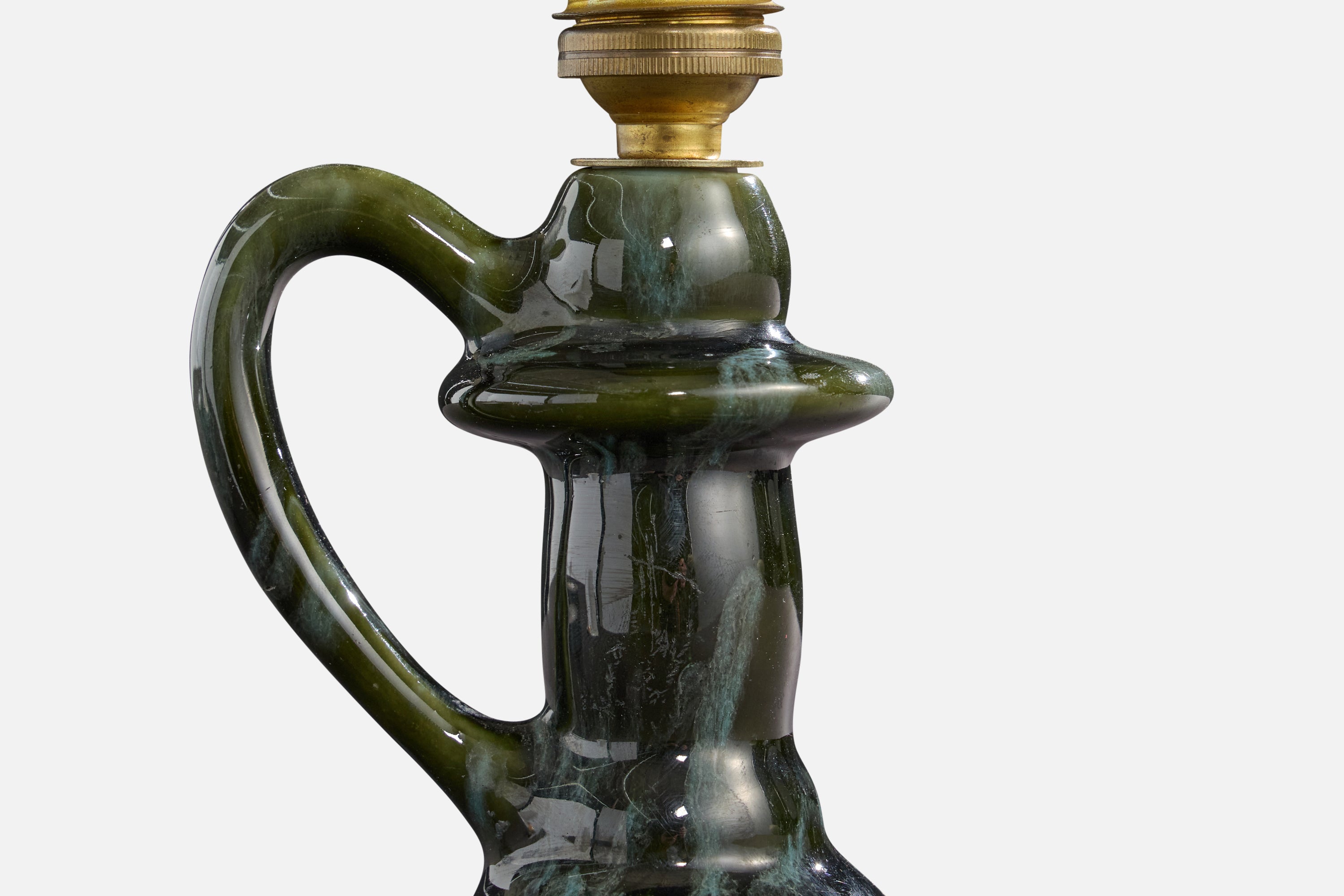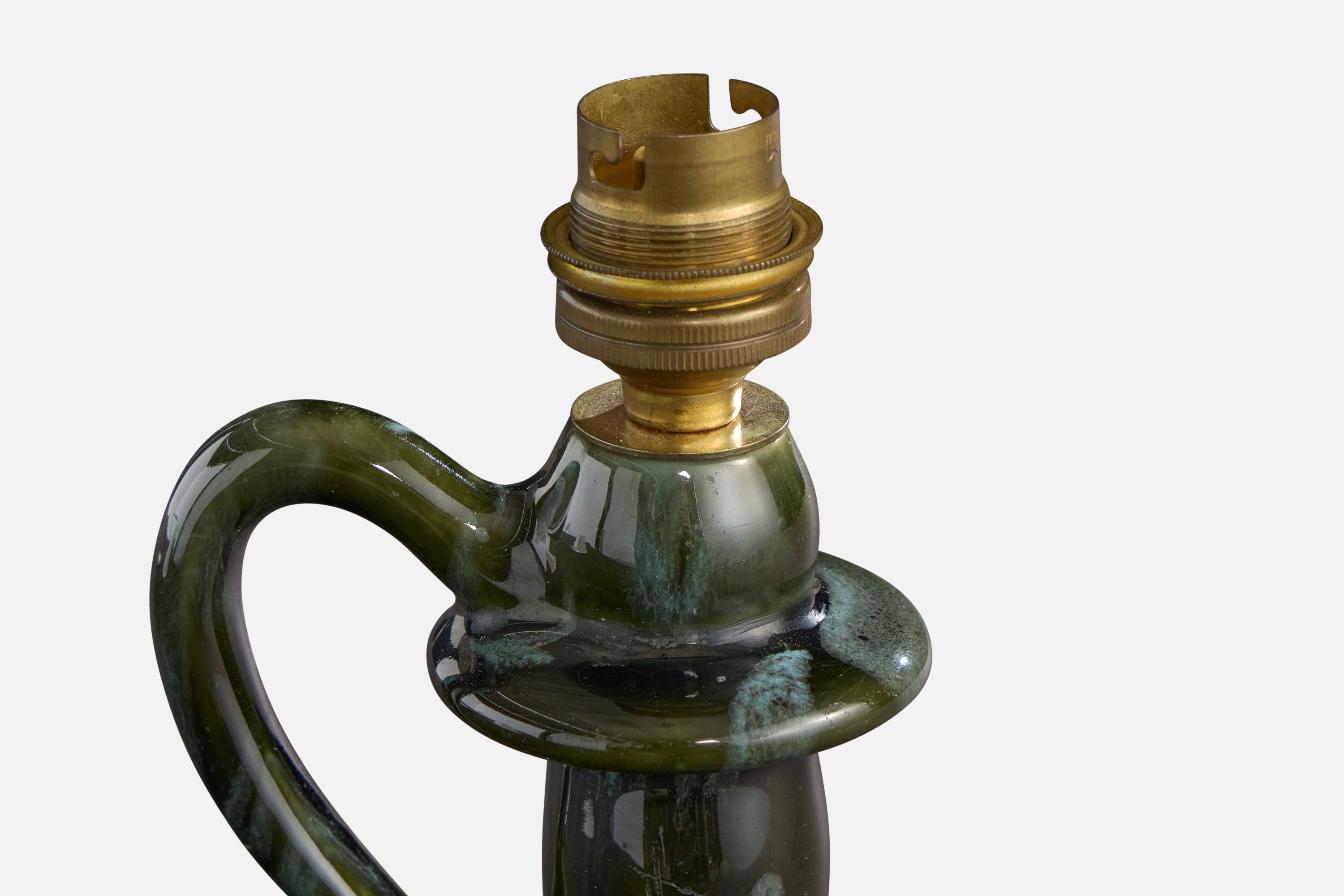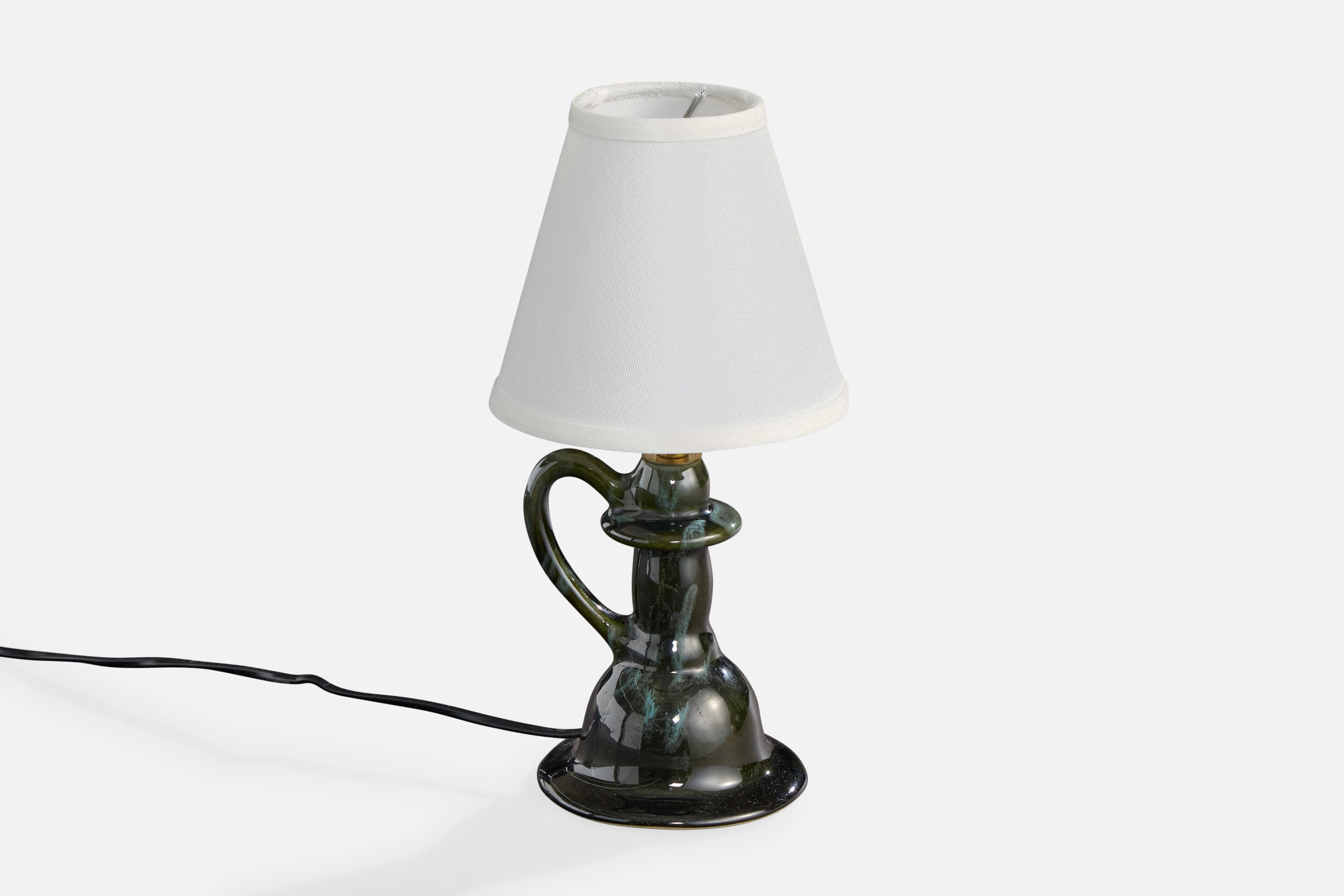 A green-glazed ceramic, brass and white fabric table lamp designed and produced in France, c. 1960s.