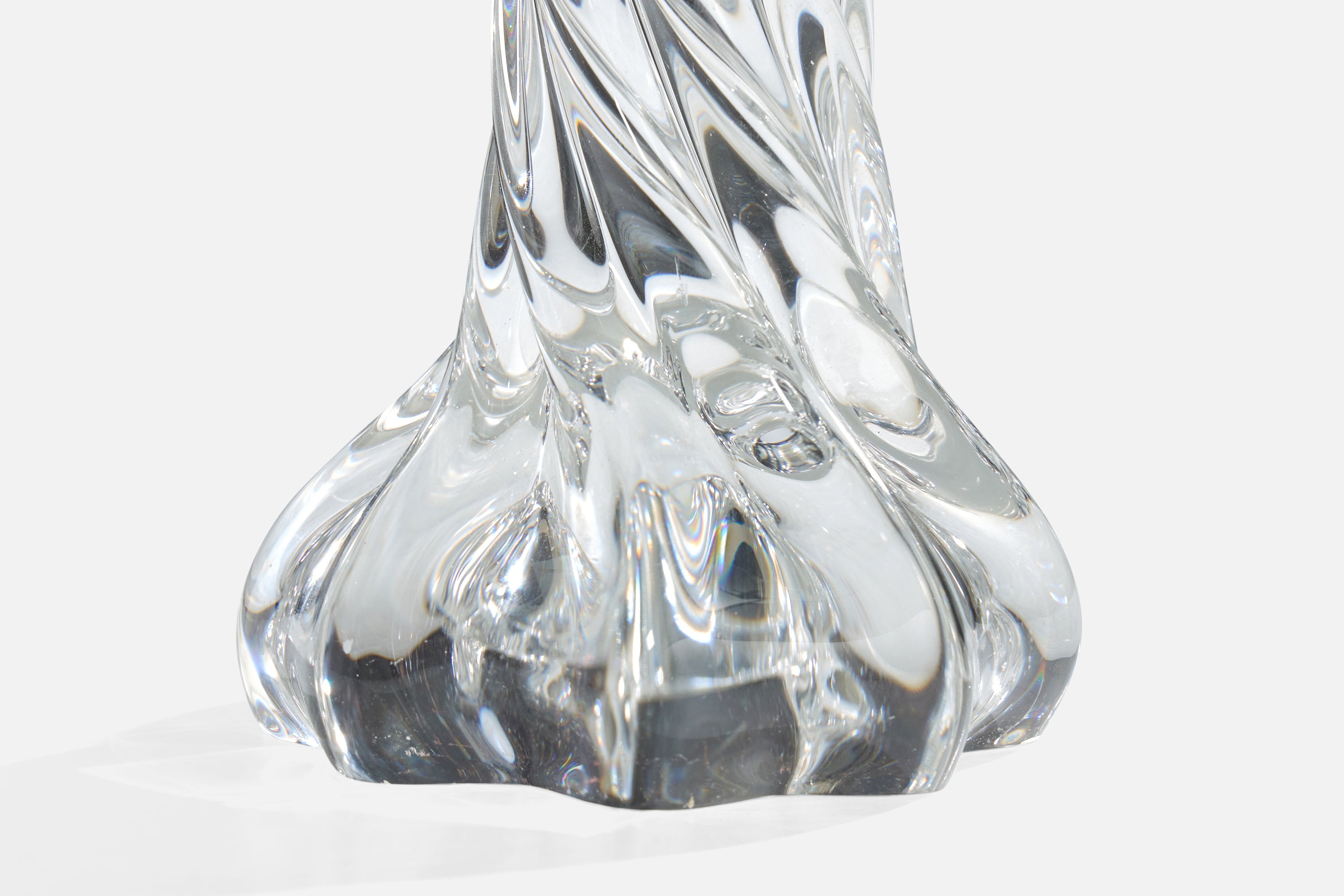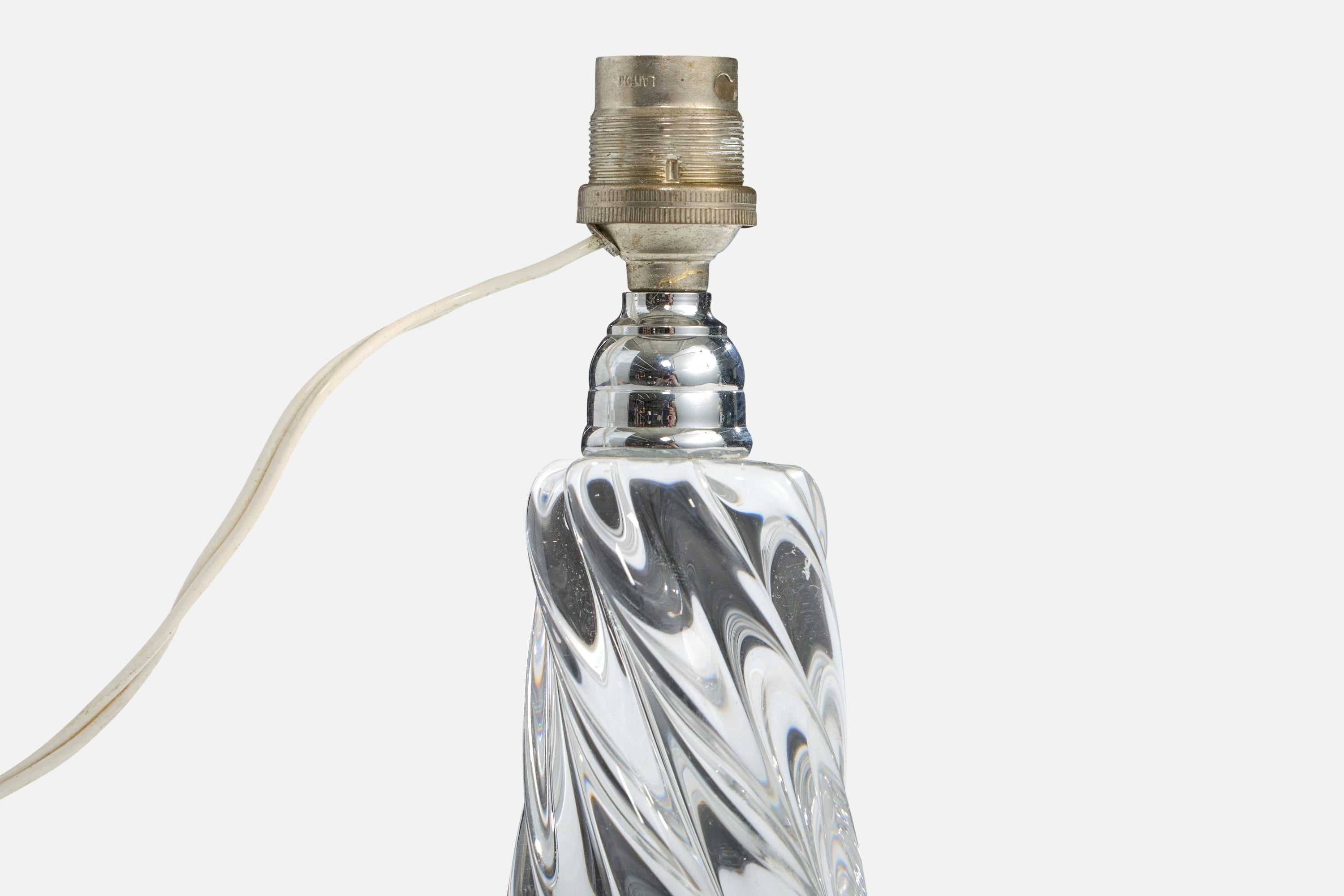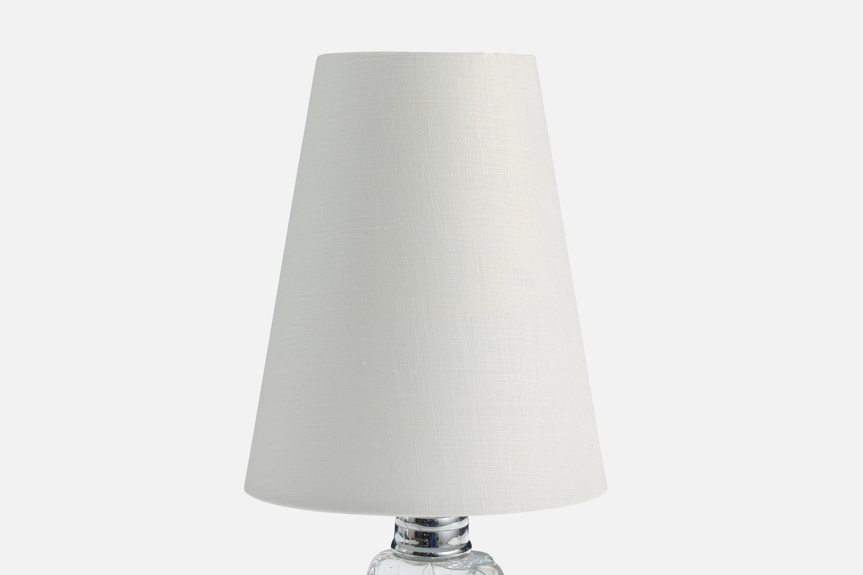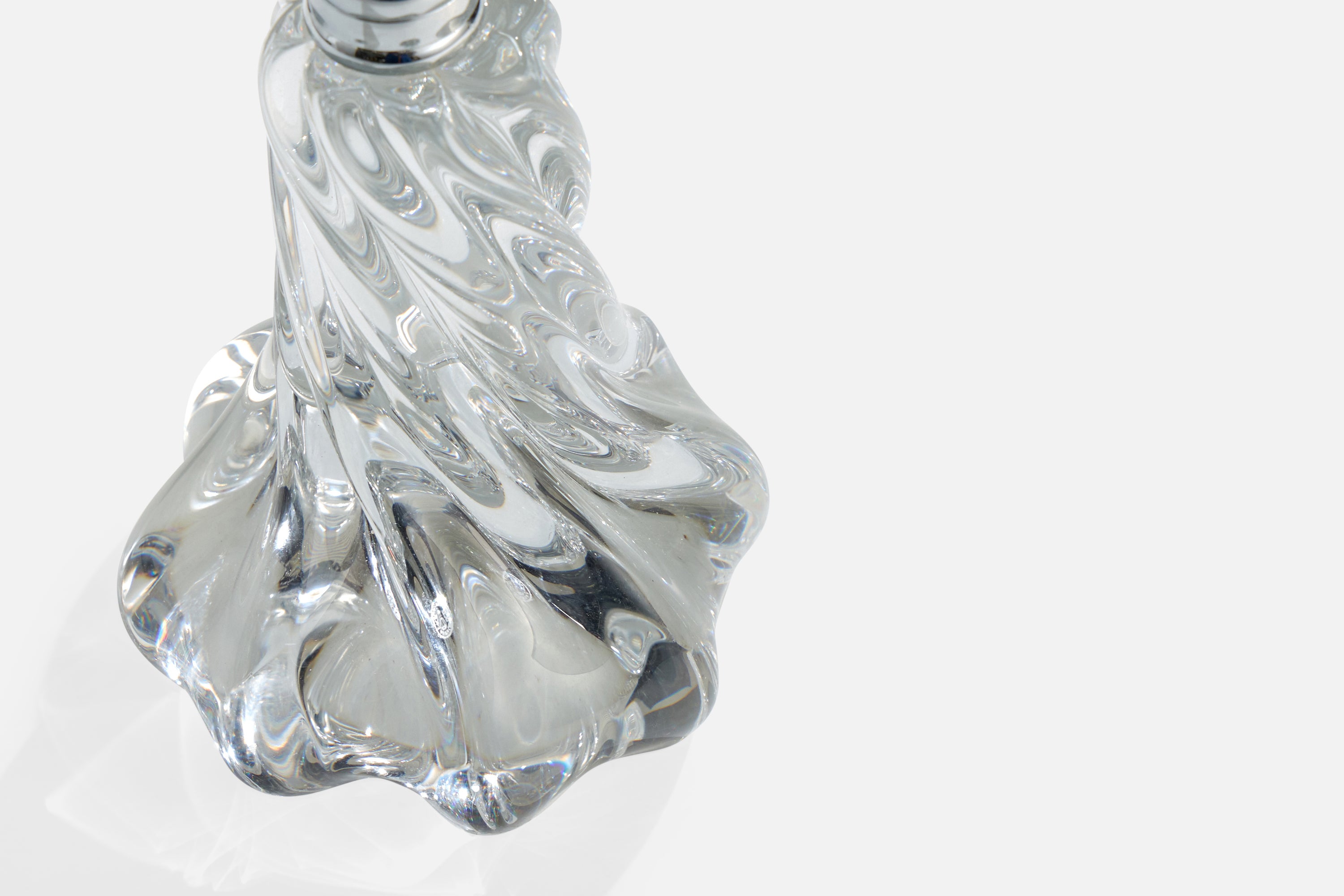 A set of two Cristal glass, metal and white fabric table lamps produced by Baccarat, France, c. 1950s.