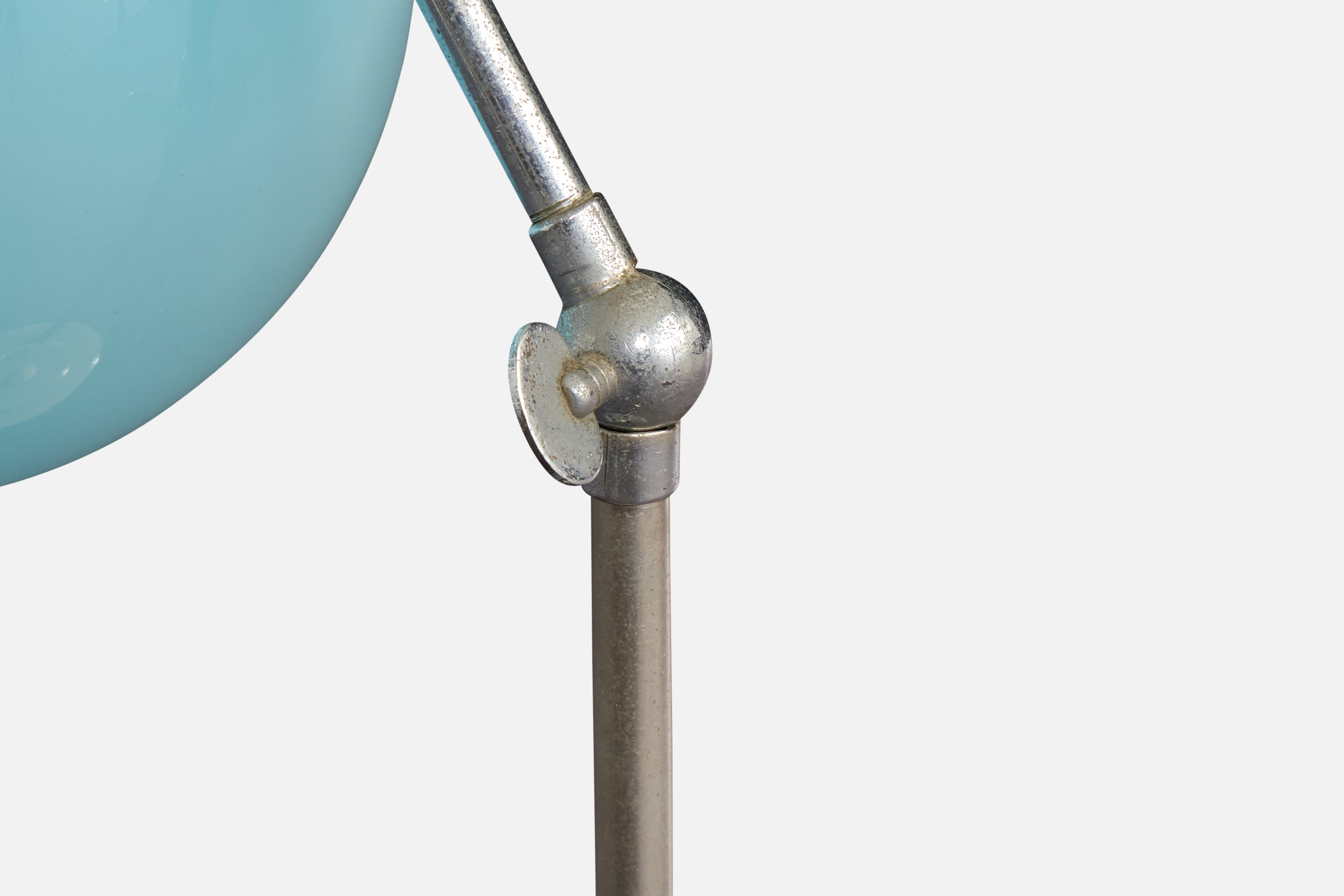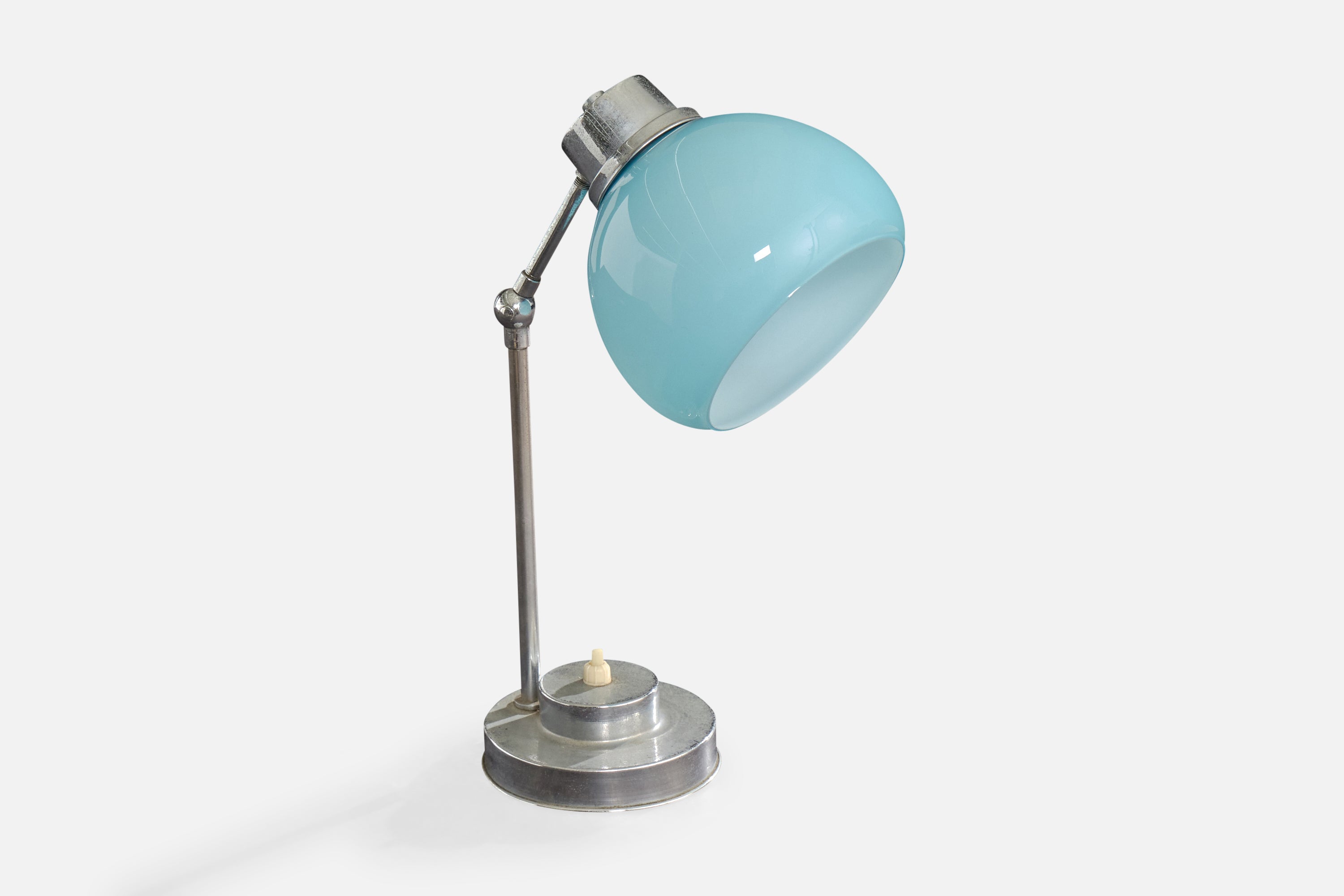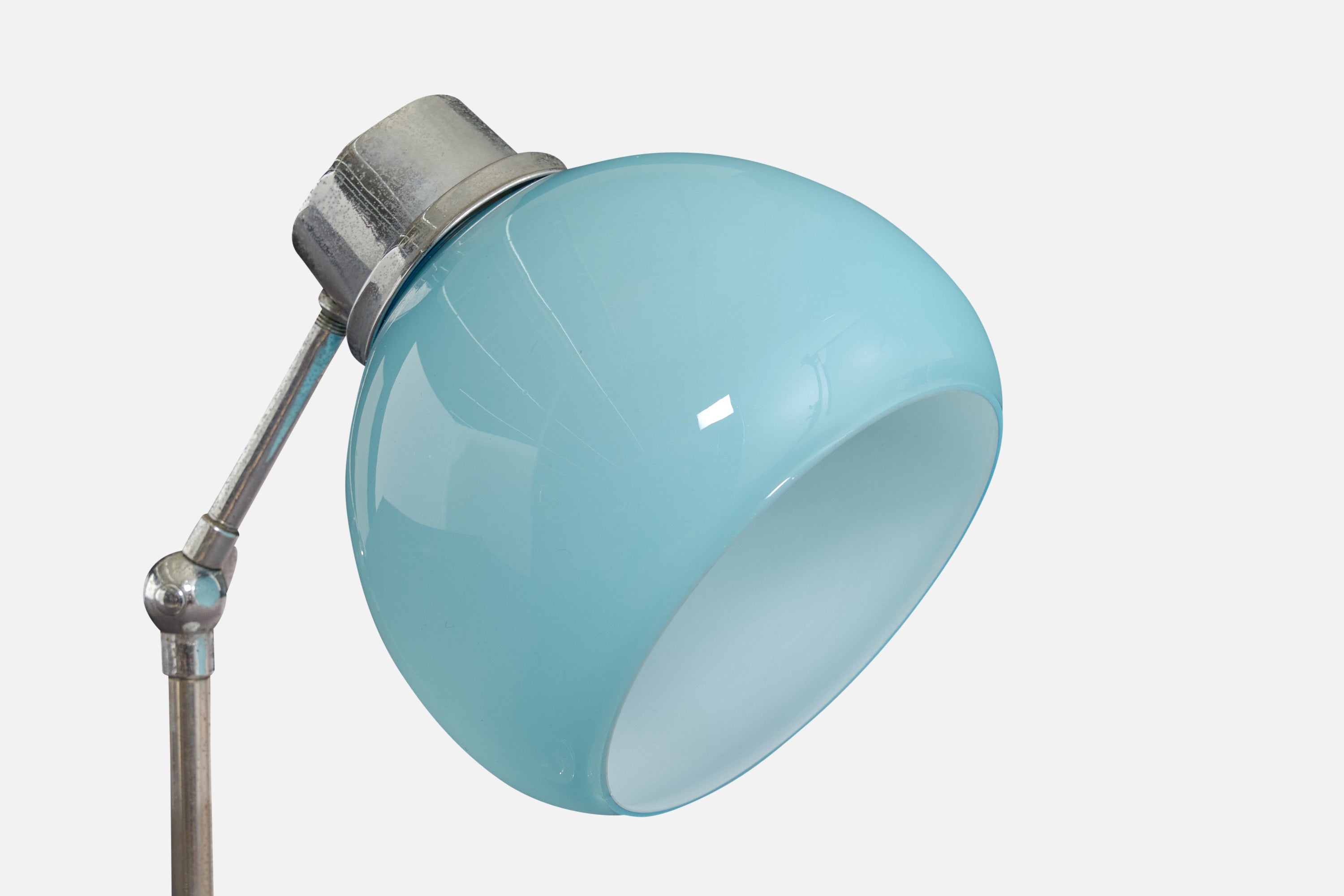 An adjustable metal and blue-colored opaline glass table lamp designed and produced in France, c. 1950s.