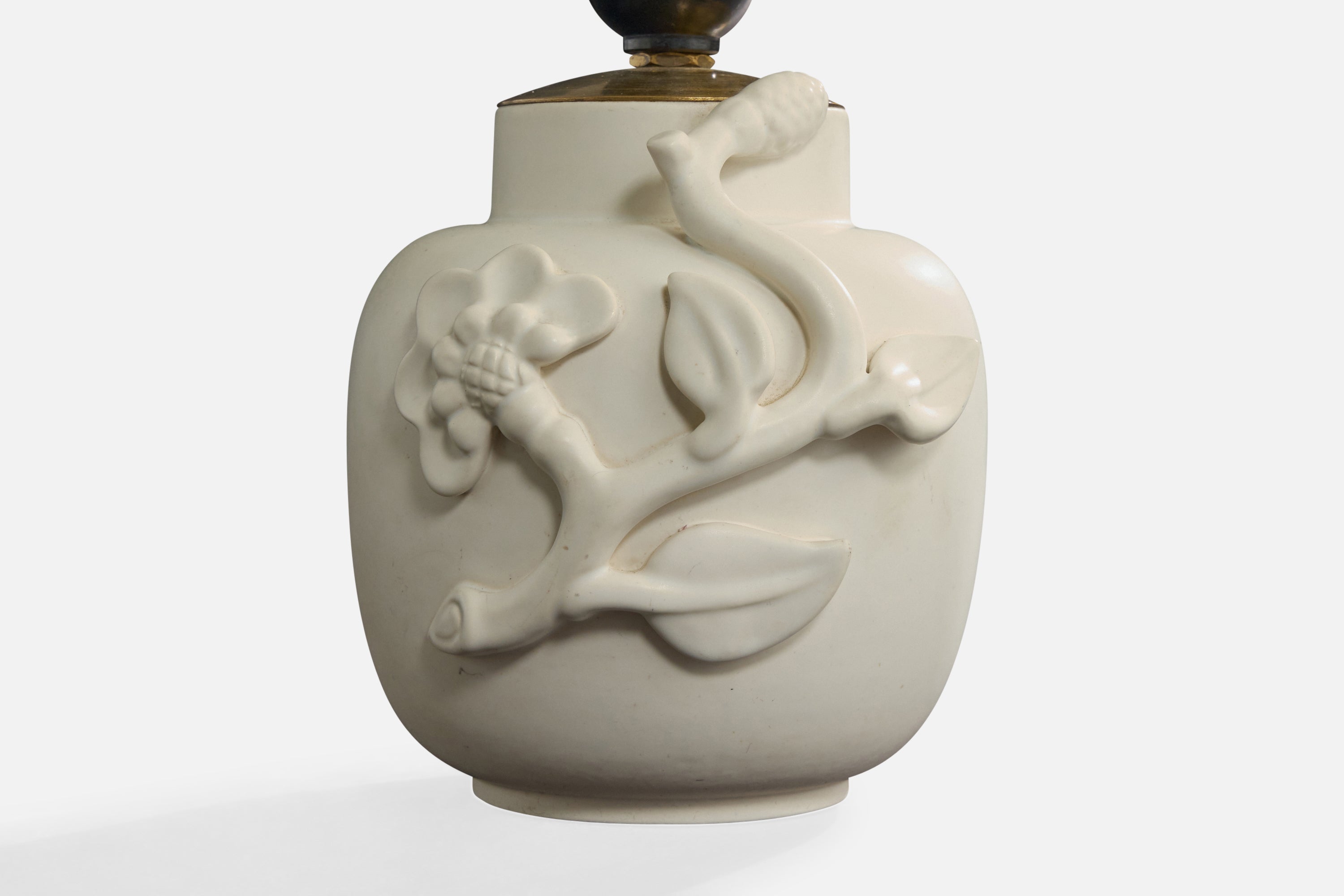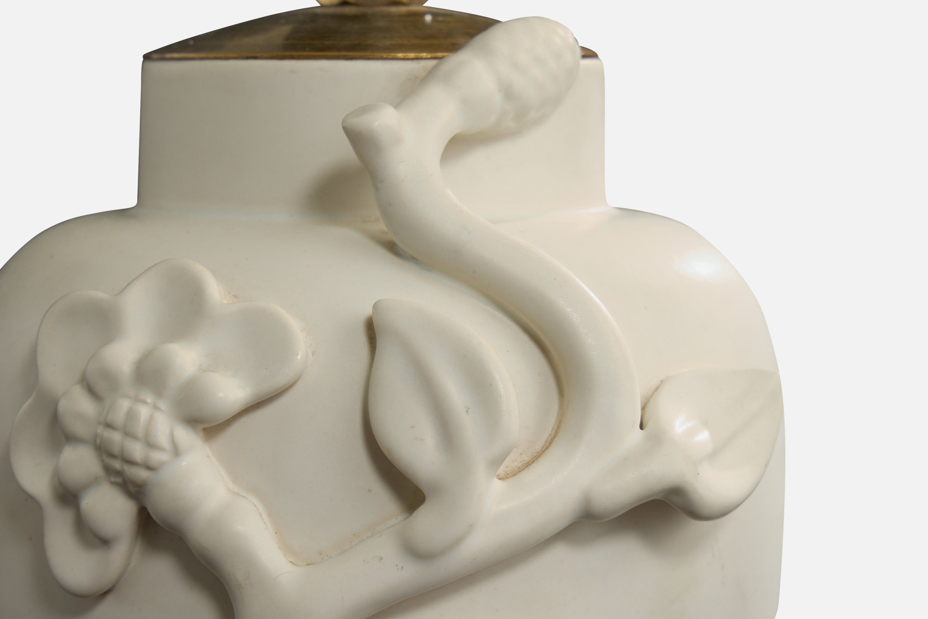 An off-white glazed ceramic and brass table lamp designed by Wilhelm Kåge and produced by Gustavsberg, Sweden, c. 1940s.