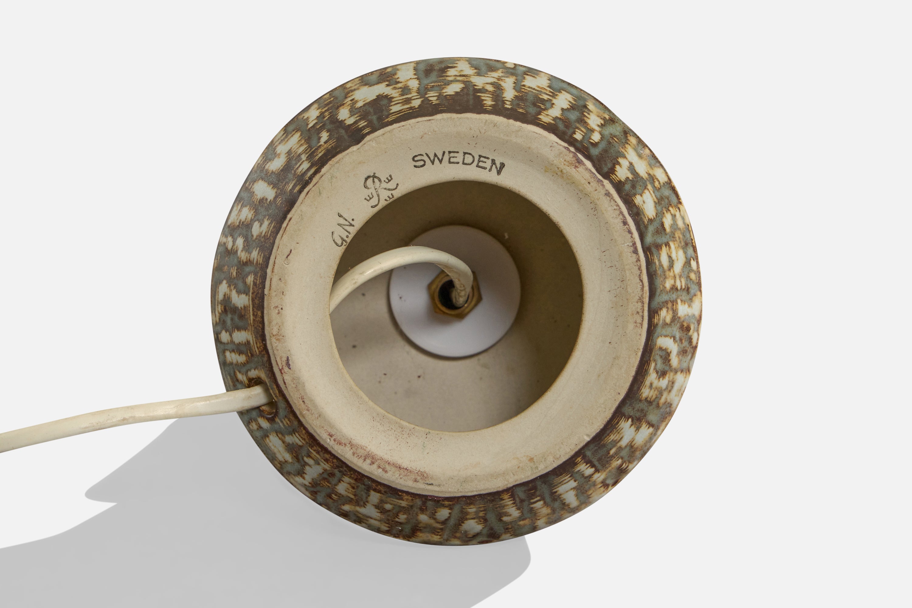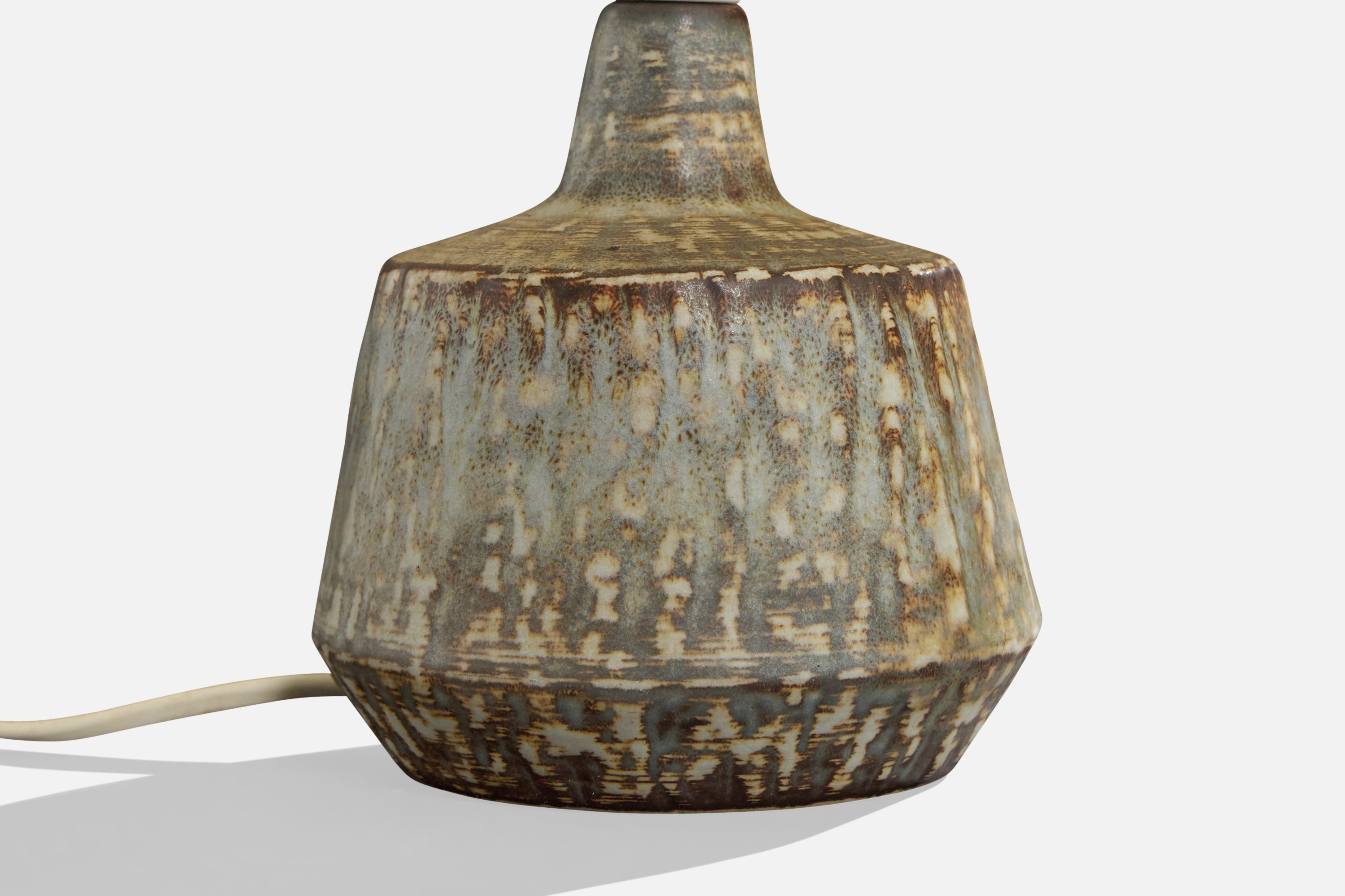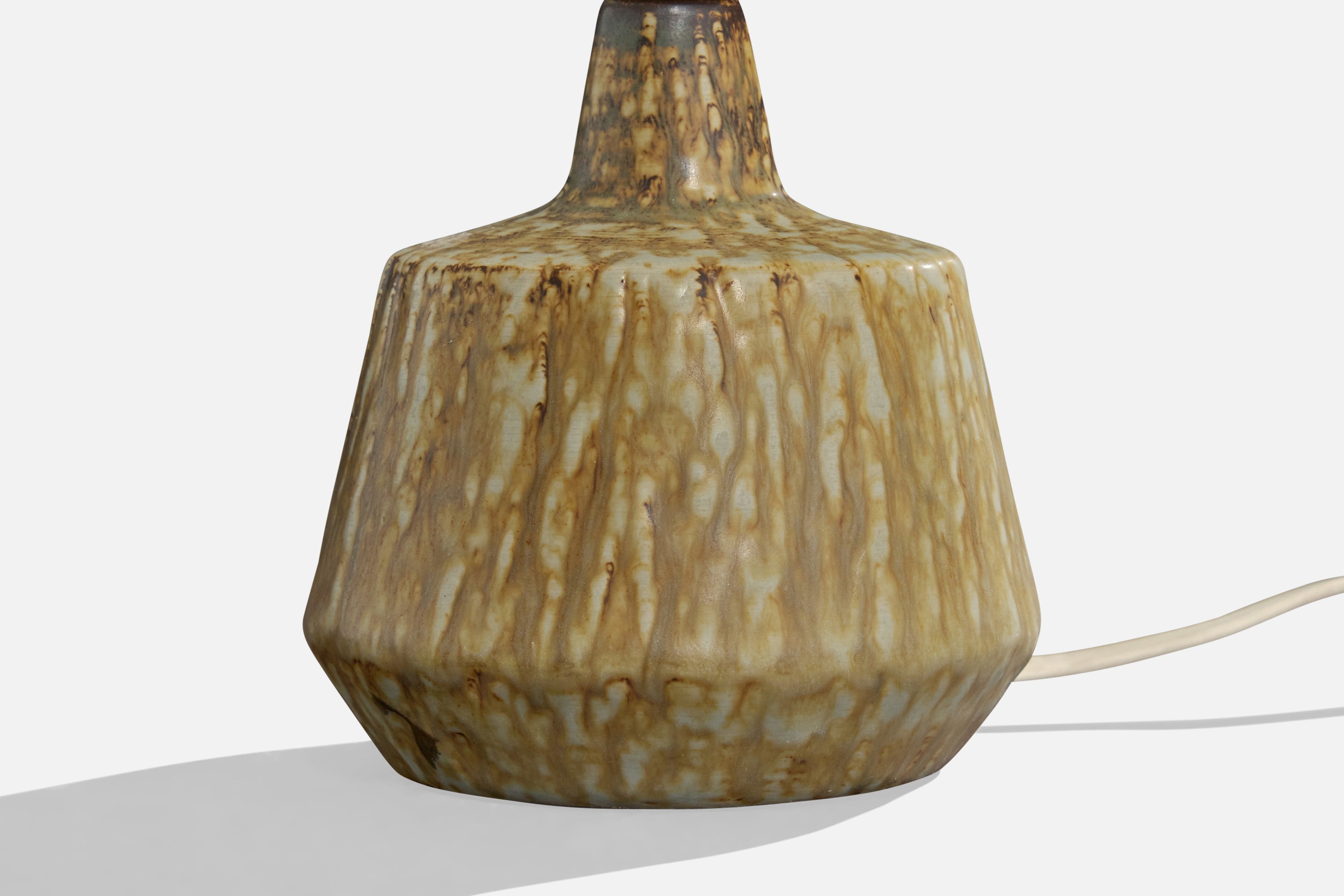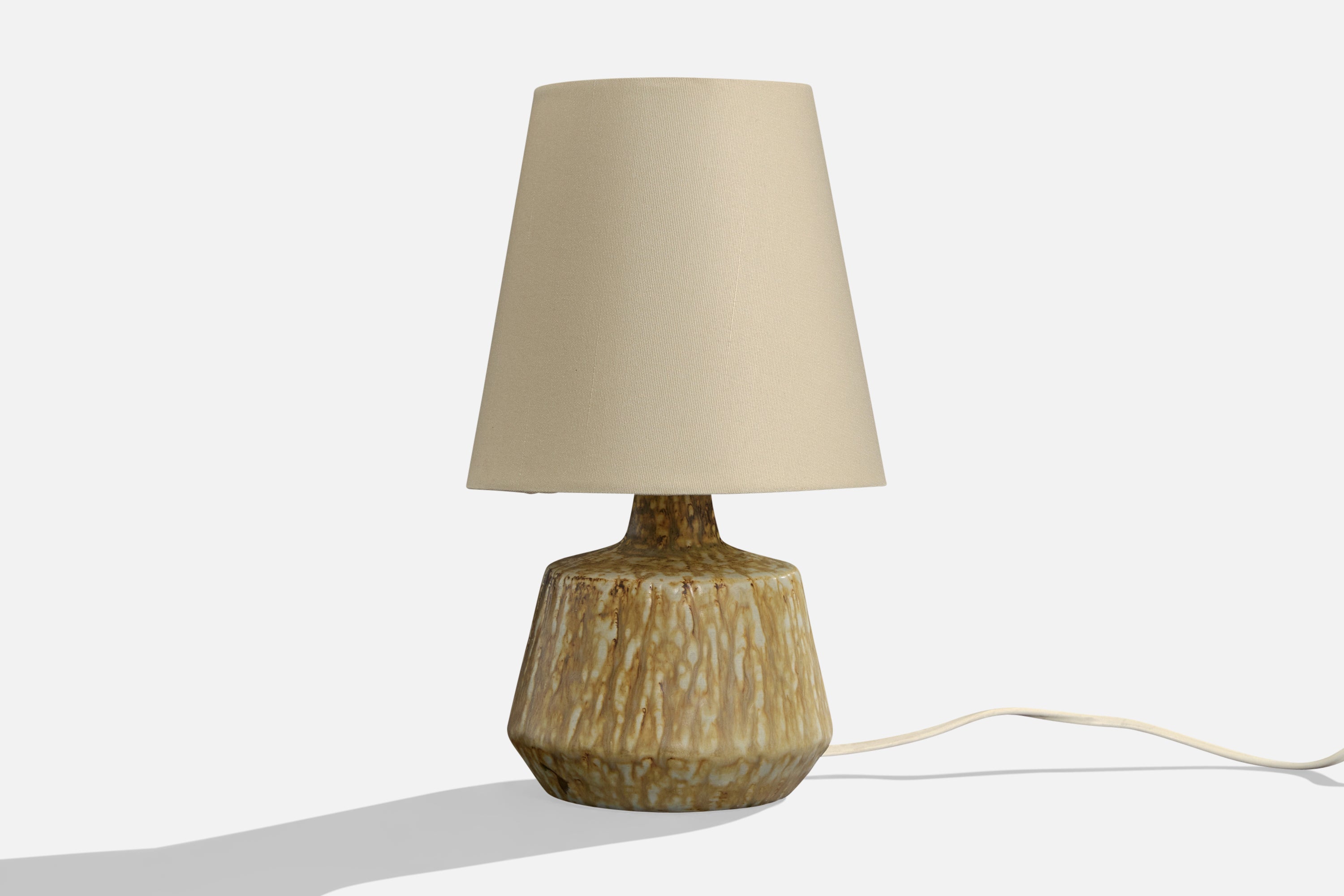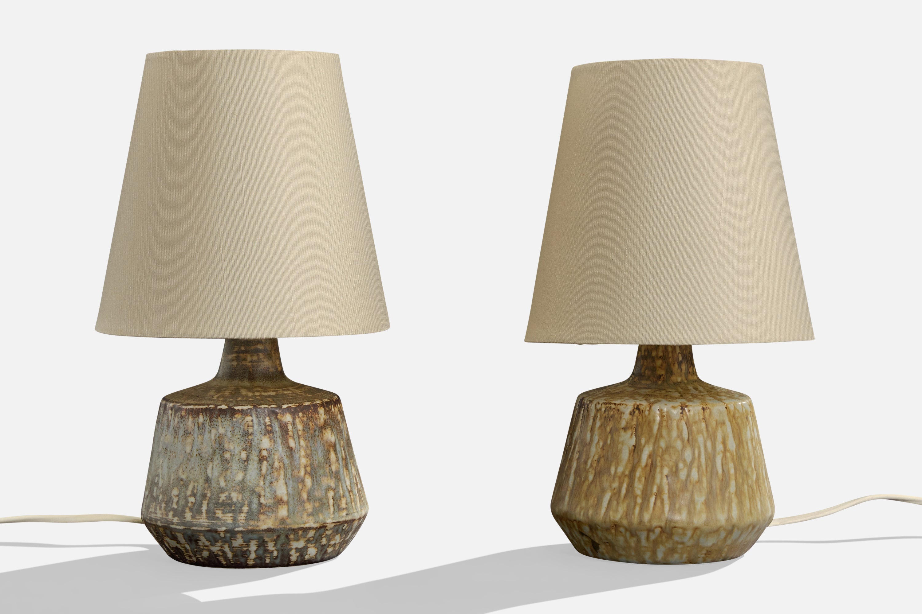A pair of glazed stoneware and off-white fabric table lamps designed by Gunnar Nylund and produced by Rörstrand, Sweden, c. 1940s.